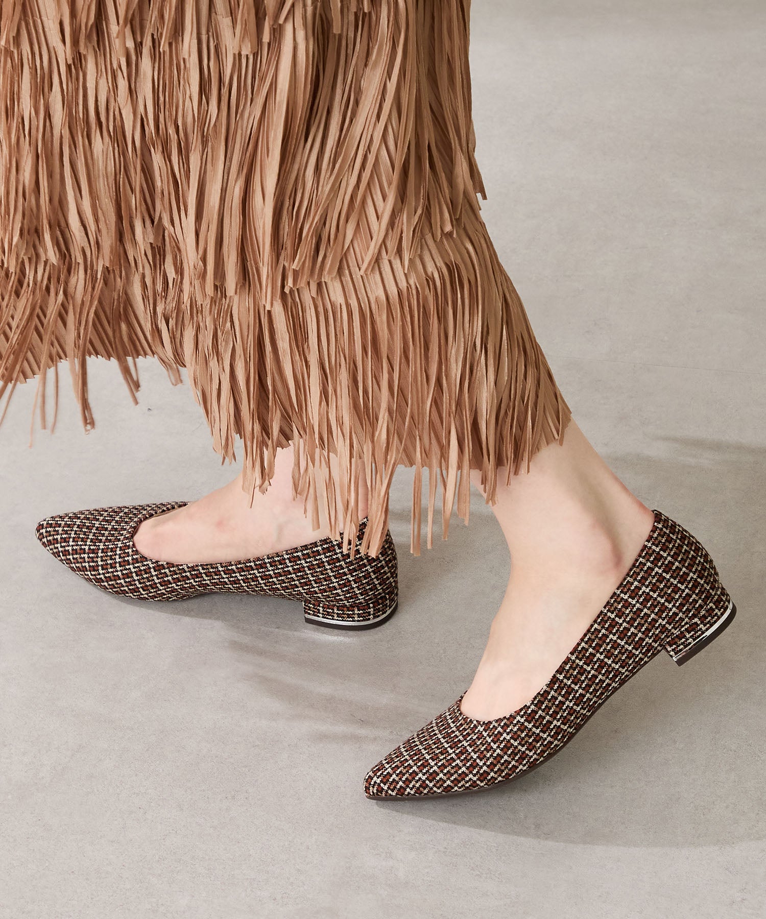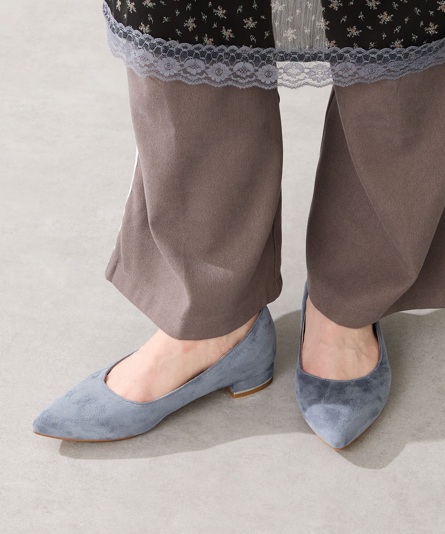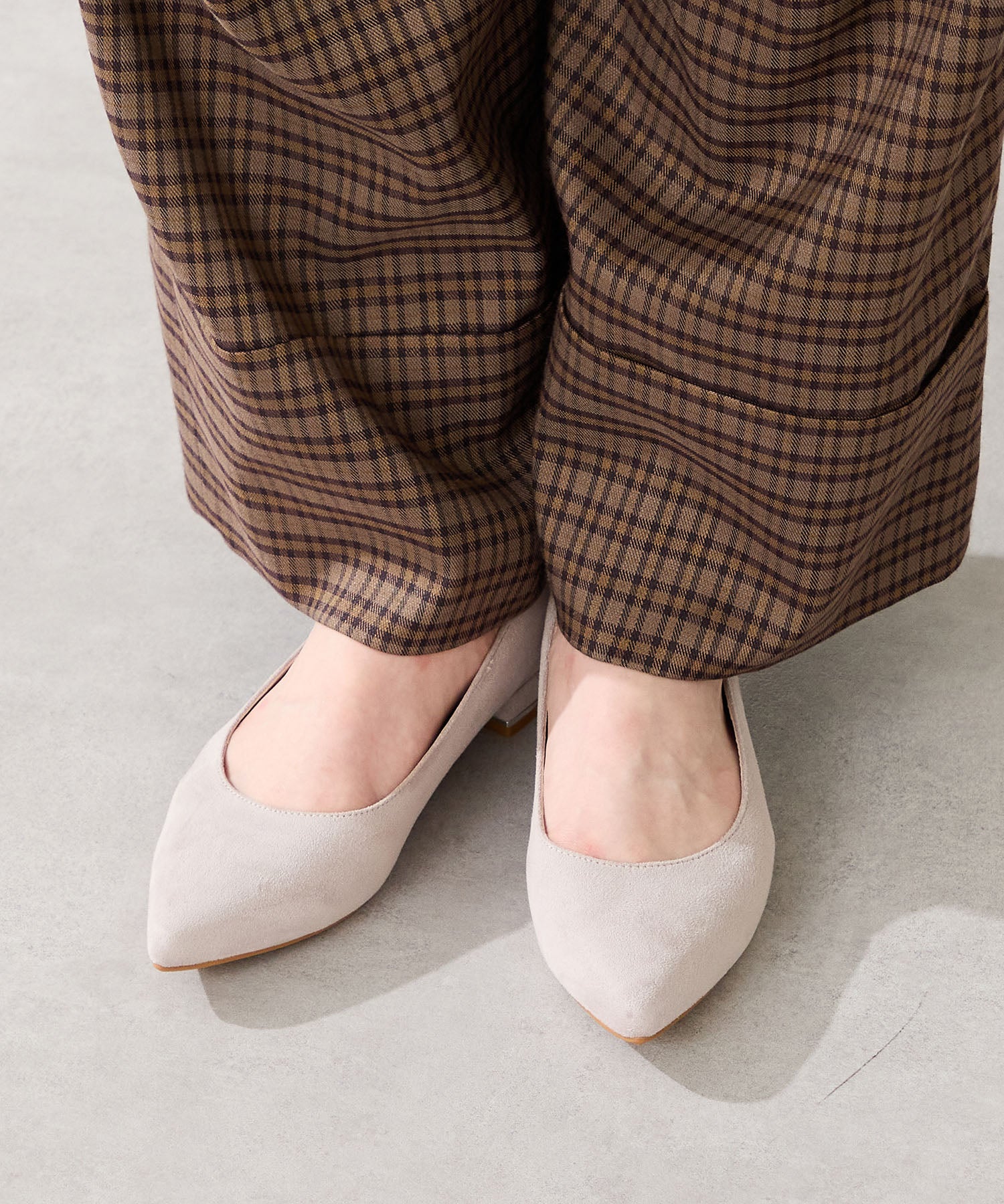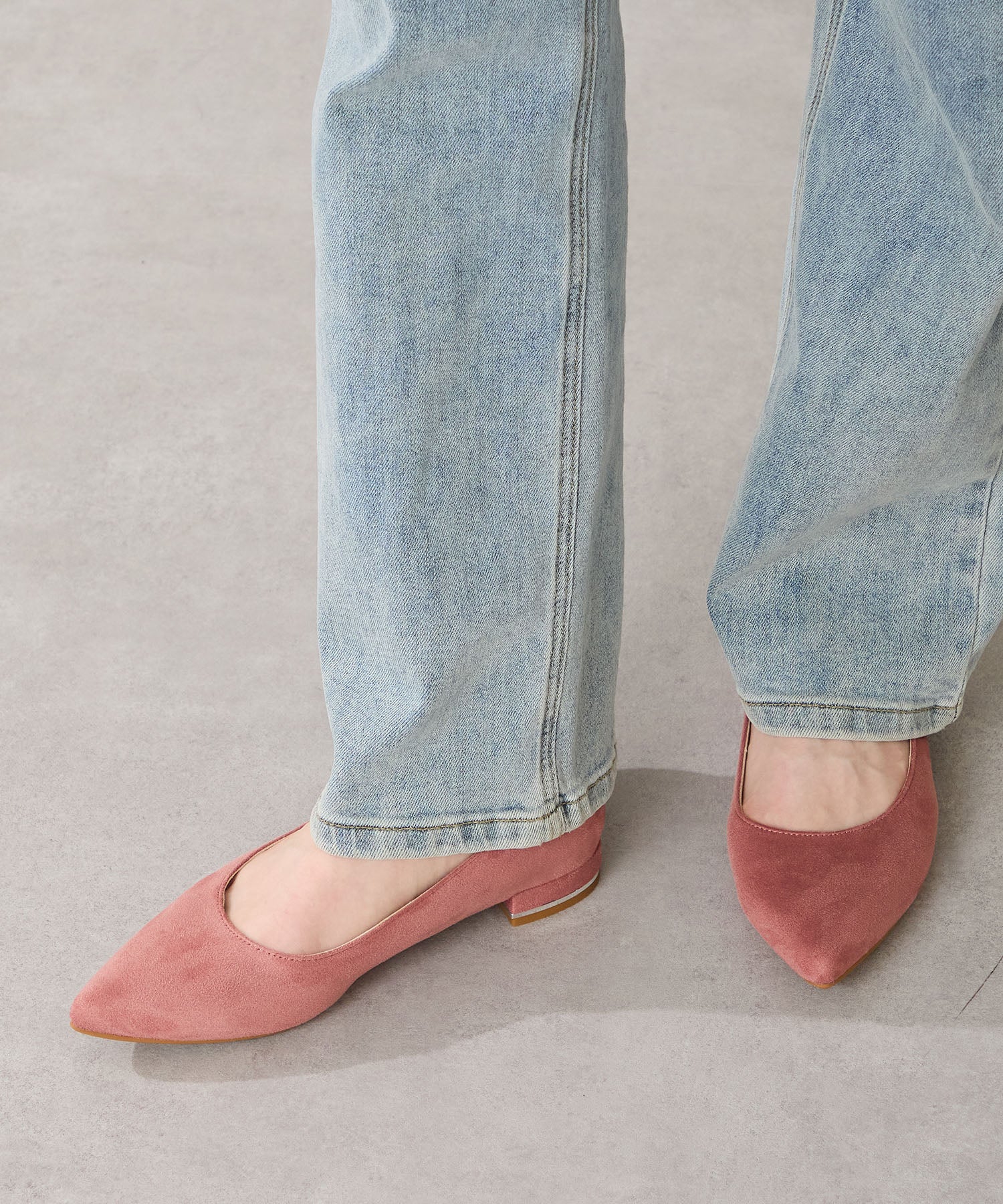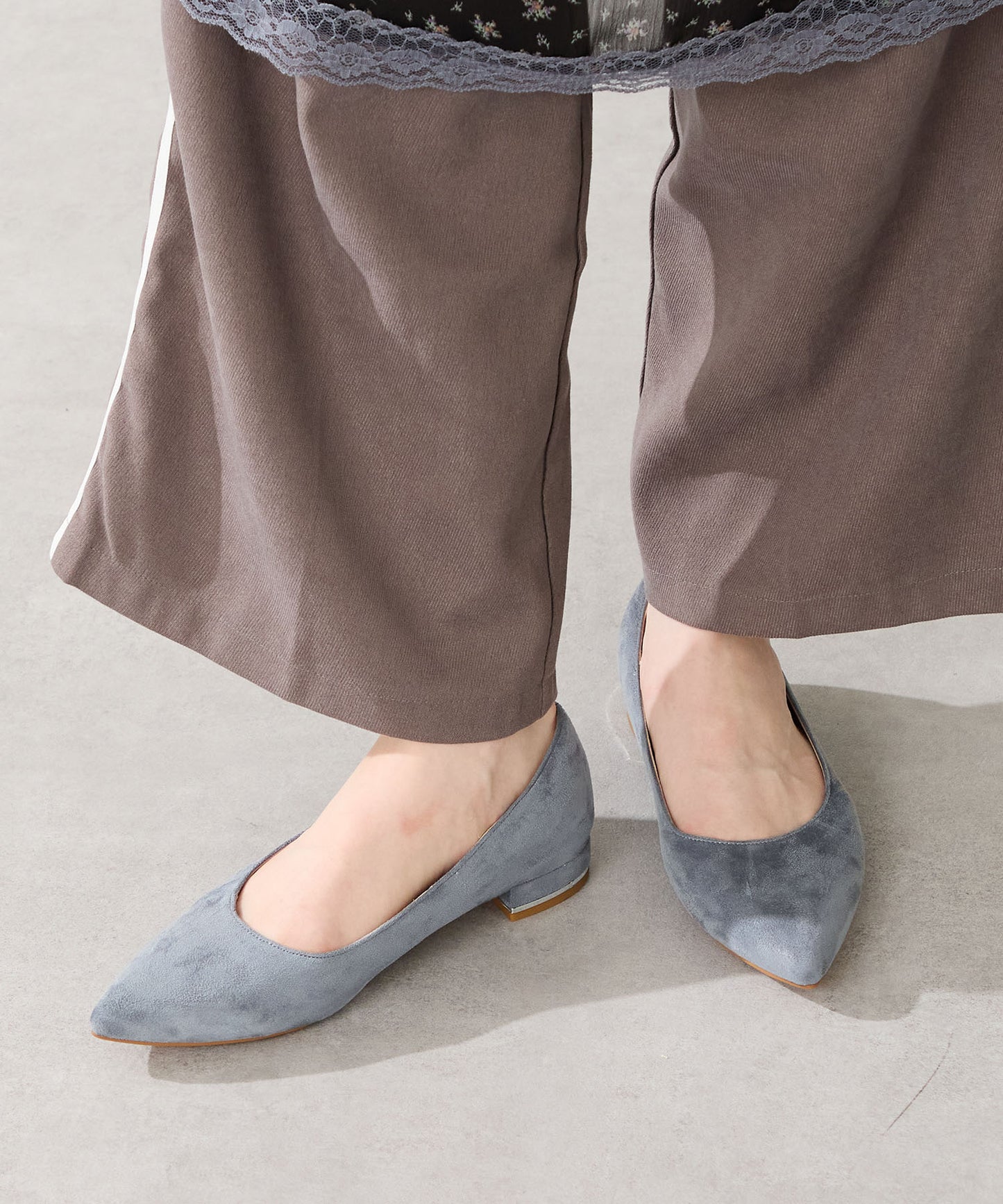 シンプルでデイリー使いしやすいフラットパンプスはシャープなトゥで足元を綺麗に見せてくれる。フラットでも足裏が痛くなりにくい厚手クッションや返りの良いソールなど機能性も抜群。無駄のないデザインながらヒールにはメタリックラインを付けてさりげないワンポイントをプラス。オンオフ使える豊富なカラー展開で色違いで揃えるのもおすすめ。