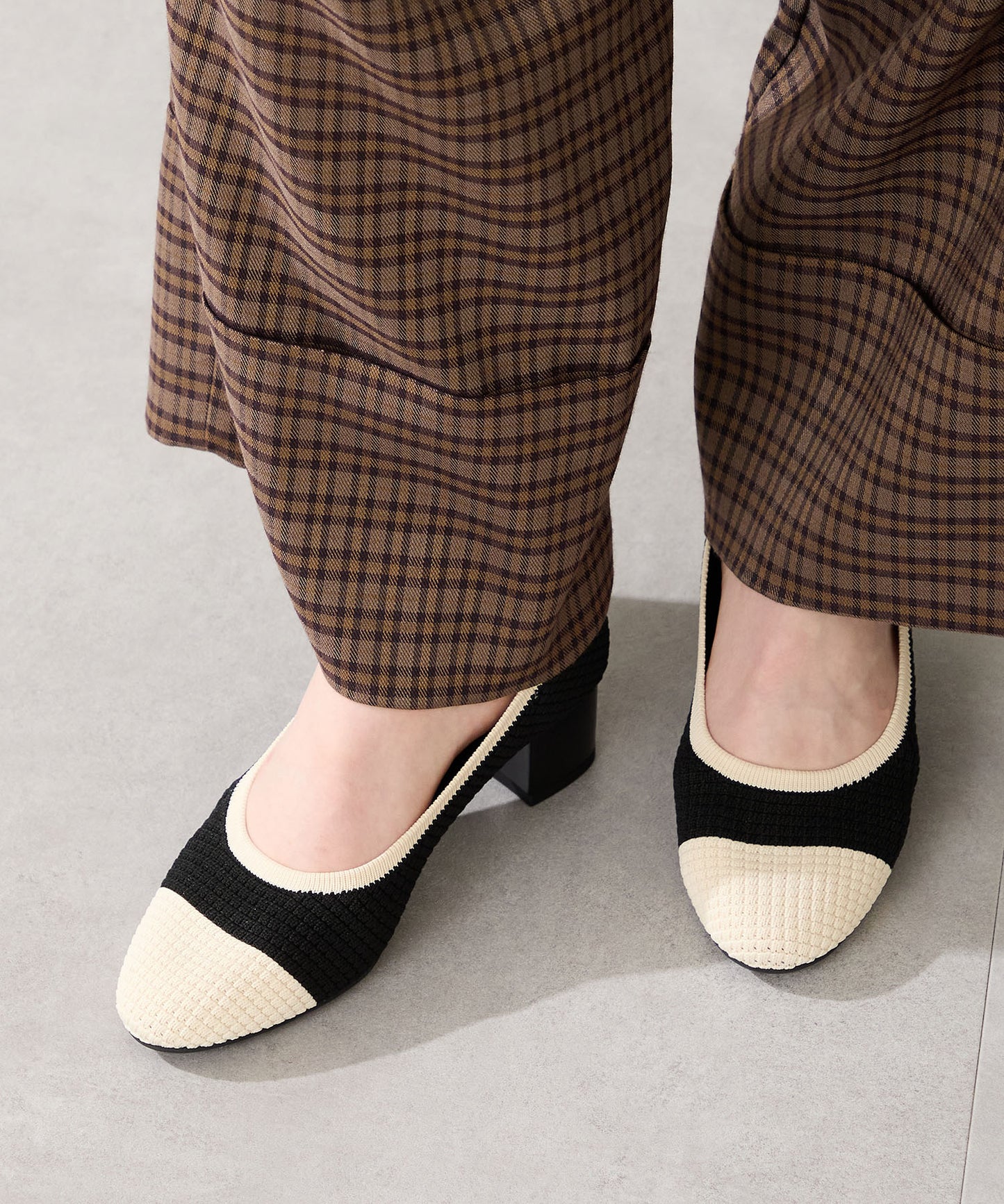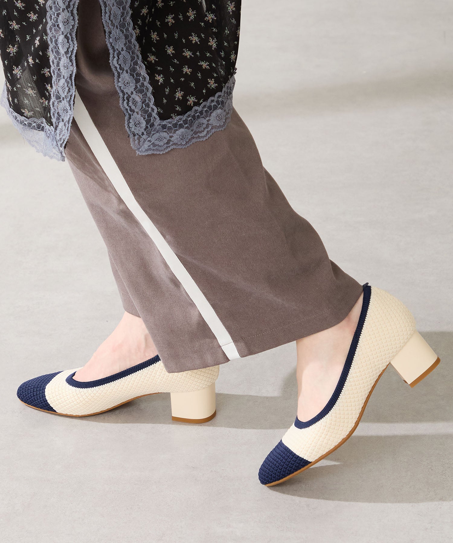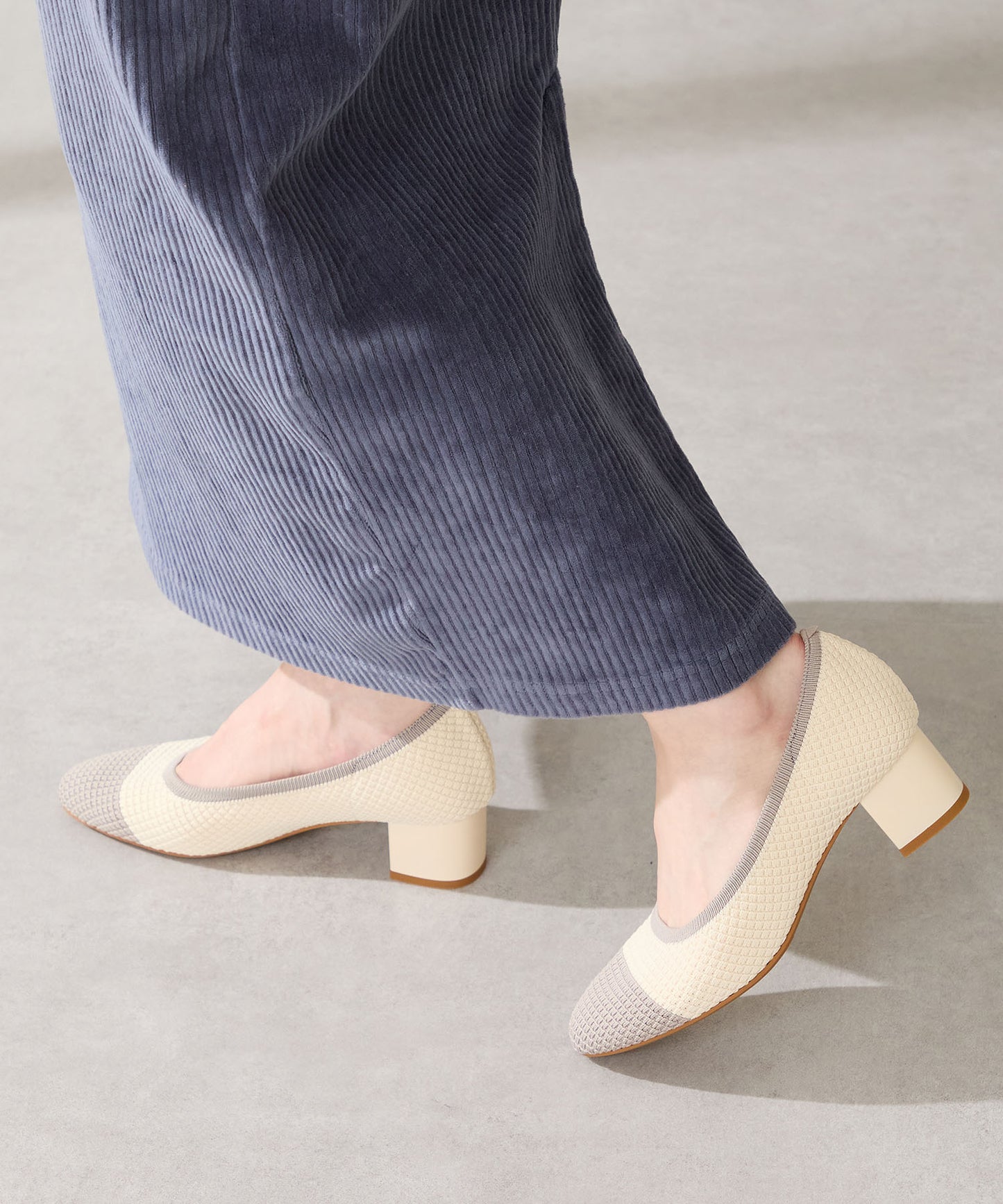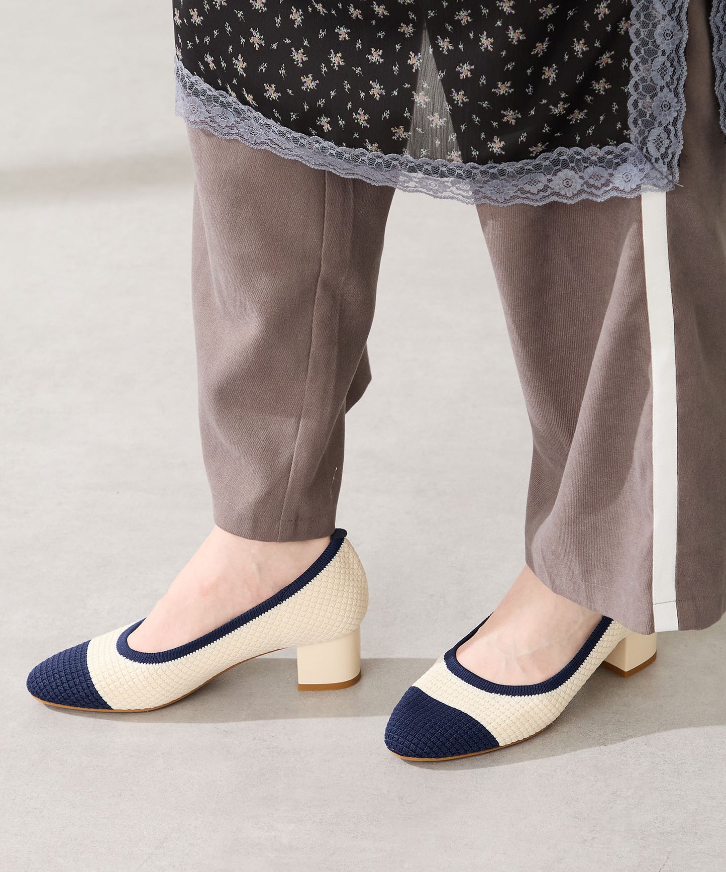 アッパー全体にニット素材を使用した柔らかい足当たりが魅力のパンプスは、つま先と履き口周りをバイカラーの配色にし足元に取り入れるだけでおしゃれ度アップ。丸みのあるラウンドトゥで指先への負担が少なく、4.5cmのヒールは接地面が広いチャンキーヒールで安定感も◎。クッションを搭載した中敷や踵のクッションが足全体を支えてくれ長時間の歩行も安心。