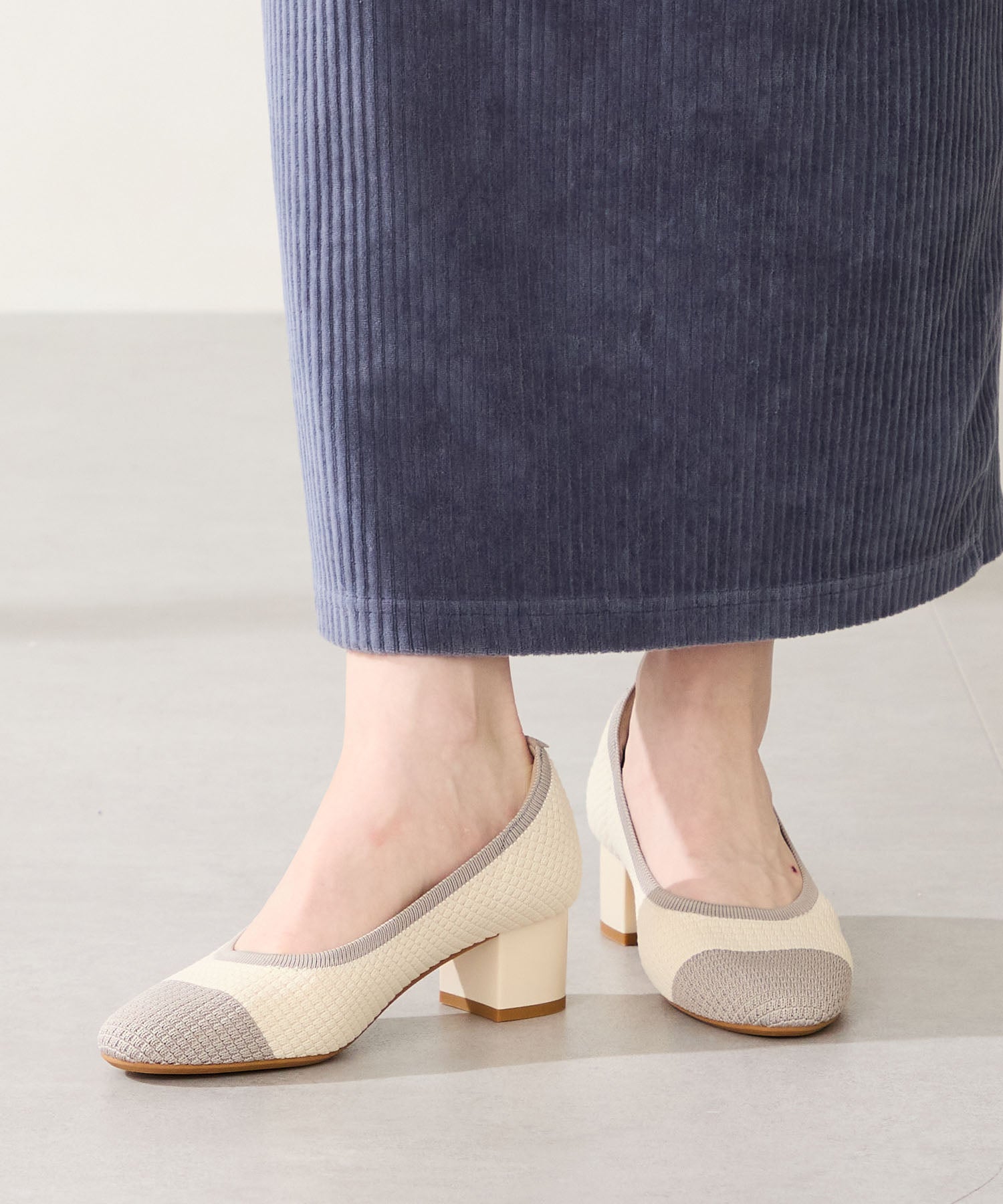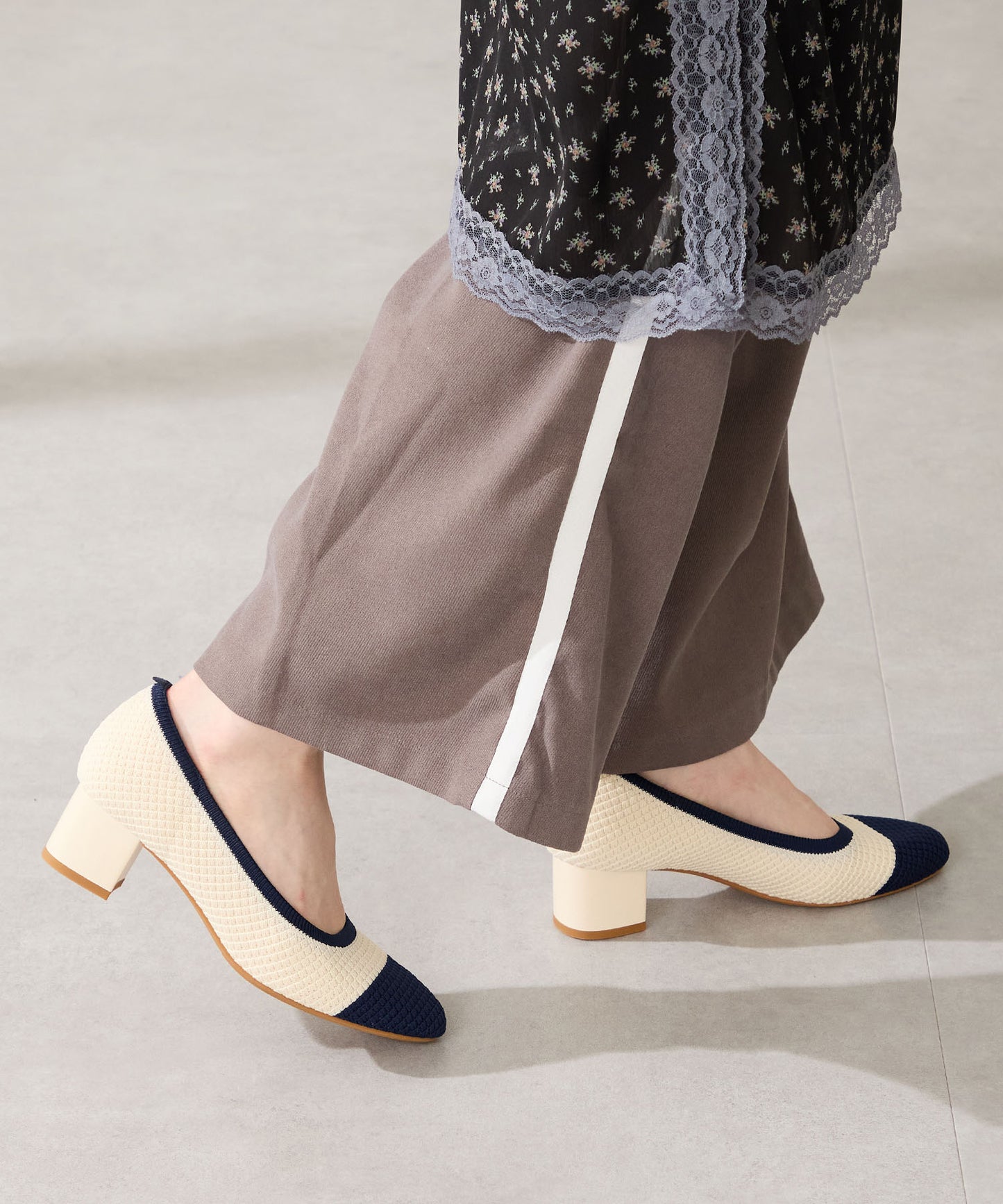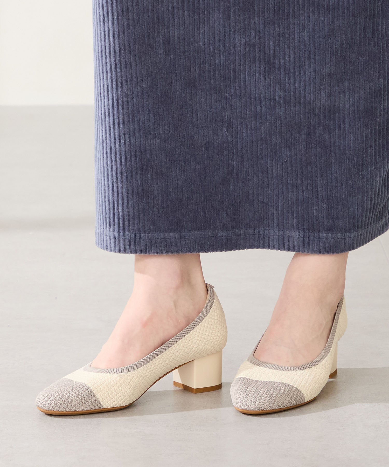 アッパー全体にニット素材を使用した柔らかい足当たりが魅力のパンプスは、つま先と履き口周りをバイカラーの配色にし足元に取り入れるだけでおしゃれ度アップ。丸みのあるラウンドトゥで指先への負担が少なく、4.5cmのヒールは接地面が広いチャンキーヒールで安定感も◎。クッションを搭載した中敷や踵のクッションが足全体を支えてくれ長時間の歩行も安心。