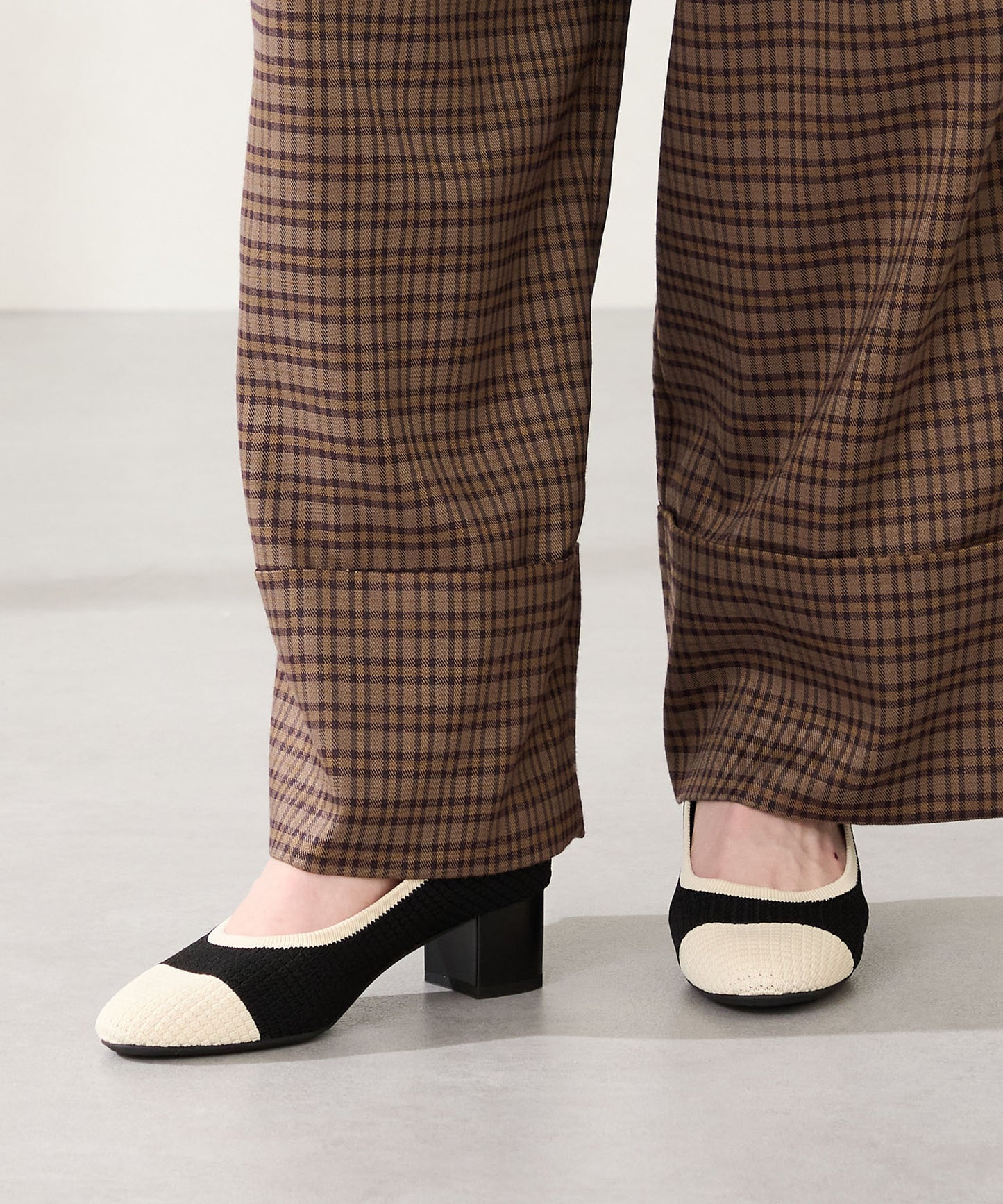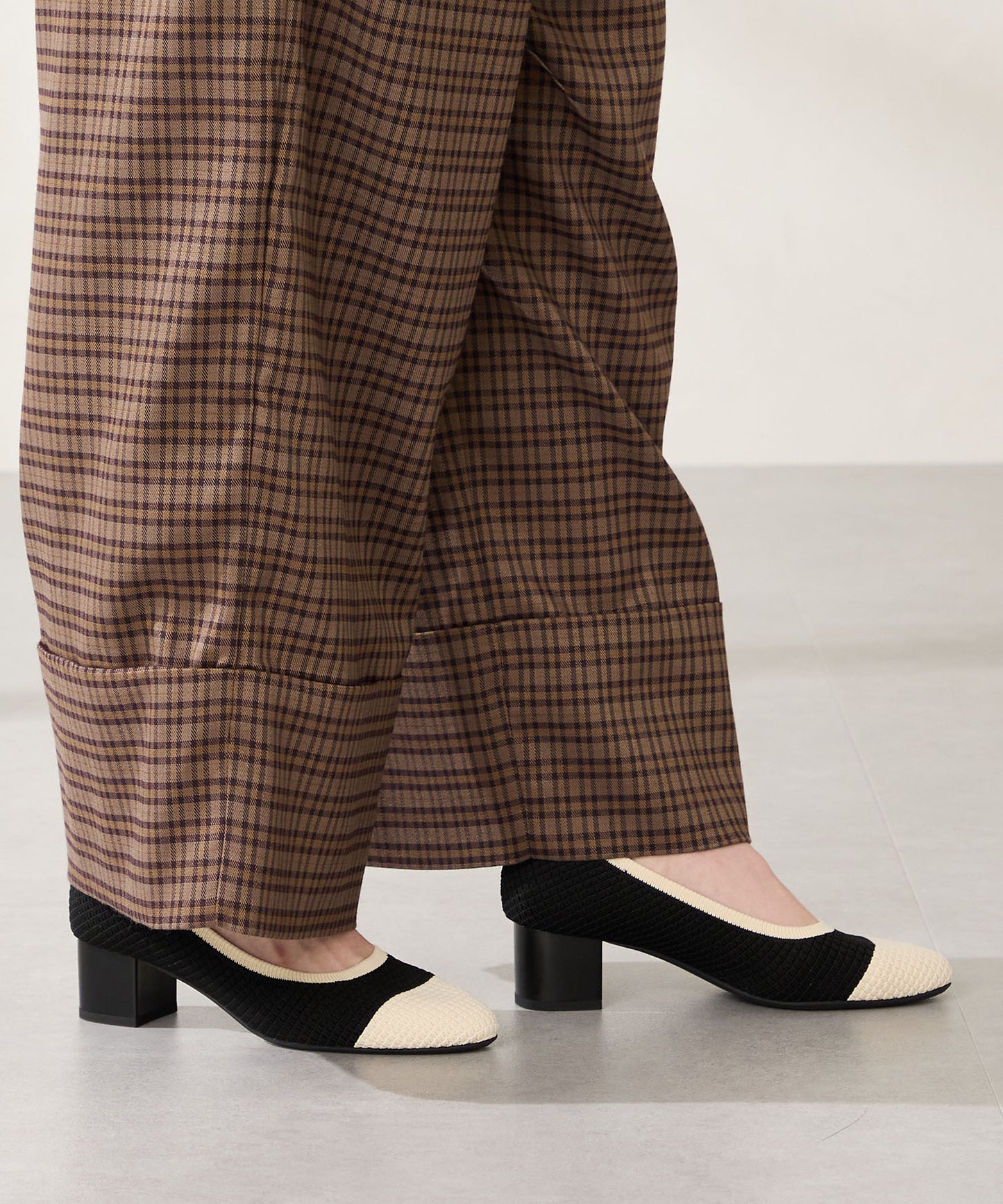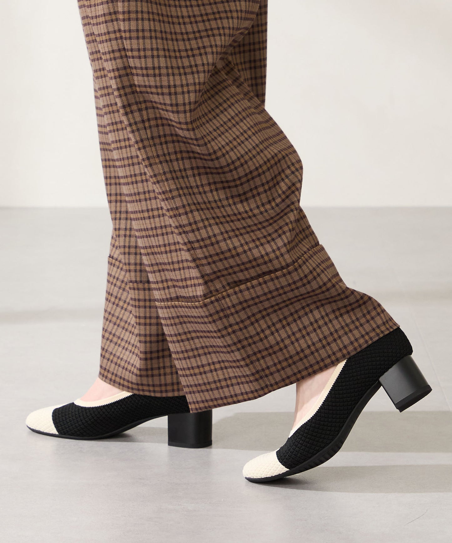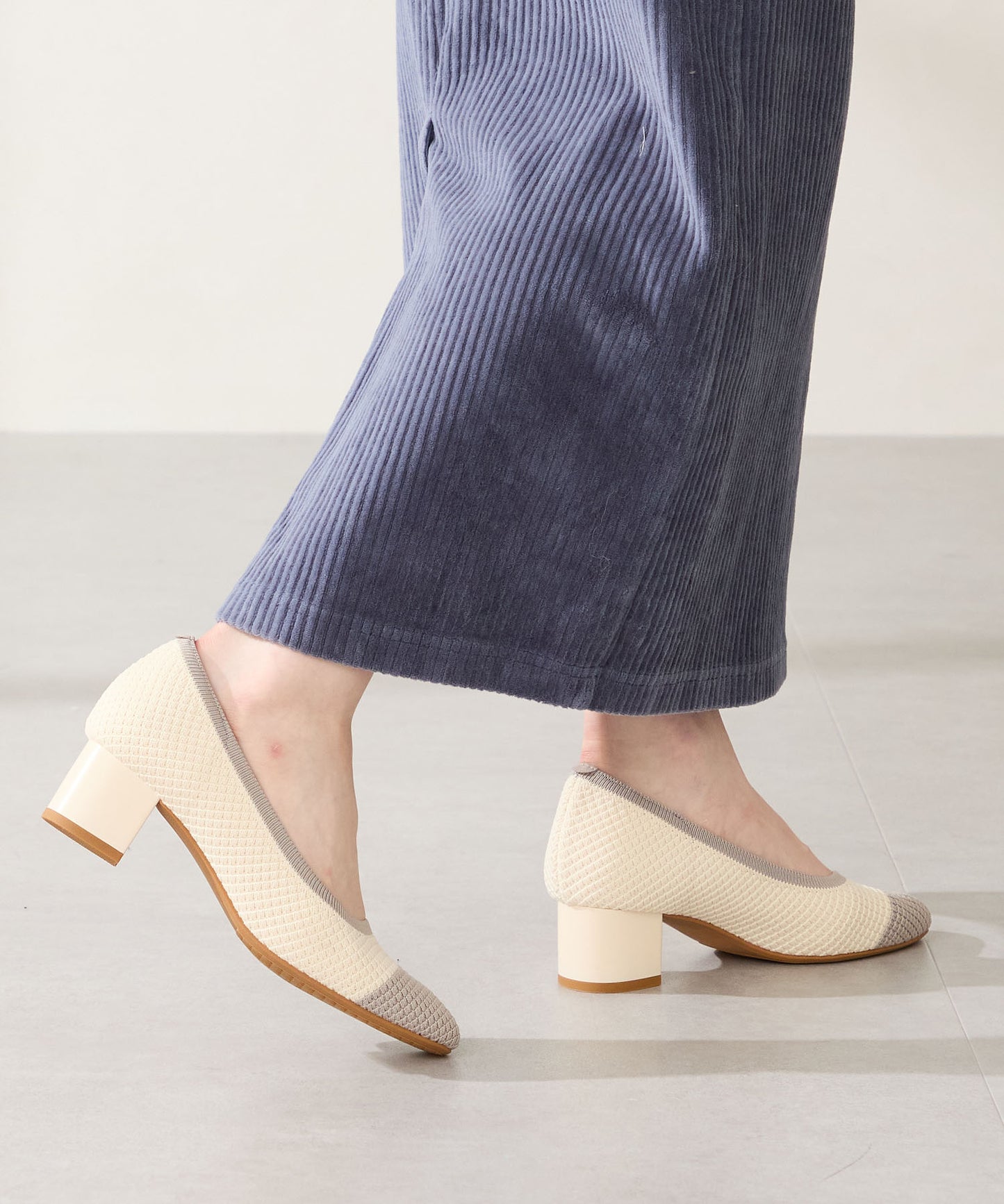 アッパー全体にニット素材を使用した柔らかい足当たりが魅力のパンプスは、つま先と履き口周りをバイカラーの配色にし足元に取り入れるだけでおしゃれ度アップ。丸みのあるラウンドトゥで指先への負担が少なく、4.5cmのヒールは接地面が広いチャンキーヒールで安定感も◎。クッションを搭載した中敷や踵のクッションが足全体を支えてくれ長時間の歩行も安心。