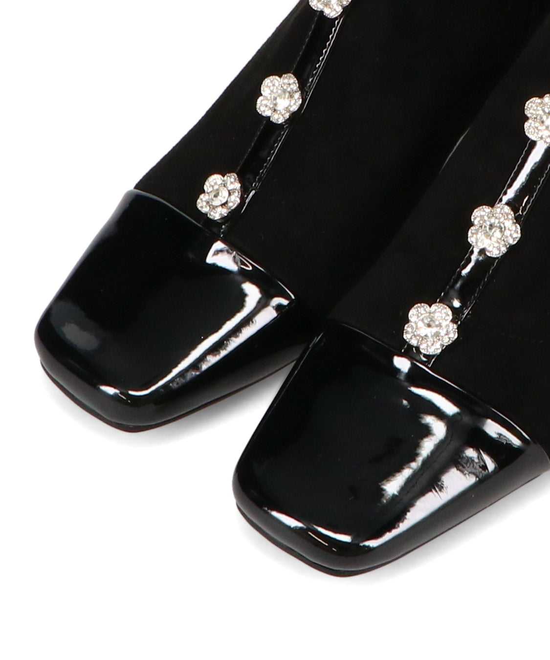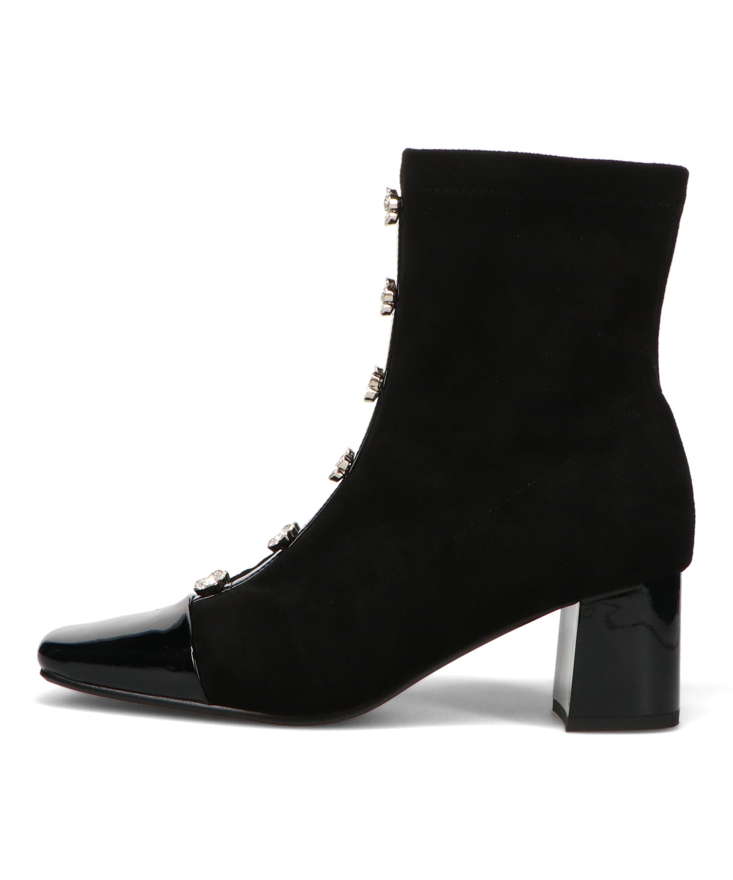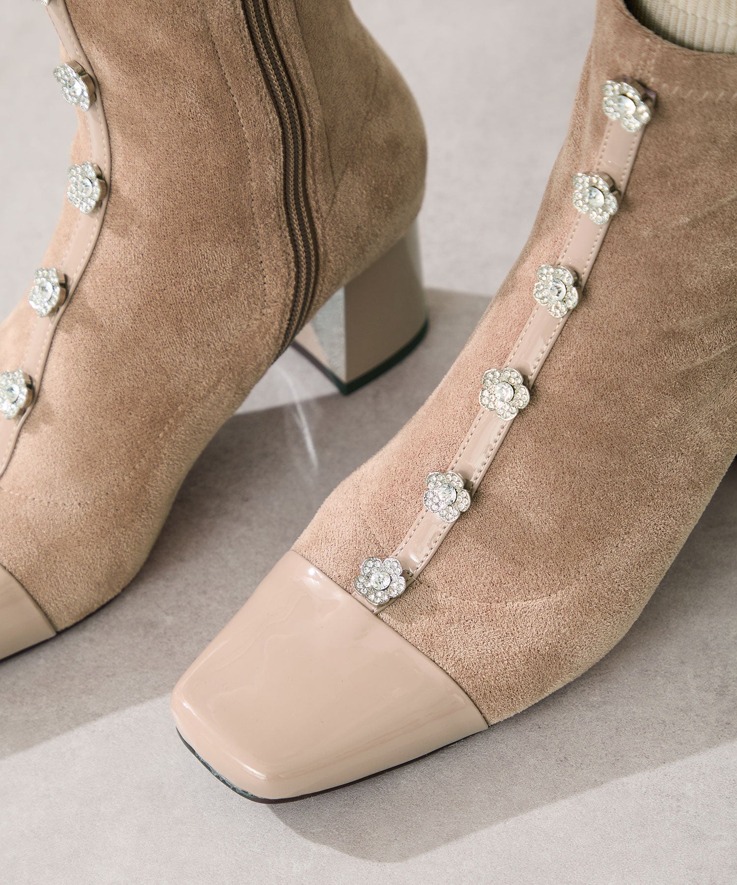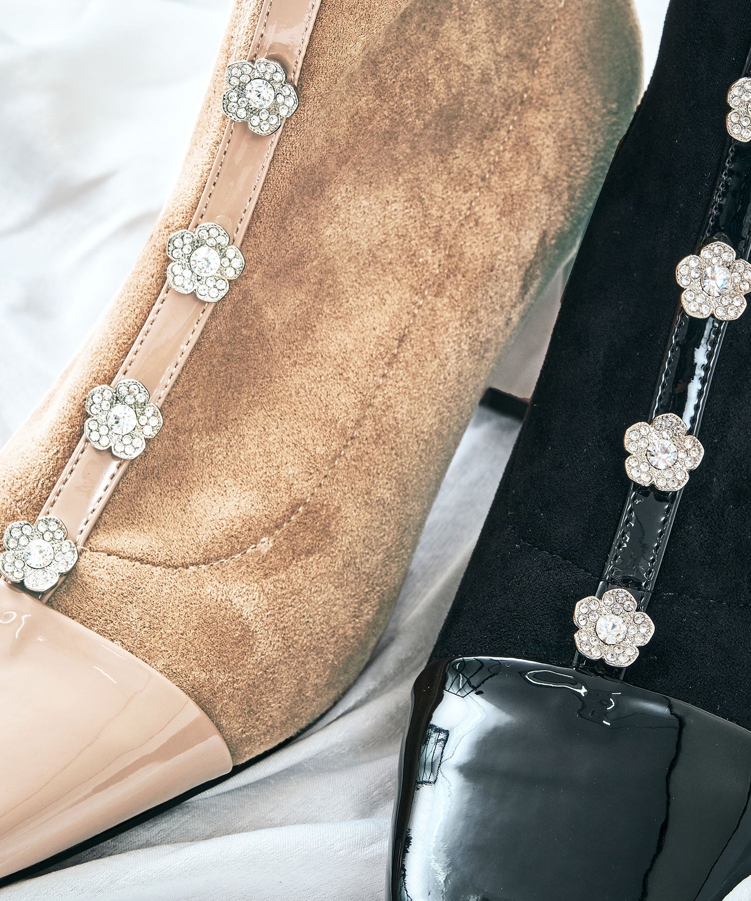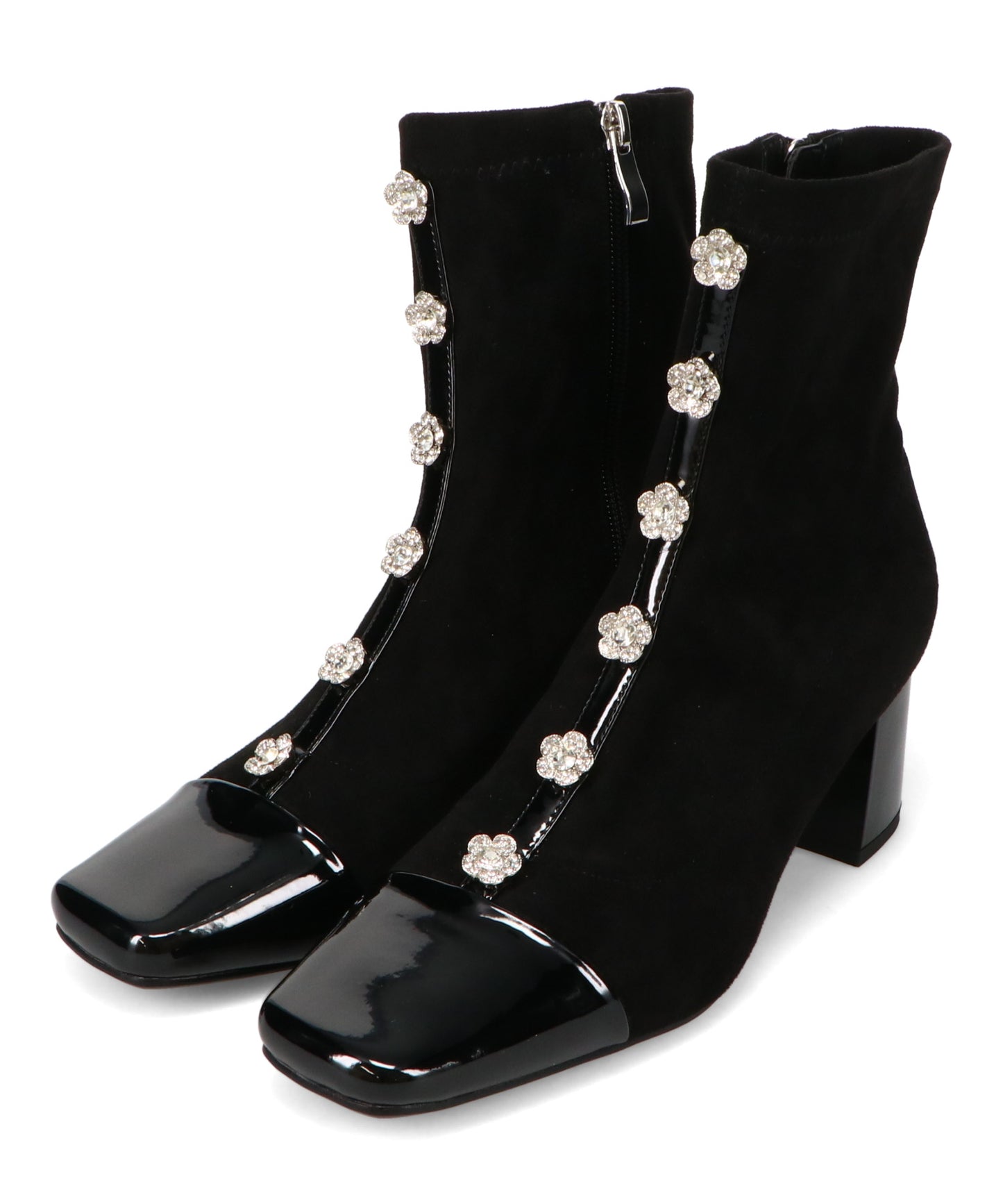 大胆にフロントに飾ったフラワーモチーフのビジューがお洒落見えするブーツ。ストレッチの効いたスエード素材で足にぴったりと沿うような筒回りにすることで、女性らしい綺麗な美脚シルエットを実現してくれる。つま先とセンターシームには艶のあるエナメル素材で切替を付けることで、甘さとカッコ良さがMIXした高見えブーツが完成。