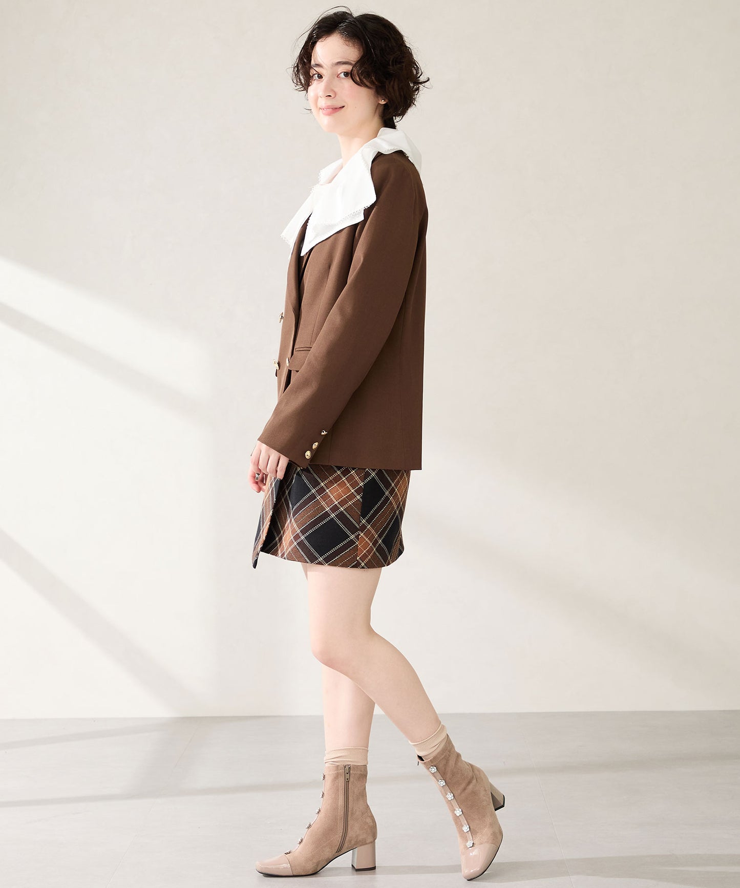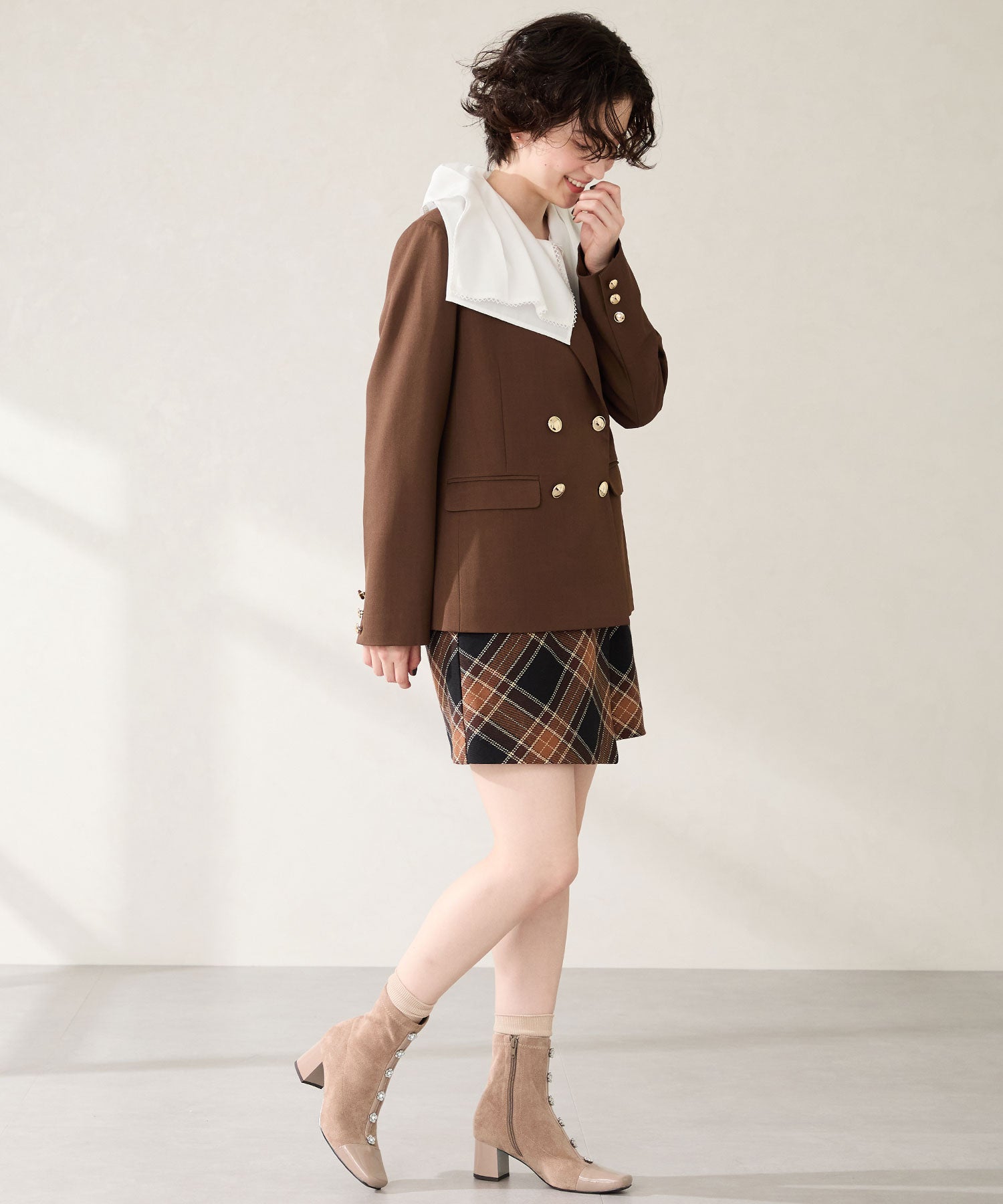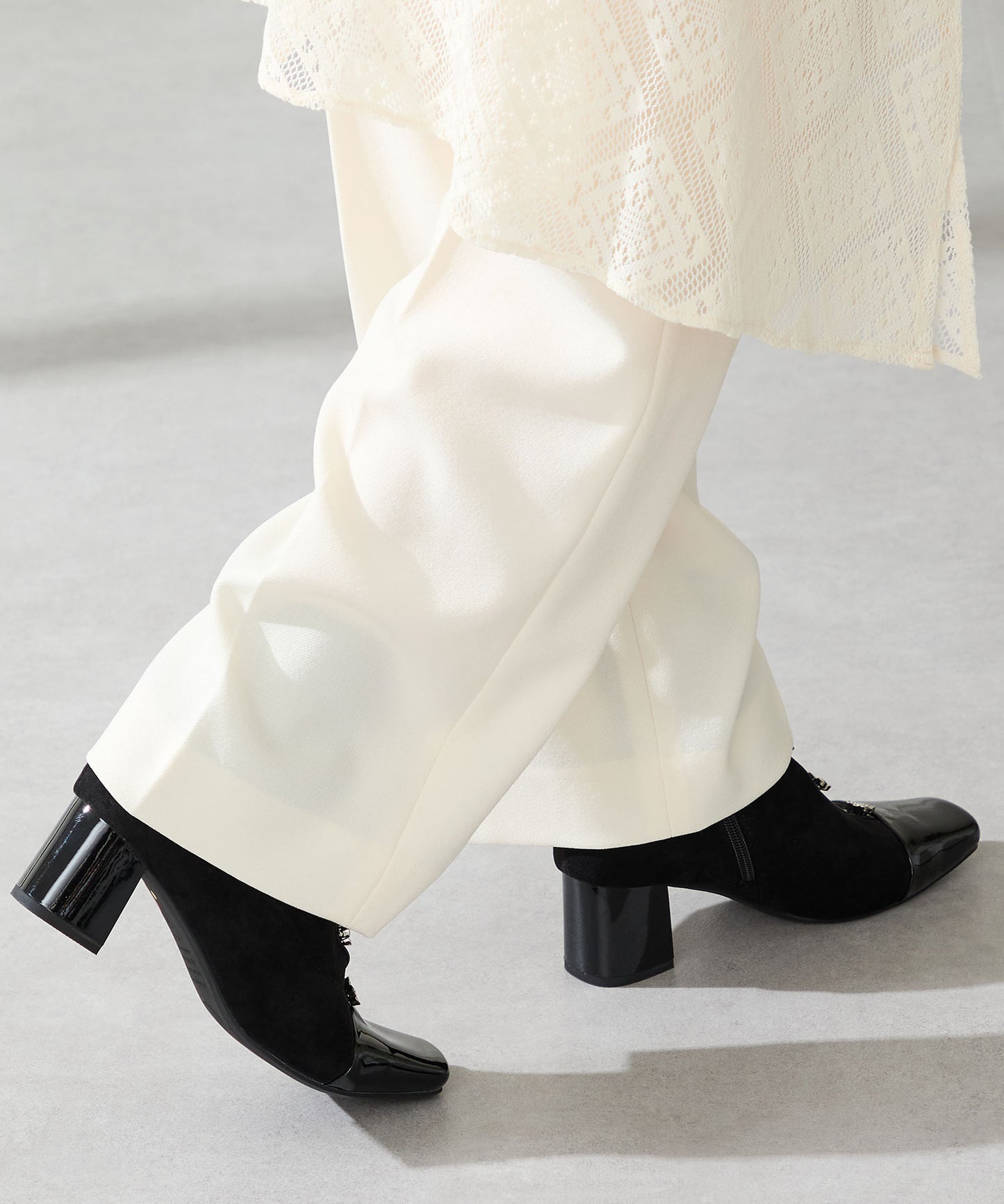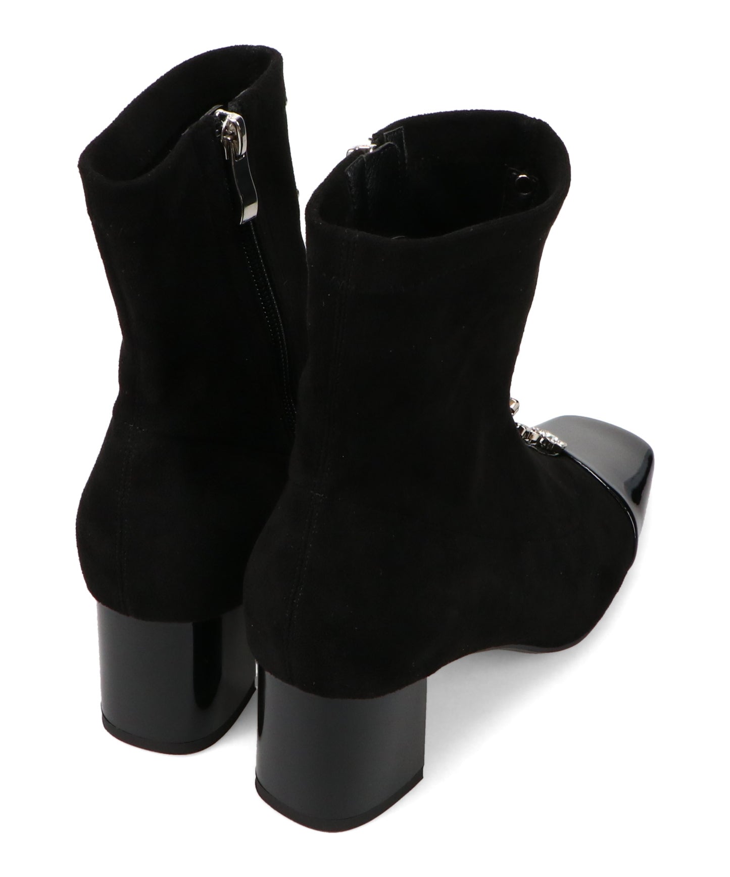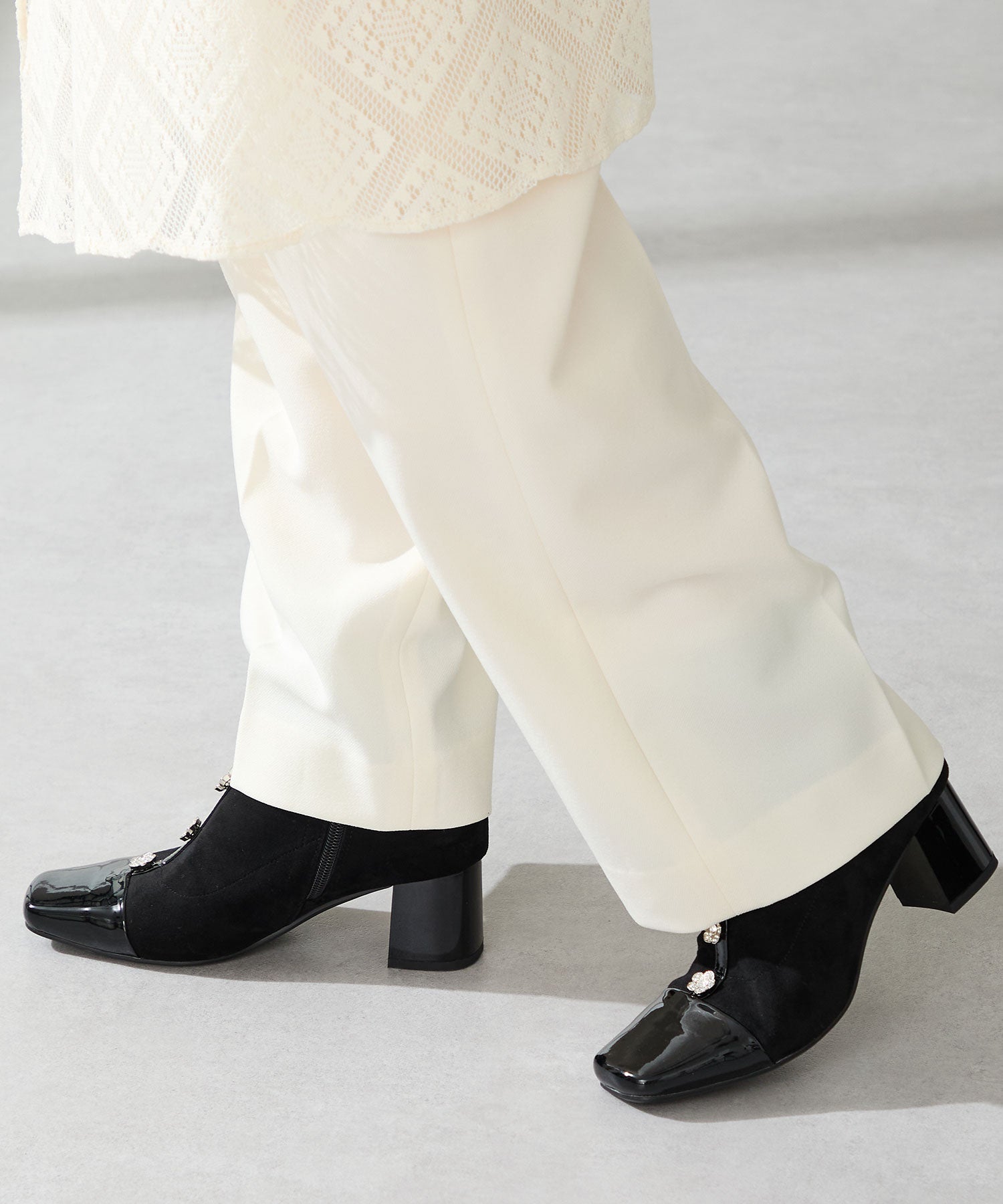 大胆にフロントに飾ったフラワーモチーフのビジューがお洒落見えするブーツ。ストレッチの効いたスエード素材で足にぴったりと沿うような筒回りにすることで、女性らしい綺麗な美脚シルエットを実現してくれる。つま先とセンターシームには艶のあるエナメル素材で切替を付けることで、甘さとカッコ良さがMIXした高見えブーツが完成。