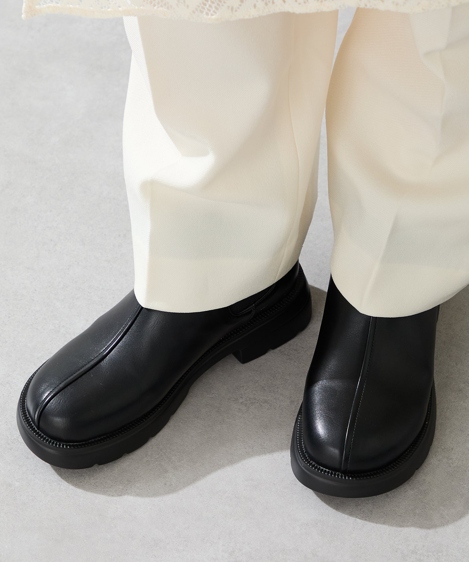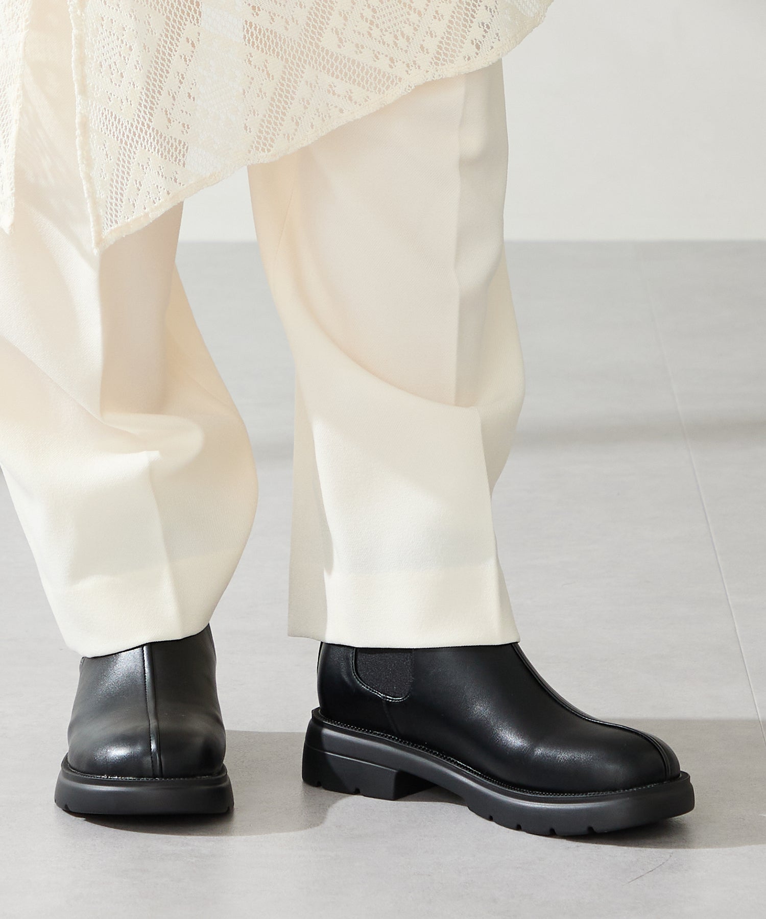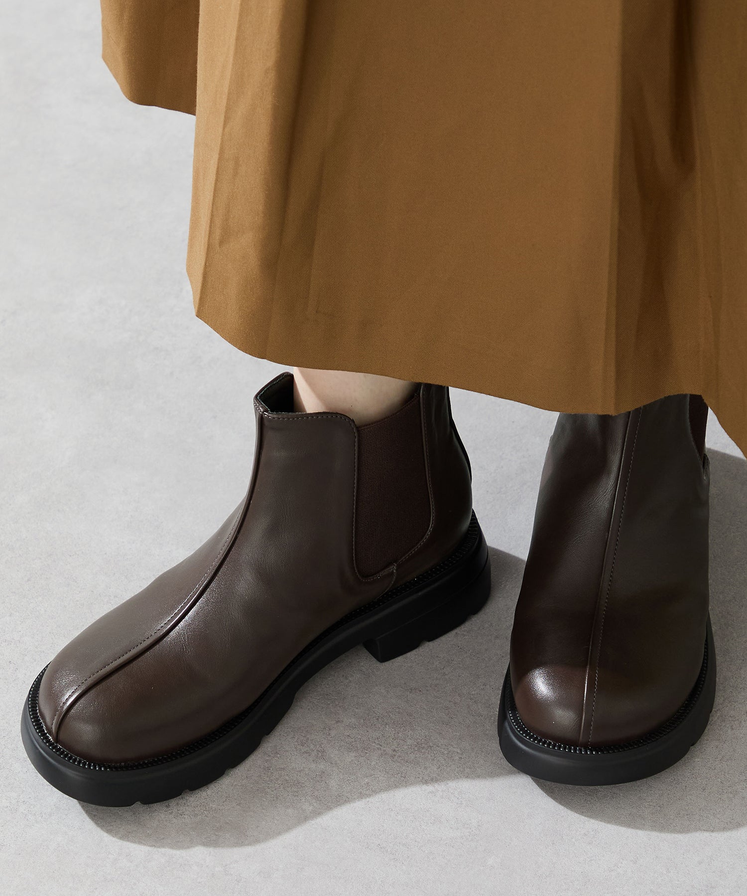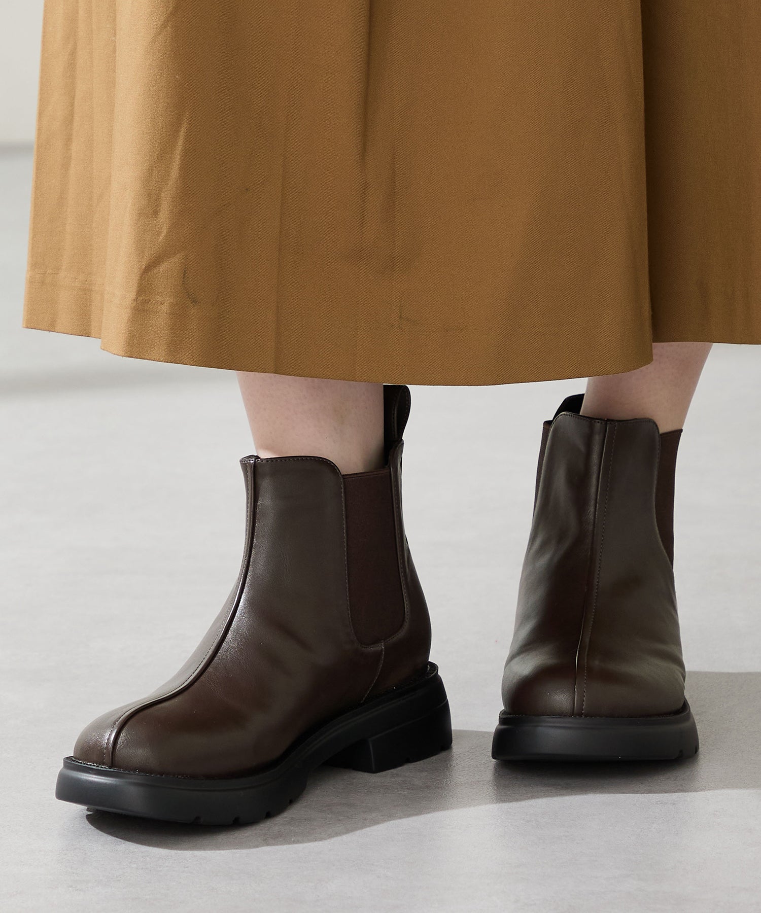 定番のサイドゴアブーツは、丸みのあるオブリークトゥで今っぽいフォルムに、センターに入れた立体的な切替デザインでひと癖加えたアイテム。絶妙な厚さのソールは軽い材質を使用することで足運びがしやすく、ジップのないゴアデザインで着脱も楽ちん。コーディネートを選ばない短めの丈感に、ブラックとダークトーンのブラウンの合わせやすい2色展開でこの冬大活躍しそう。