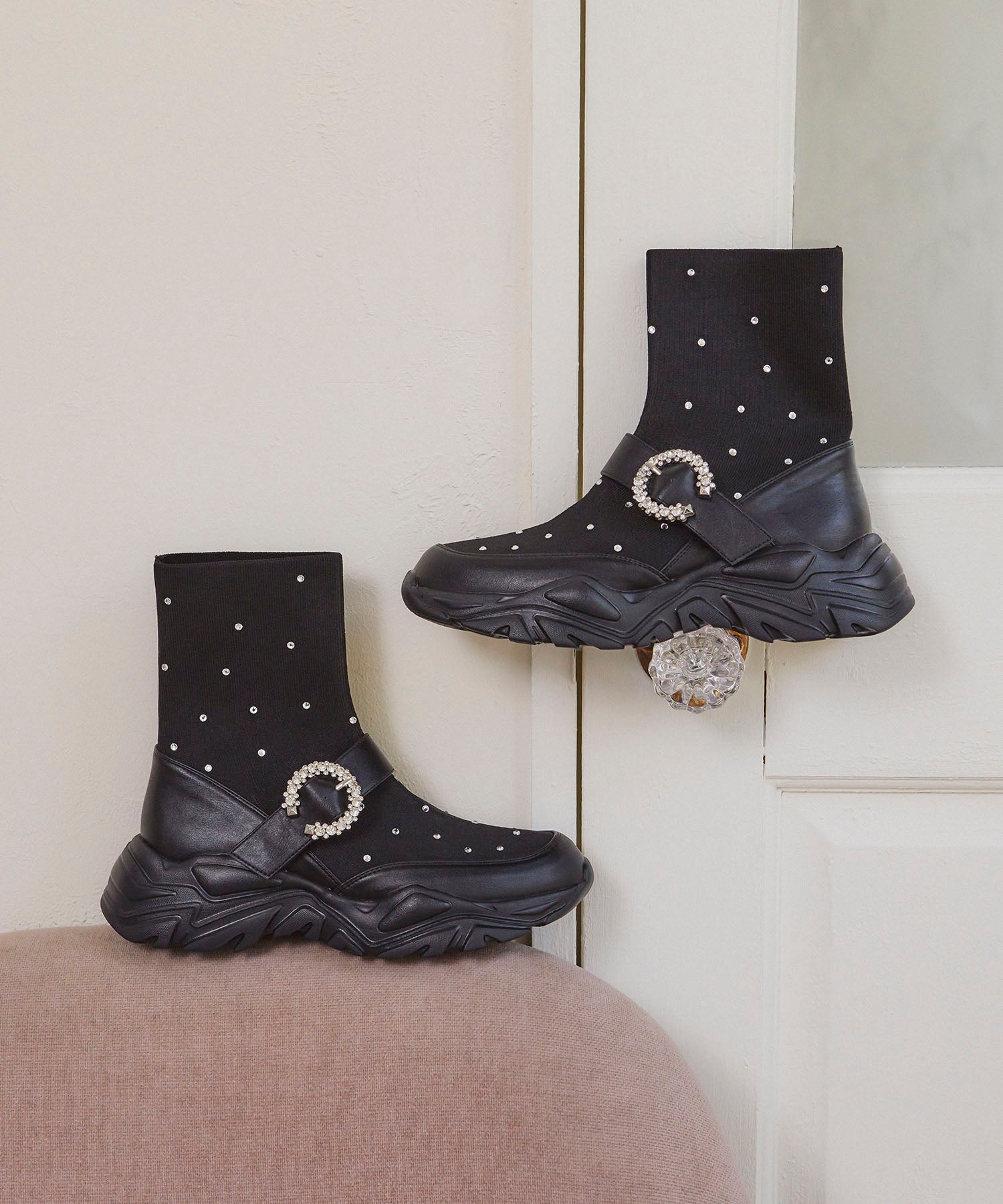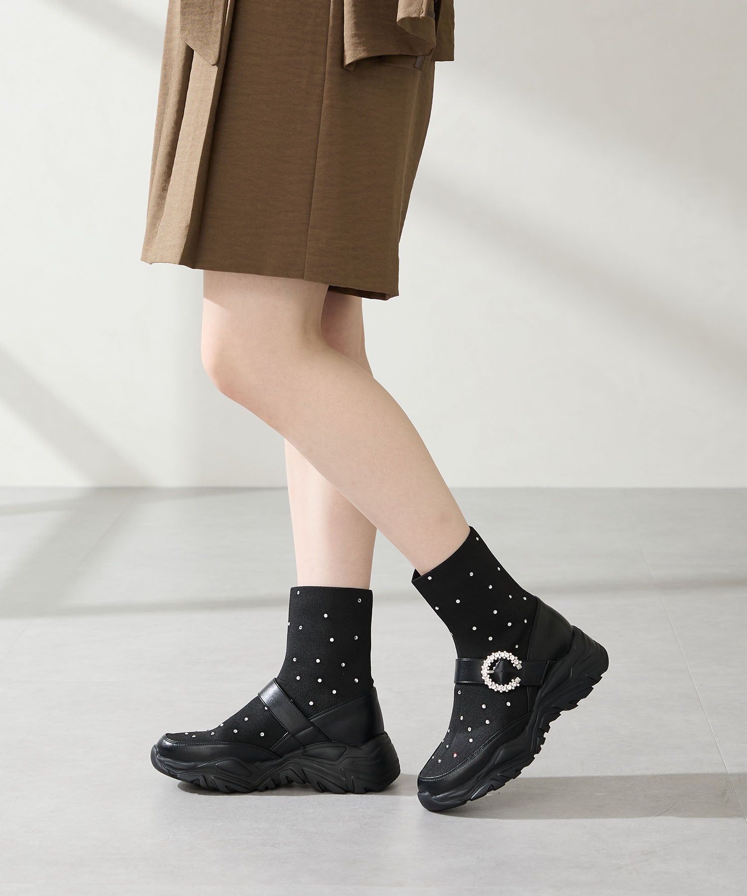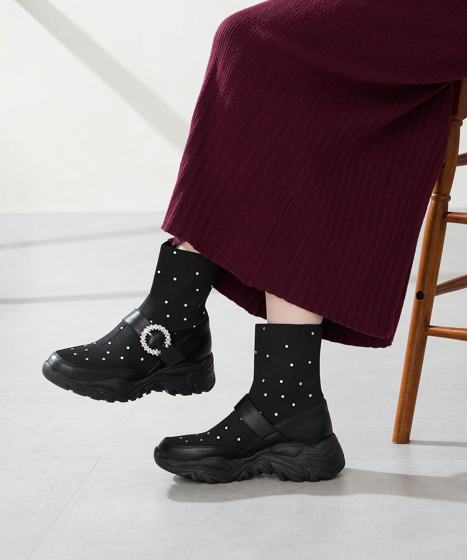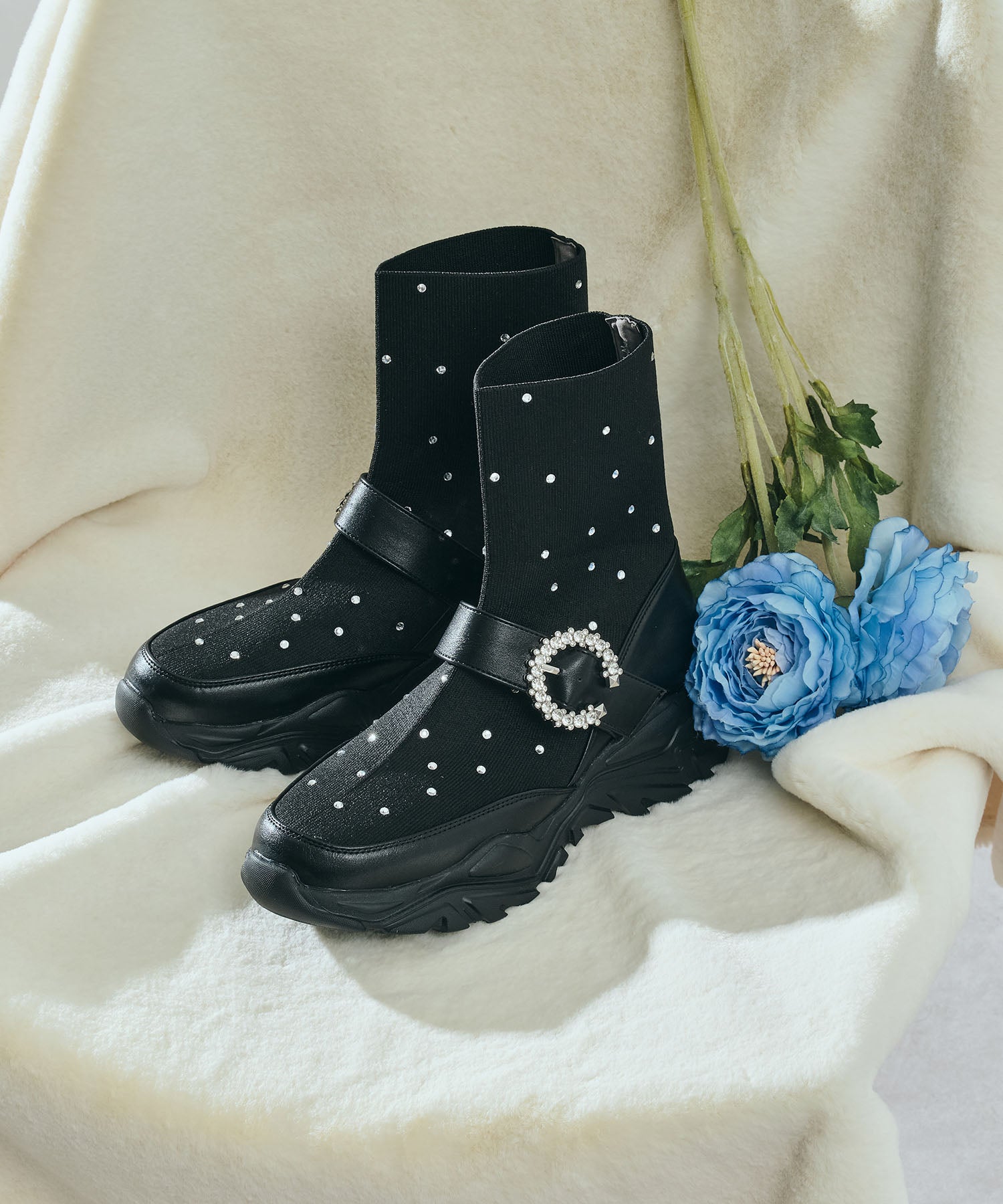 ビジューモチーフをあしらったベルトに、ラインストーンを全体に散りばめたデコラティブなデザインで特別感のあるブーツ。あえてカジュアルなスニーカーソールを組み合わせることでエレガンスな雰囲気とのアンバランス感が今っぽい。伸縮性のあるニット素材は足当たりが優しく、厚手クッションを内蔵したインソールはナイロン素材で履きやすさまで追及した1足。