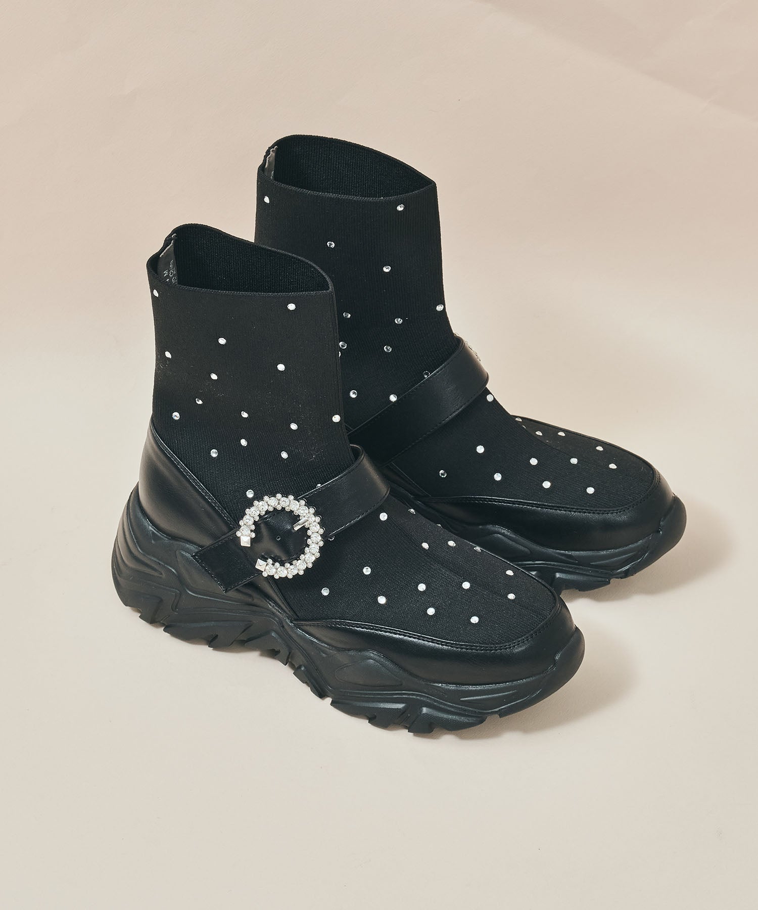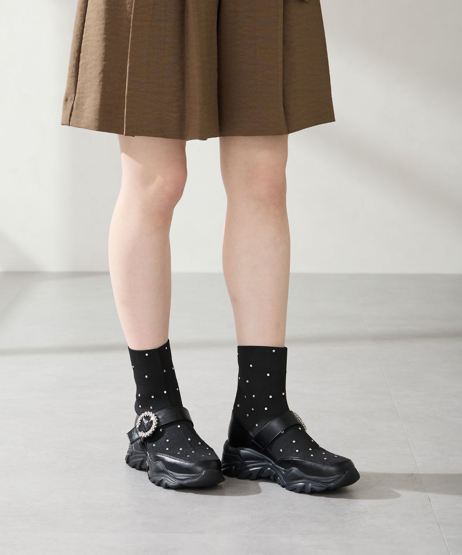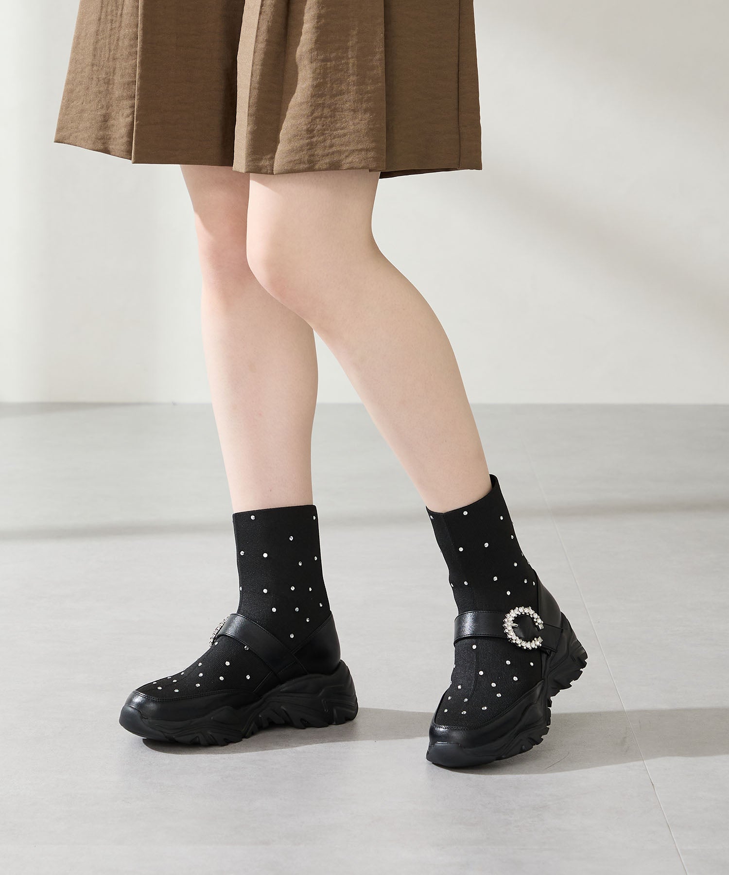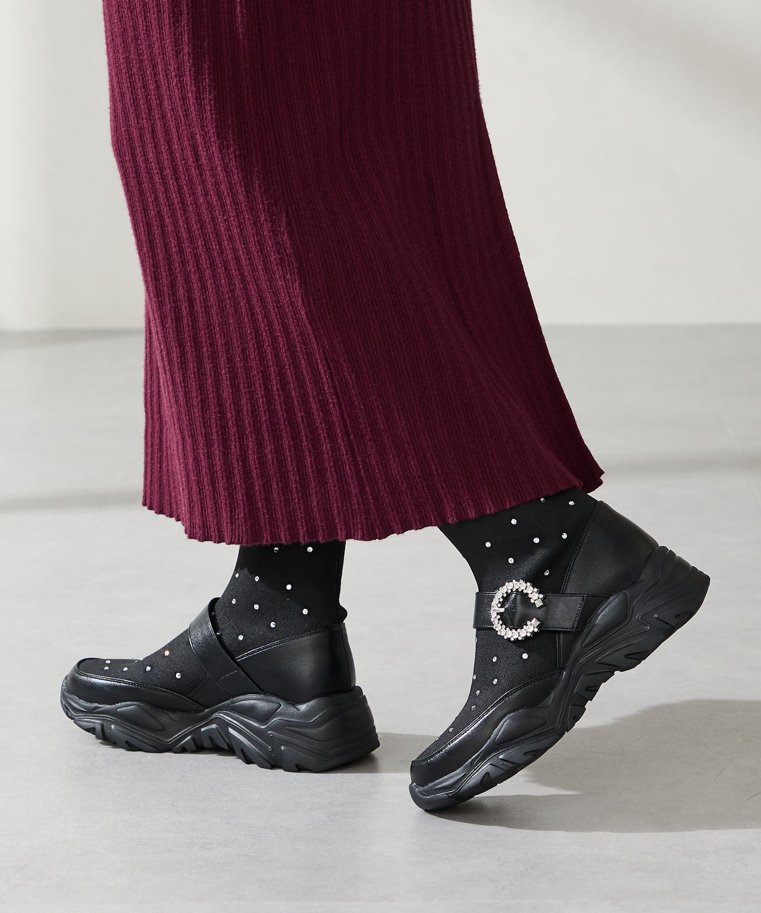 ビジューモチーフをあしらったベルトに、ラインストーンを全体に散りばめたデコラティブなデザインで特別感のあるブーツ。あえてカジュアルなスニーカーソールを組み合わせることでエレガンスな雰囲気とのアンバランス感が今っぽい。伸縮性のあるニット素材は足当たりが優しく、厚手クッションを内蔵したインソールはナイロン素材で履きやすさまで追及した1足。