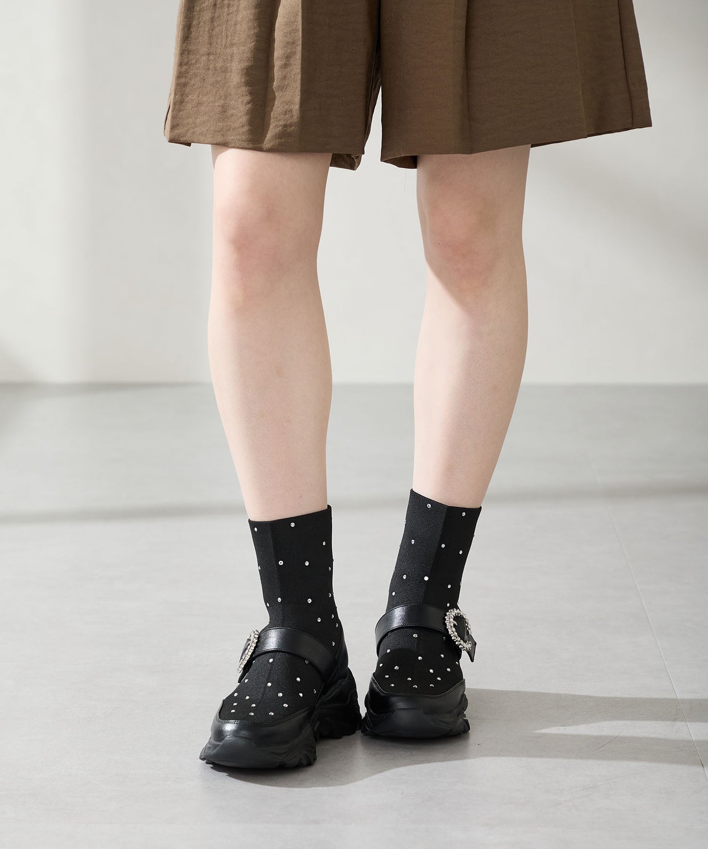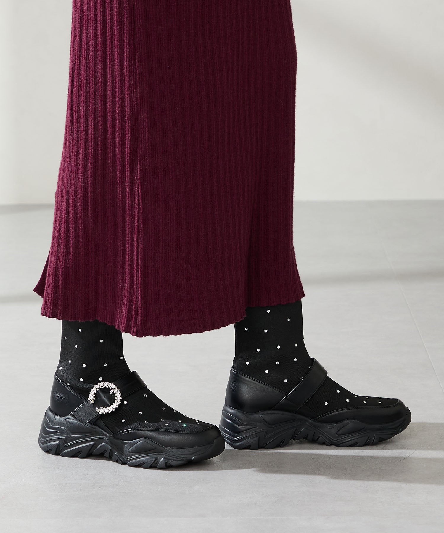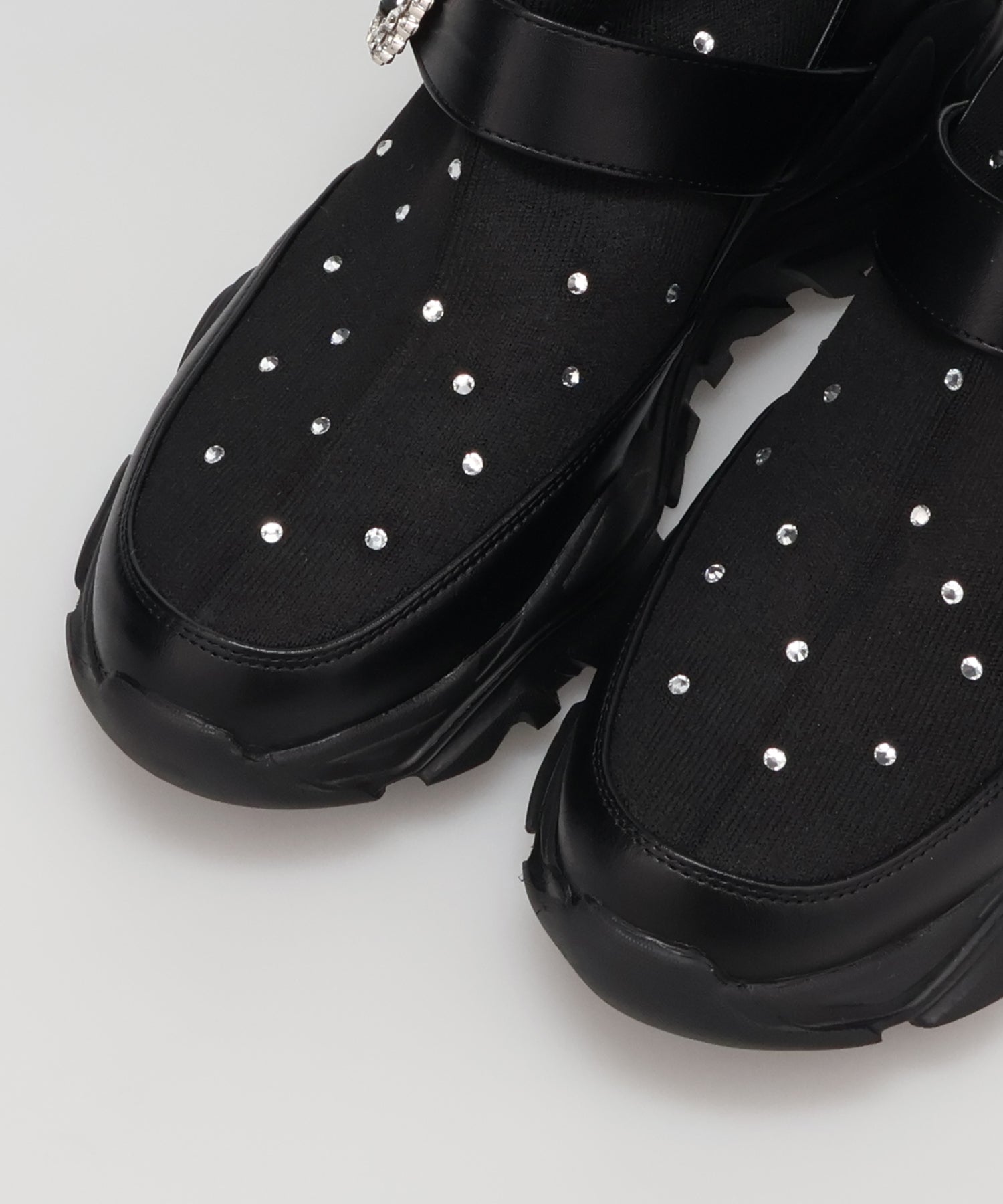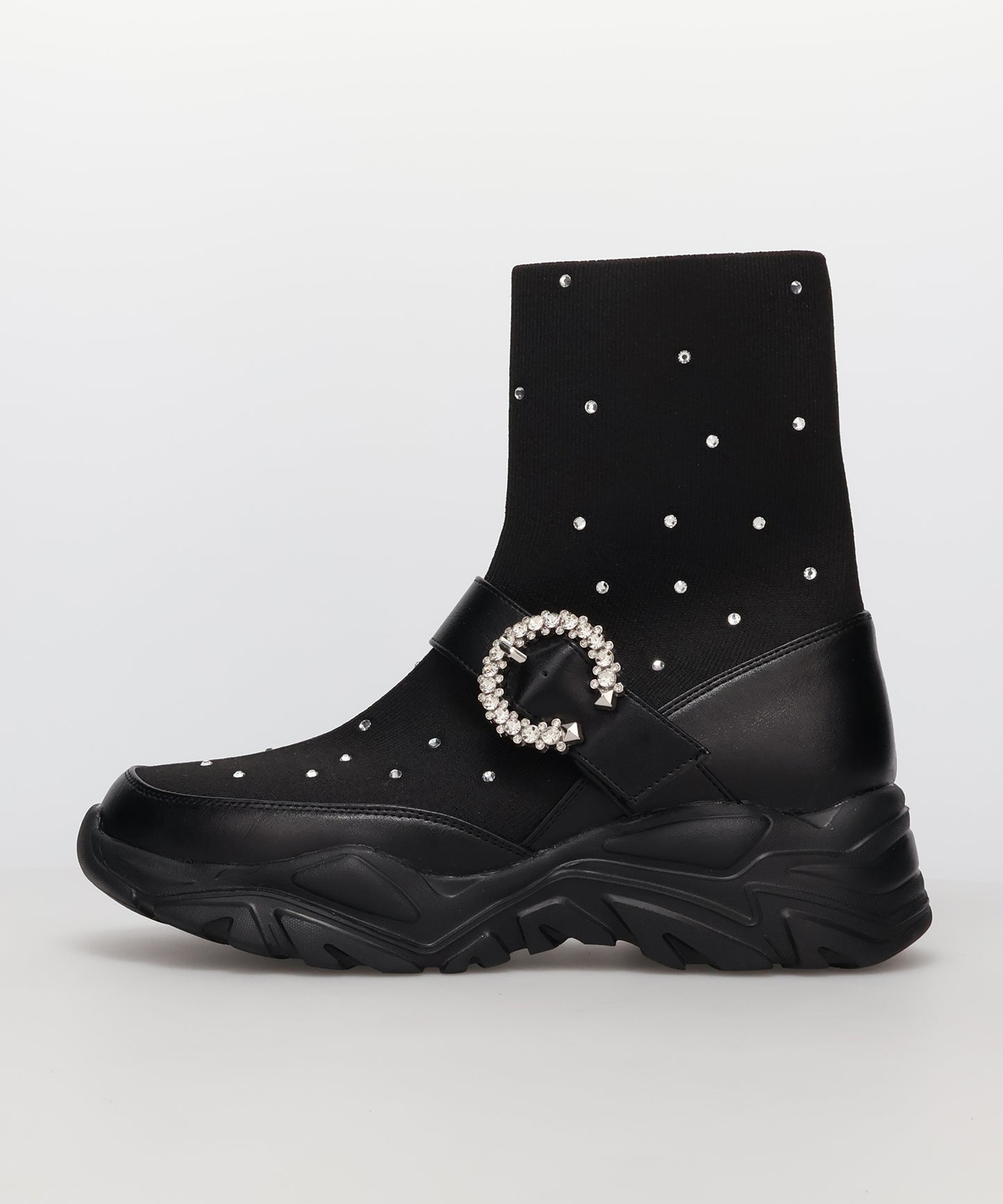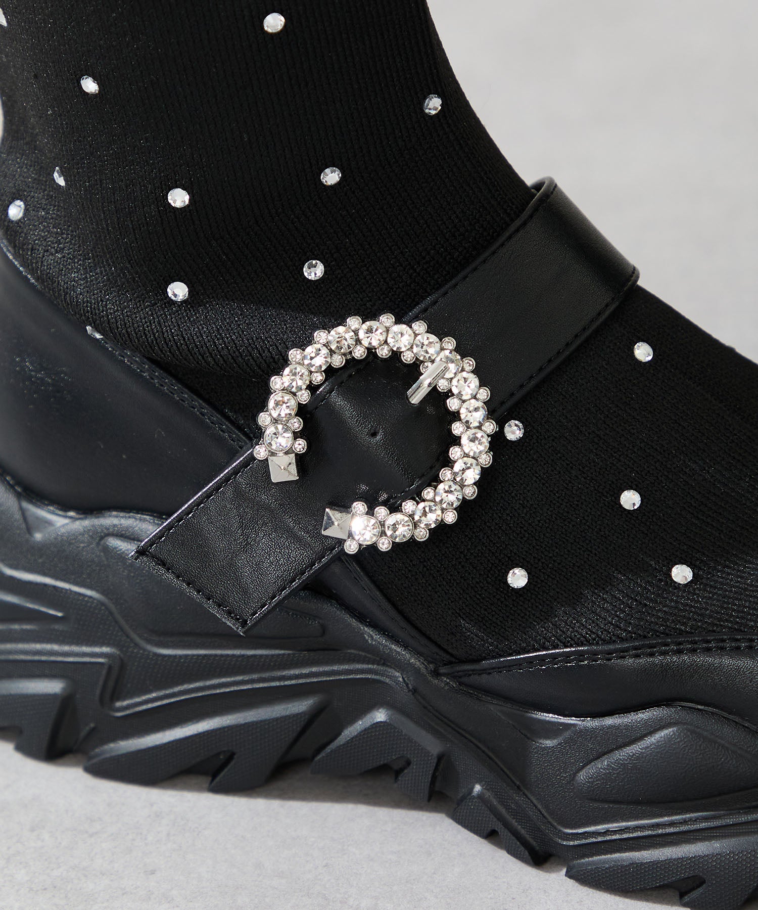 ビジューモチーフをあしらったベルトに、ラインストーンを全体に散りばめたデコラティブなデザインで特別感のあるブーツ。あえてカジュアルなスニーカーソールを組み合わせることでエレガンスな雰囲気とのアンバランス感が今っぽい。伸縮性のあるニット素材は足当たりが優しく、厚手クッションを内蔵したインソールはナイロン素材で履きやすさまで追及した1足。