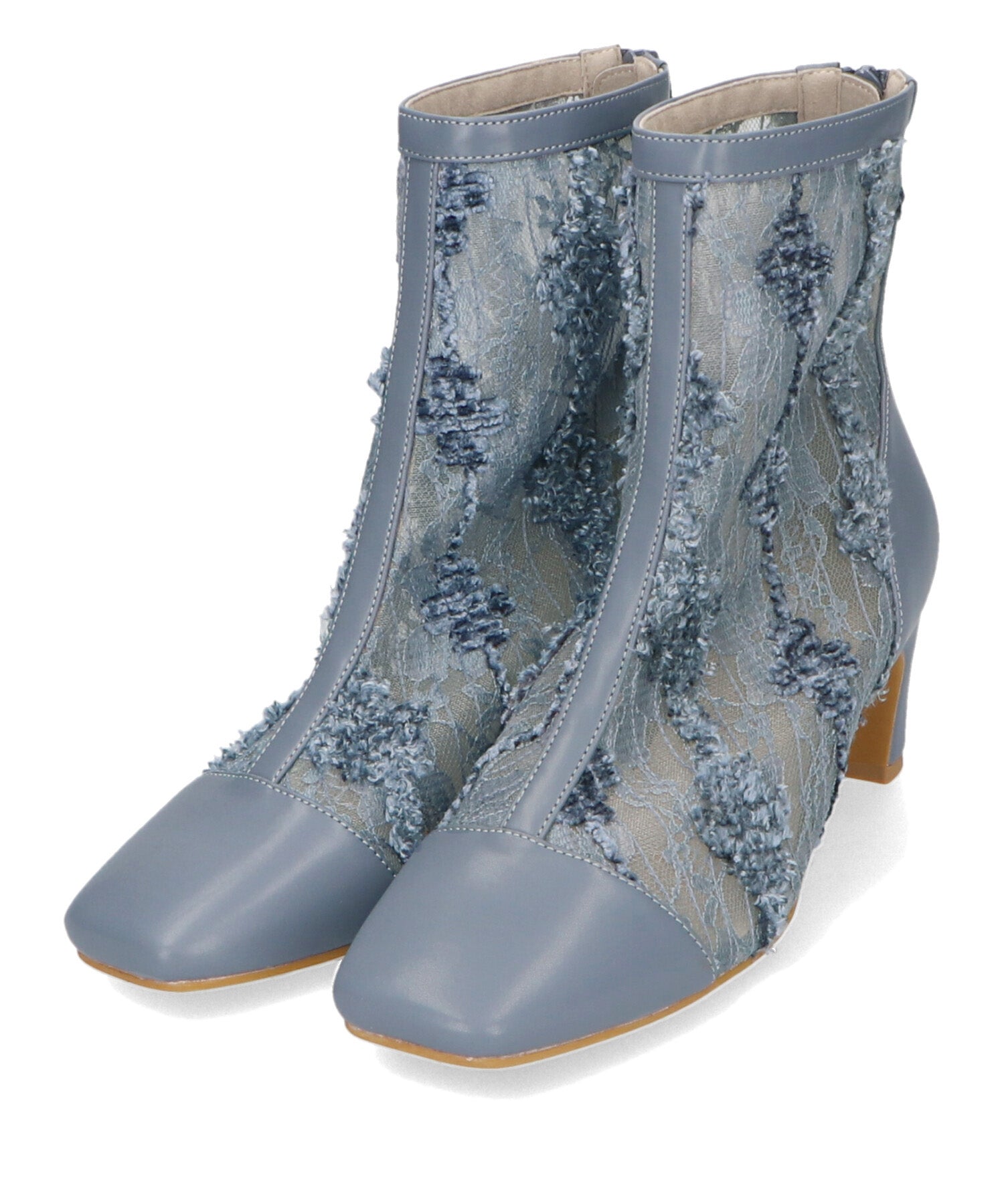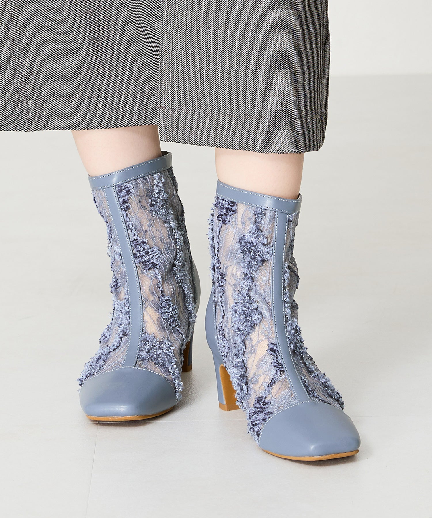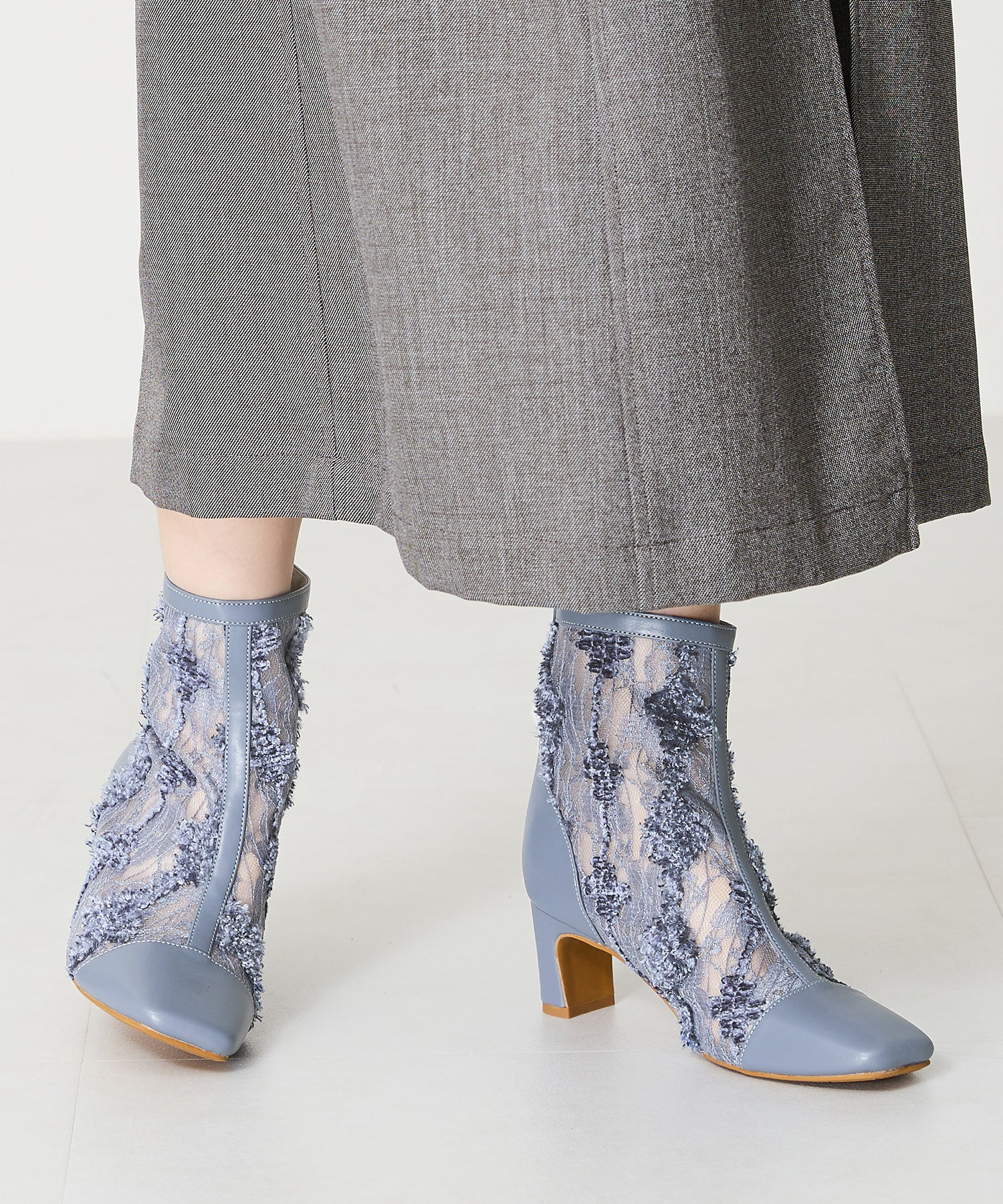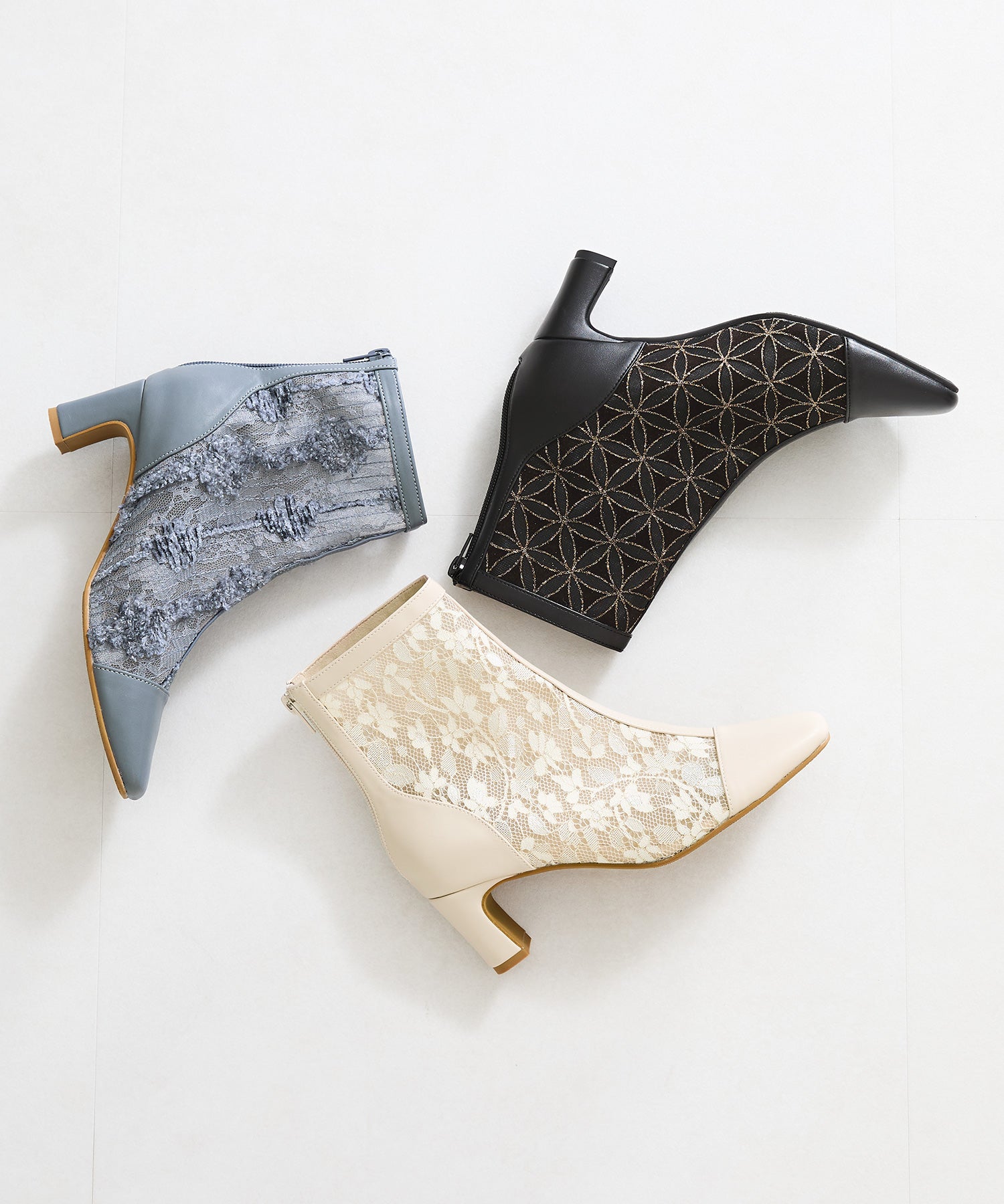 チュールの透け感が女性らしさを出しつつ、スムース素材を合わせることでコーディネートに馴染むよう仕上げたブーツは、センターシームで美脚見えするデザインに。細すぎないプレートヒールで安定感もあり、バックファスナー付きで着脱がしやすいのはもちろん後ろからのシルエットも抜かりない仕上がり。3色すべて柄や質感が異なるのでお好みのスタイリングによって選べるのも嬉しいポイント。