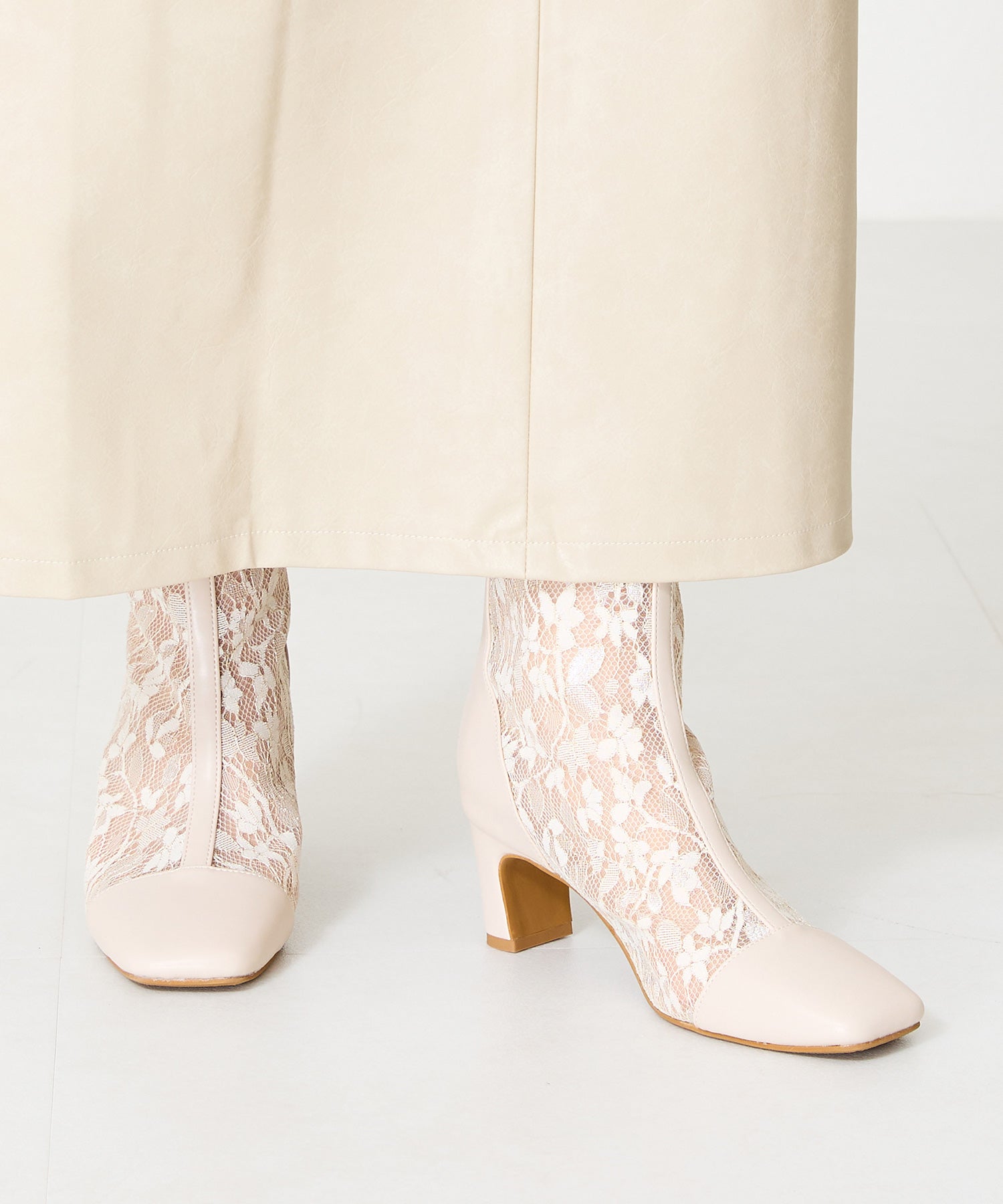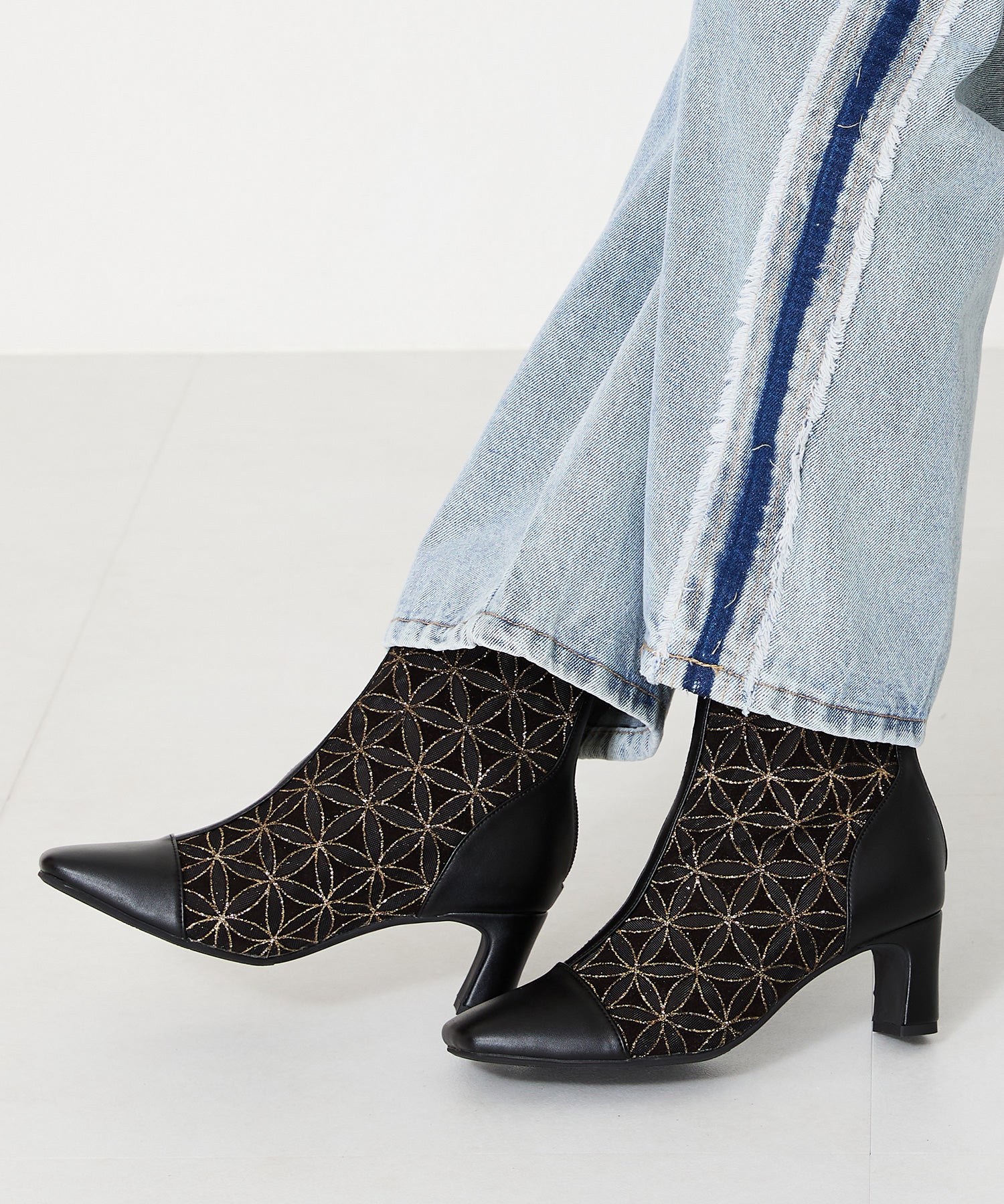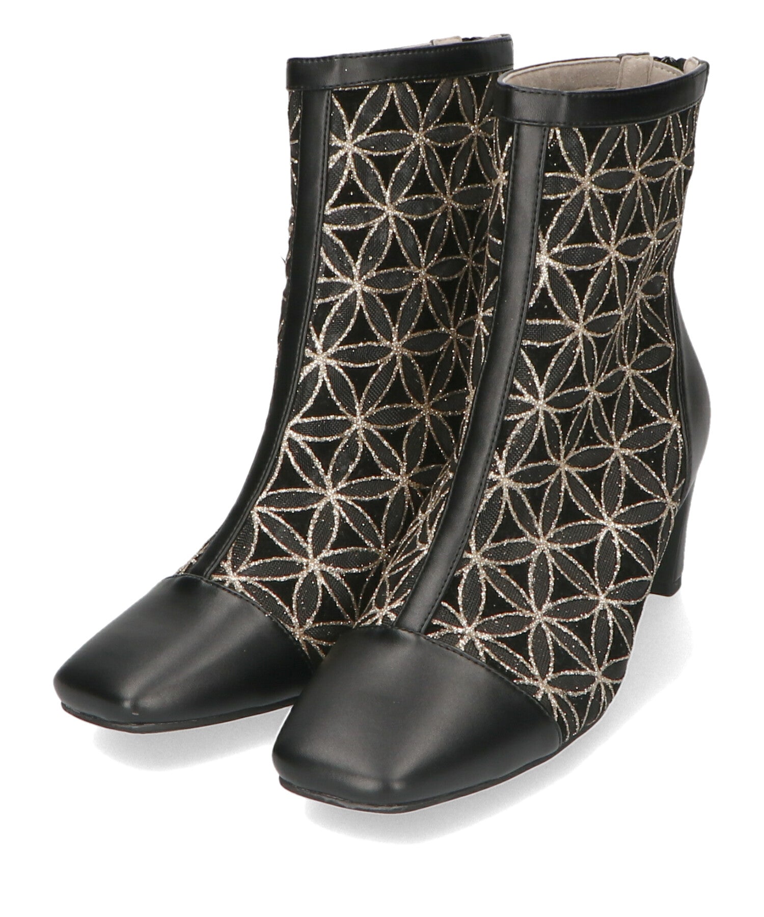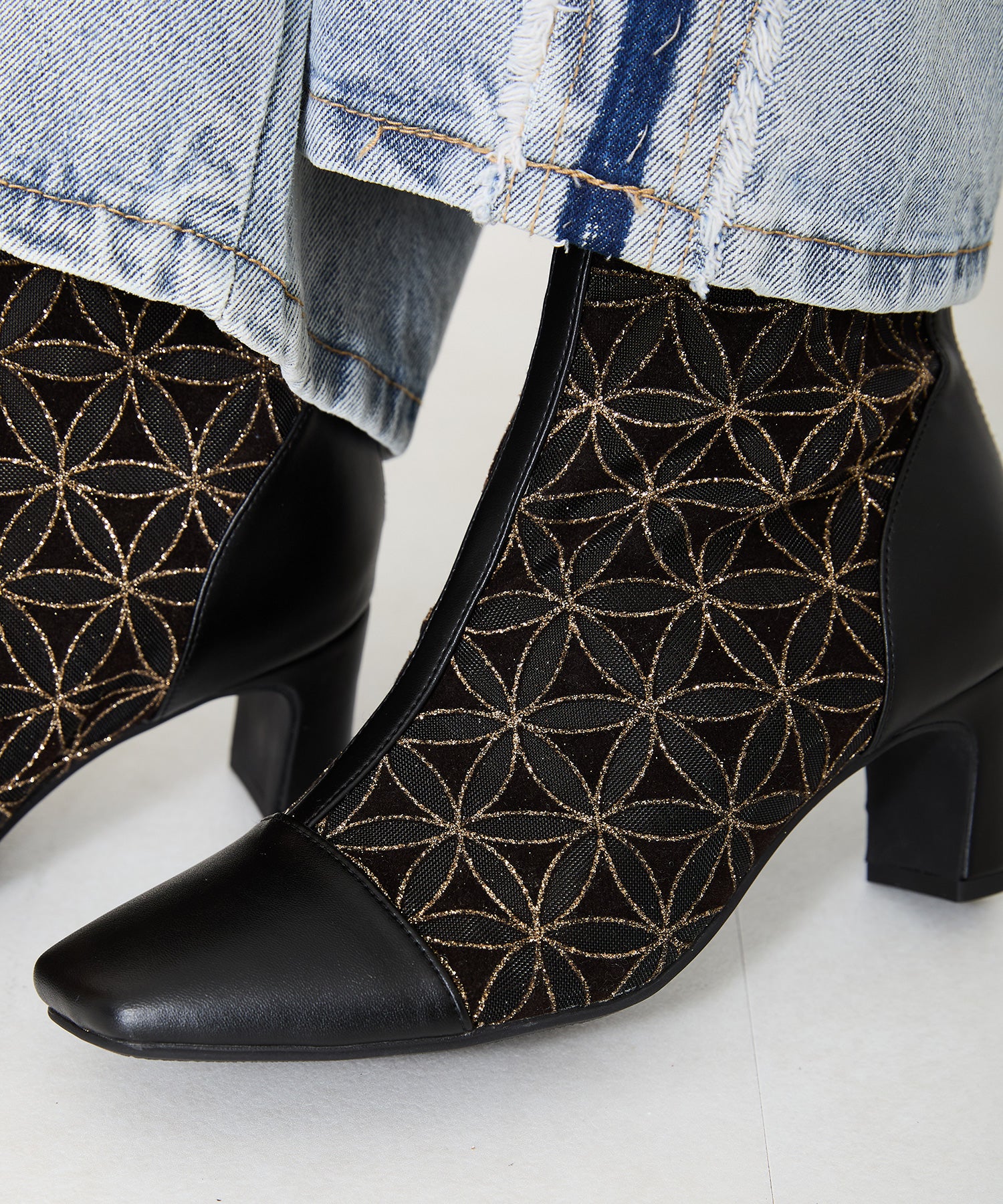チュールの透け感が女性らしさを出しつつ、スムース素材を合わせることでコーディネートに馴染むよう仕上げたブーツは、センターシームで美脚見えするデザインに。細すぎないプレートヒールで安定感もあり、バックファスナー付きで着脱がしやすいのはもちろん後ろからのシルエットも抜かりない仕上がり。3色すべて柄や質感が異なるのでお好みのスタイリングによって選べるのも嬉しいポイント。