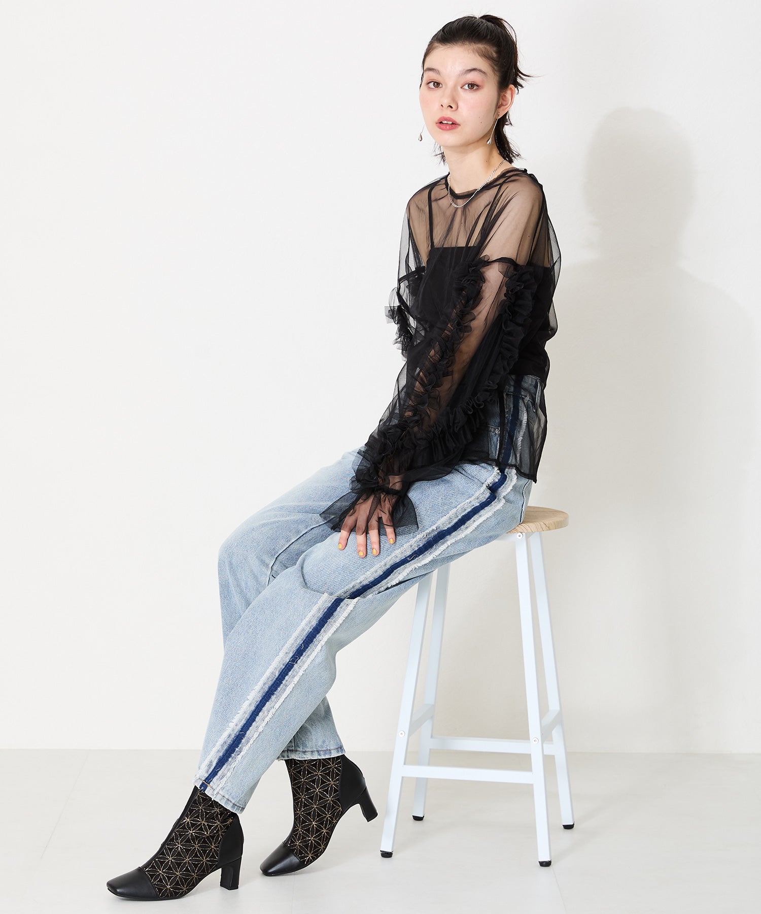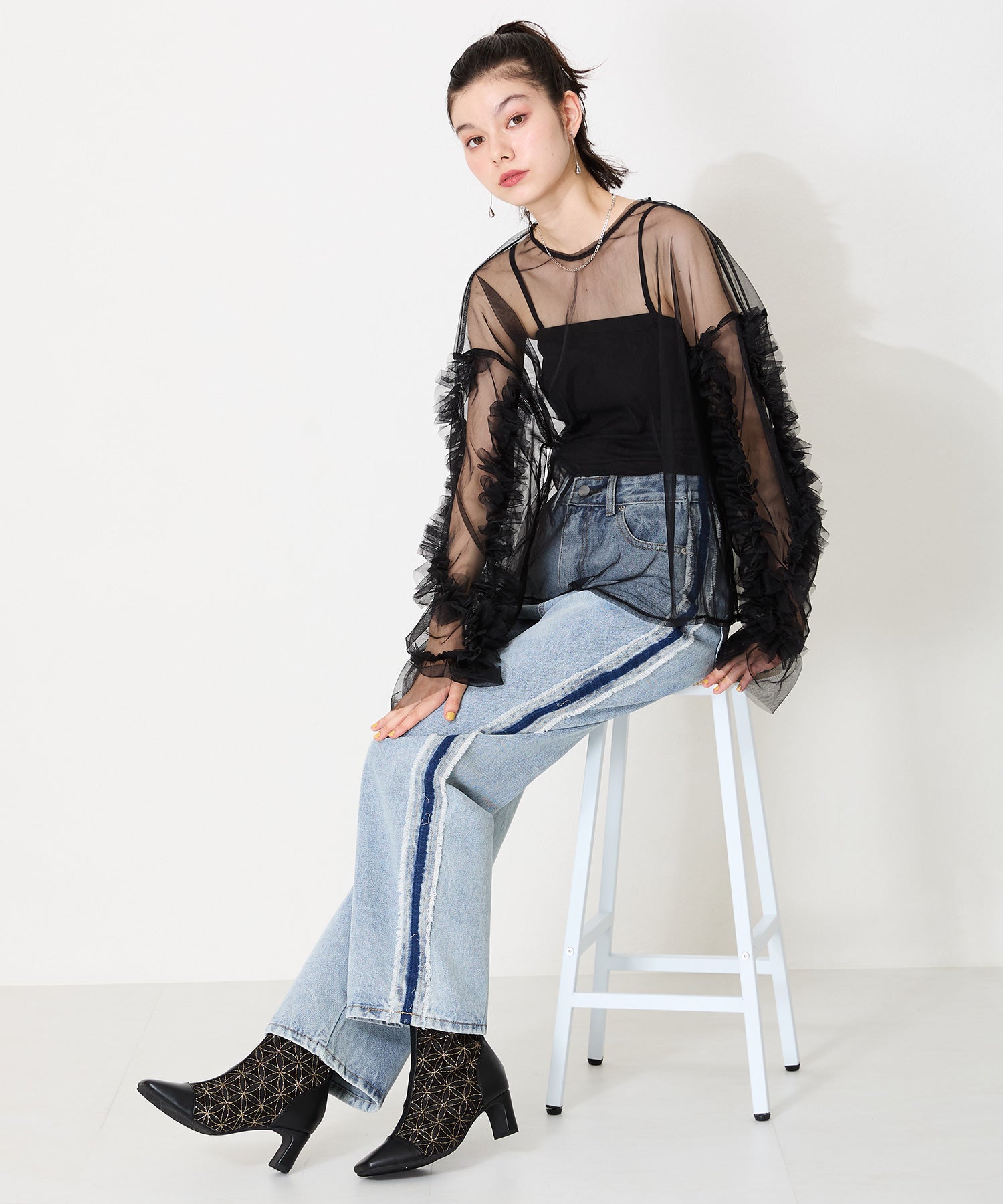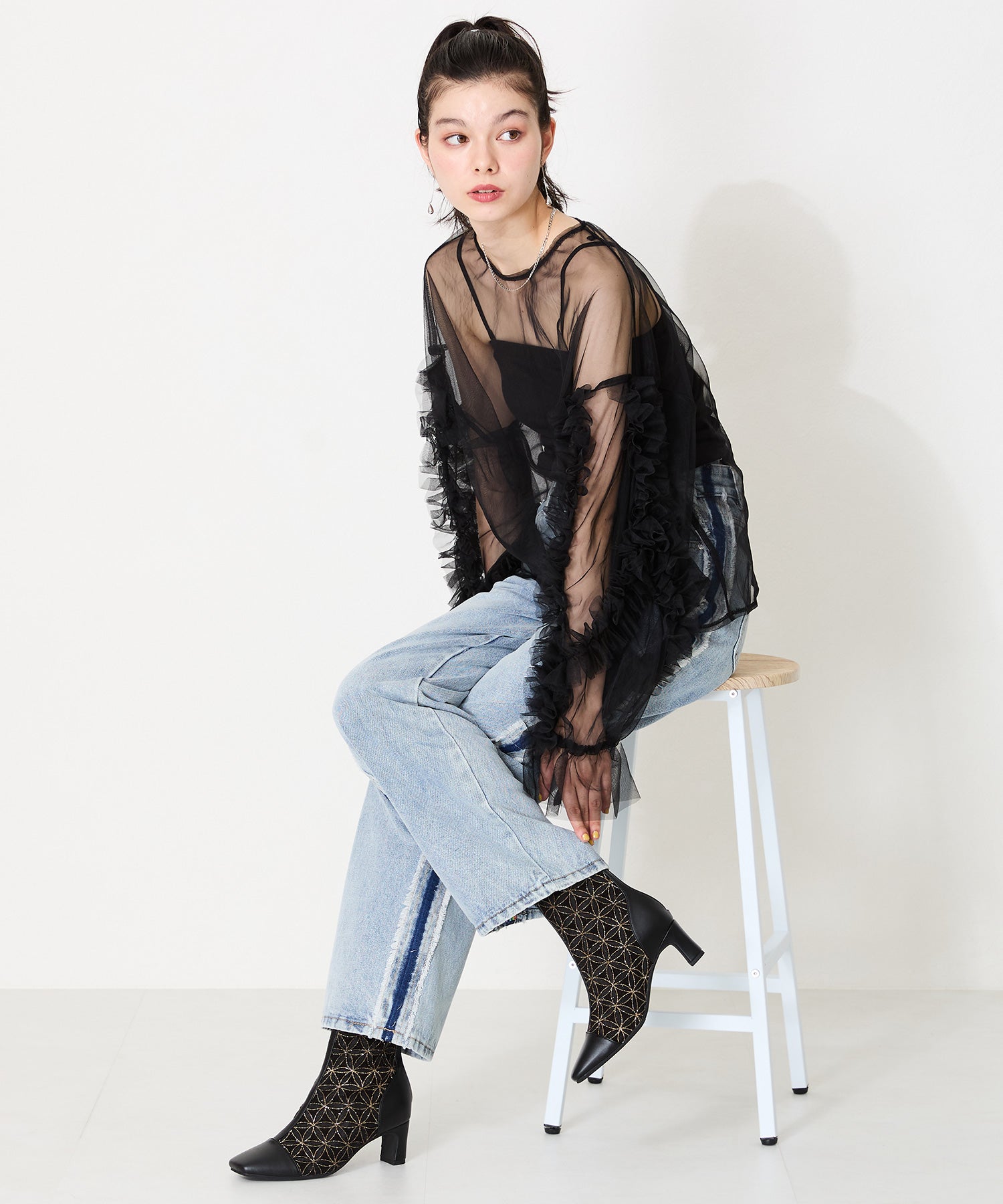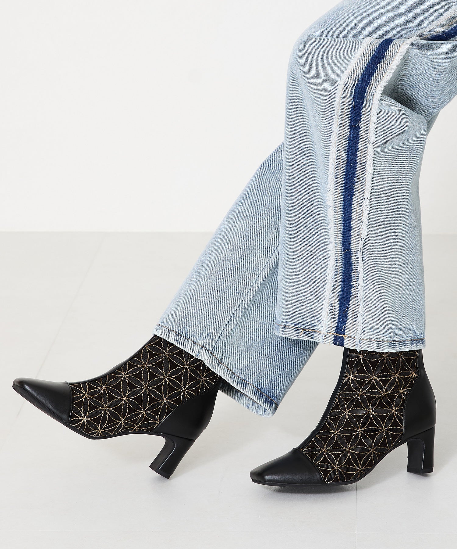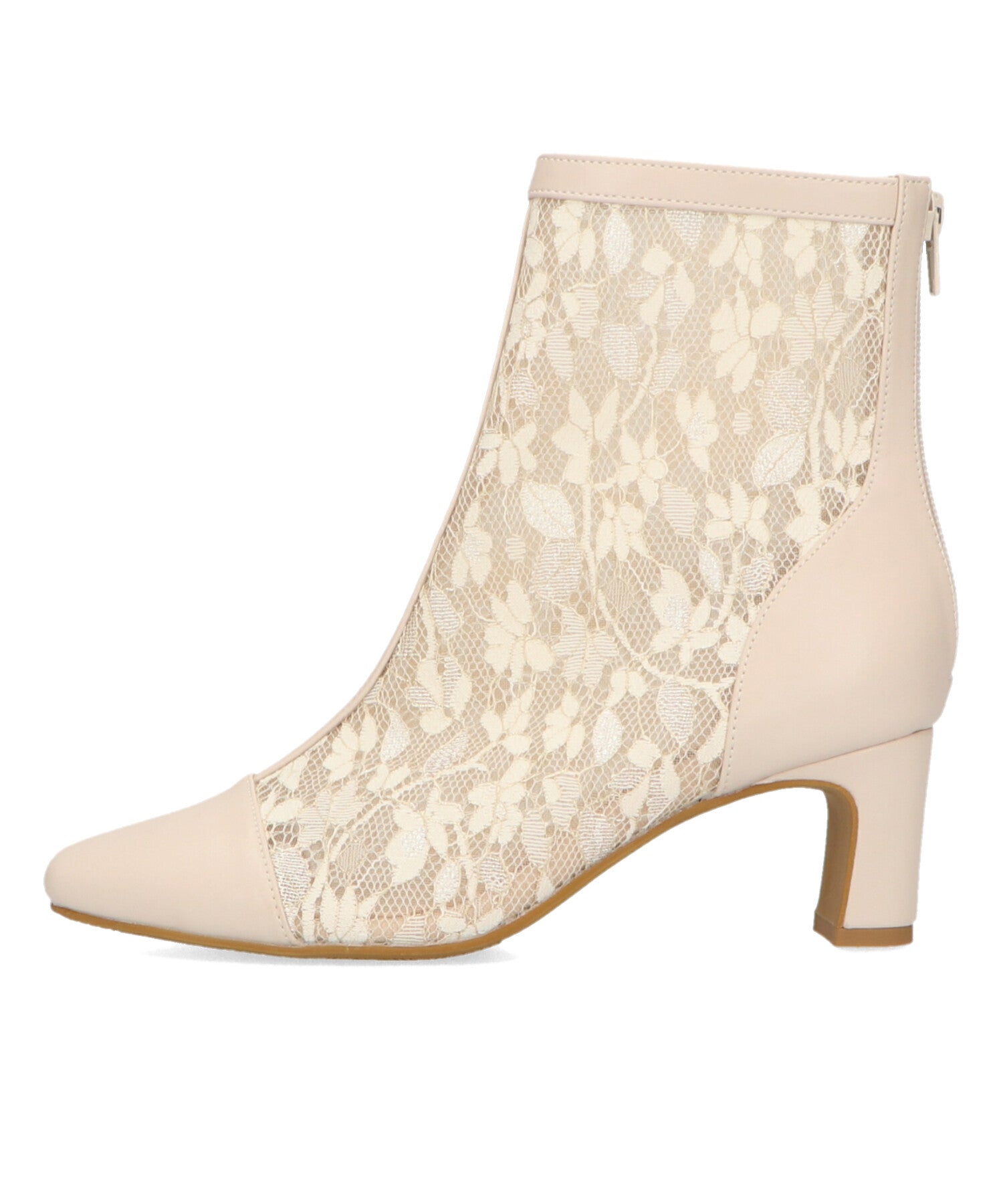 チュールの透け感が女性らしさを出しつつ、スムース素材を合わせることでコーディネートに馴染むよう仕上げたブーツは、センターシームで美脚見えするデザインに。細すぎないプレートヒールで安定感もあり、バックファスナー付きで着脱がしやすいのはもちろん後ろからのシルエットも抜かりない仕上がり。3色すべて柄や質感が異なるのでお好みのスタイリングによって選べるのも嬉しいポイント。