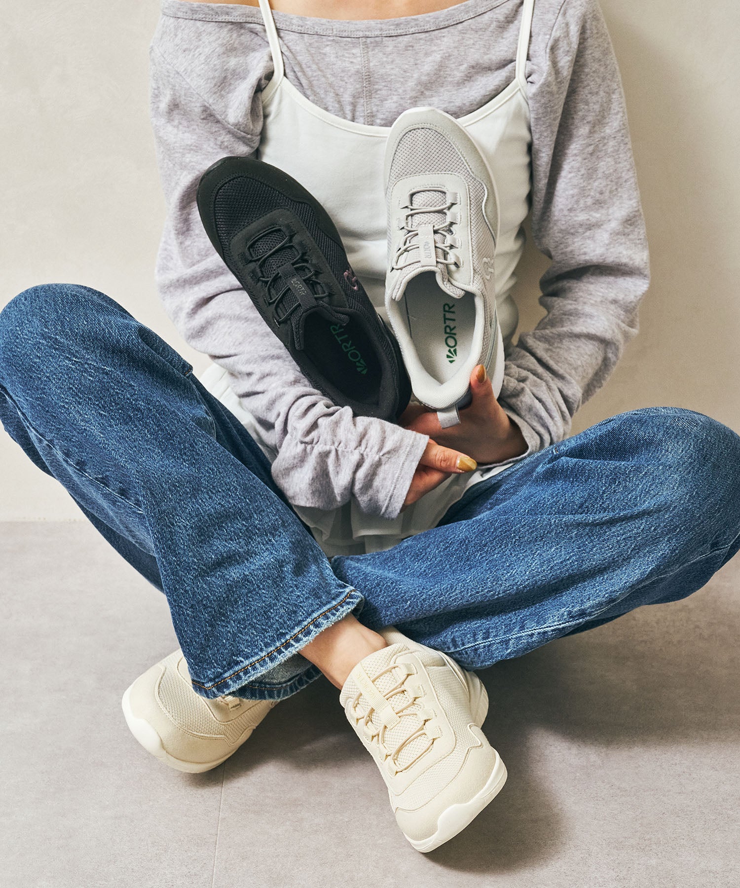 メッシュ素材が軽やかな印象のスニーカーはハンズフリー仕様で手を使わずにさっと履けるのが魅力的。さらにシューレース部分がゴム紐になっており足の形に合わせて伸縮するので、窮屈感なく履けるのも嬉しい。アッパーには通気性の高いメッシュ素材を使用しているので長時間の着用でも蒸れにくく、1足持っておくと重宝するスニーカー。