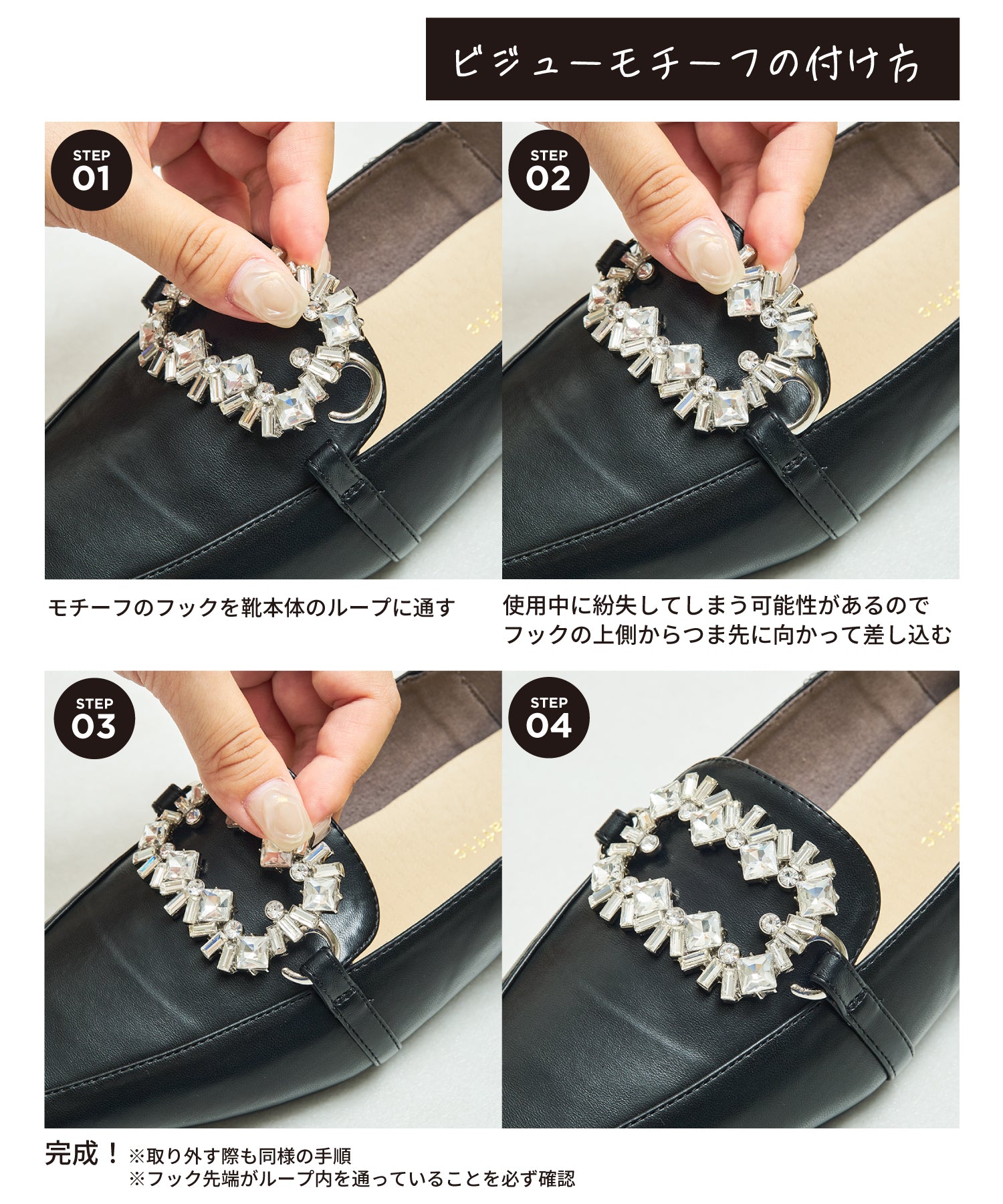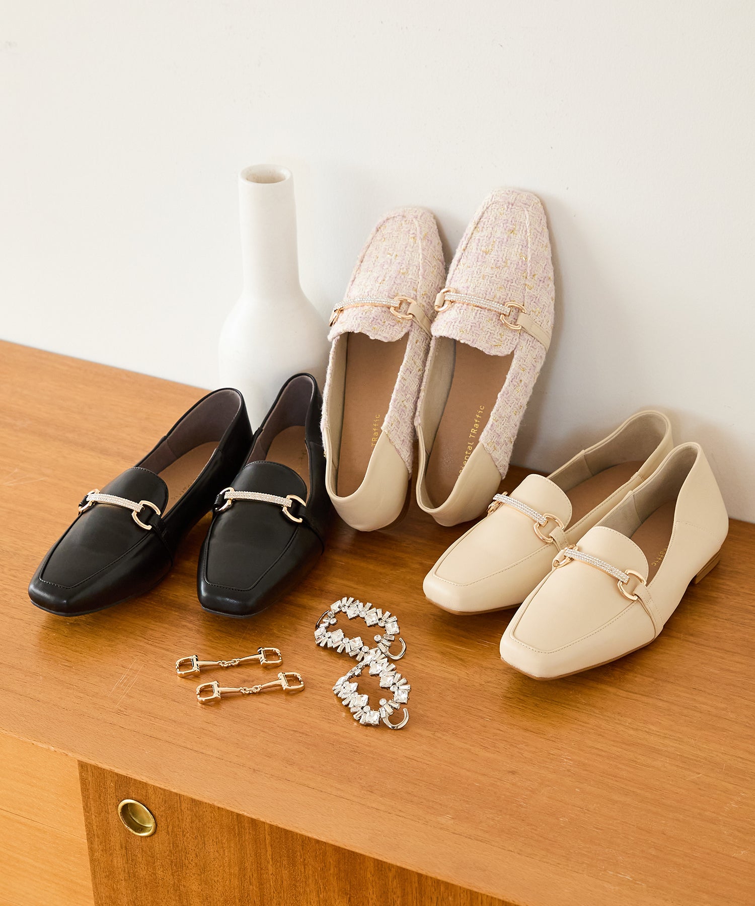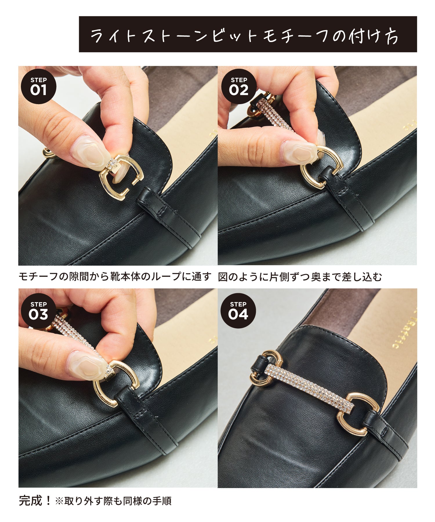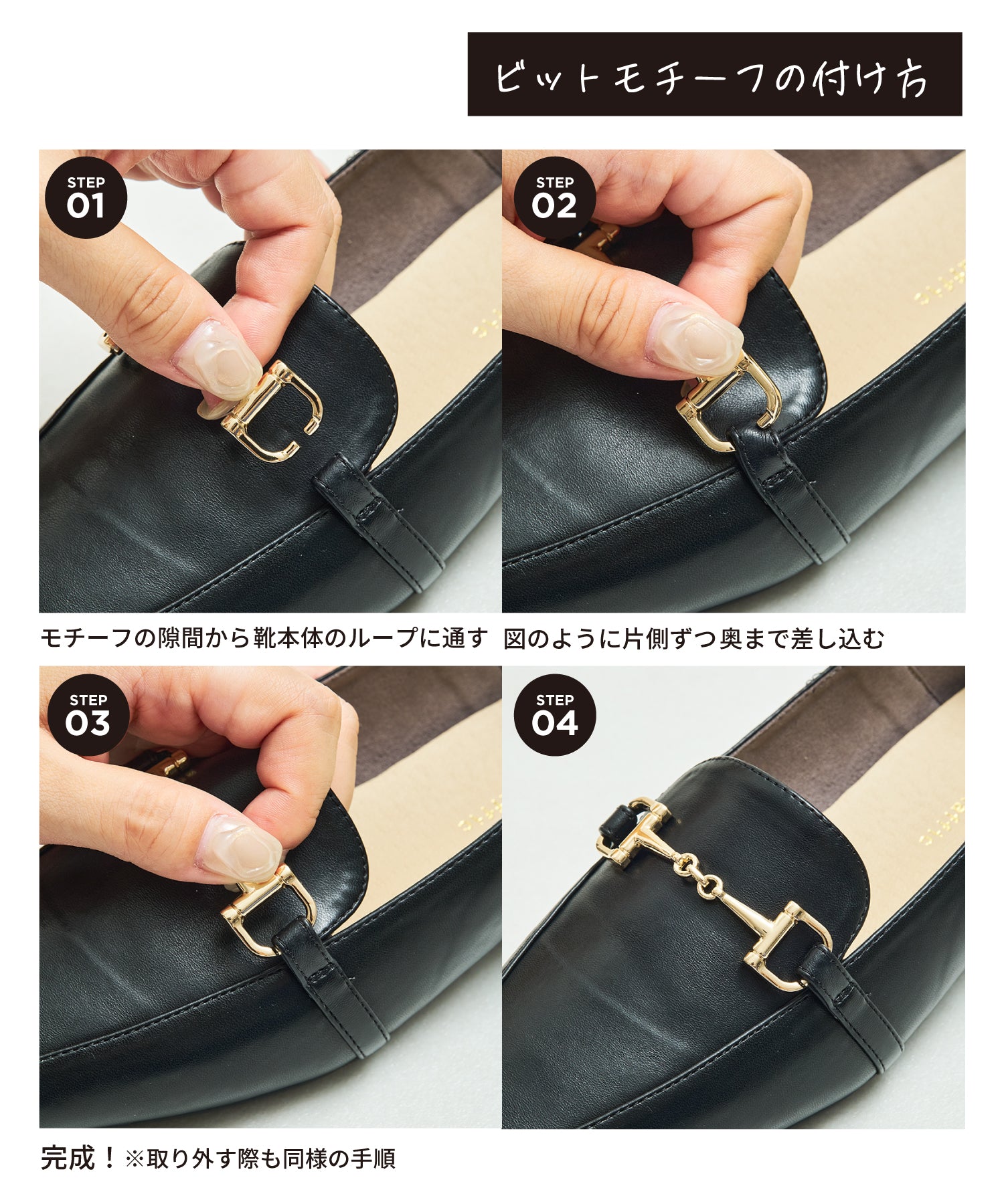モチーフ部分が付け替え可能な特別感のあるローファーが登場。デザインの違う3種類のモチーフが付いているので、その日のシーンやスタイルに合わせてデザインをカスタムできるのが嬉しい。厚手クッション入りのインソールで疲れにくく、さらに踵が踏めるバブーシュ仕様で気になる踵の負担を軽減。1足でマルチに大活躍してくれること間違いなしの注目アイテム。