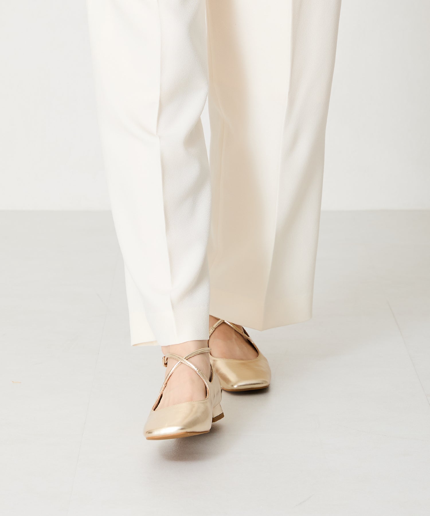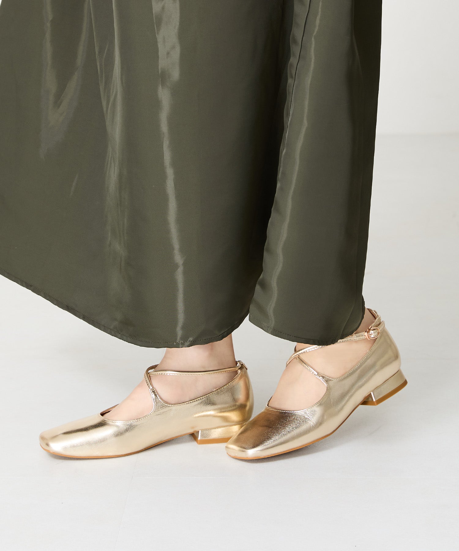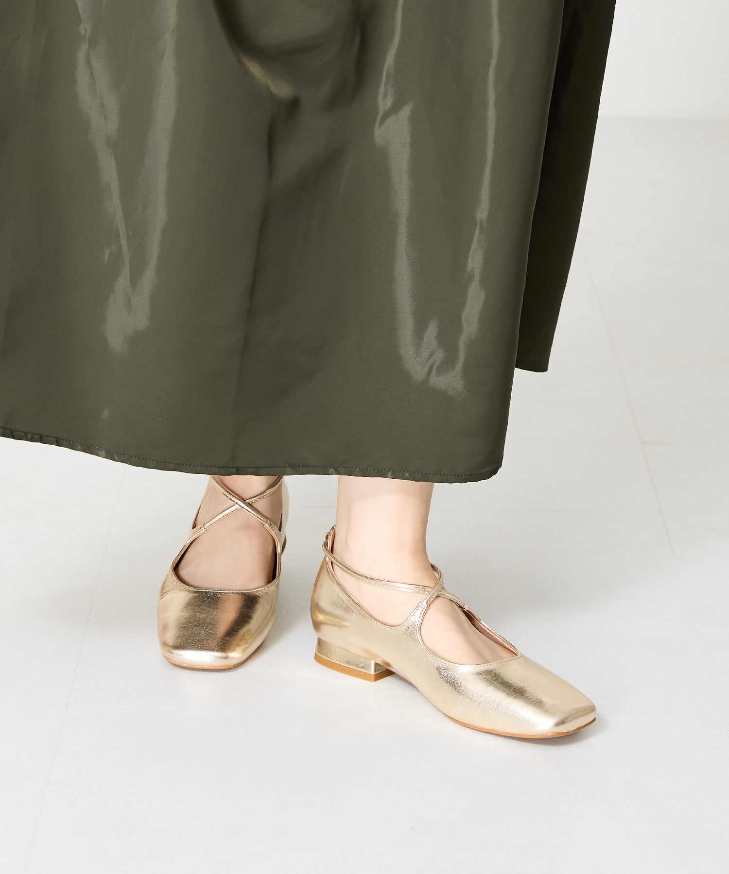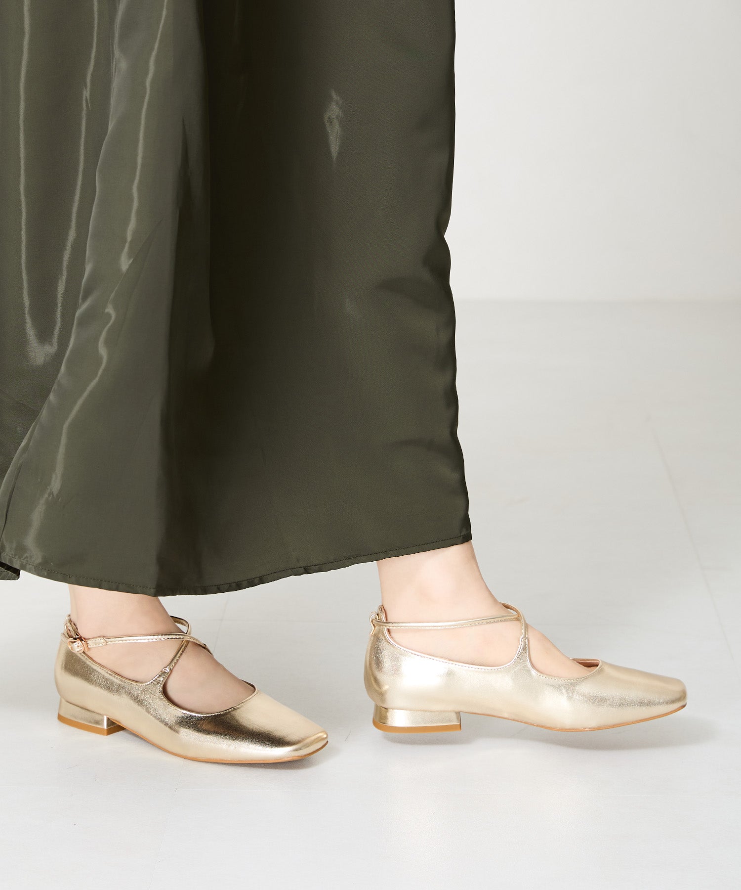 甲でクロスする華奢なストラップデザインが可愛いパンプスは、2cmのローヒールで歩きやすい高さなもの嬉しいポイント。広めのスクエアトゥは程よい丸みがありながらもシルエットがすっきり見え、つま先が柔らかい作りなので指先が痛くなりにくい。どんなコーデにもハマるメタリックのゴールドは、レッグアイテムとの組み合わせも旬なおすすめカラー。