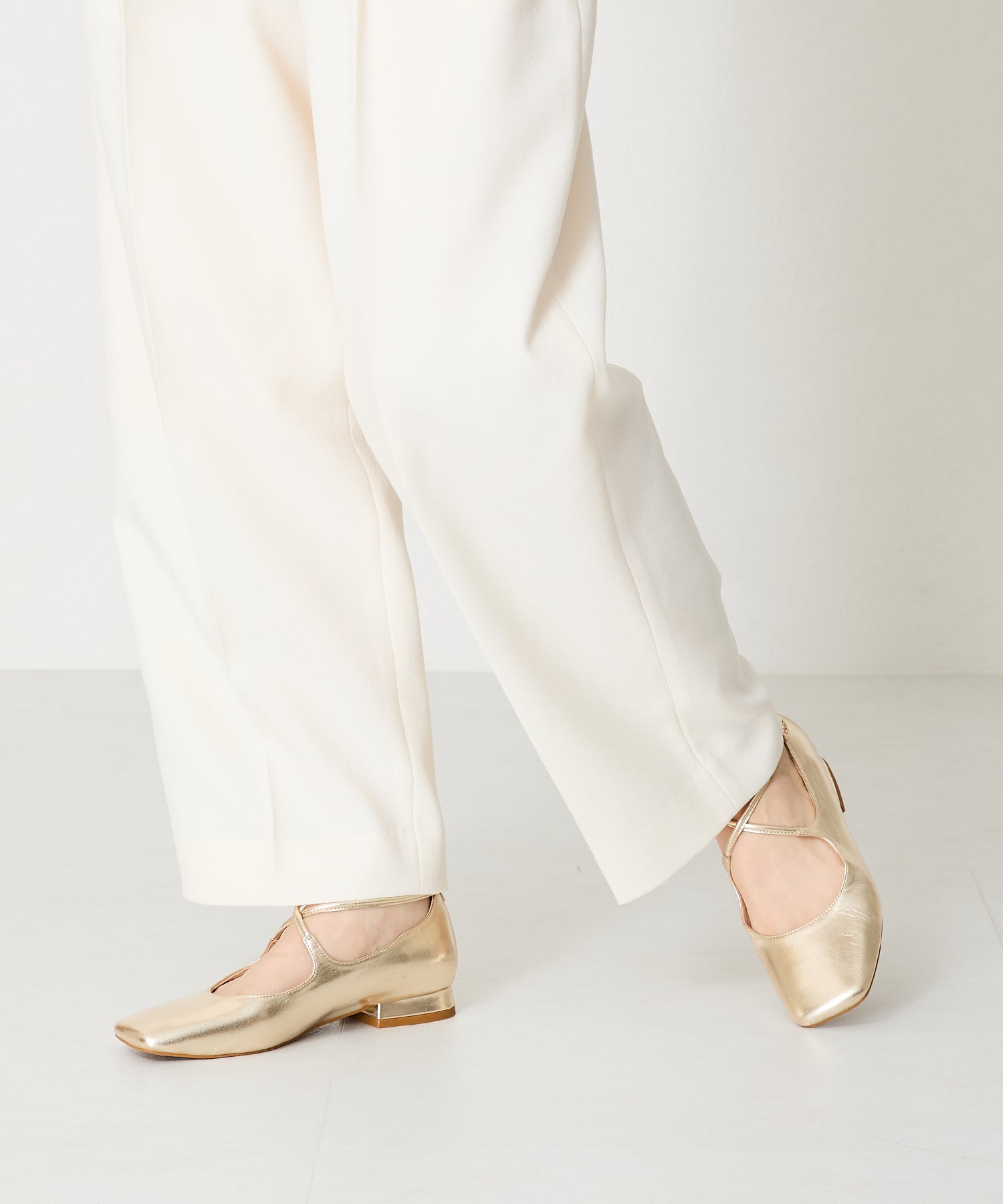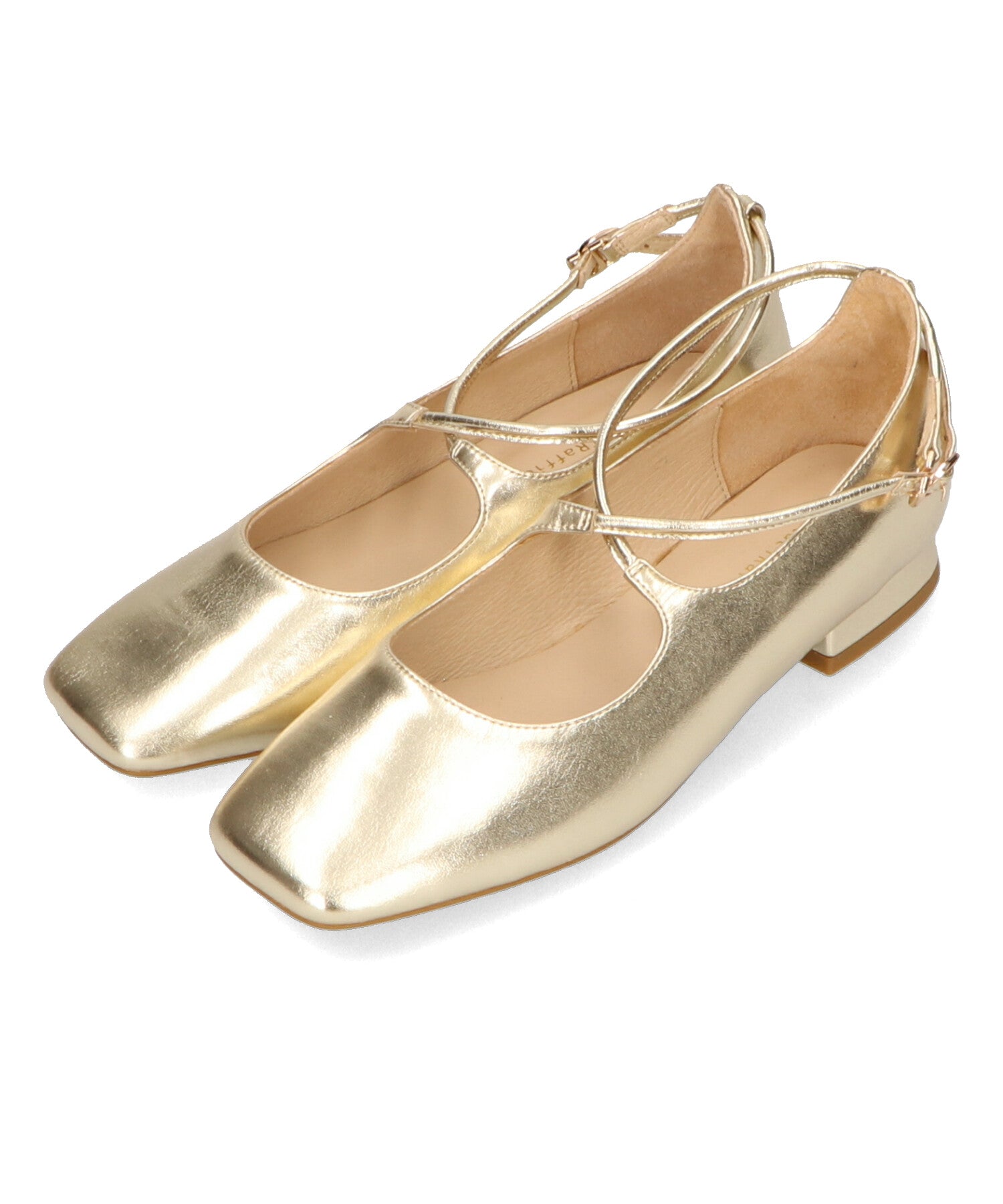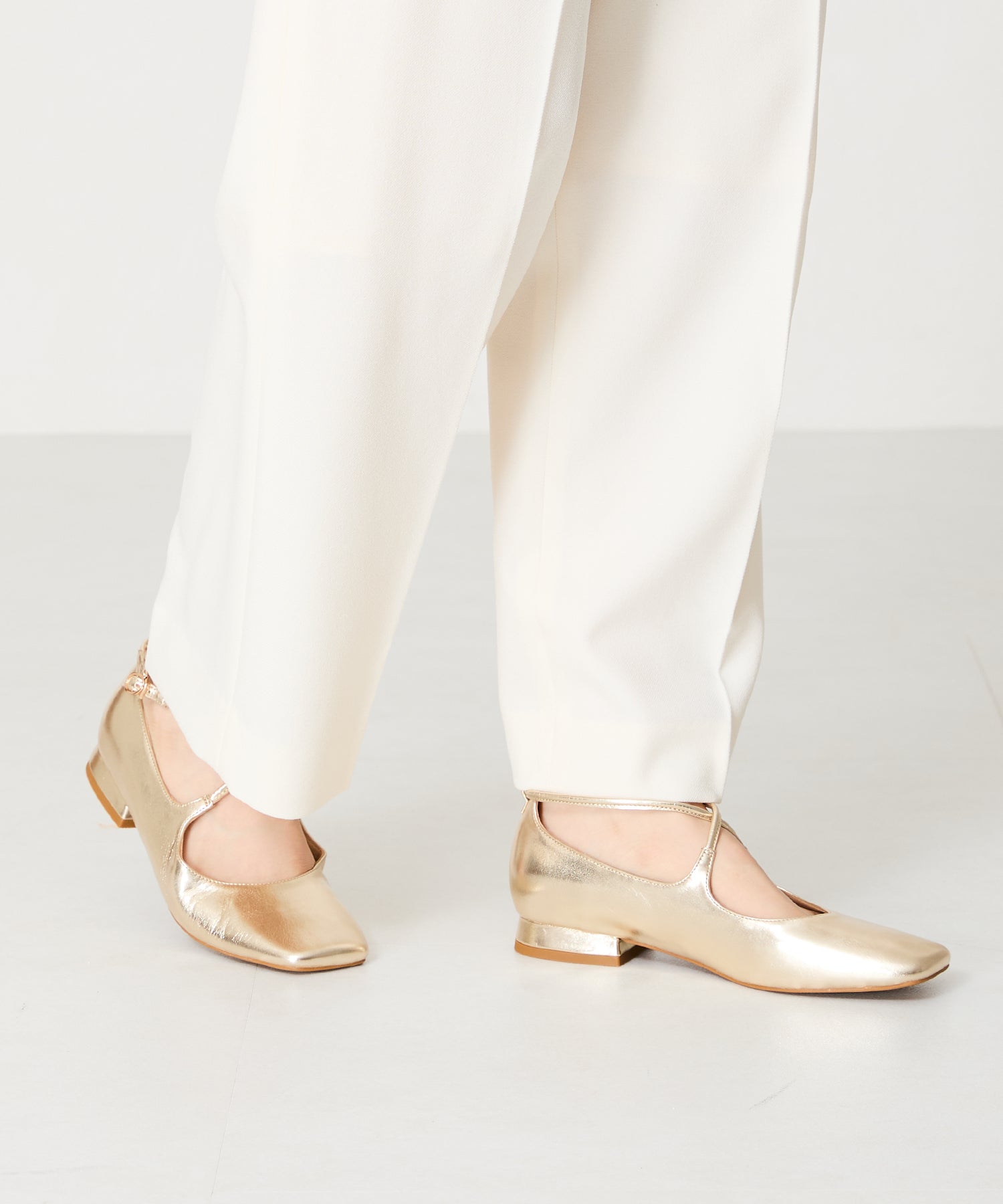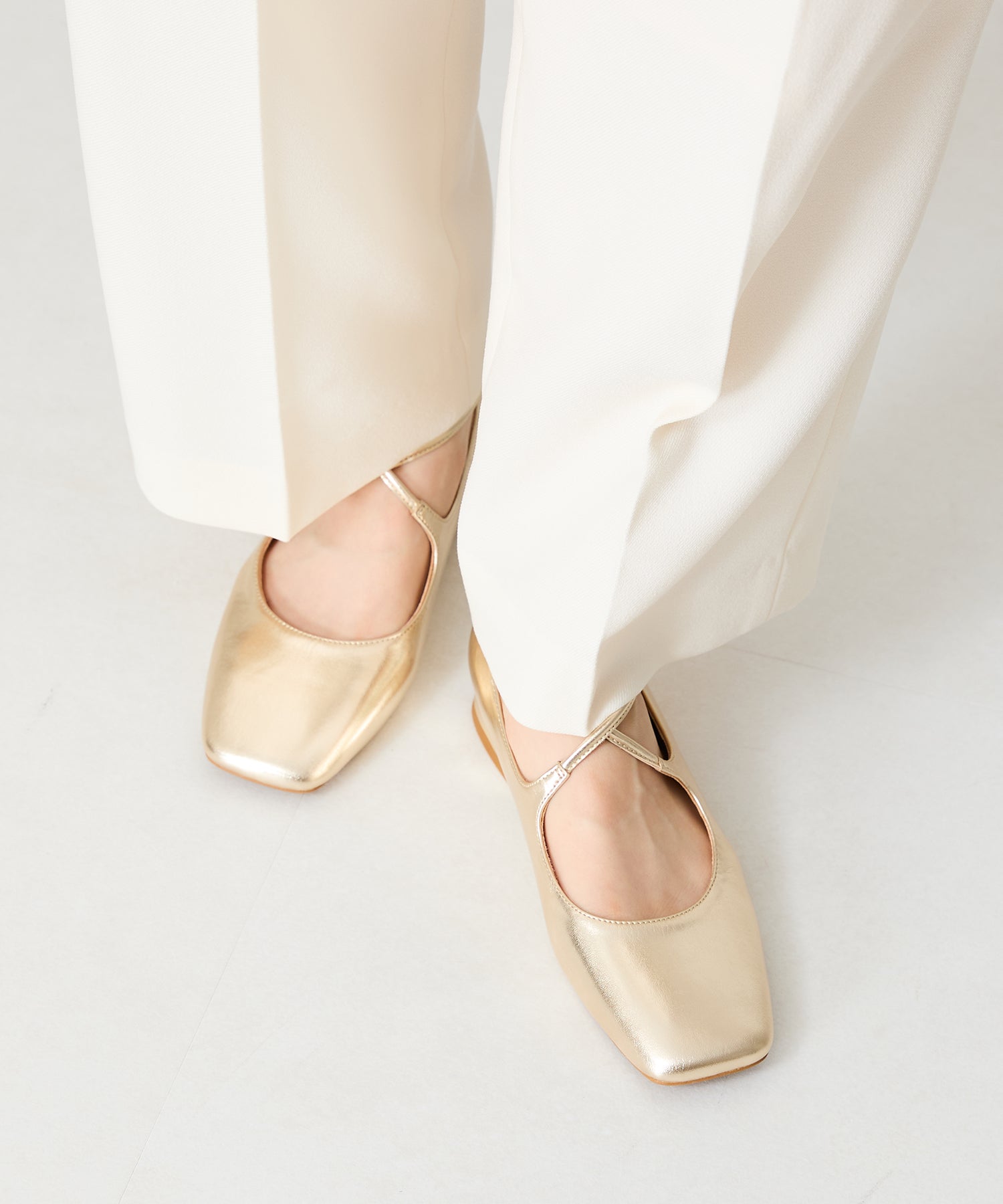 甲でクロスする華奢なストラップデザインが可愛いパンプスは、2cmのローヒールで歩きやすい高さなもの嬉しいポイント。広めのスクエアトゥは程よい丸みがありながらもシルエットがすっきり見え、つま先が柔らかい作りなので指先が痛くなりにくい。どんなコーデにもハマるメタリックのゴールドは、レッグアイテムとの組み合わせも旬なおすすめカラー。