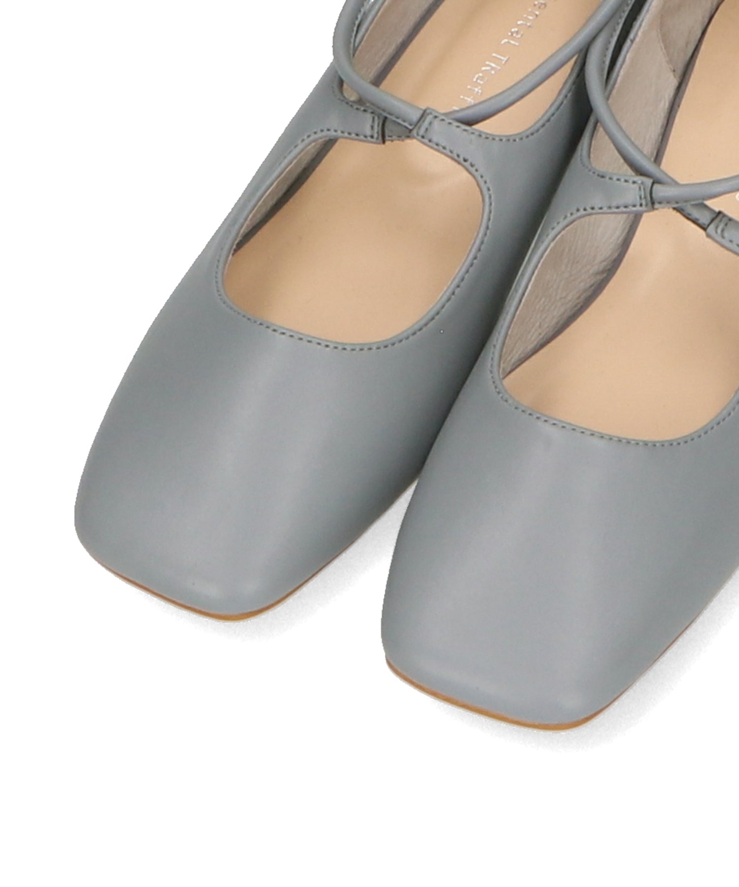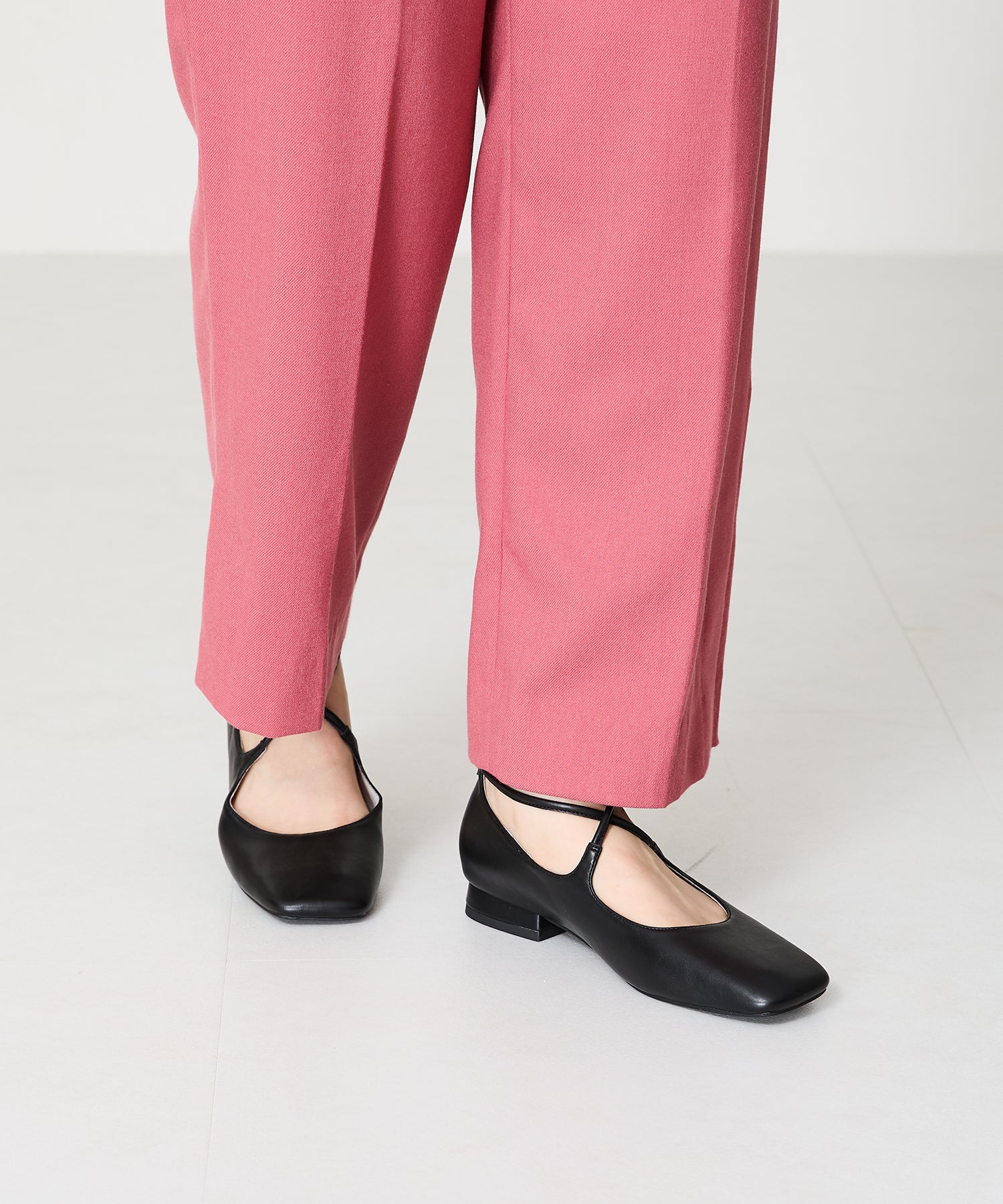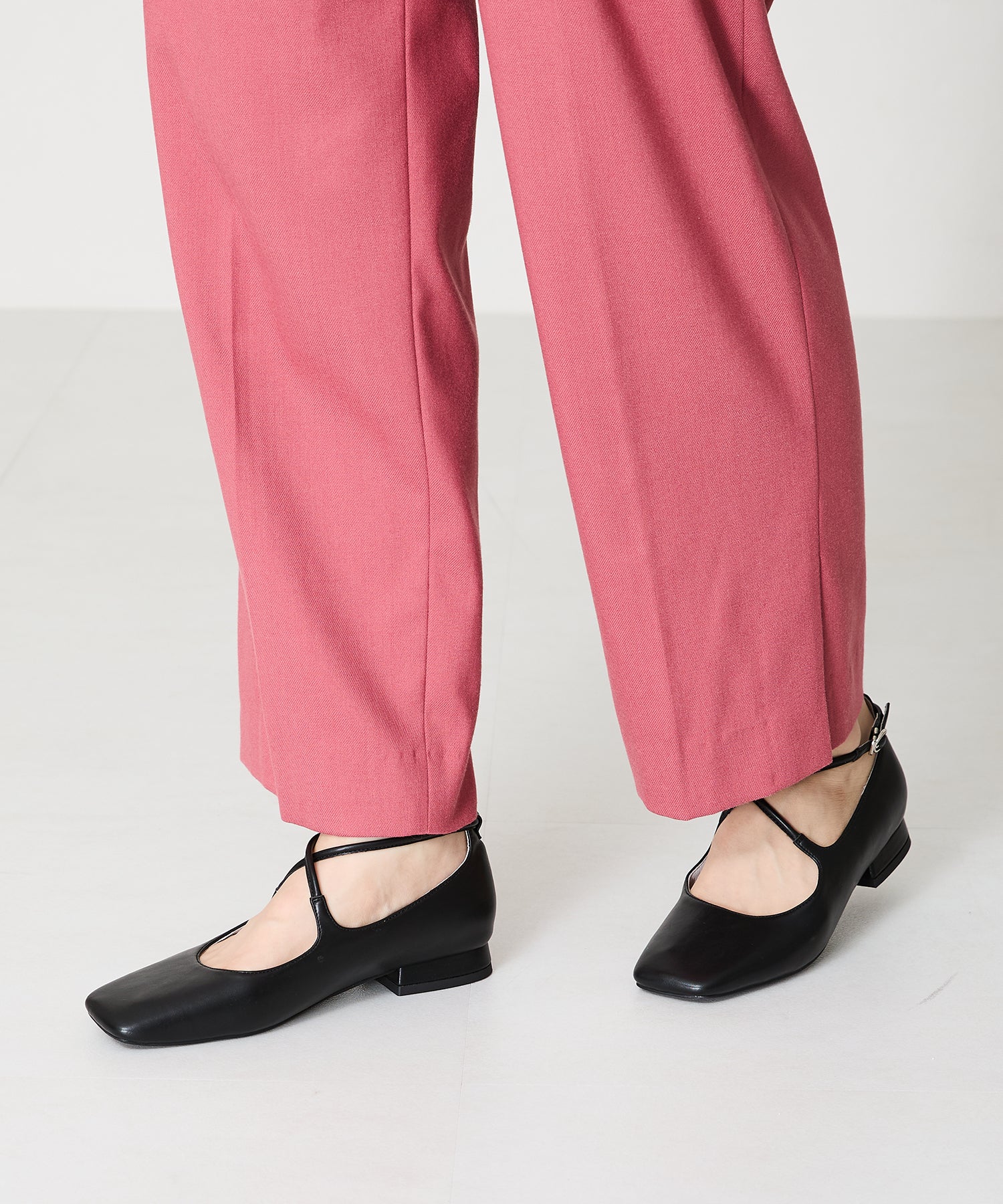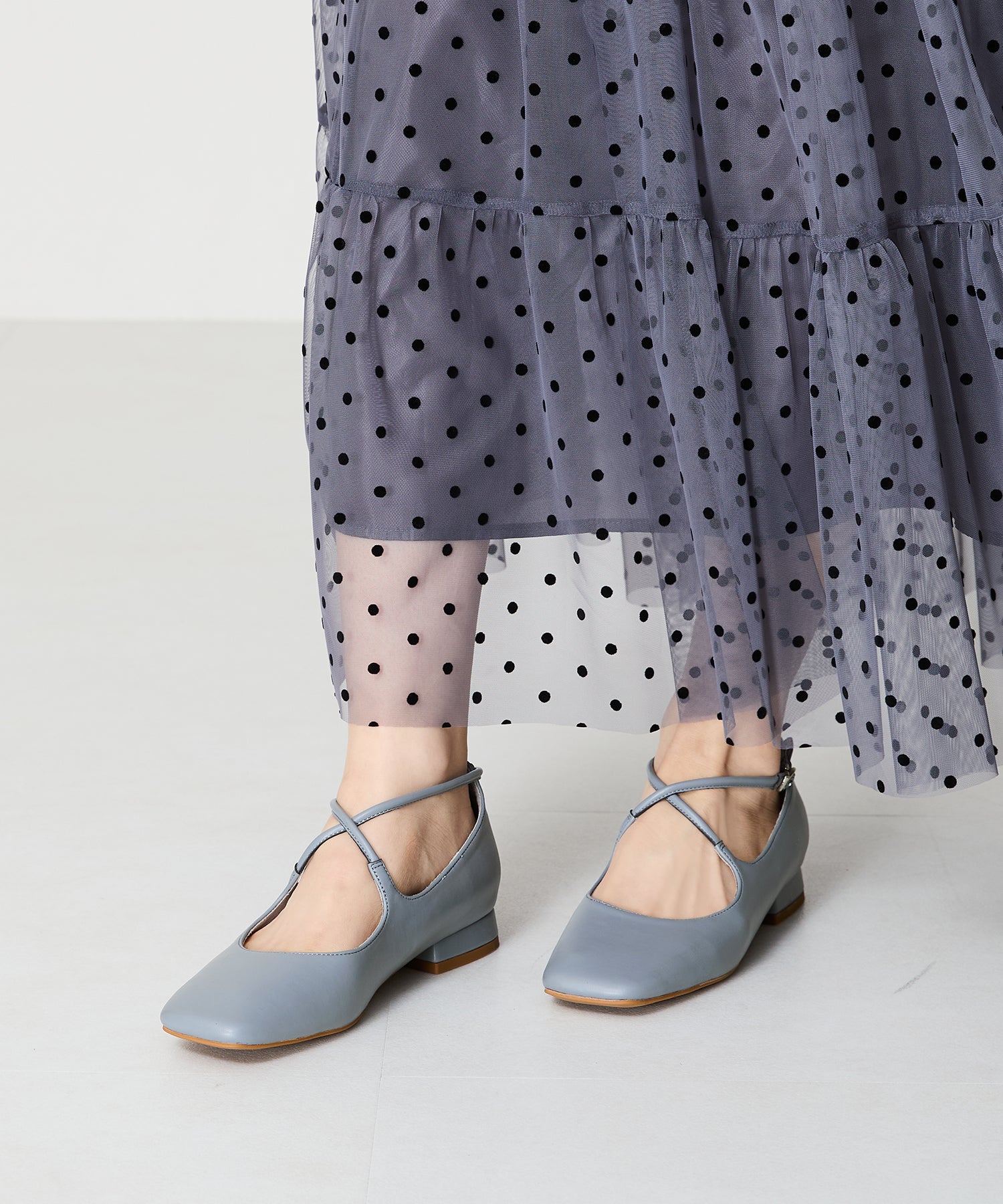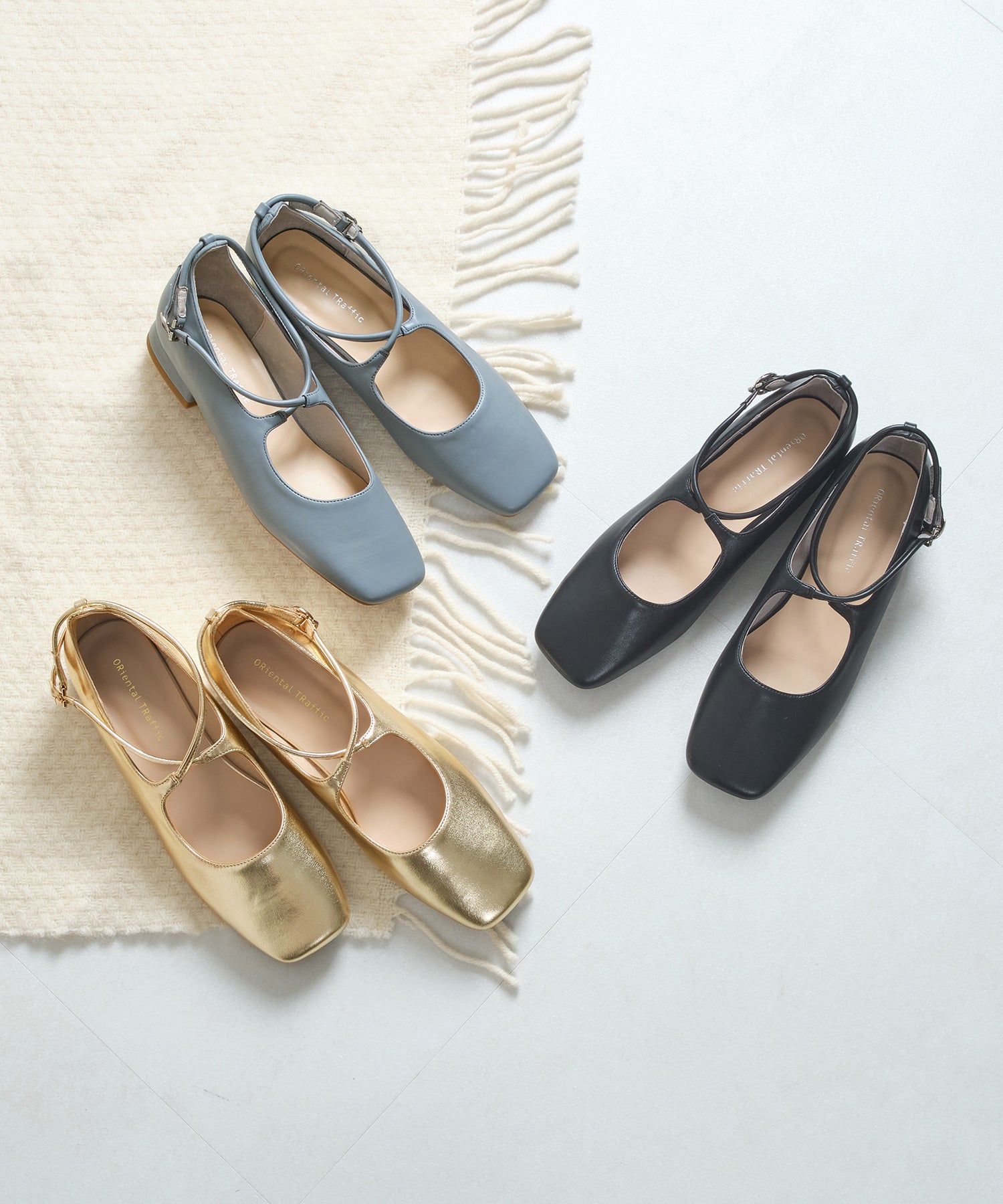 甲でクロスする華奢なストラップデザインが可愛いパンプスは、2cmのローヒールで歩きやすい高さなもの嬉しいポイント。広めのスクエアトゥは程よい丸みがありながらもシルエットがすっきり見え、つま先が柔らかい作りなので指先が痛くなりにくい。どんなコーデにもハマるメタリックのゴールドは、レッグアイテムとの組み合わせも旬なおすすめカラー。