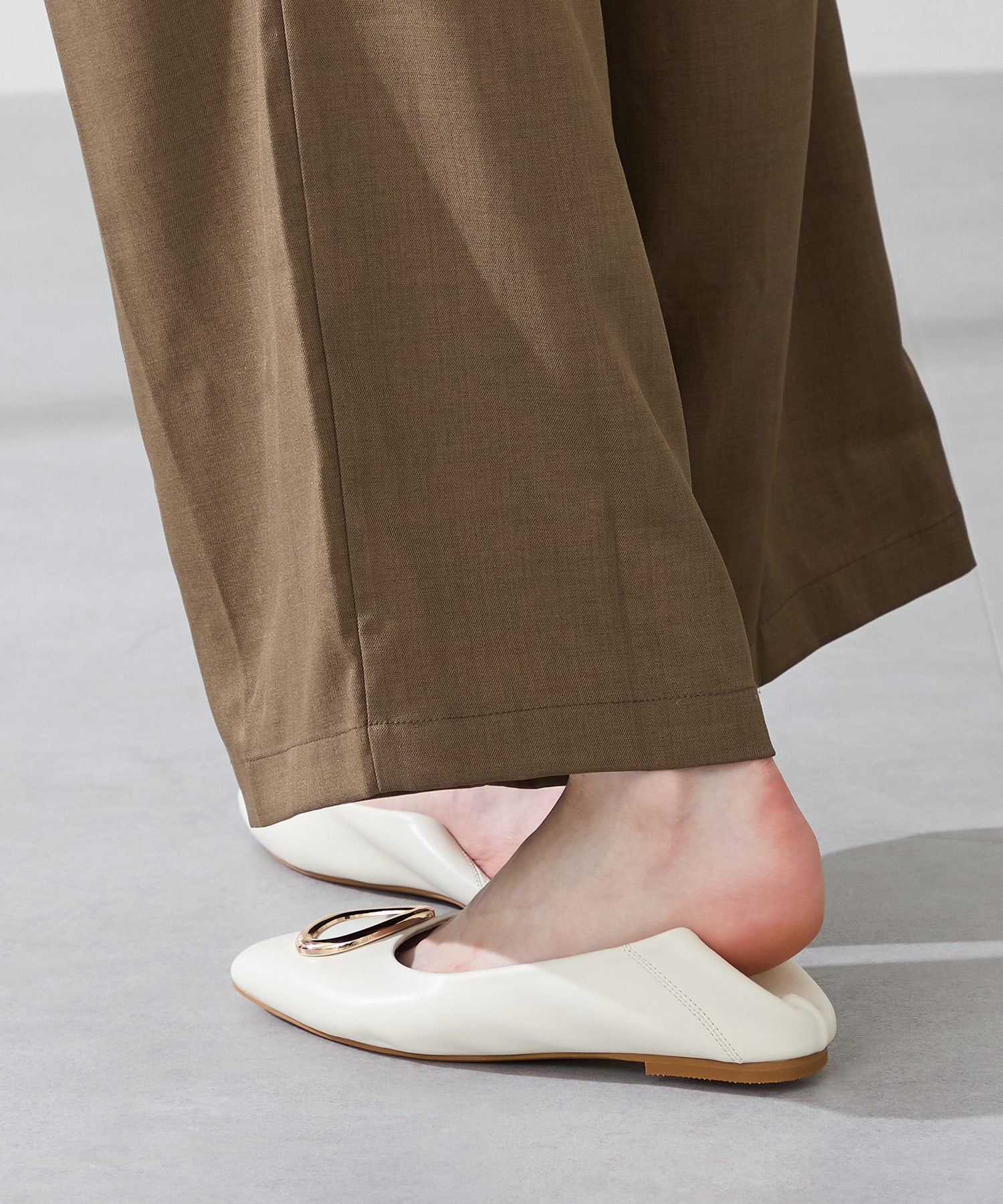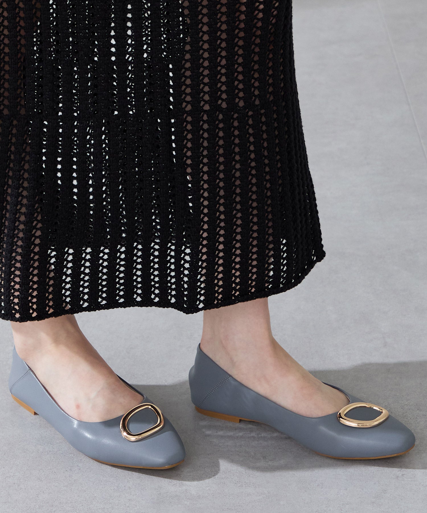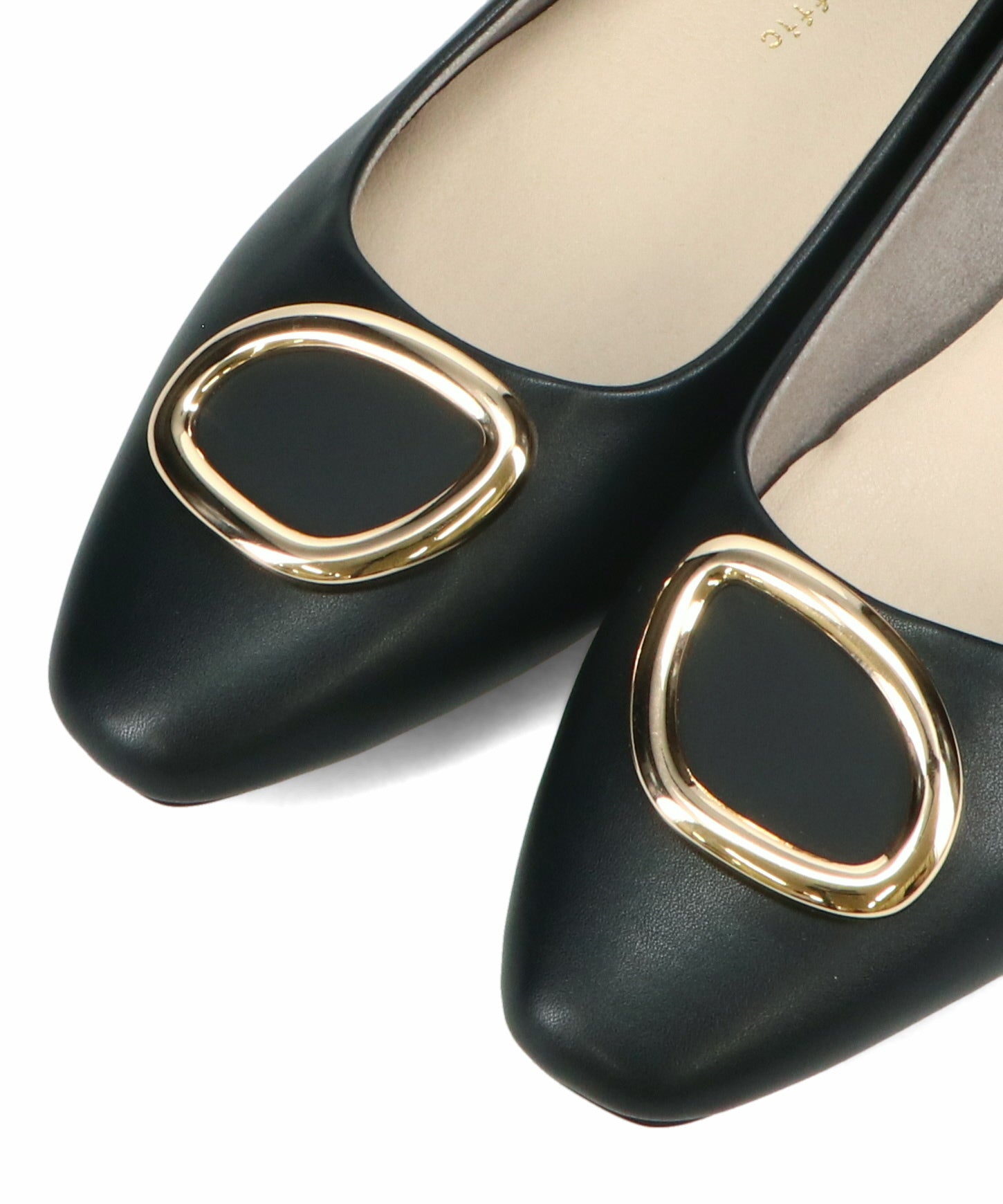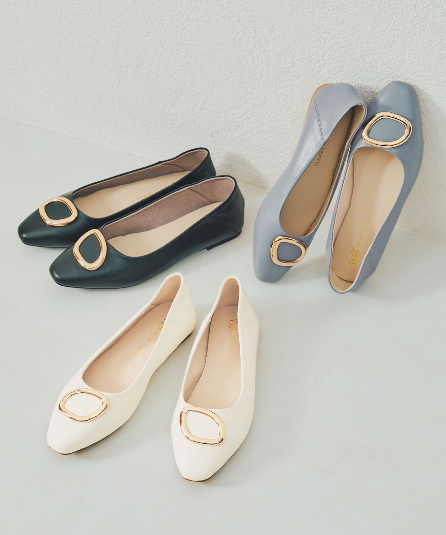 細身のスクエアトゥに高級感のあるゴールドの変形モチーフを施したレディライクなフラットパンプス。踵は踏んでも履ける2way仕様なので、シーンやスタイリングに合わせて使い分けができるのも魅力的。柔らかなアッパー素材と厚手クッション入りの中敷、さらにつま先部分にもクッションが入っているので足の負担を軽減してくれる優秀アイテム。