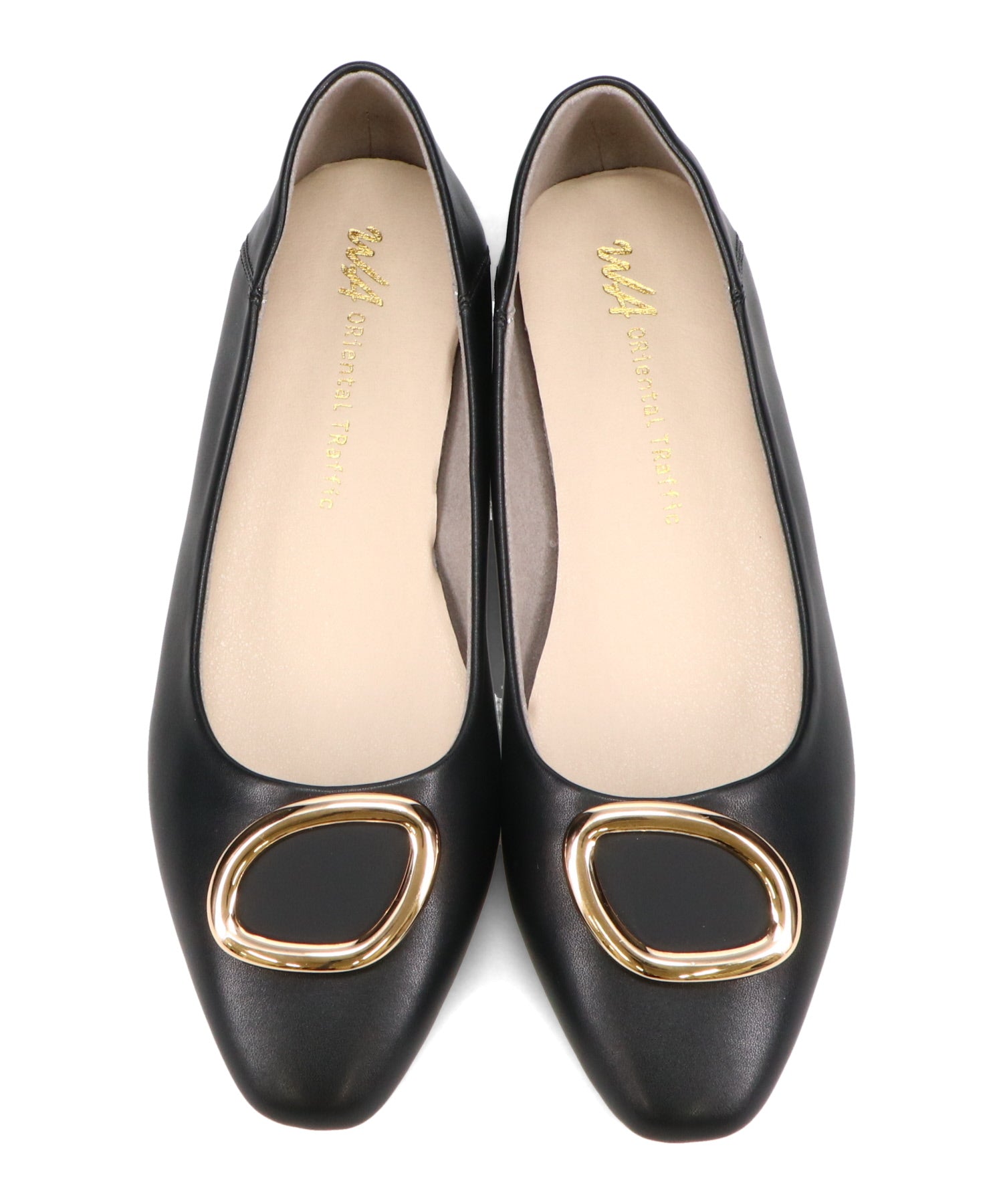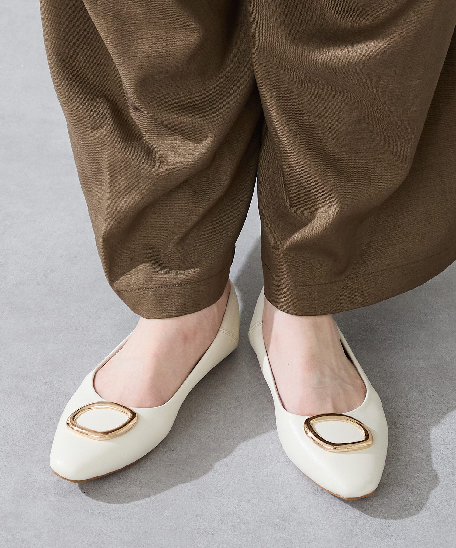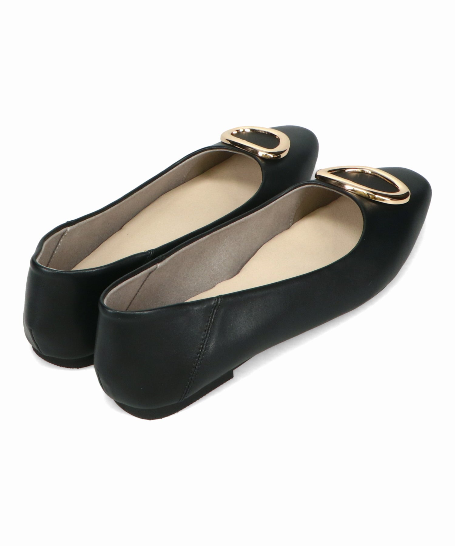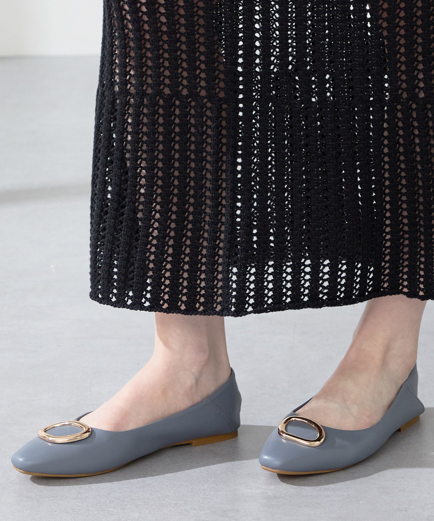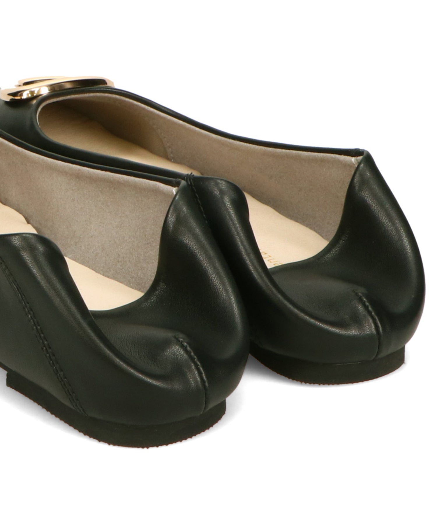 細身のスクエアトゥに高級感のあるゴールドの変形モチーフを施したレディライクなフラットパンプス。踵は踏んでも履ける2way仕様なので、シーンやスタイリングに合わせて使い分けができるのも魅力的。柔らかなアッパー素材と厚手クッション入りの中敷、さらにつま先部分にもクッションが入っているので足の負担を軽減してくれる優秀アイテム。