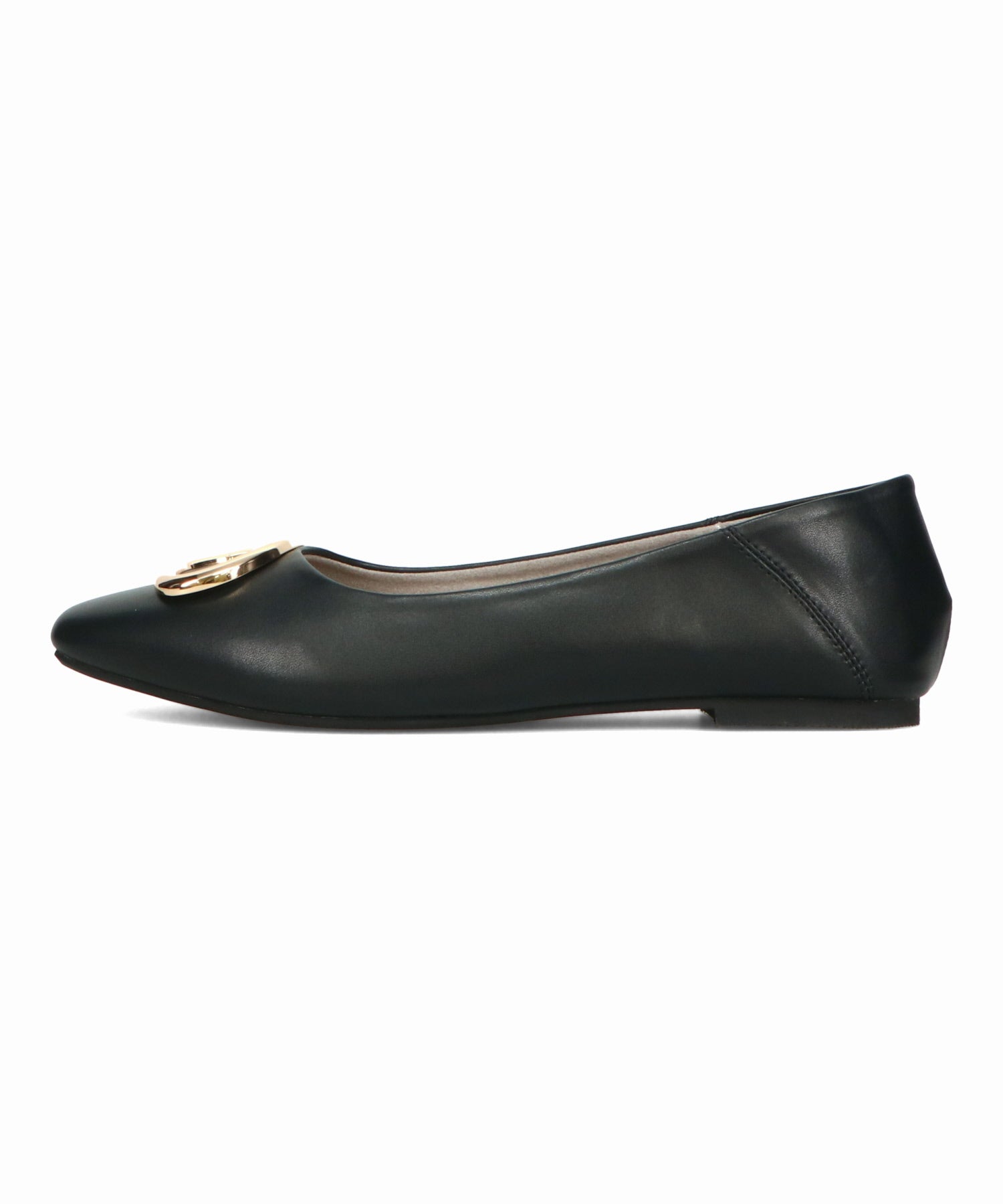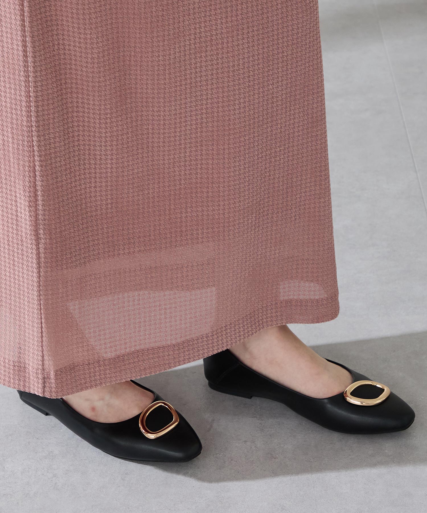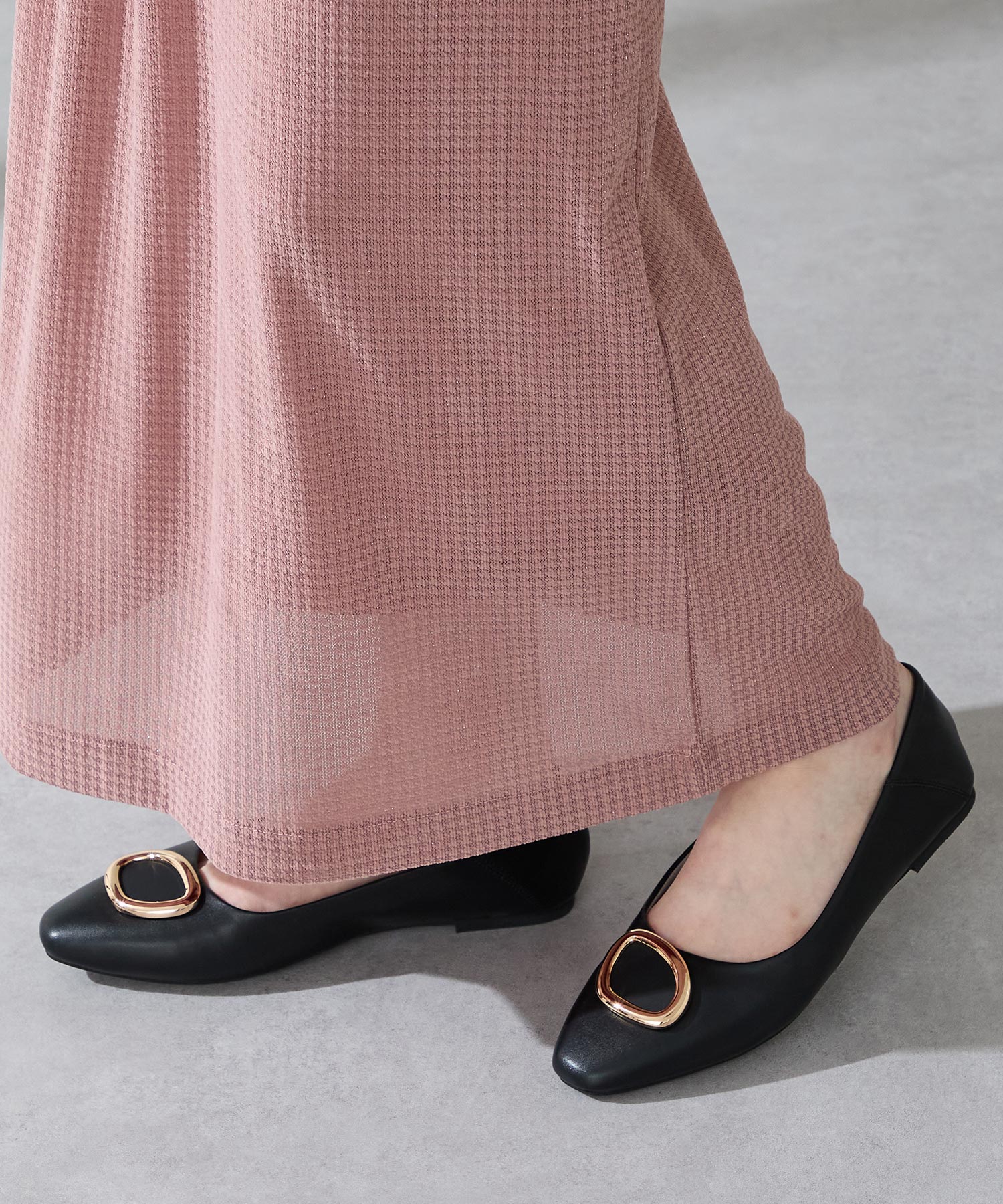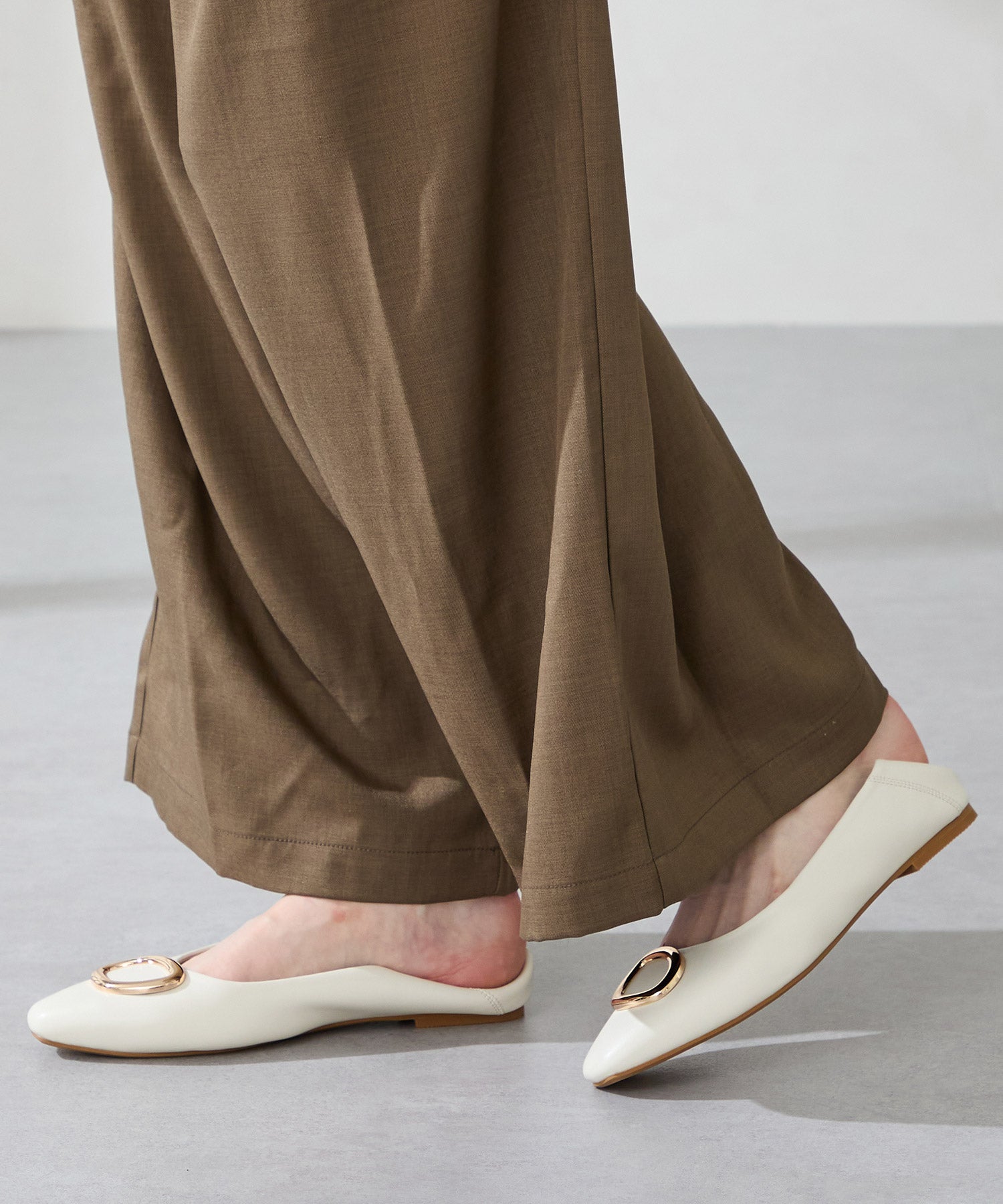 細身のスクエアトゥに高級感のあるゴールドの変形モチーフを施したレディライクなフラットパンプス。踵は踏んでも履ける2way仕様なので、シーンやスタイリングに合わせて使い分けができるのも魅力的。柔らかなアッパー素材と厚手クッション入りの中敷、さらにつま先部分にもクッションが入っているので足の負担を軽減してくれる優秀アイテム。