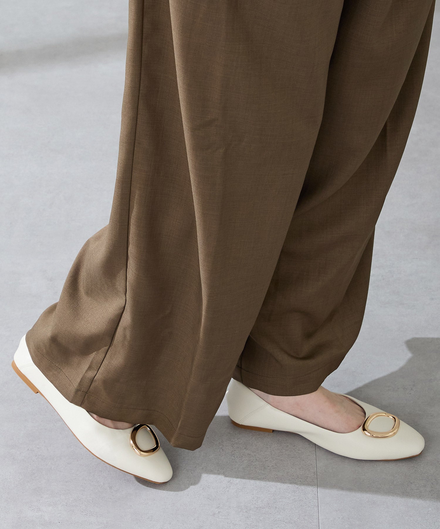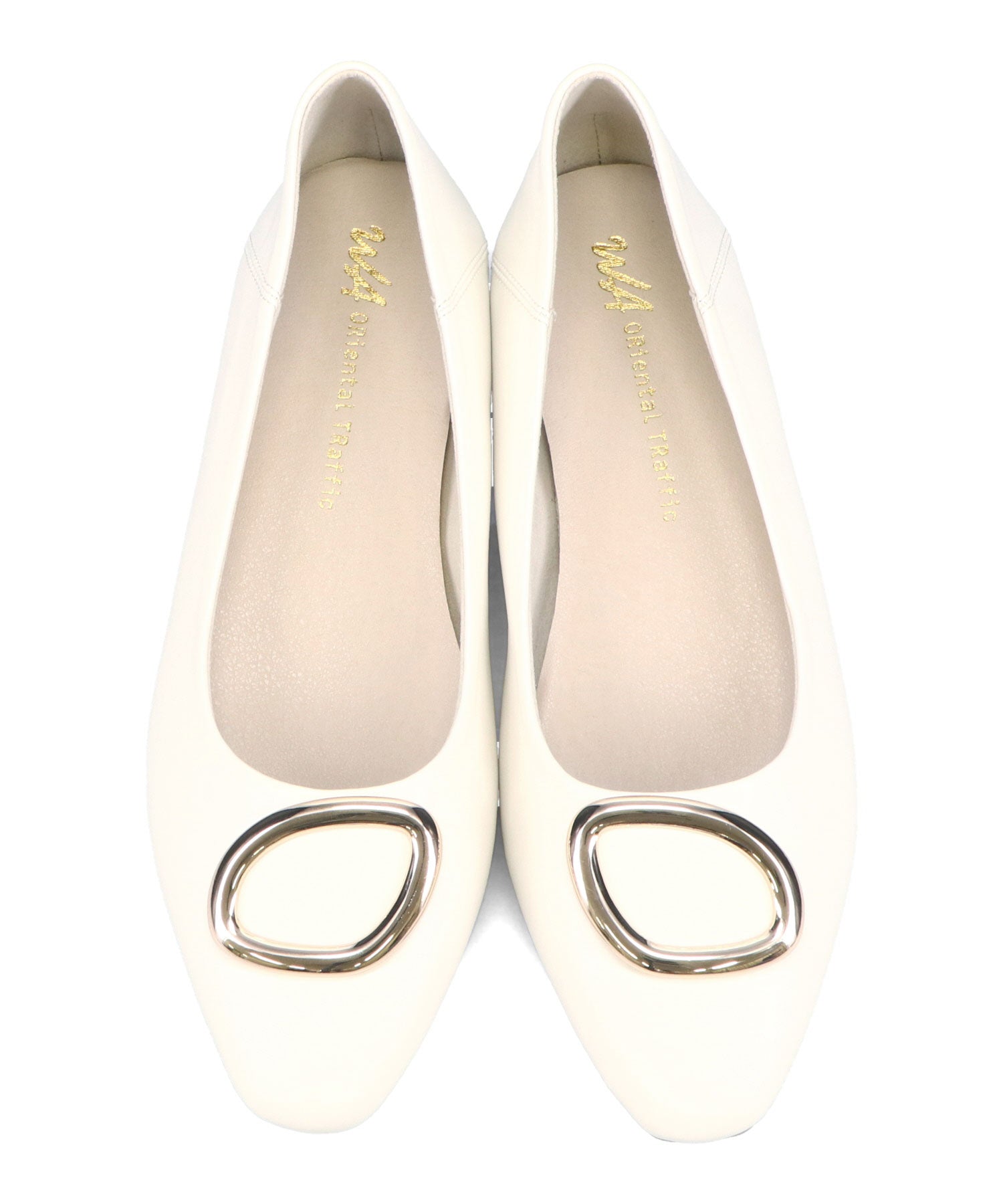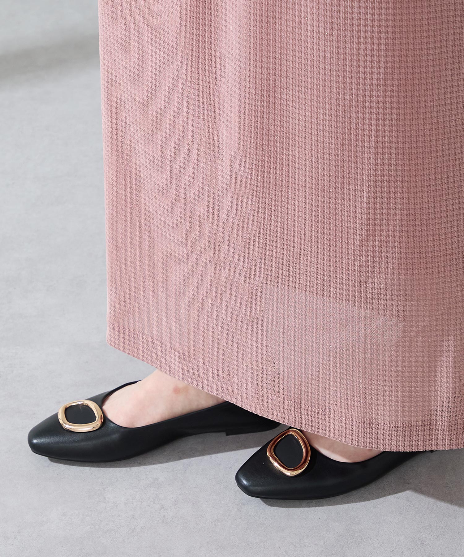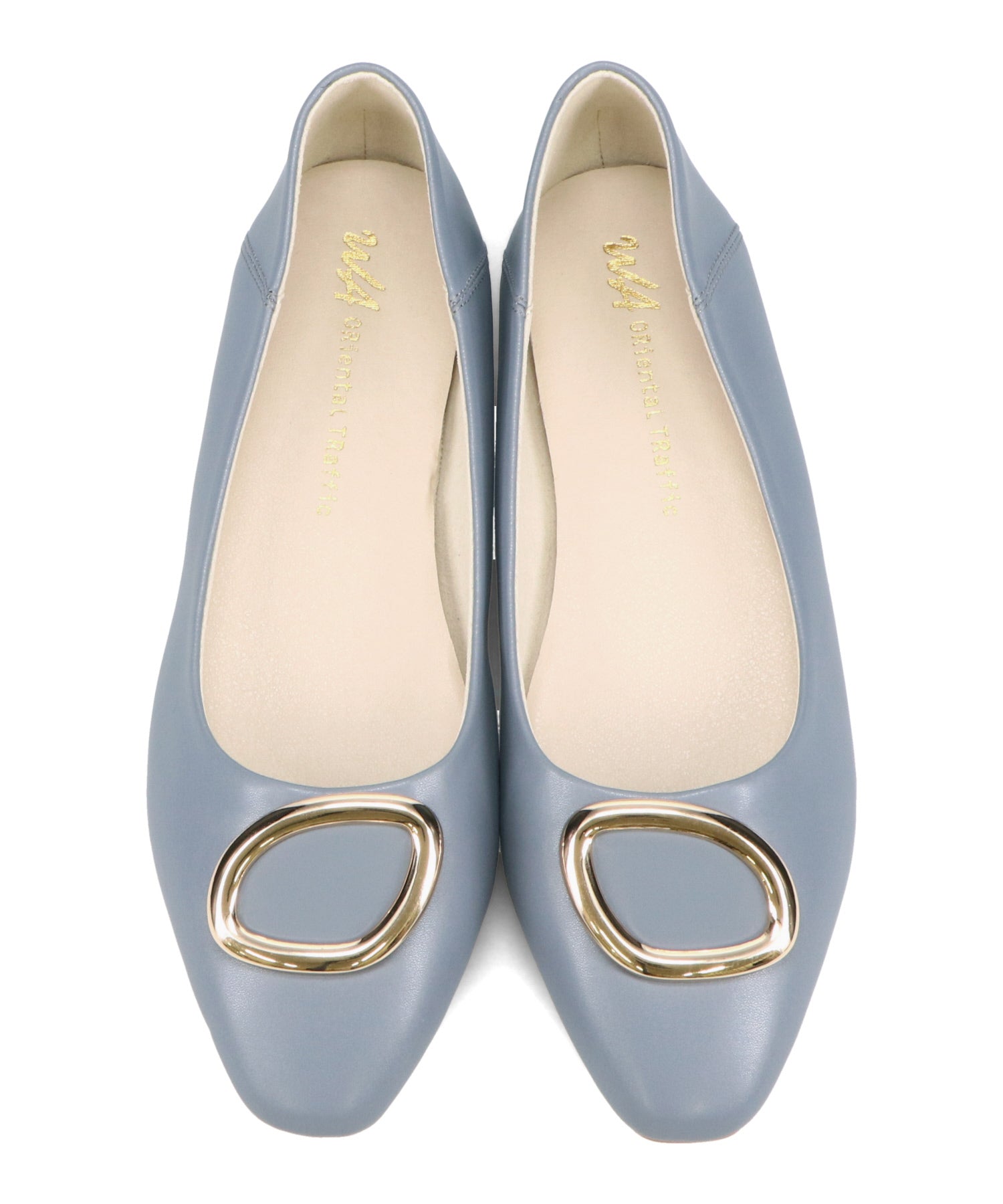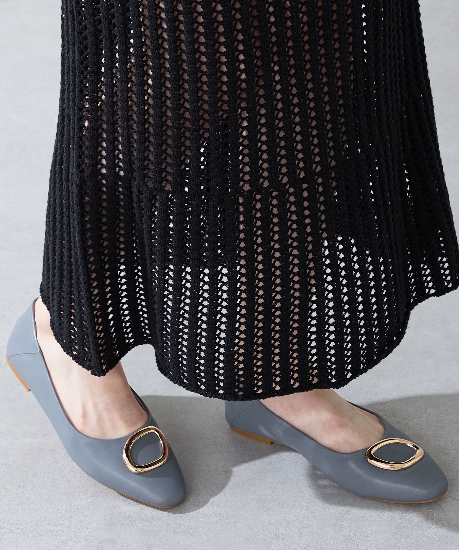 細身のスクエアトゥに高級感のあるゴールドの変形モチーフを施したレディライクなフラットパンプス。踵は踏んでも履ける2way仕様なので、シーンやスタイリングに合わせて使い分けができるのも魅力的。柔らかなアッパー素材と厚手クッション入りの中敷、さらにつま先部分にもクッションが入っているので足の負担を軽減してくれる優秀アイテム。