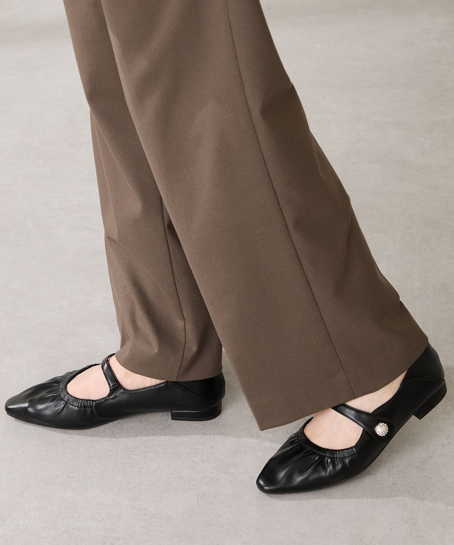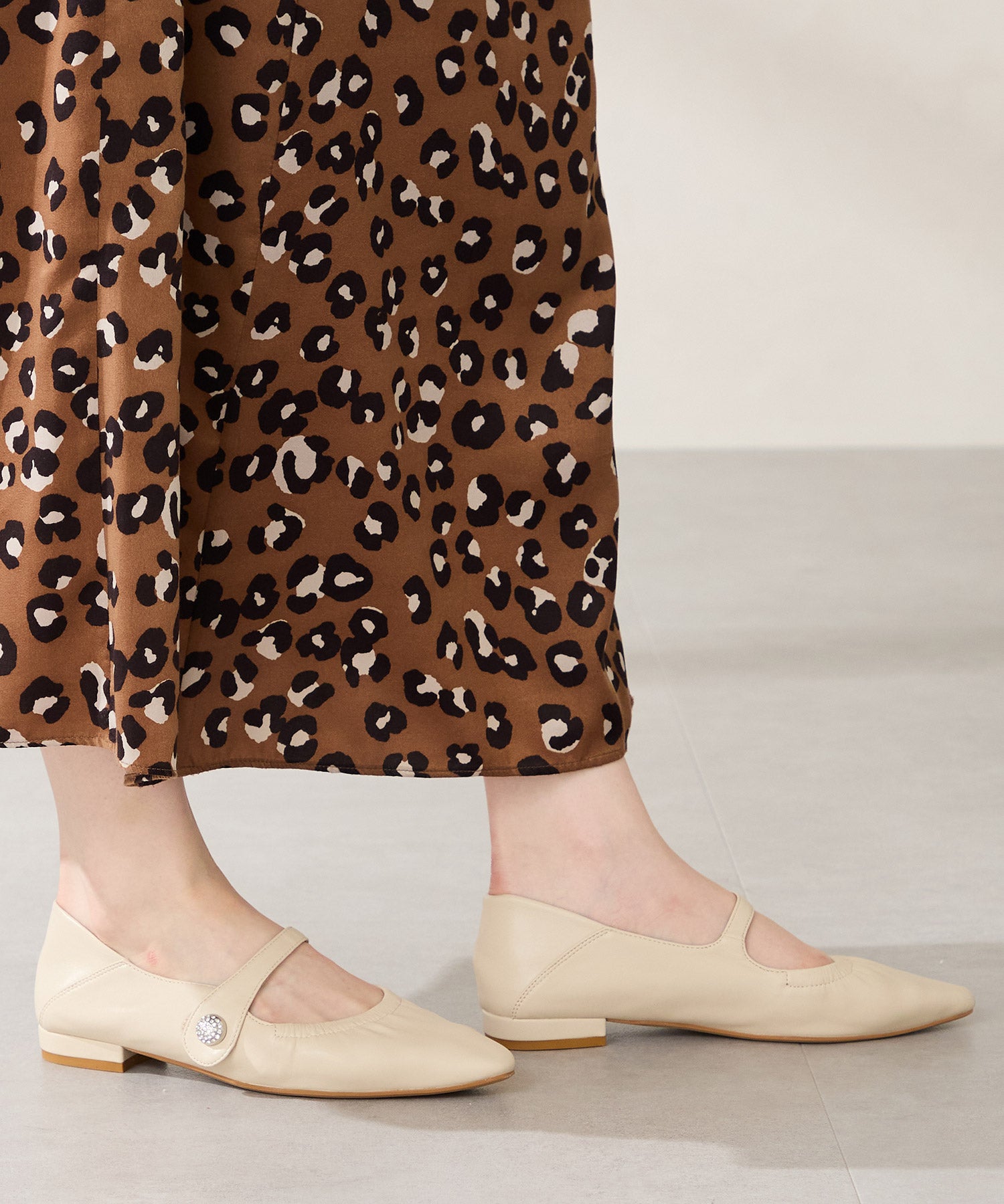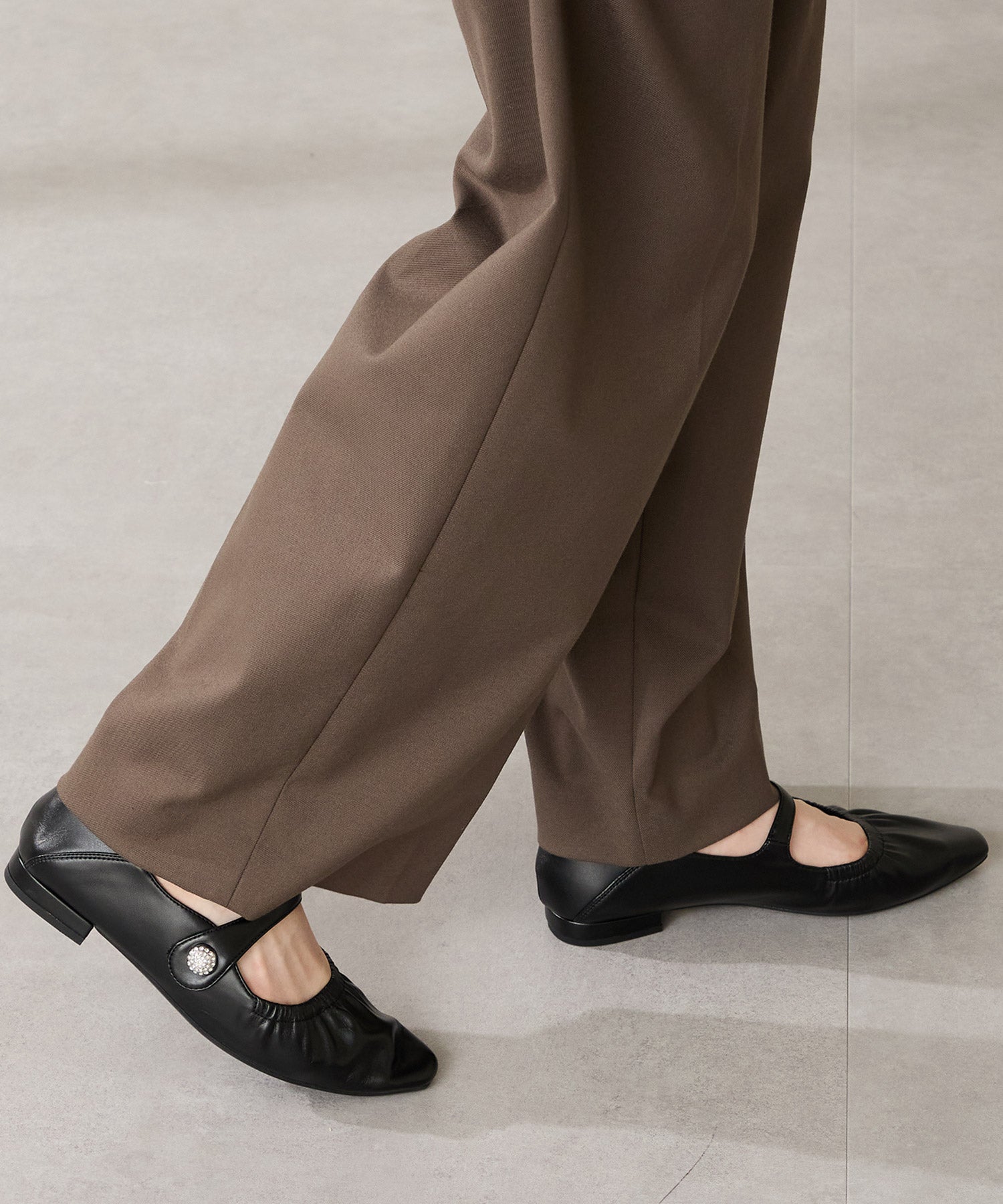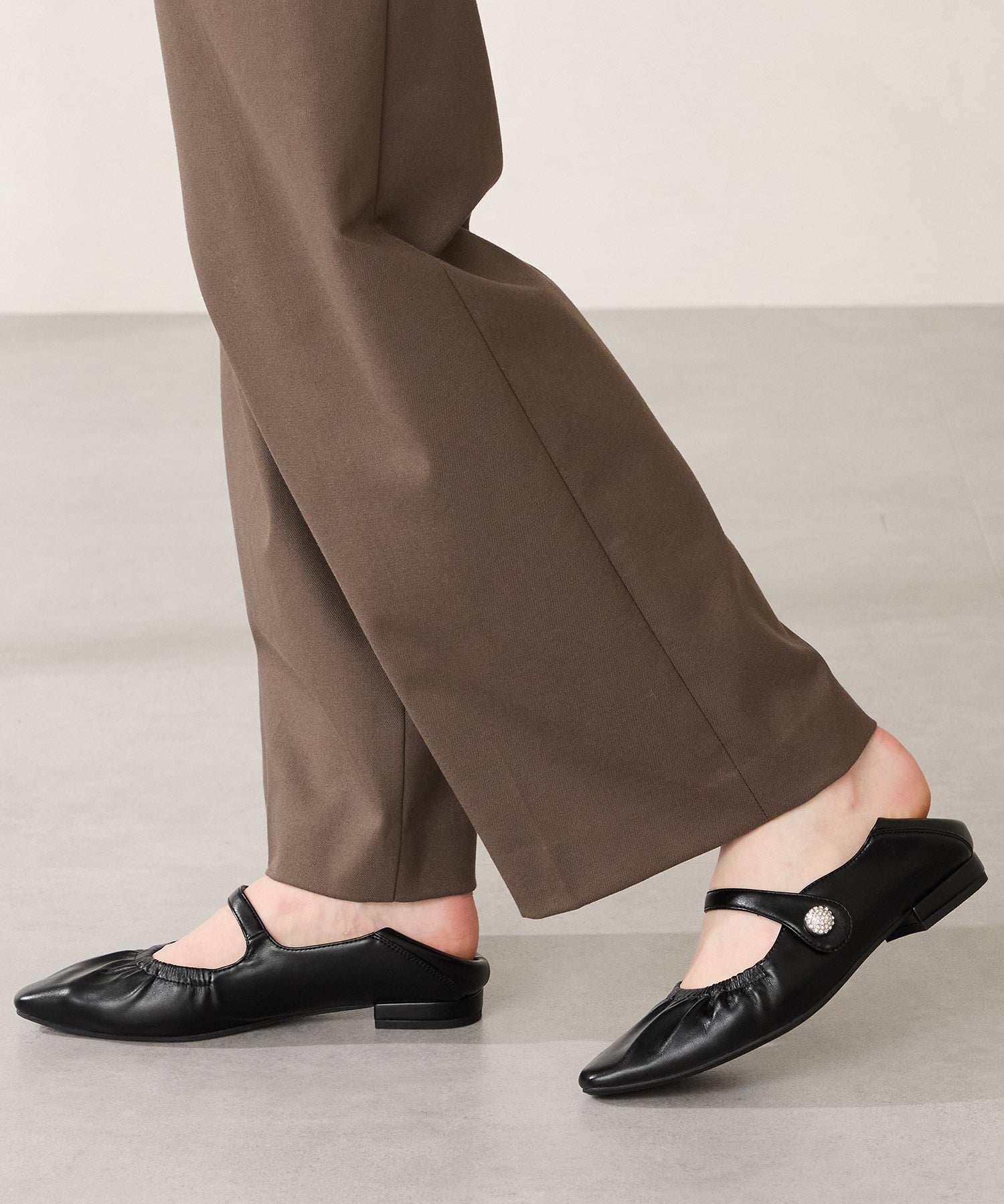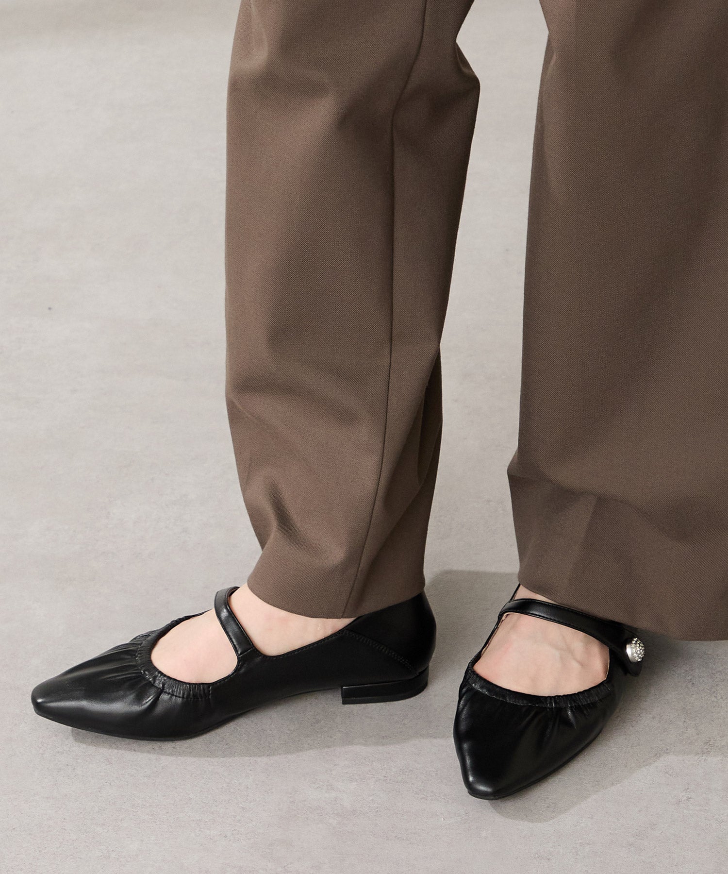 甲ベルトにあしらったビジュー付きのモチーフがさりげないワンポイントのフラットパンプスは、シャープなスクエアトゥで大人見えする1足。ゴムを入れた履き口は甲にフィットしながら、ギャザーデザインが足元をすっきり綺麗に見せてくれる。踵はバブーシュ仕様になっているので踏んでも履けるのと、中敷には厚手のクッションが入っているのでたくさん歩く日も安心。
