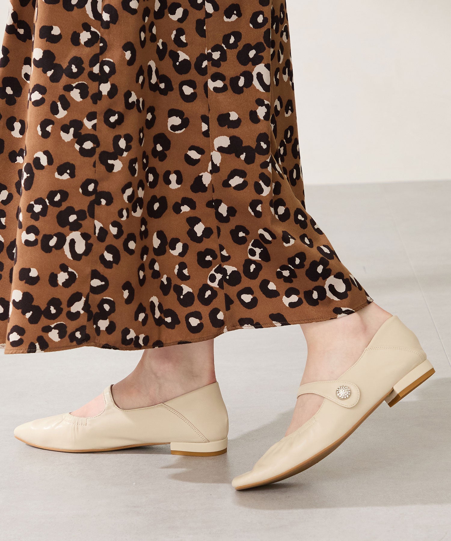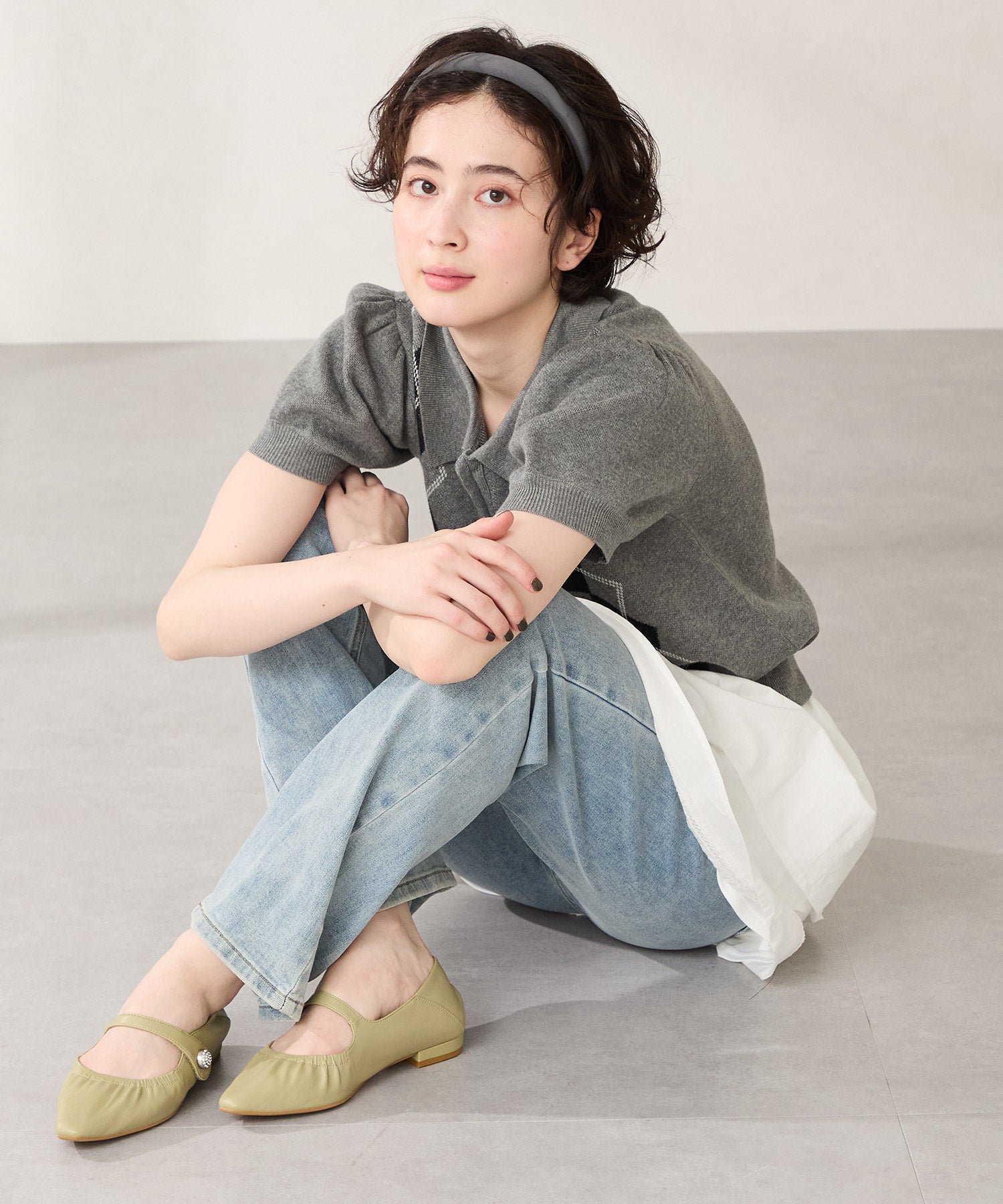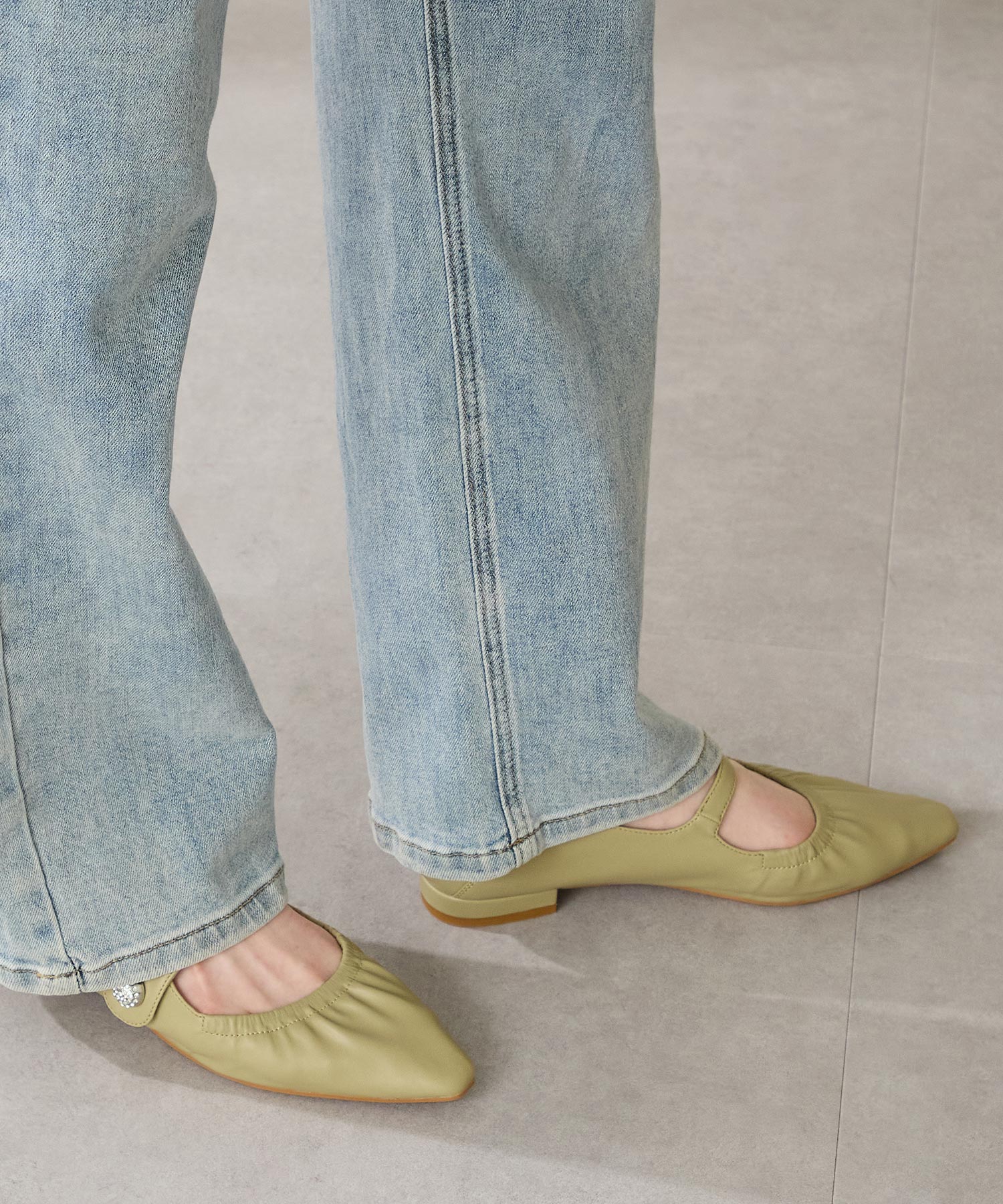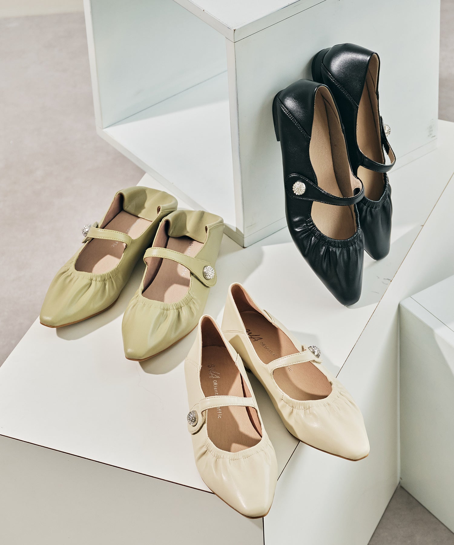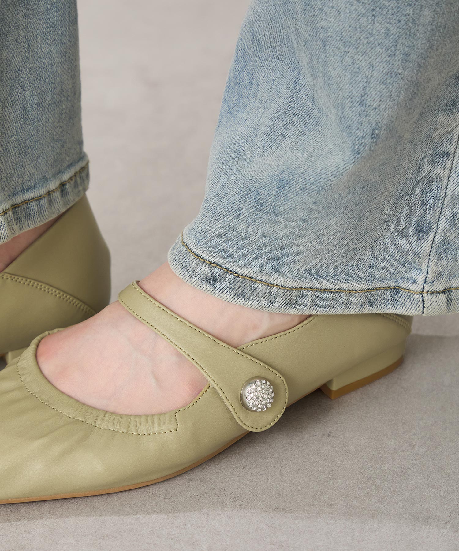 甲ベルトにあしらったビジュー付きのモチーフがさりげないワンポイントのフラットパンプスは、シャープなスクエアトゥで大人見えする1足。ゴムを入れた履き口は甲にフィットしながら、ギャザーデザインが足元をすっきり綺麗に見せてくれる。踵はバブーシュ仕様になっているので踏んでも履けるのと、中敷には厚手のクッションが入っているのでたくさん歩く日も安心。