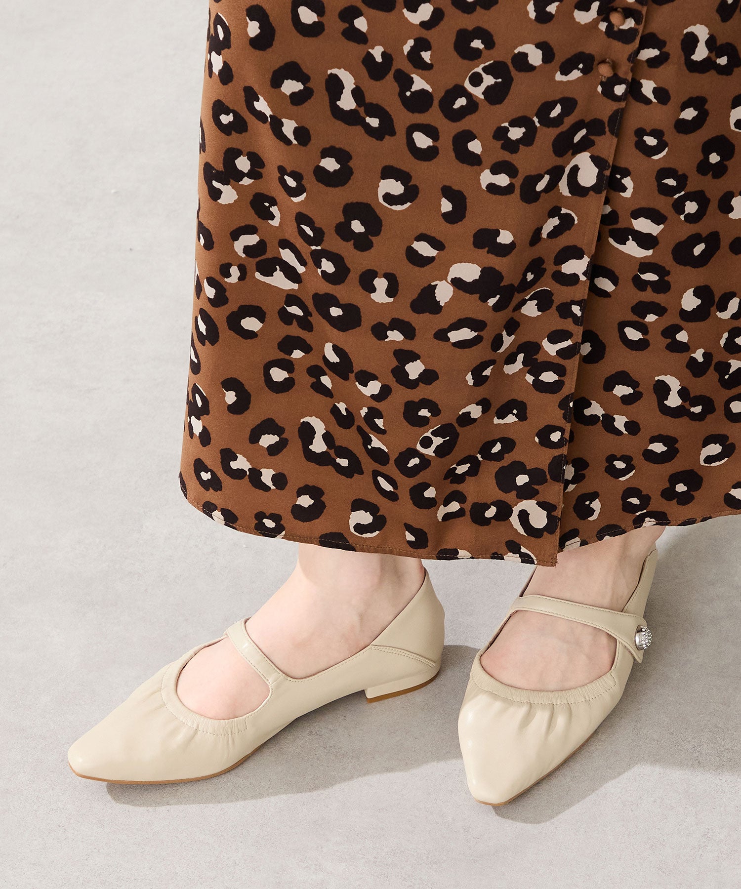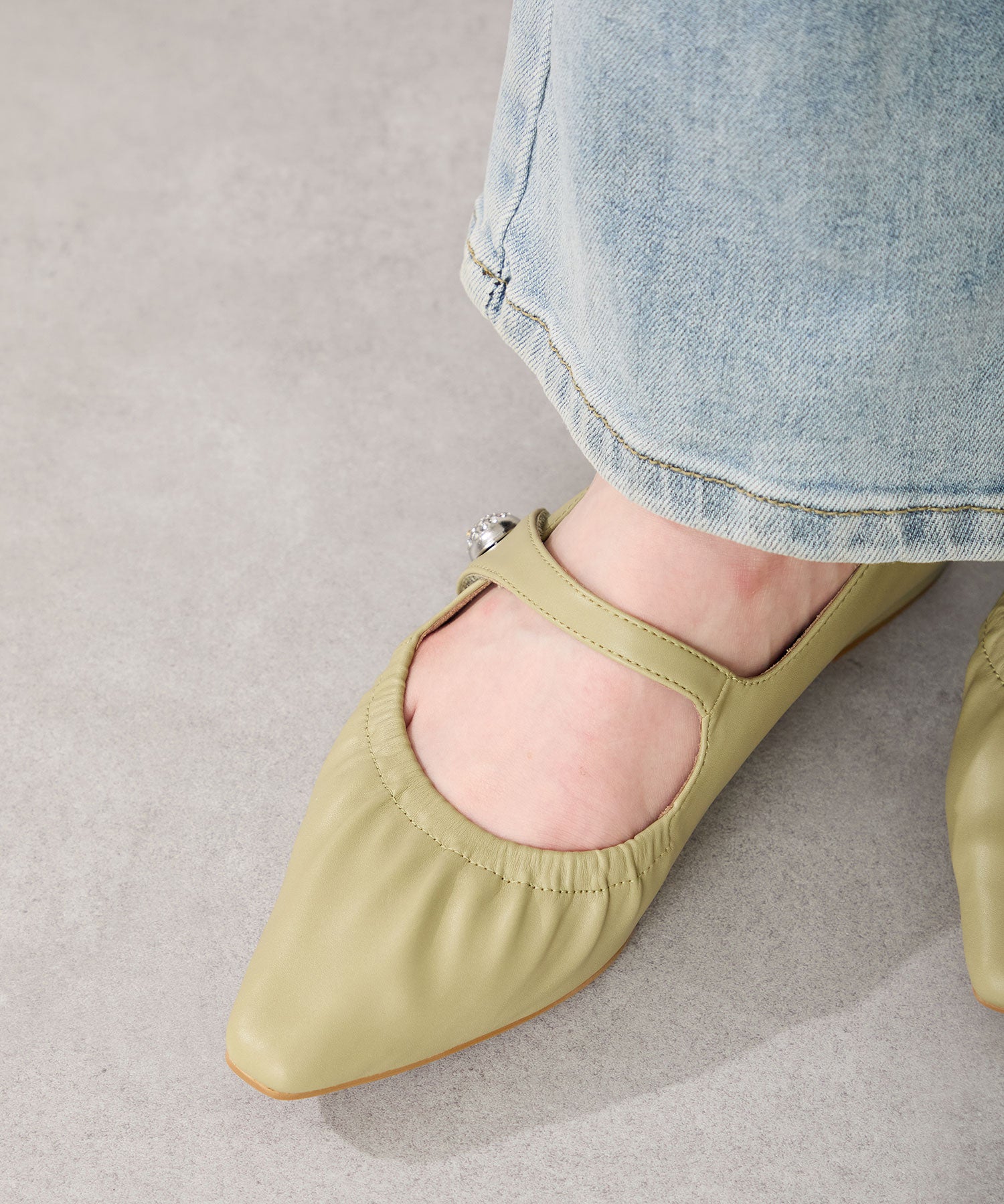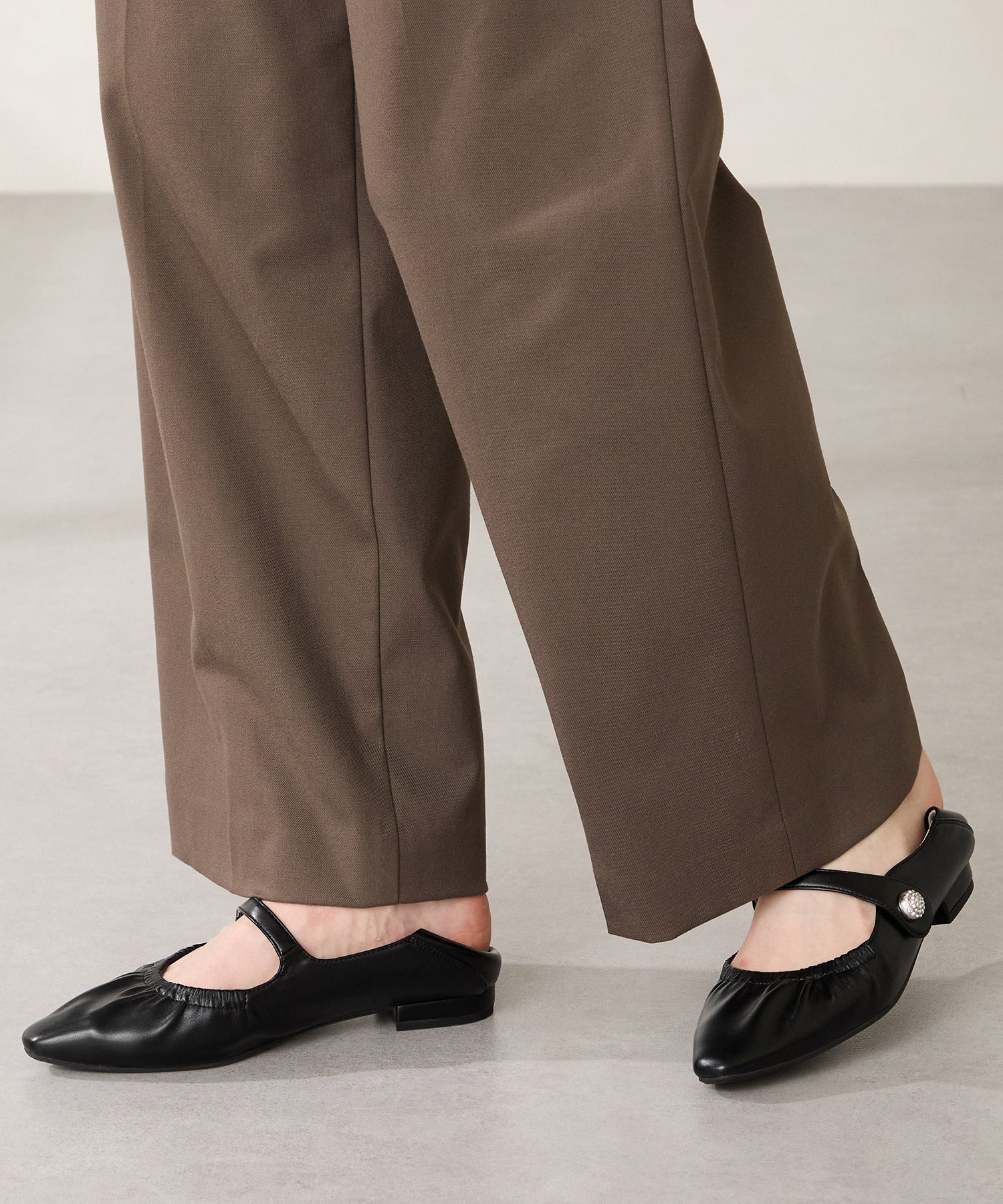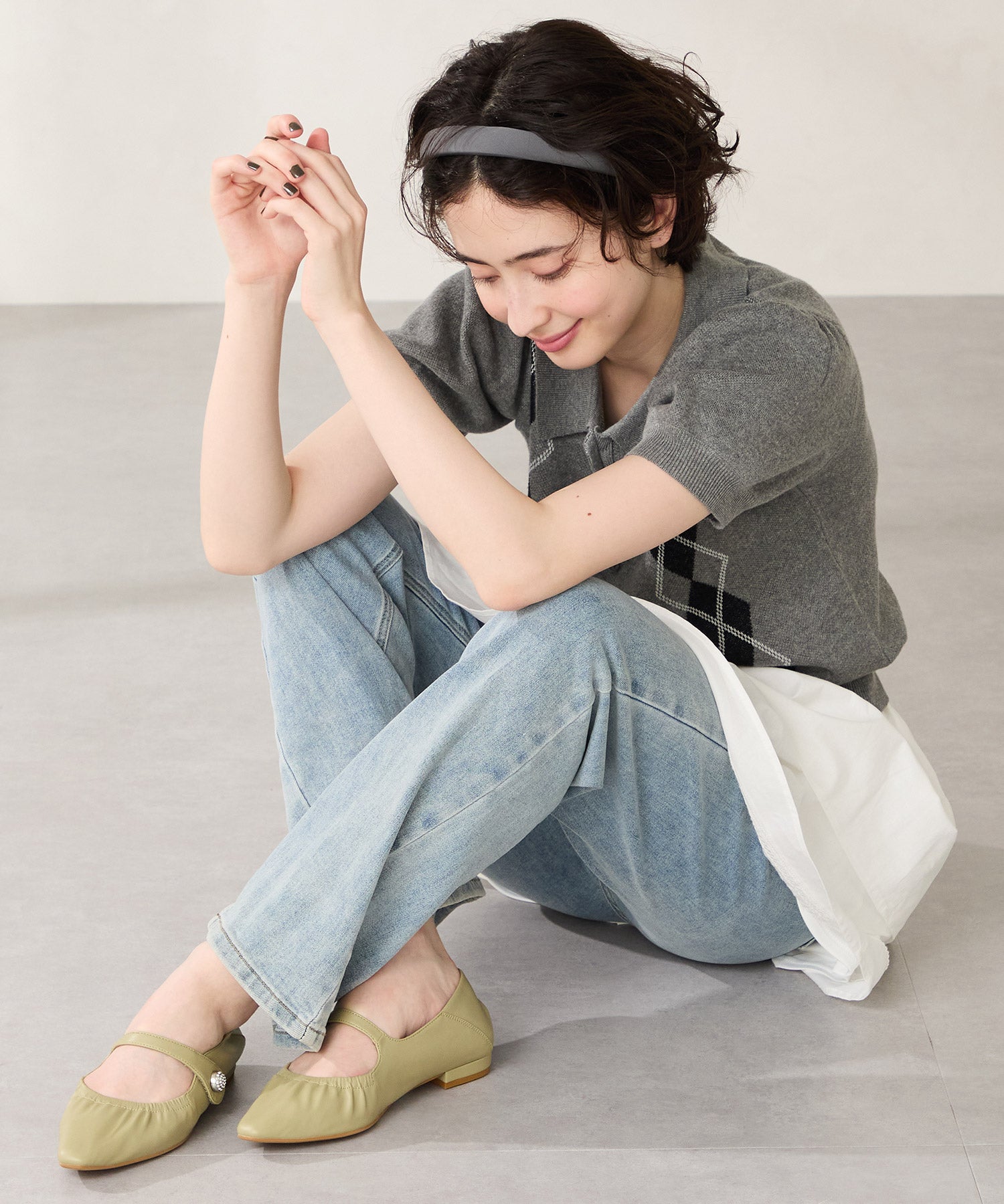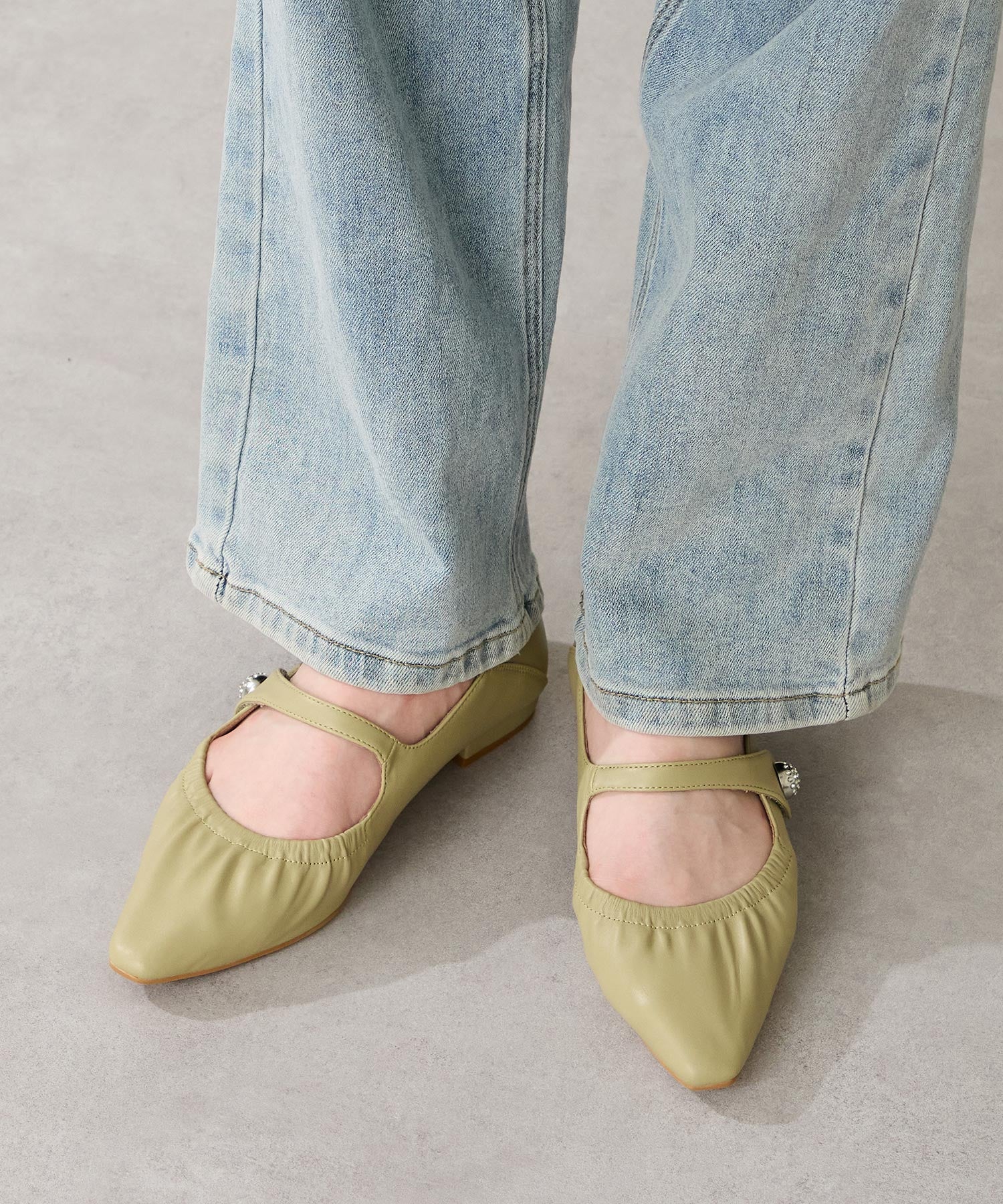 甲ベルトにあしらったビジュー付きのモチーフがさりげないワンポイントのフラットパンプスは、シャープなスクエアトゥで大人見えする1足。ゴムを入れた履き口は甲にフィットしながら、ギャザーデザインが足元をすっきり綺麗に見せてくれる。踵はバブーシュ仕様になっているので踏んでも履けるのと、中敷には厚手のクッションが入っているのでたくさん歩く日も安心。