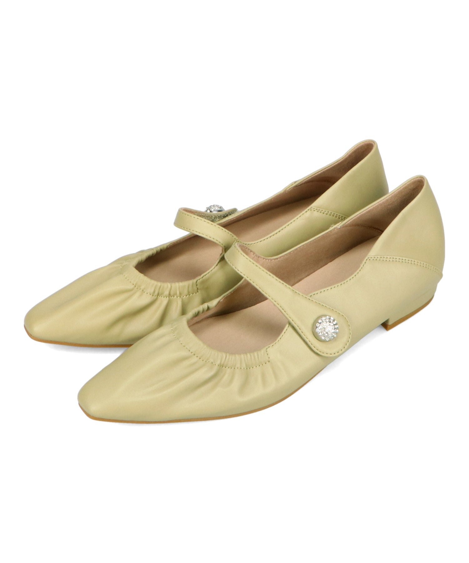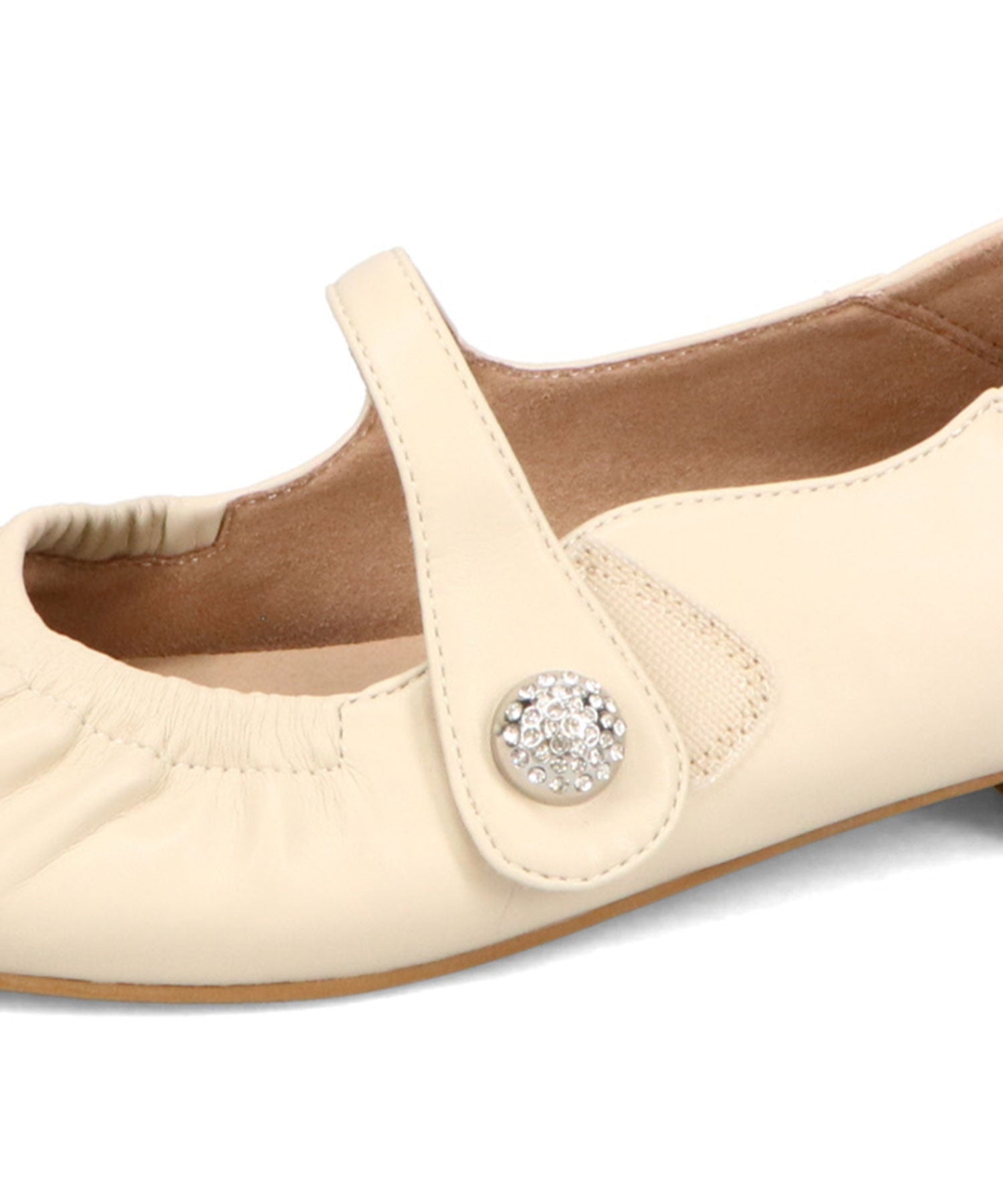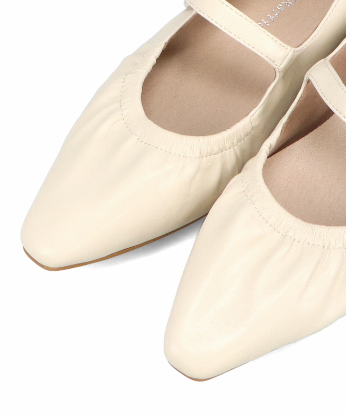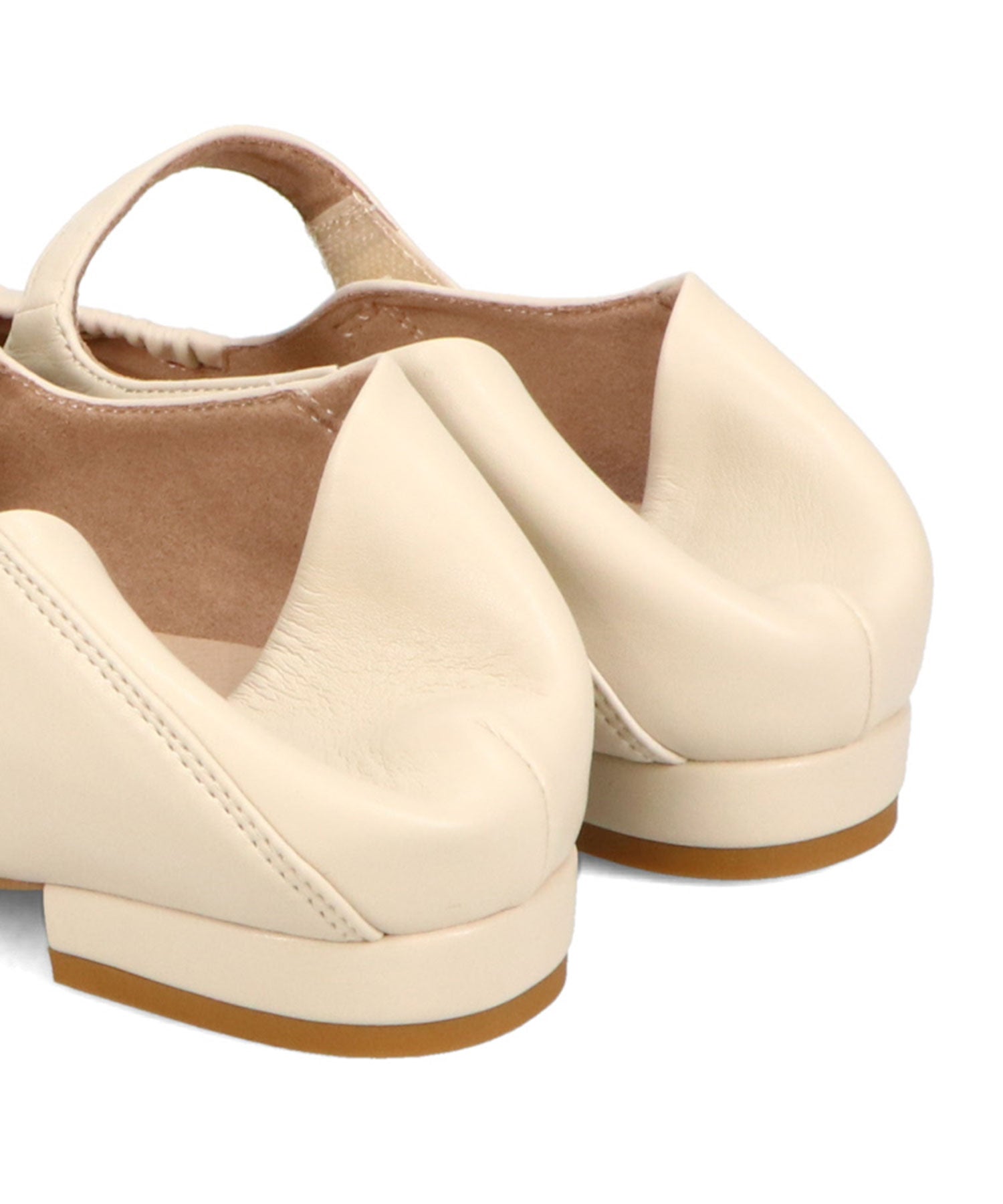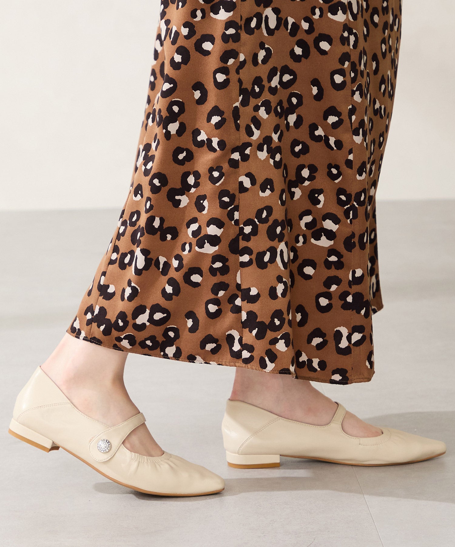 甲ベルトにあしらったビジュー付きのモチーフがさりげないワンポイントのフラットパンプスは、シャープなスクエアトゥで大人見えする1足。ゴムを入れた履き口は甲にフィットしながら、ギャザーデザインが足元をすっきり綺麗に見せてくれる。踵はバブーシュ仕様になっているので踏んでも履けるのと、中敷には厚手のクッションが入っているのでたくさん歩く日も安心。