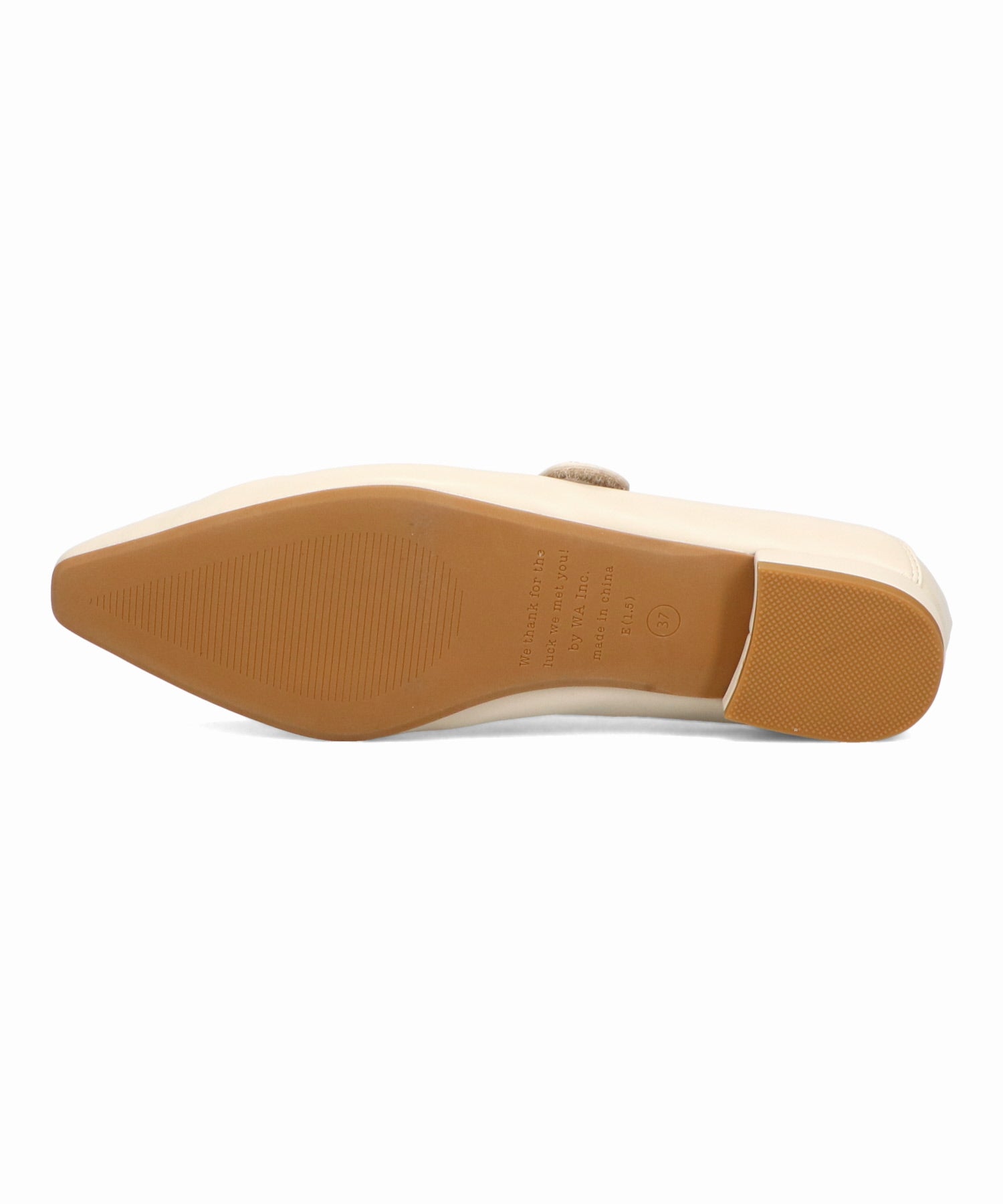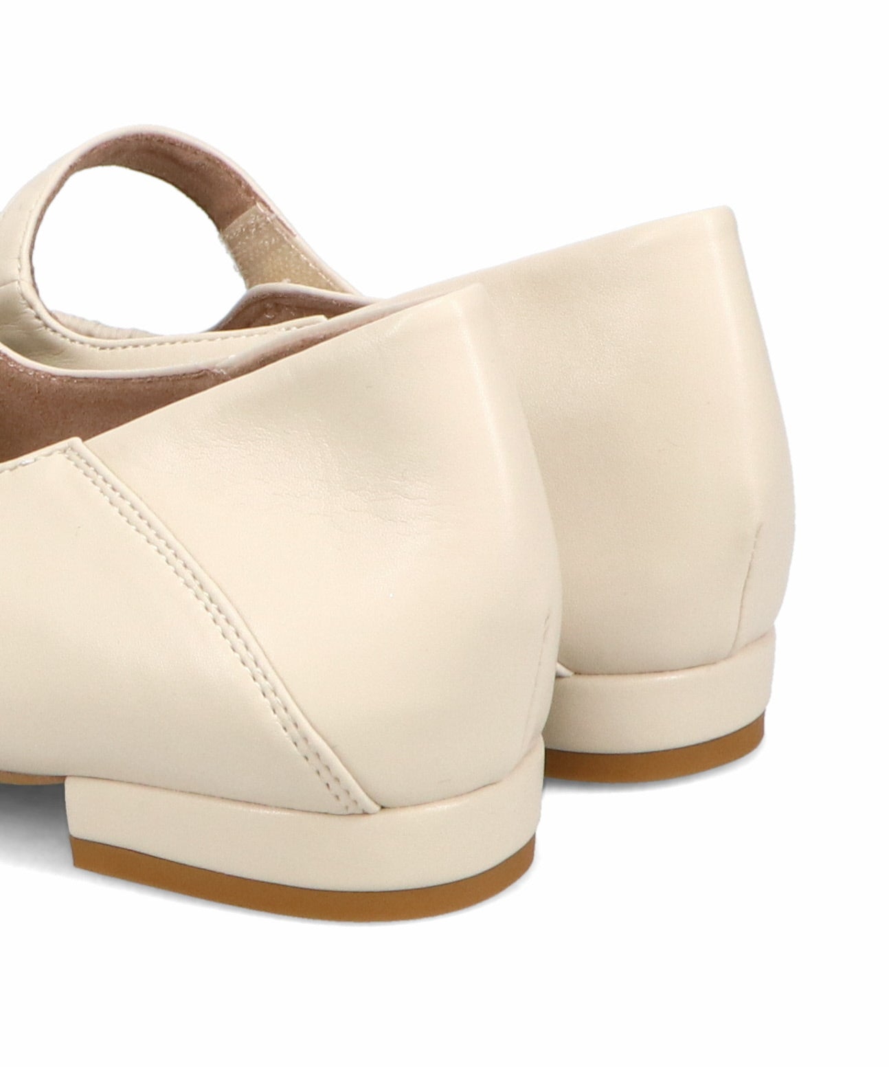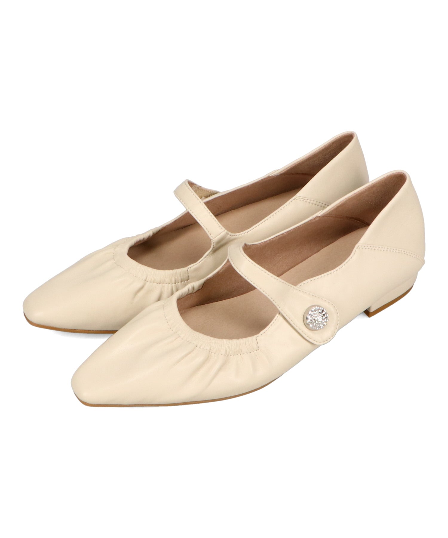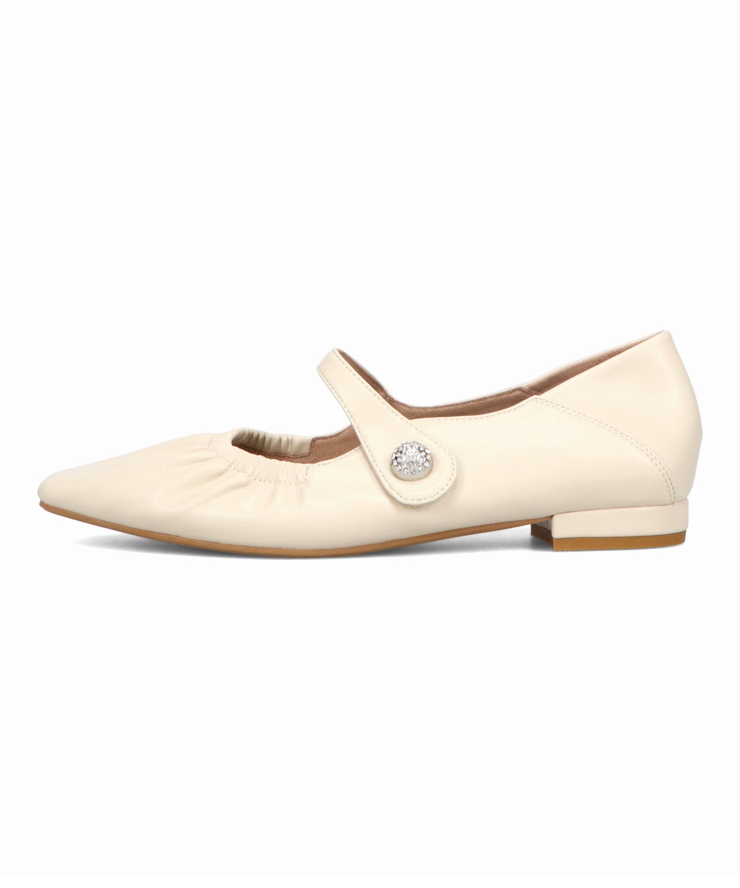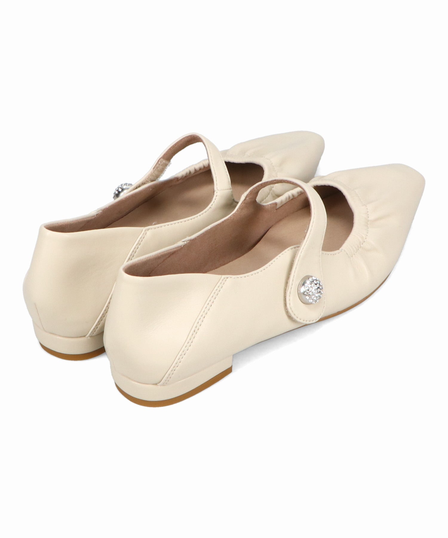 甲ベルトにあしらったビジュー付きのモチーフがさりげないワンポイントのフラットパンプスは、シャープなスクエアトゥで大人見えする1足。ゴムを入れた履き口は甲にフィットしながら、ギャザーデザインが足元をすっきり綺麗に見せてくれる。踵はバブーシュ仕様になっているので踏んでも履けるのと、中敷には厚手のクッションが入っているのでたくさん歩く日も安心。