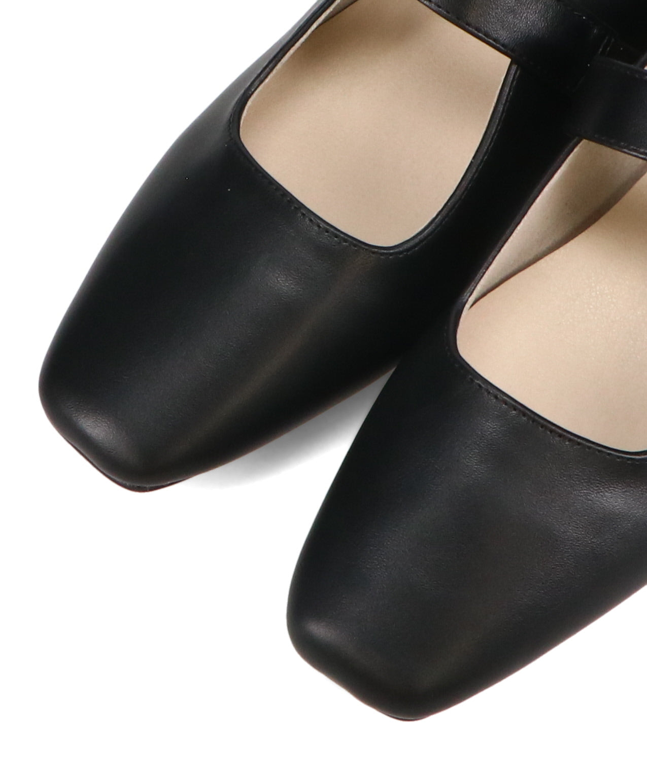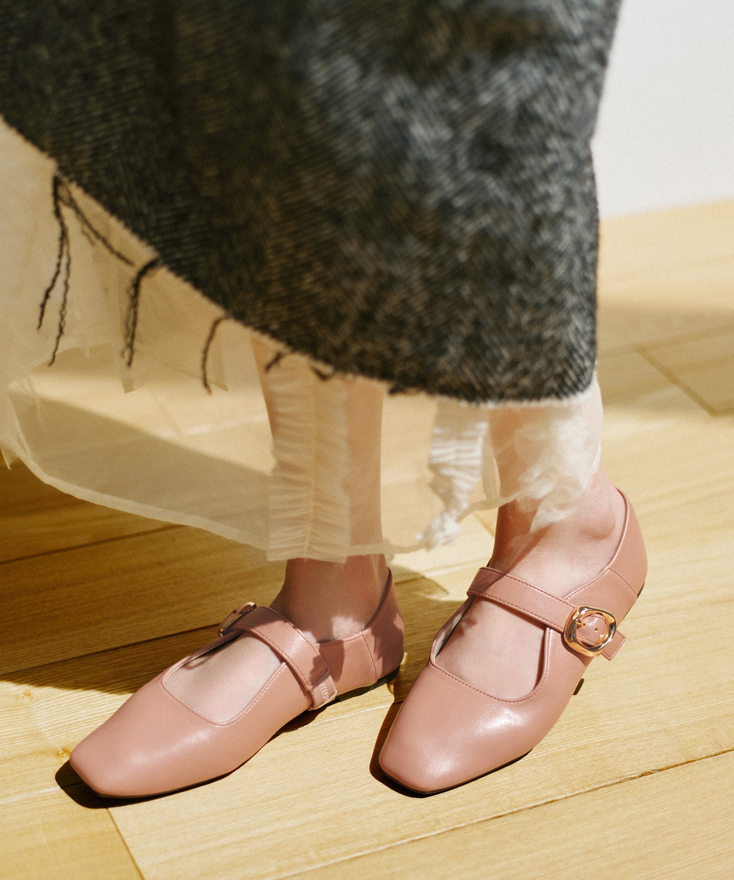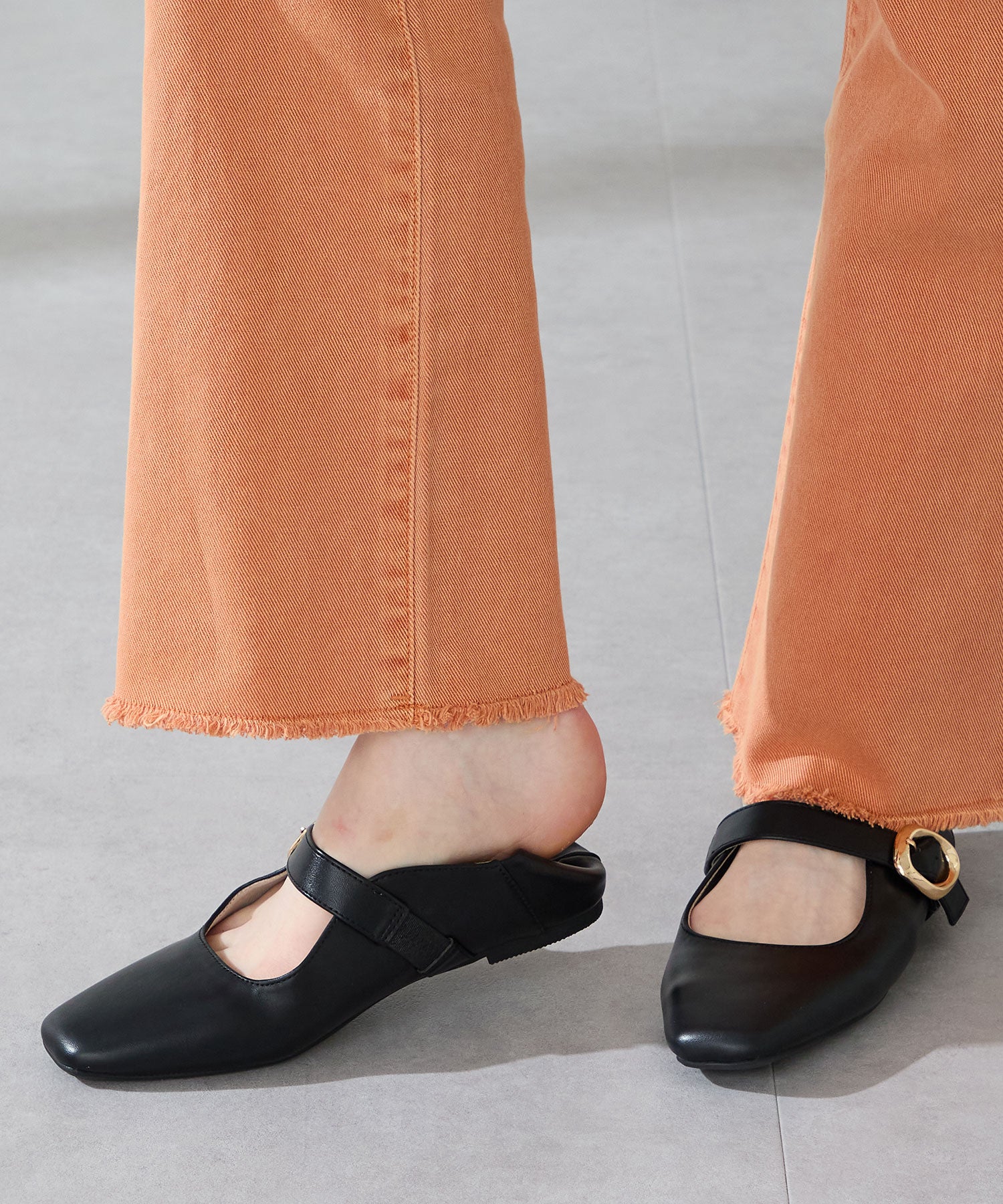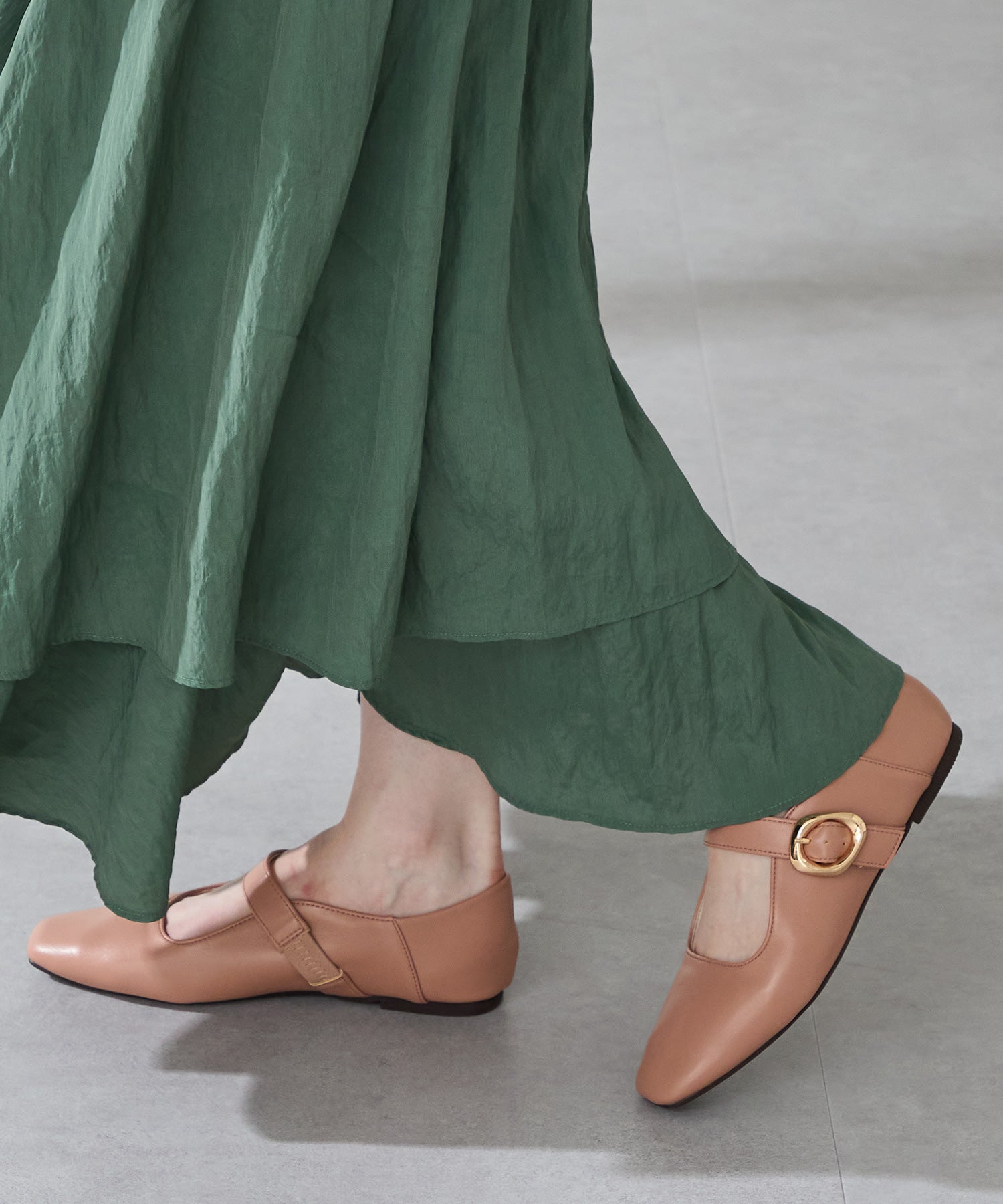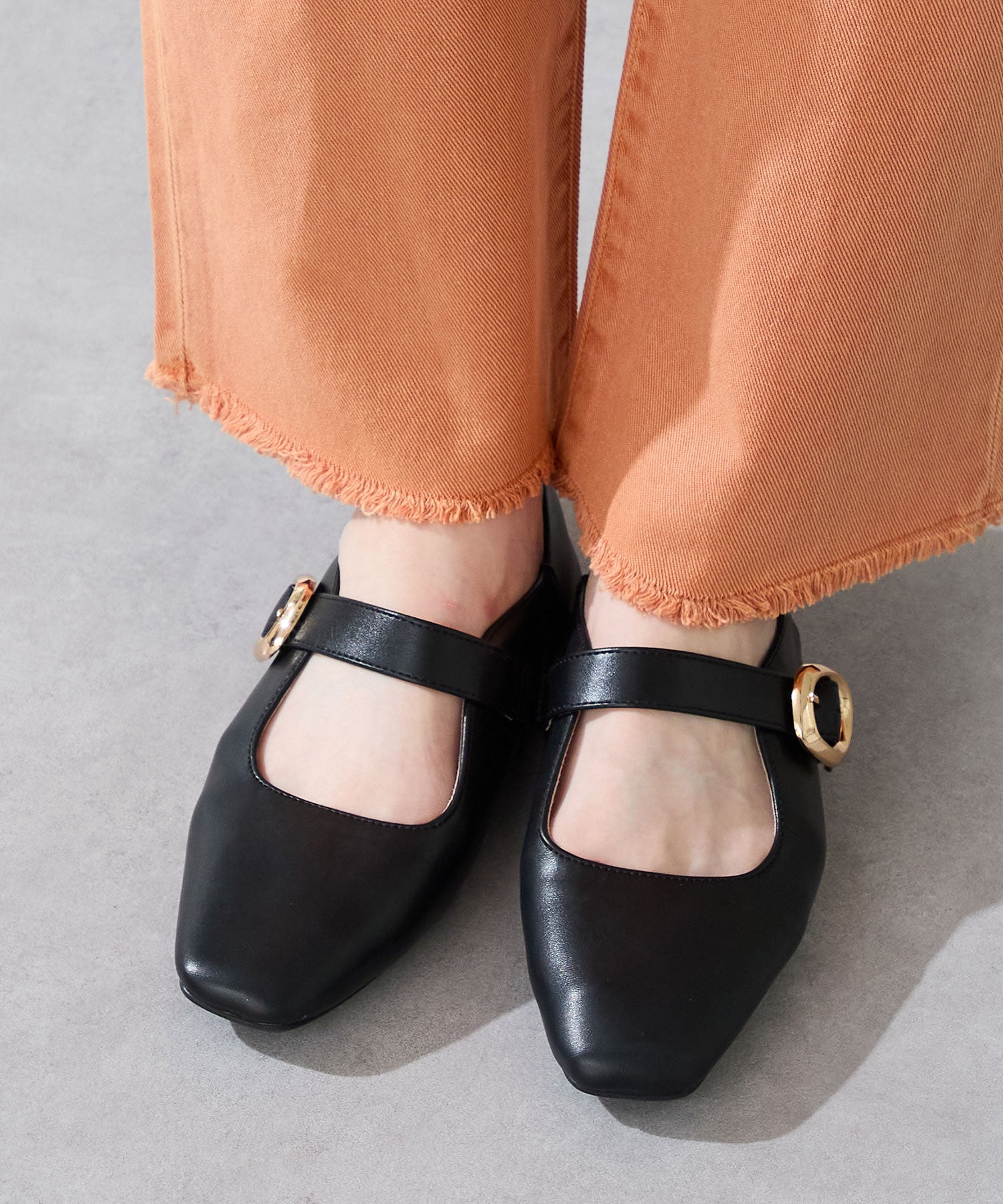 ほんのりスクエアカットしたラインでこなれ感を出しつつ、ゴールドの変形バックルでひとクセ加えたストラップパンプス。甲をホールドする太めのベルトに、つま先クッション入りで足を包み込むようなフィット感を実現。つま先から全体にかけて柔らかな素材に、踵を踏んでも履けるバブーシュデザインなど、心地よい履き心地でデイリー使いにぴったりの1足。