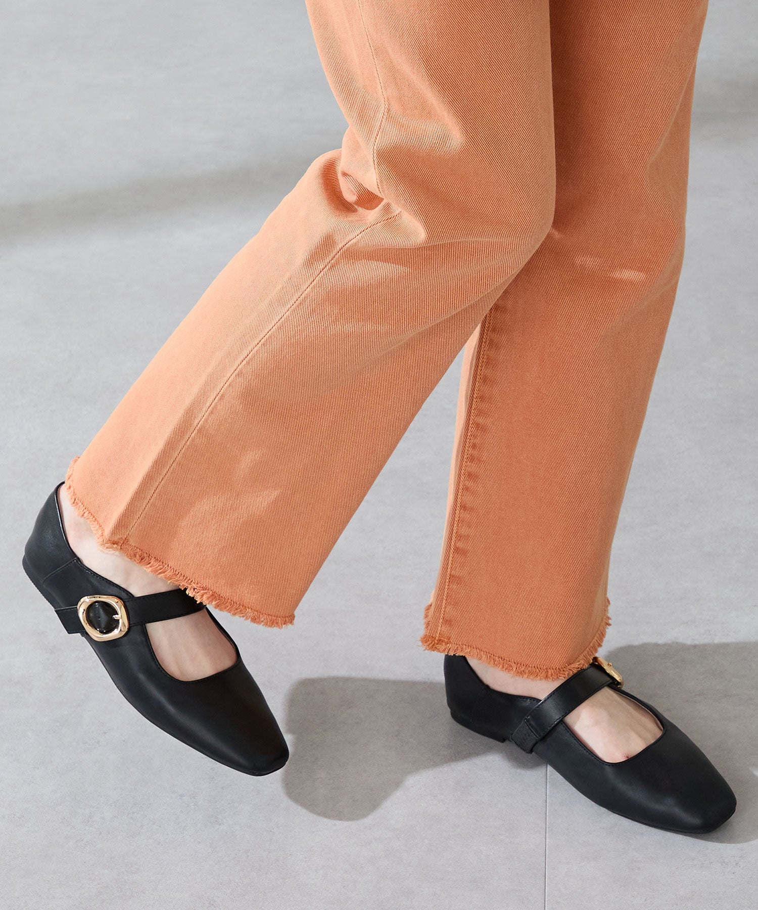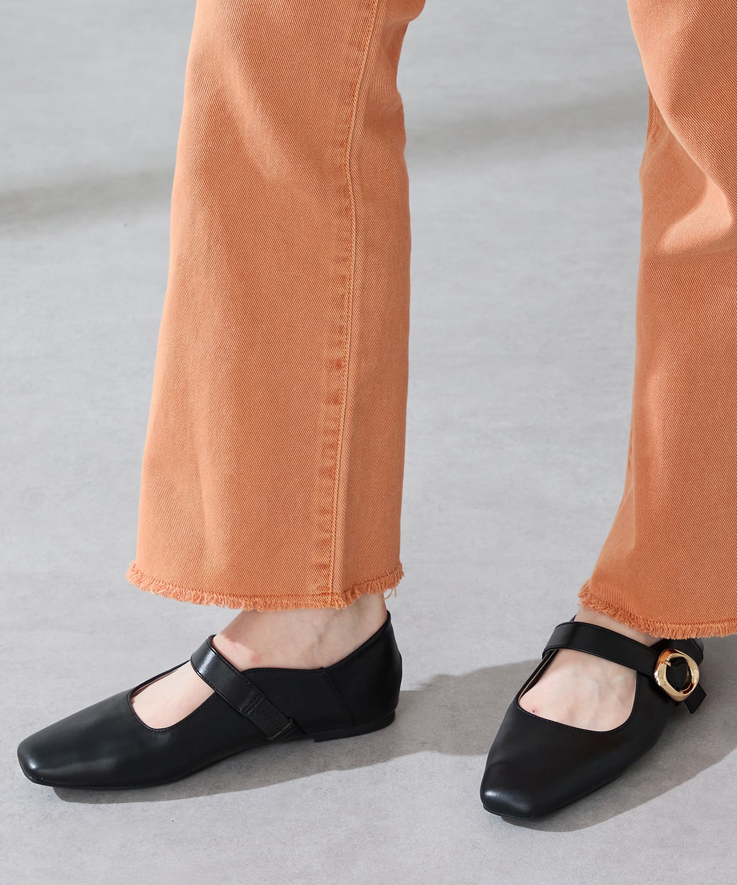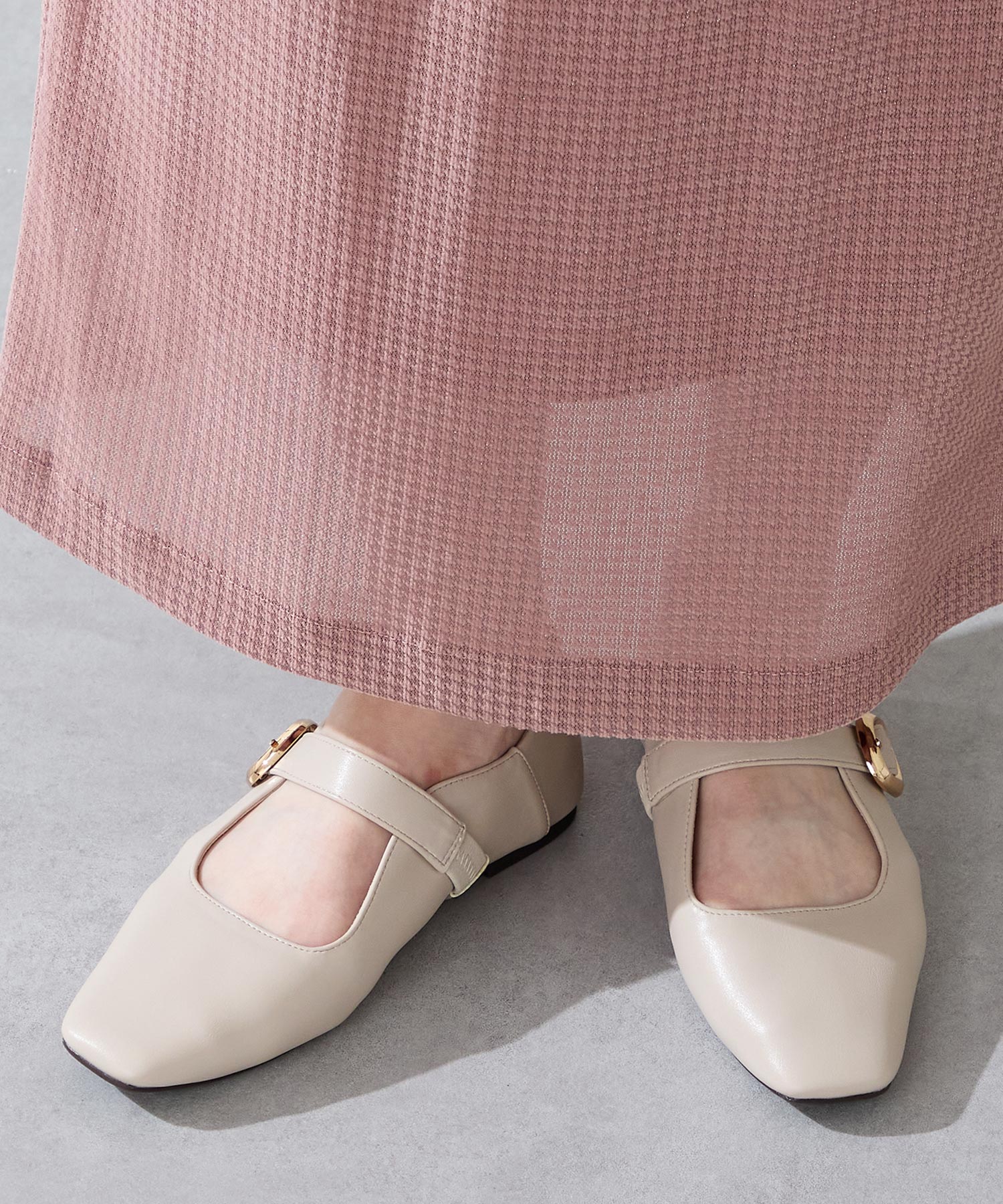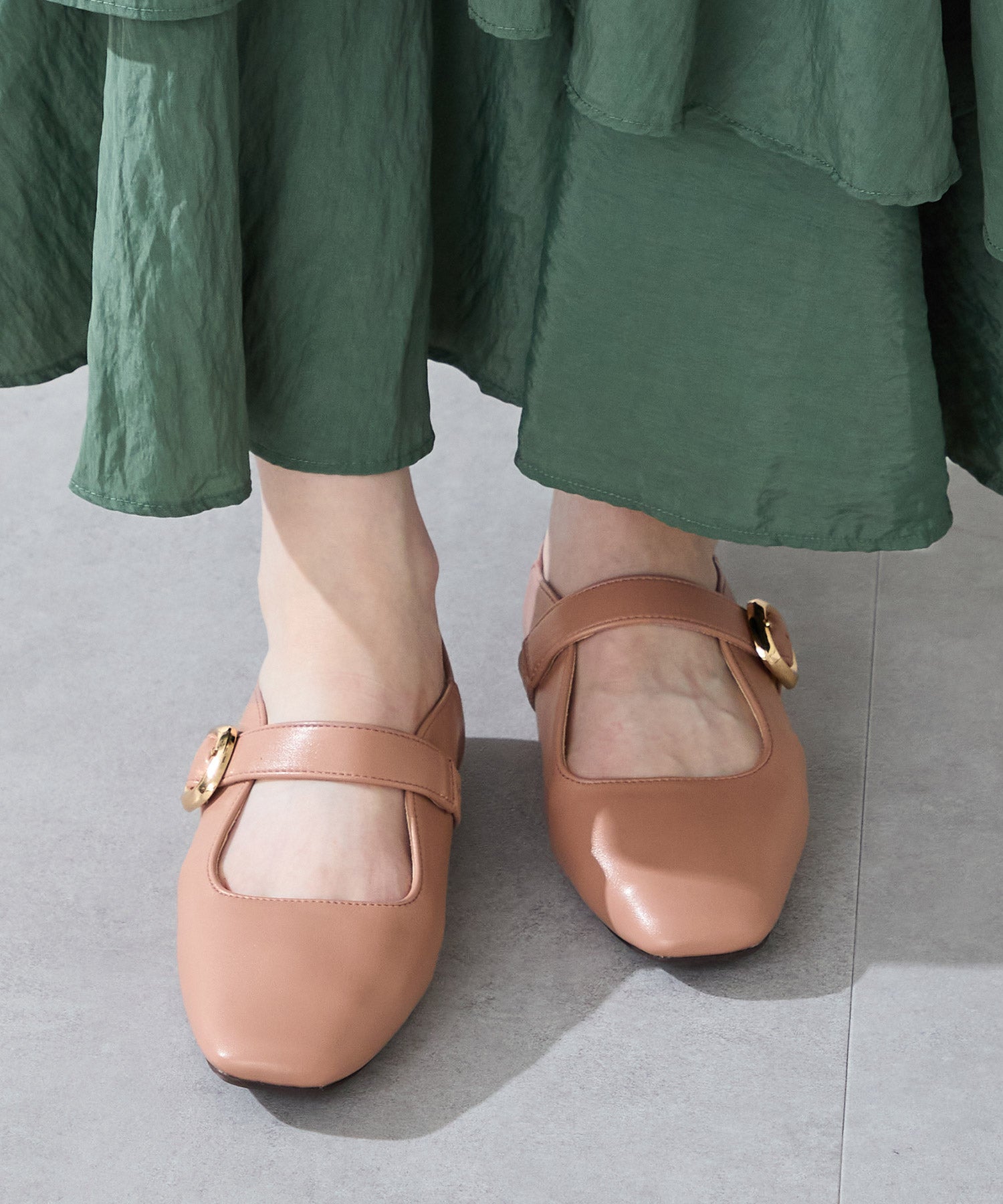 ほんのりスクエアカットしたラインでこなれ感を出しつつ、ゴールドの変形バックルでひとクセ加えたストラップパンプス。甲をホールドする太めのベルトに、つま先クッション入りで足を包み込むようなフィット感を実現。つま先から全体にかけて柔らかな素材に、踵を踏んでも履けるバブーシュデザインなど、心地よい履き心地でデイリー使いにぴったりの1足。