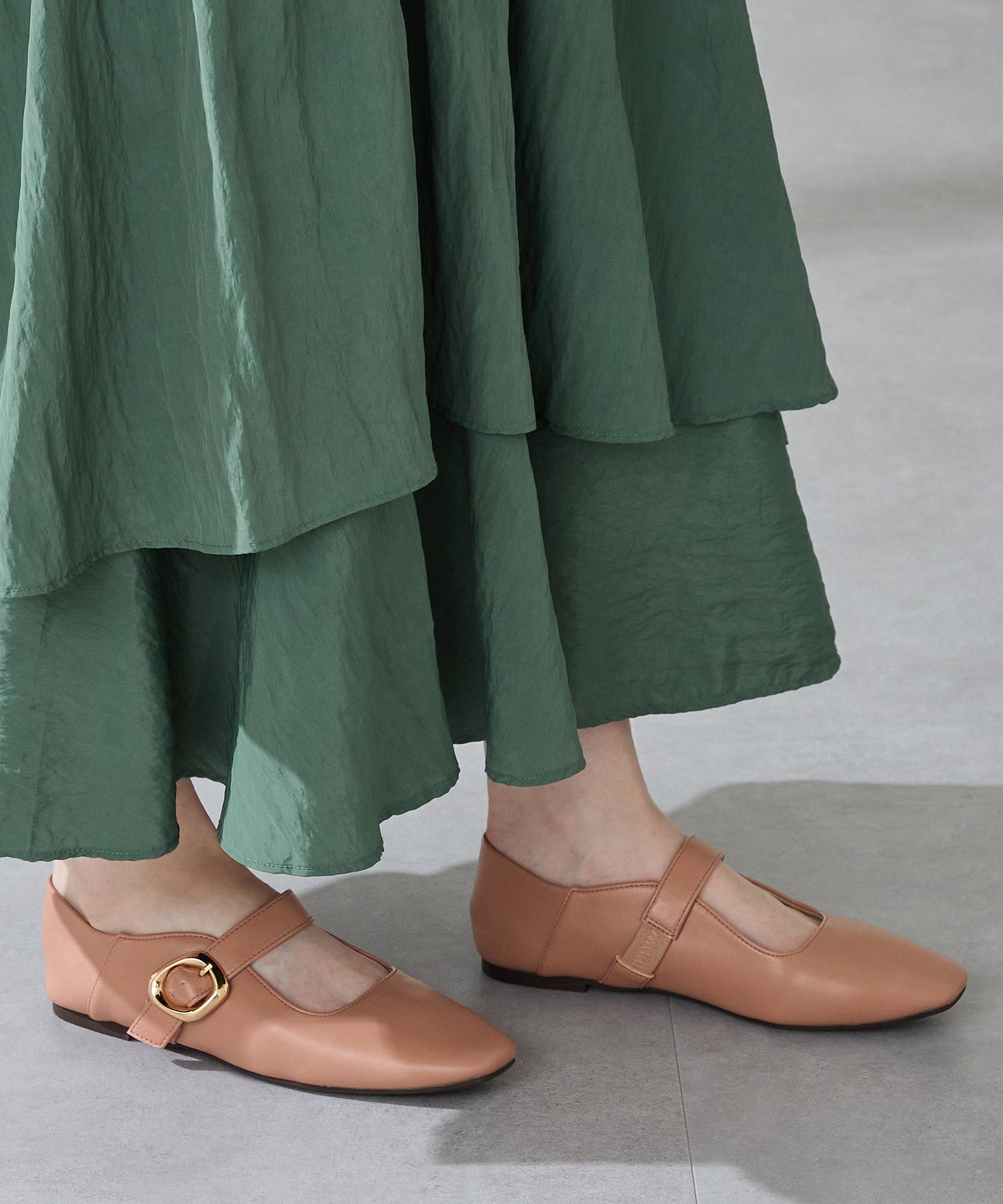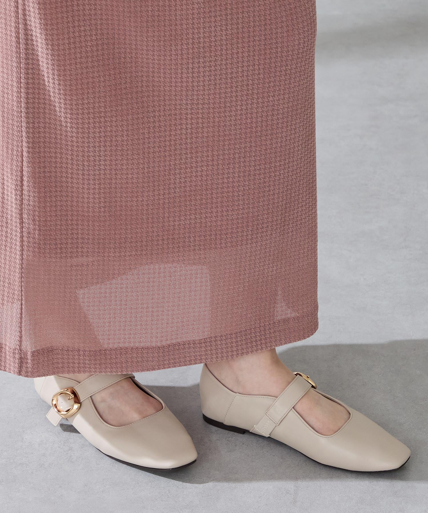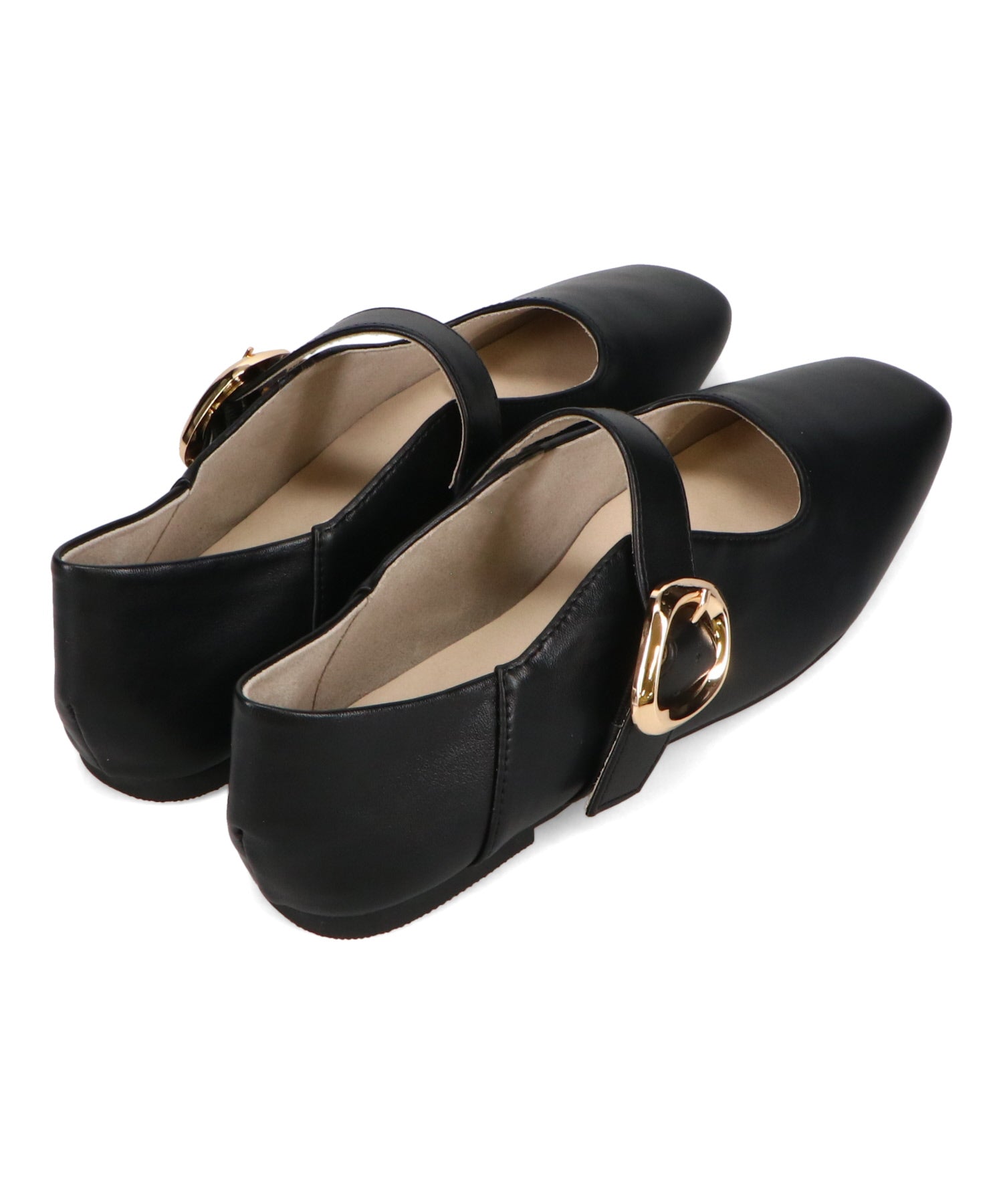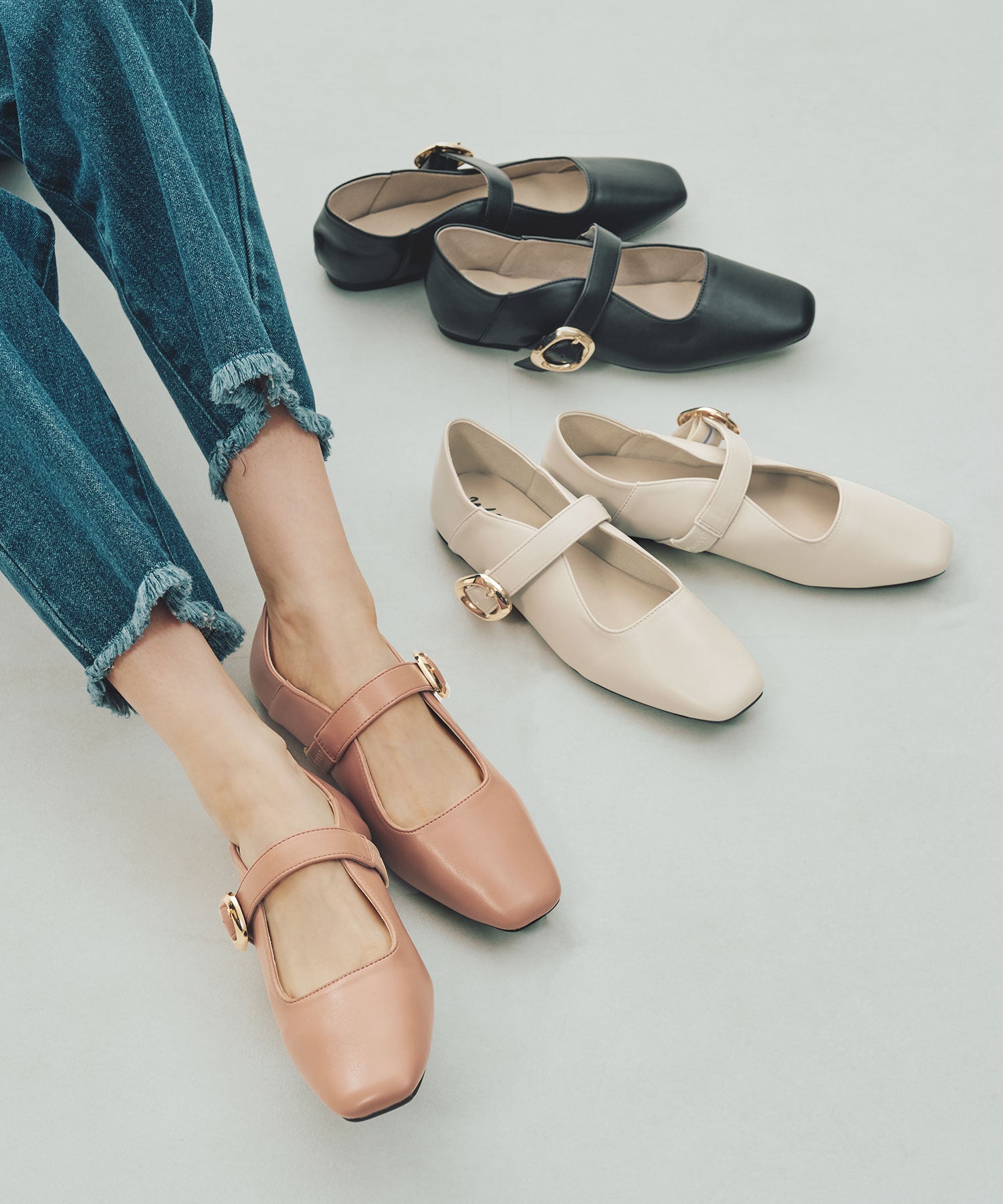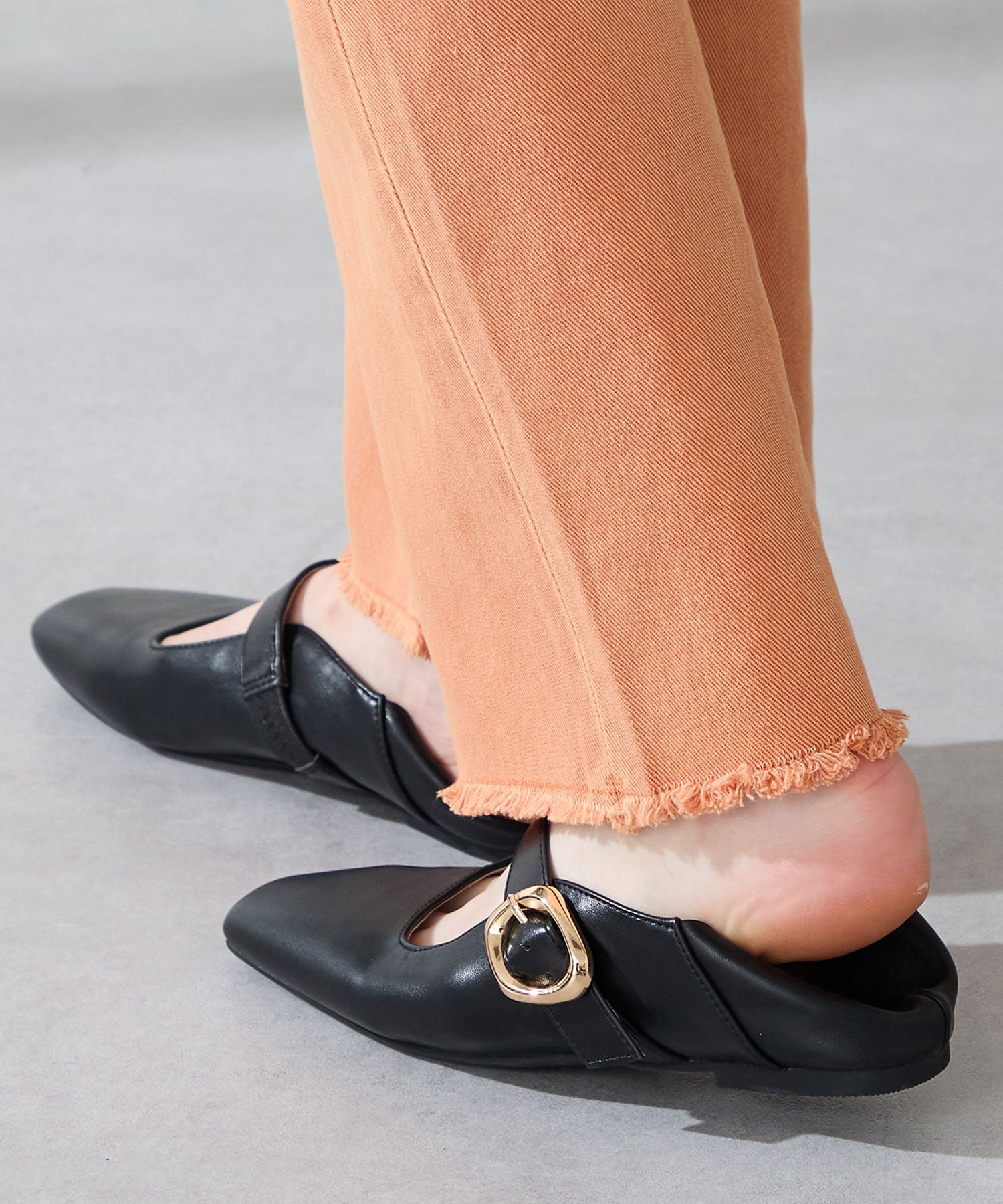 ほんのりスクエアカットしたラインでこなれ感を出しつつ、ゴールドの変形バックルでひとクセ加えたストラップパンプス。甲をホールドする太めのベルトに、つま先クッション入りで足を包み込むようなフィット感を実現。つま先から全体にかけて柔らかな素材に、踵を踏んでも履けるバブーシュデザインなど、心地よい履き心地でデイリー使いにぴったりの1足。