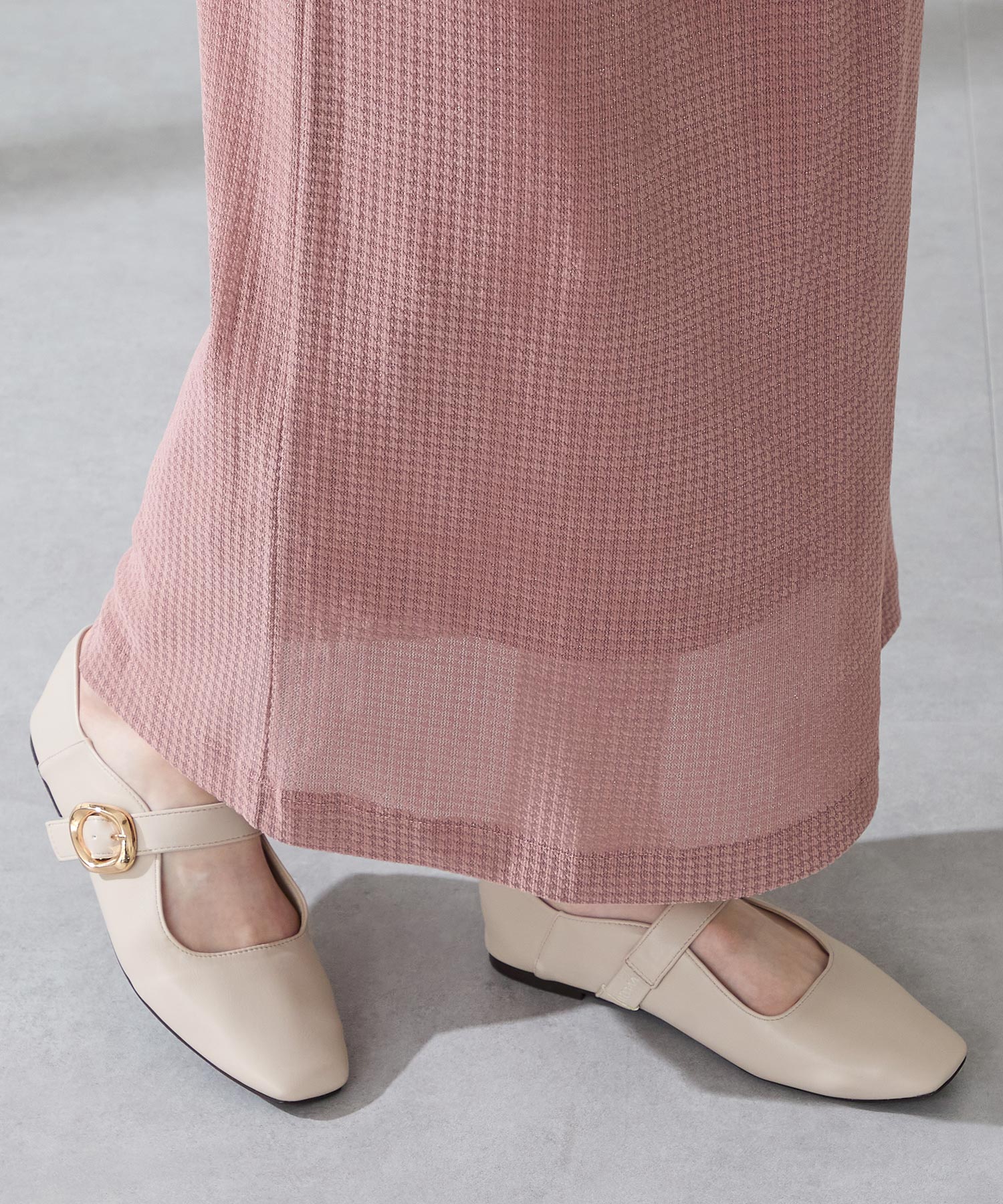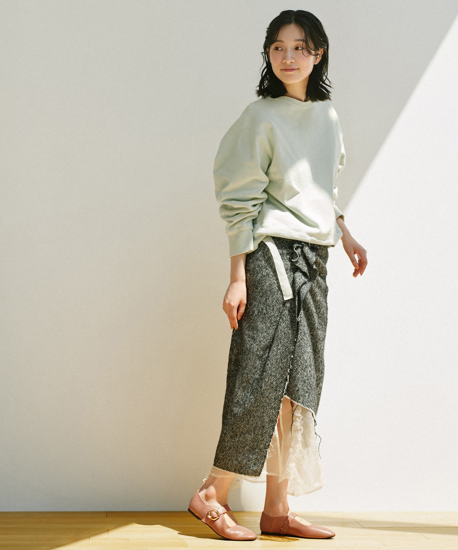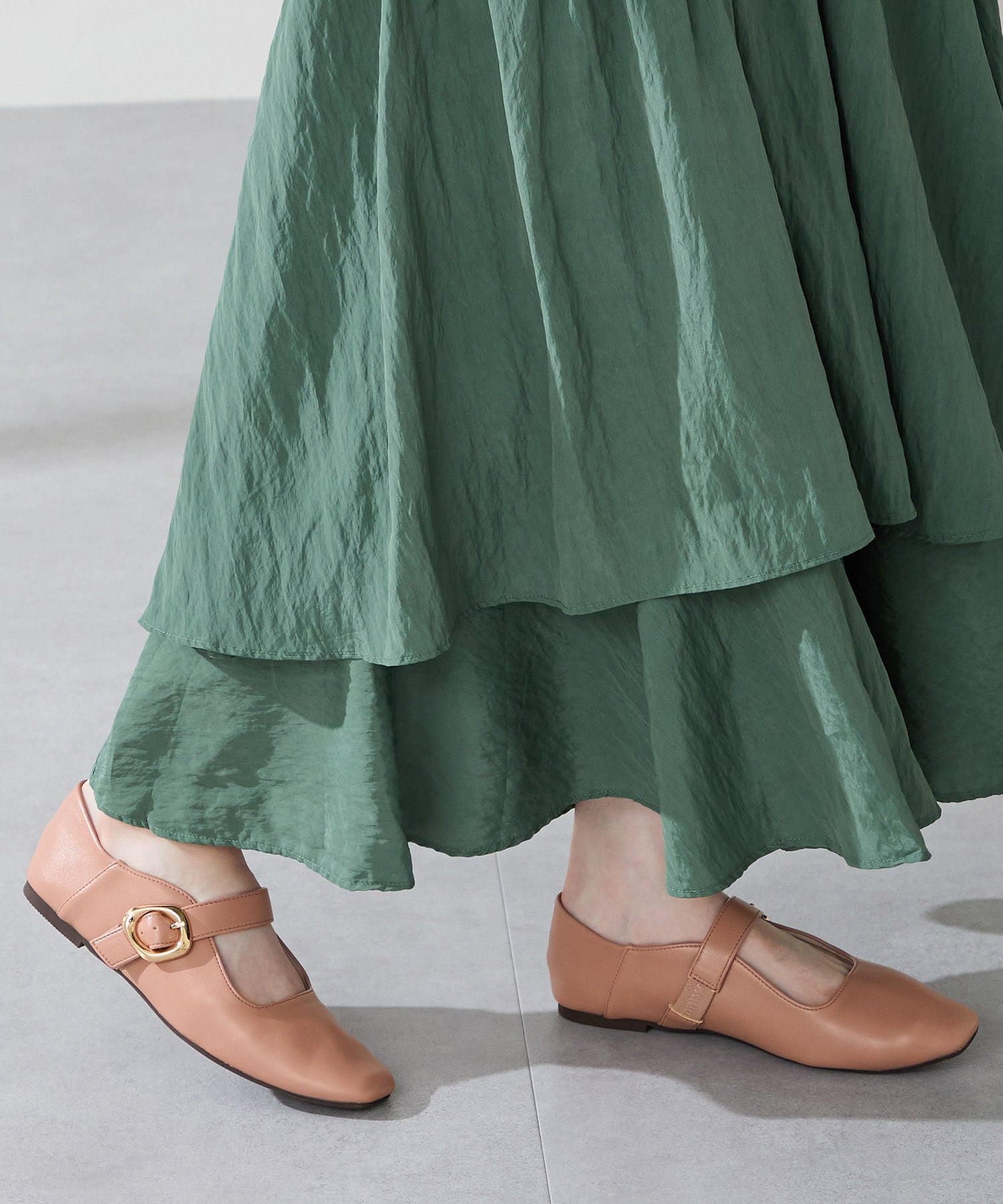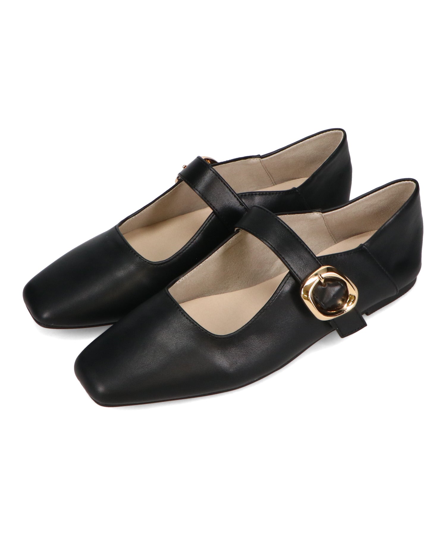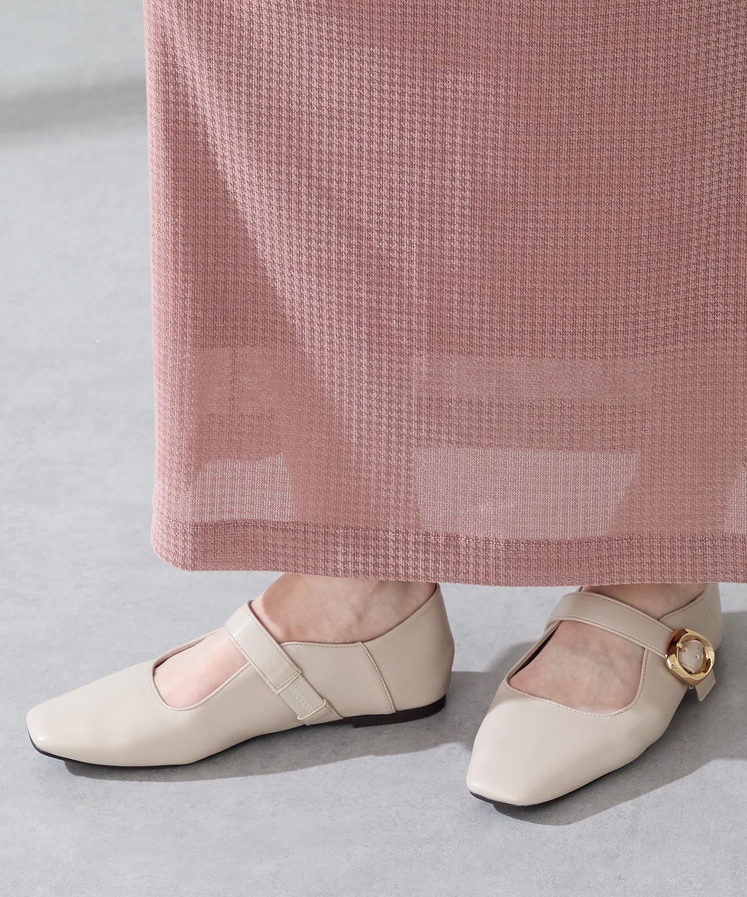 ほんのりスクエアカットしたラインでこなれ感を出しつつ、ゴールドの変形バックルでひとクセ加えたストラップパンプス。甲をホールドする太めのベルトに、つま先クッション入りで足を包み込むようなフィット感を実現。つま先から全体にかけて柔らかな素材に、踵を踏んでも履けるバブーシュデザインなど、心地よい履き心地でデイリー使いにぴったりの1足。