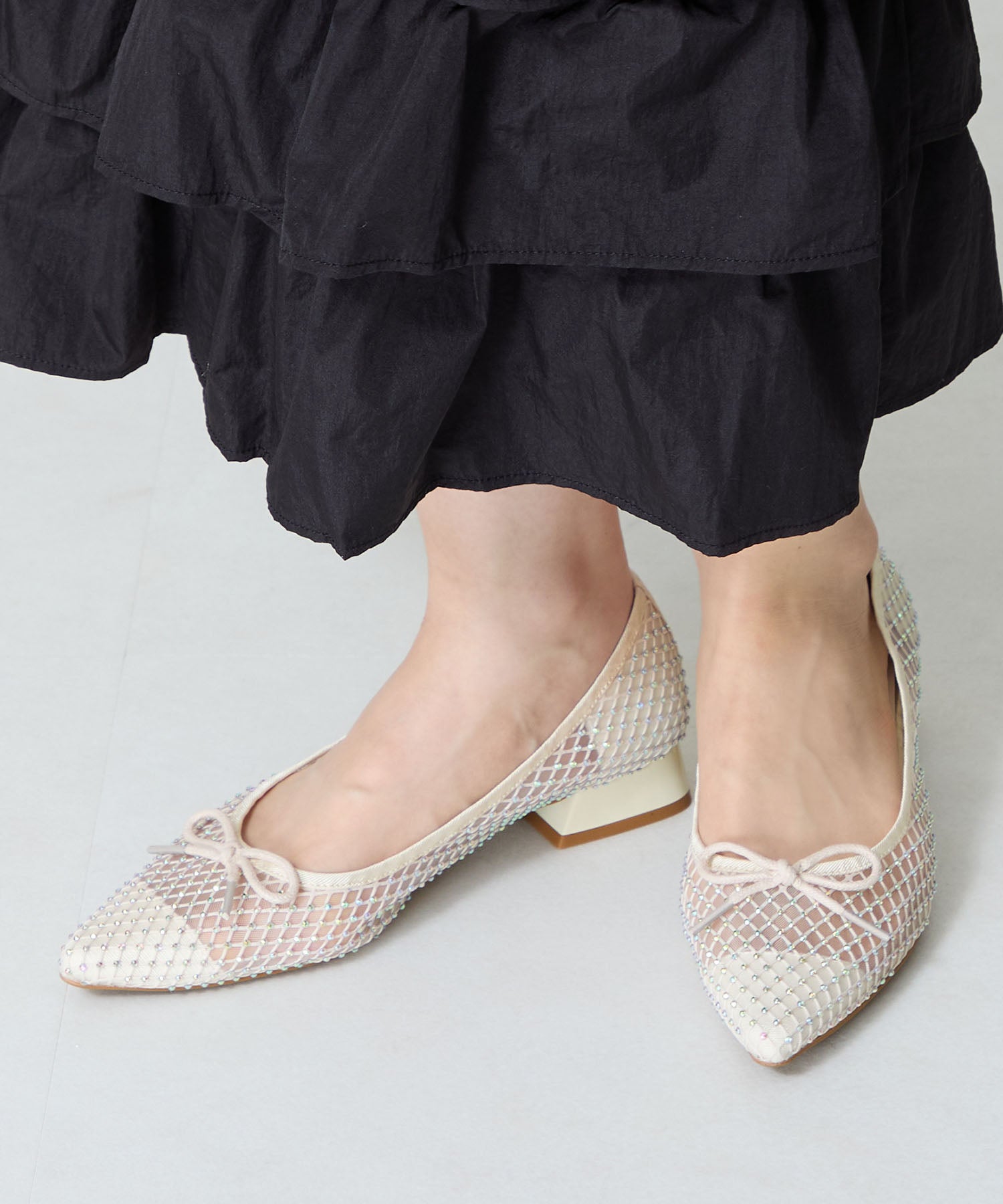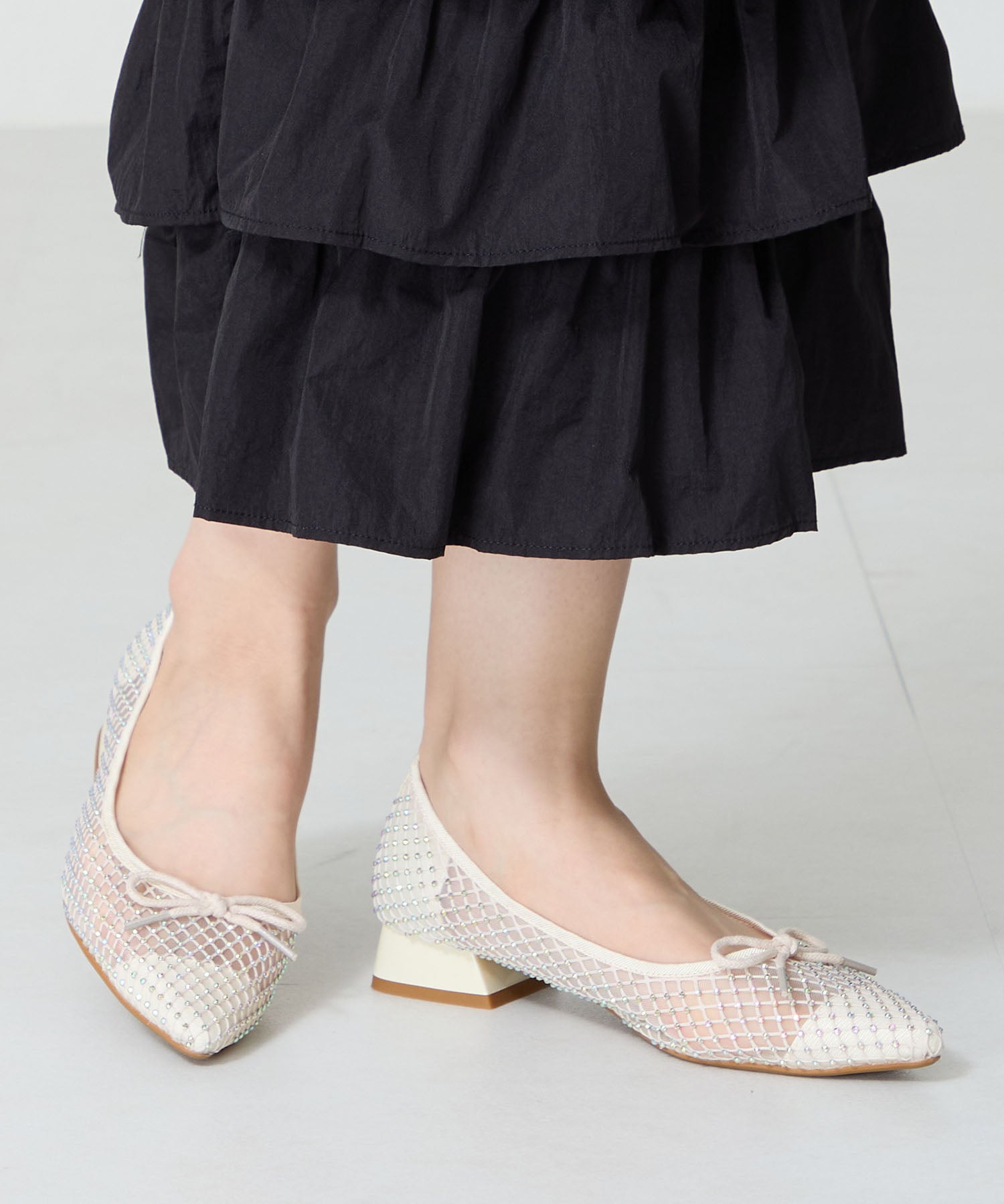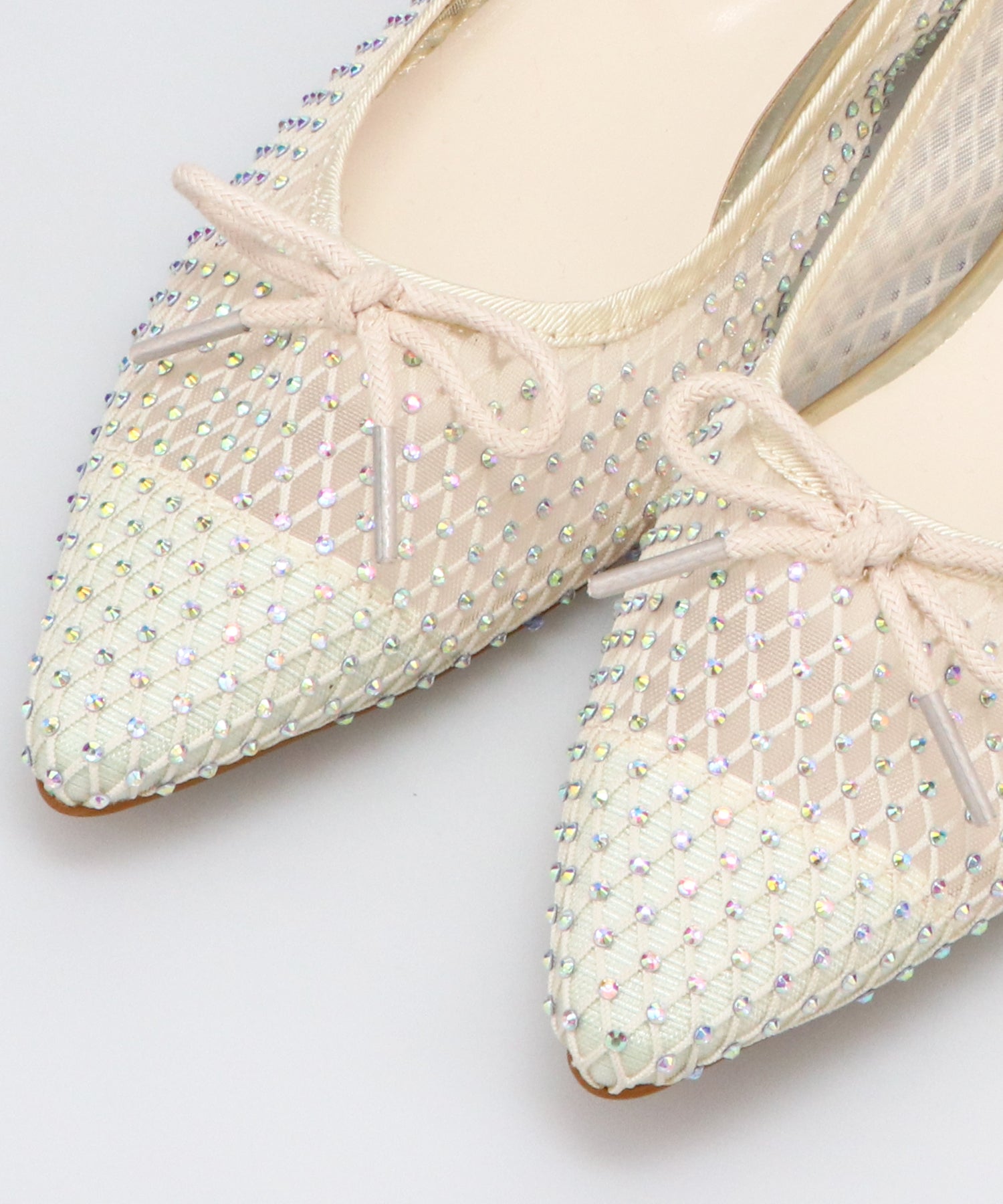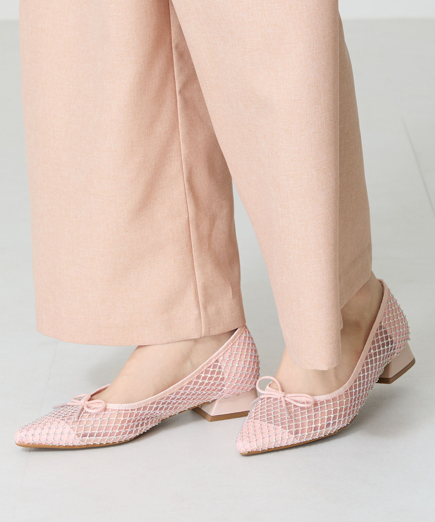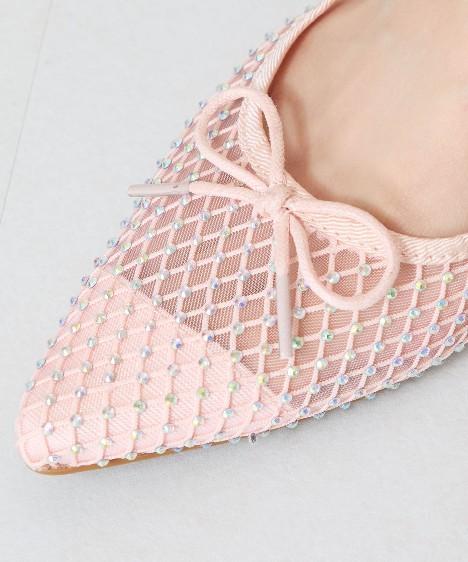 涼し気なチュール生地にメッシュを掛け合わせたデザインが今っぽいパンプスは、小粒のラインストーンを全体に配置して歩くたびにキラキラ輝く、履くだけで気分の上がる1足。華奢なリボンを付け全体的に柔らかく淡いカラーリングにすることでかわいらしい印象をプラスし、シアーの透け感がいつものコーデにも馴染みやすいアイテム。