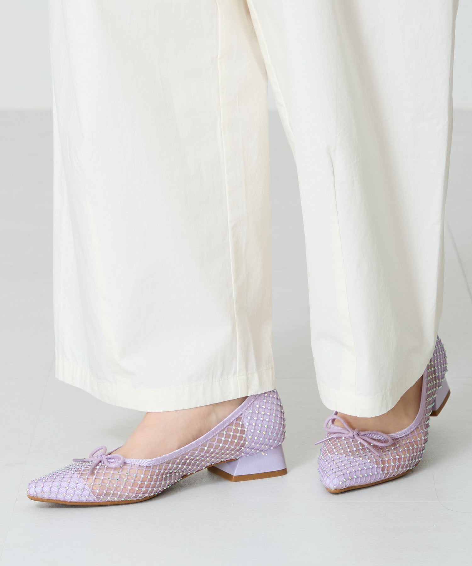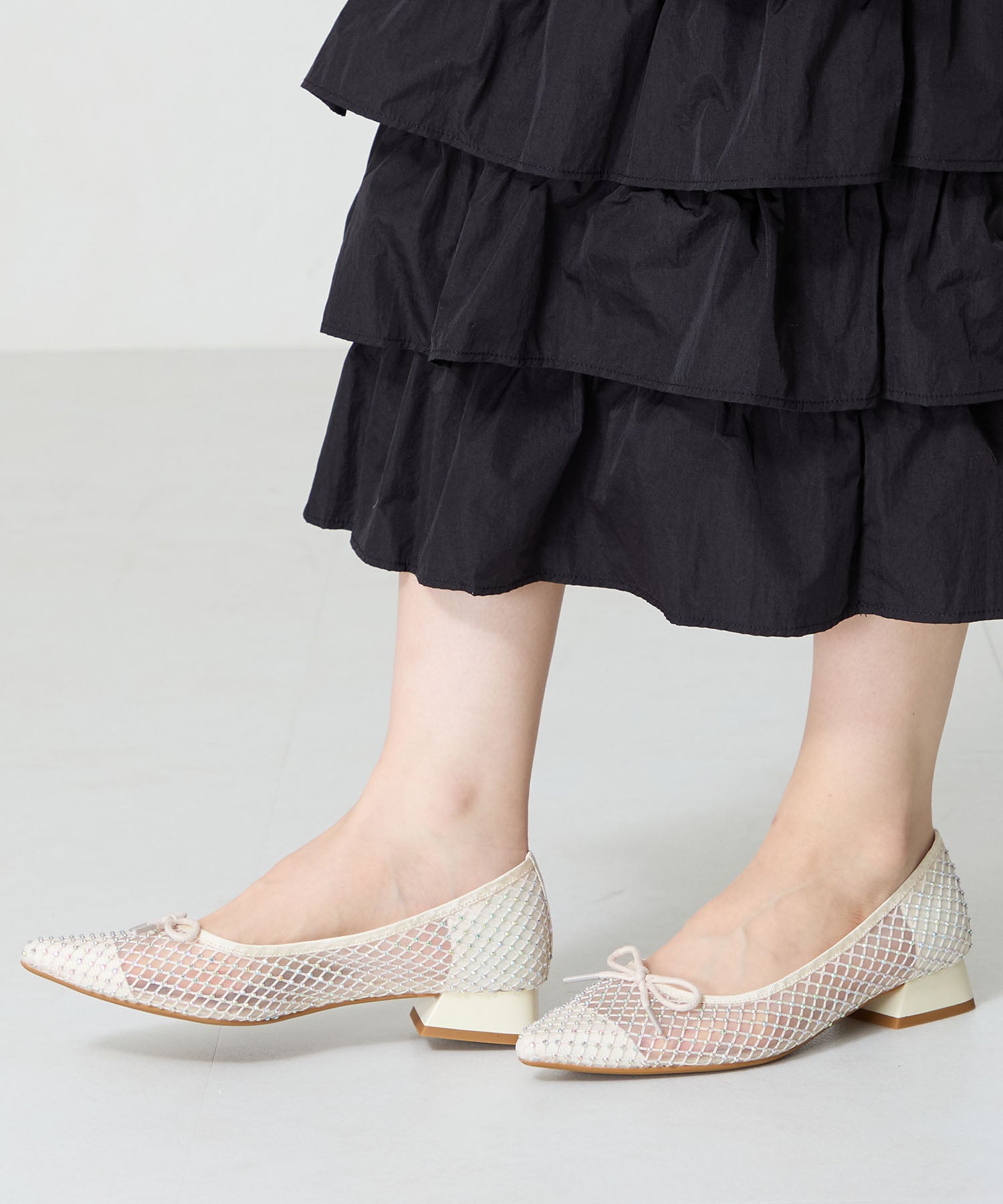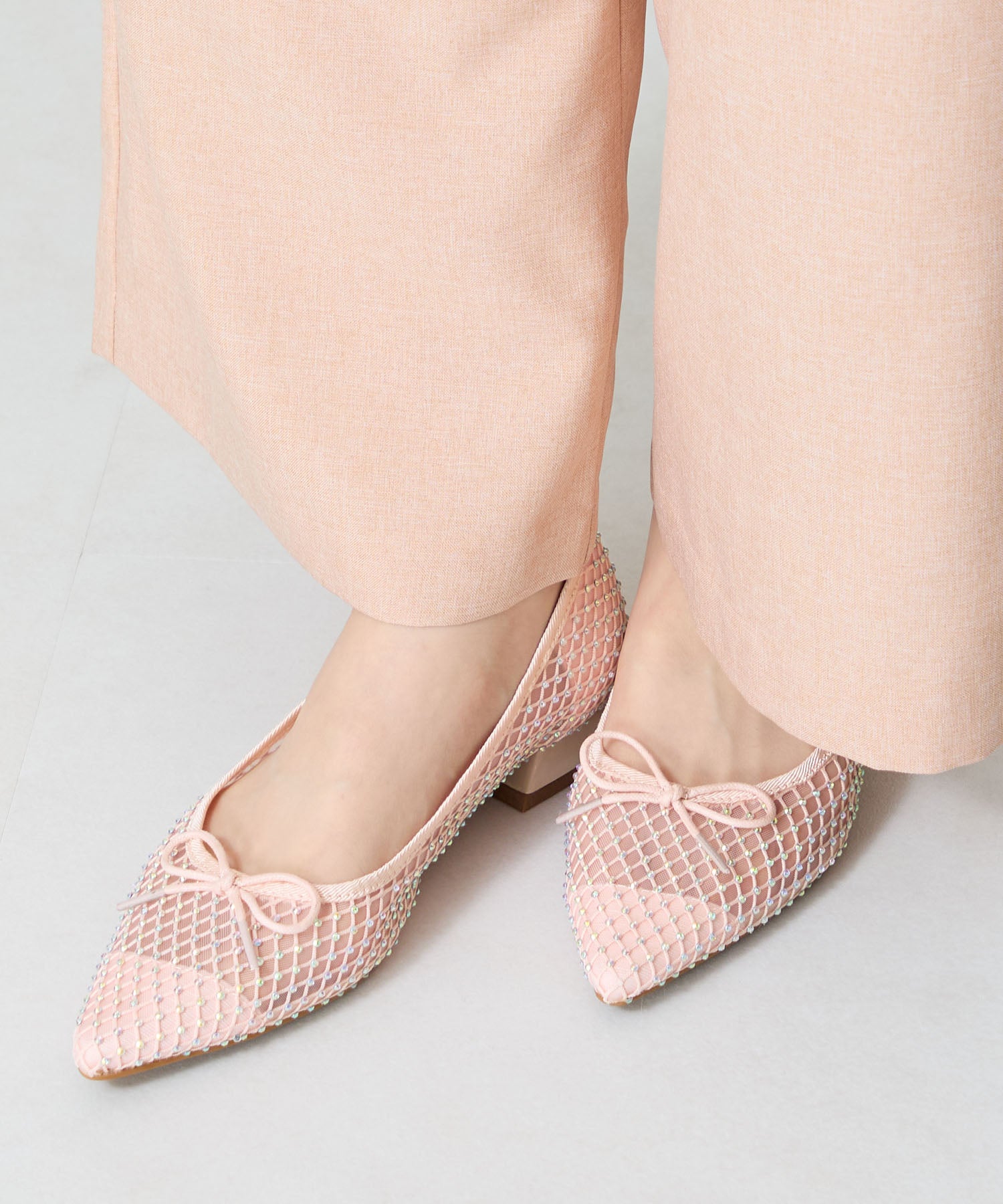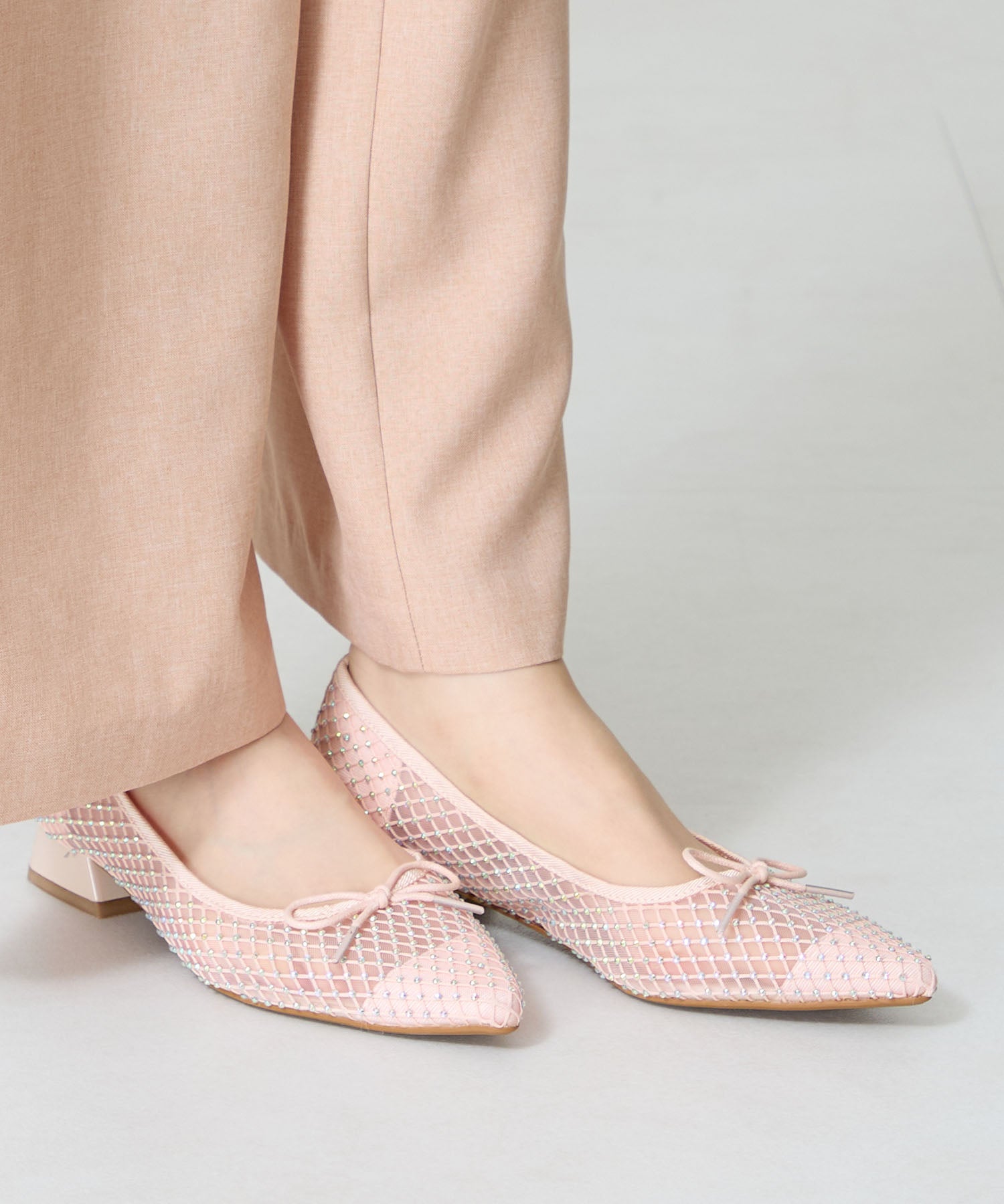 涼し気なチュール生地にメッシュを掛け合わせたデザインが今っぽいパンプスは、小粒のラインストーンを全体に配置して歩くたびにキラキラ輝く、履くだけで気分の上がる1足。華奢なリボンを付け全体的に柔らかく淡いカラーリングにすることでかわいらしい印象をプラスし、シアーの透け感がいつものコーデにも馴染みやすいアイテム。