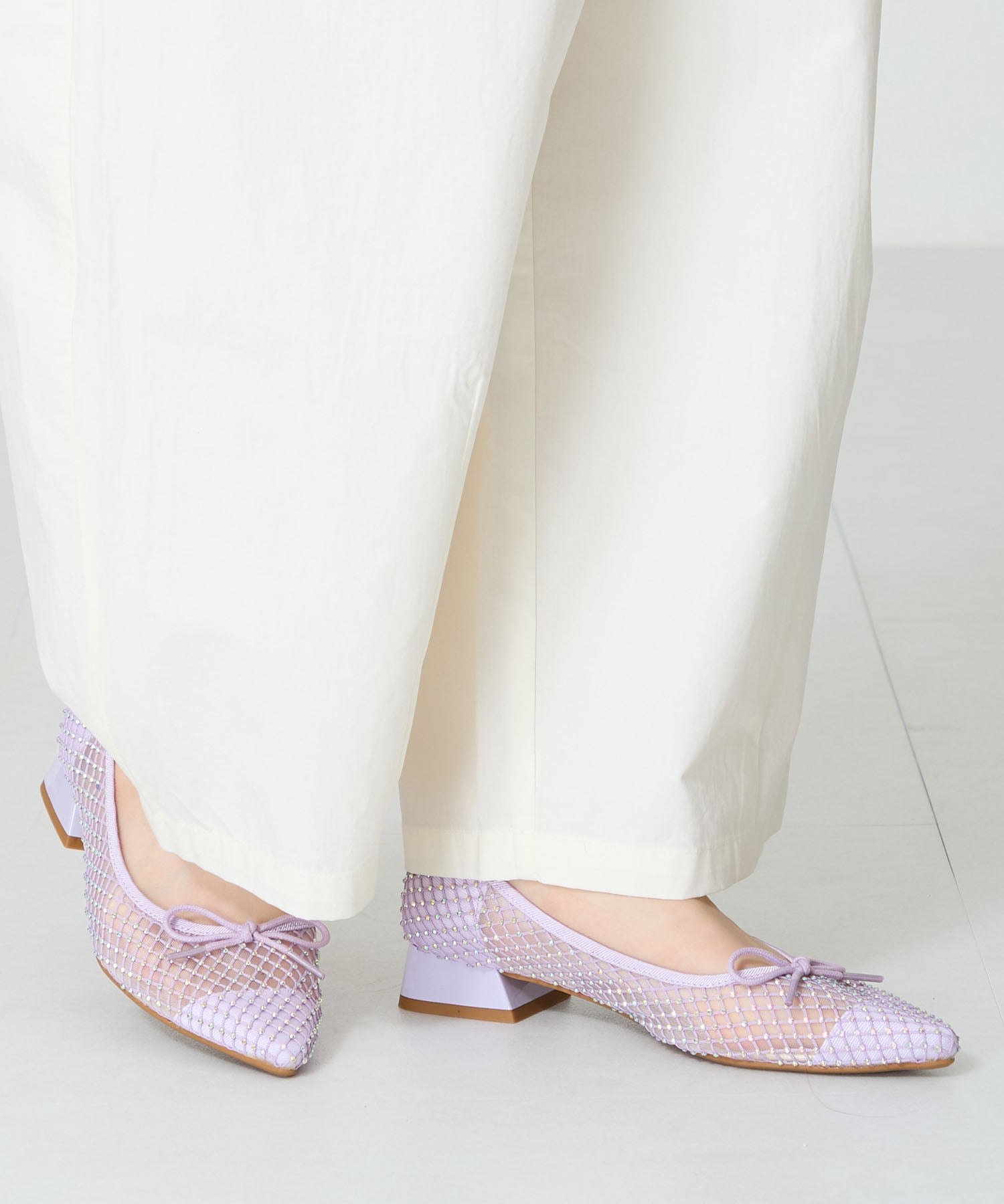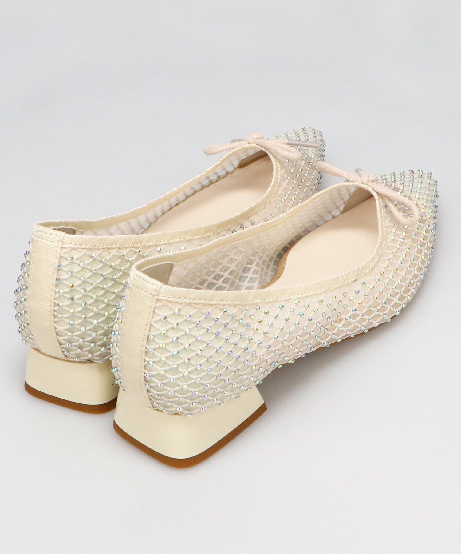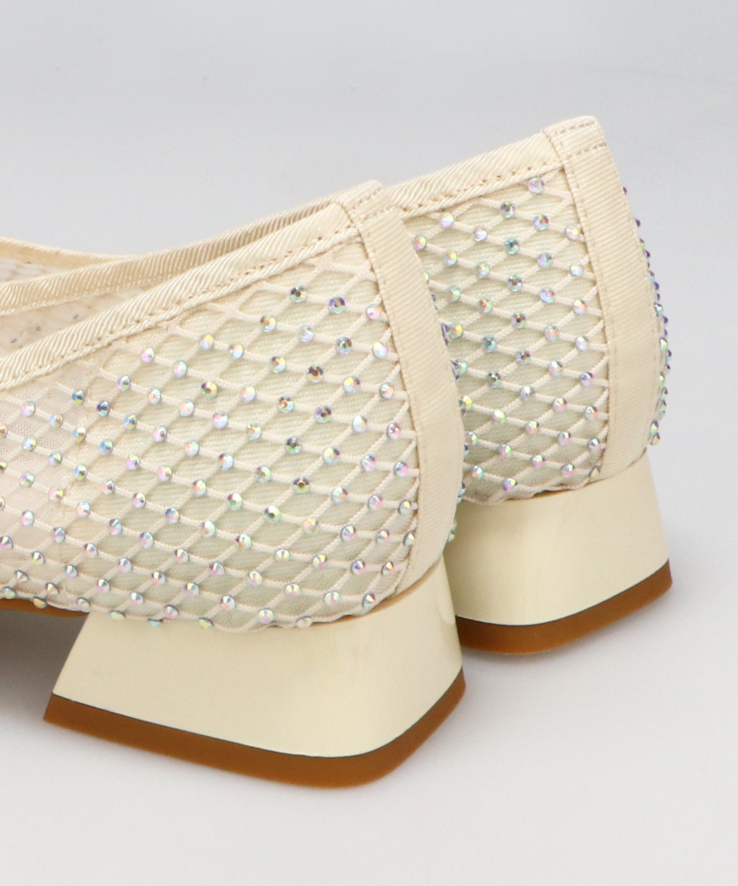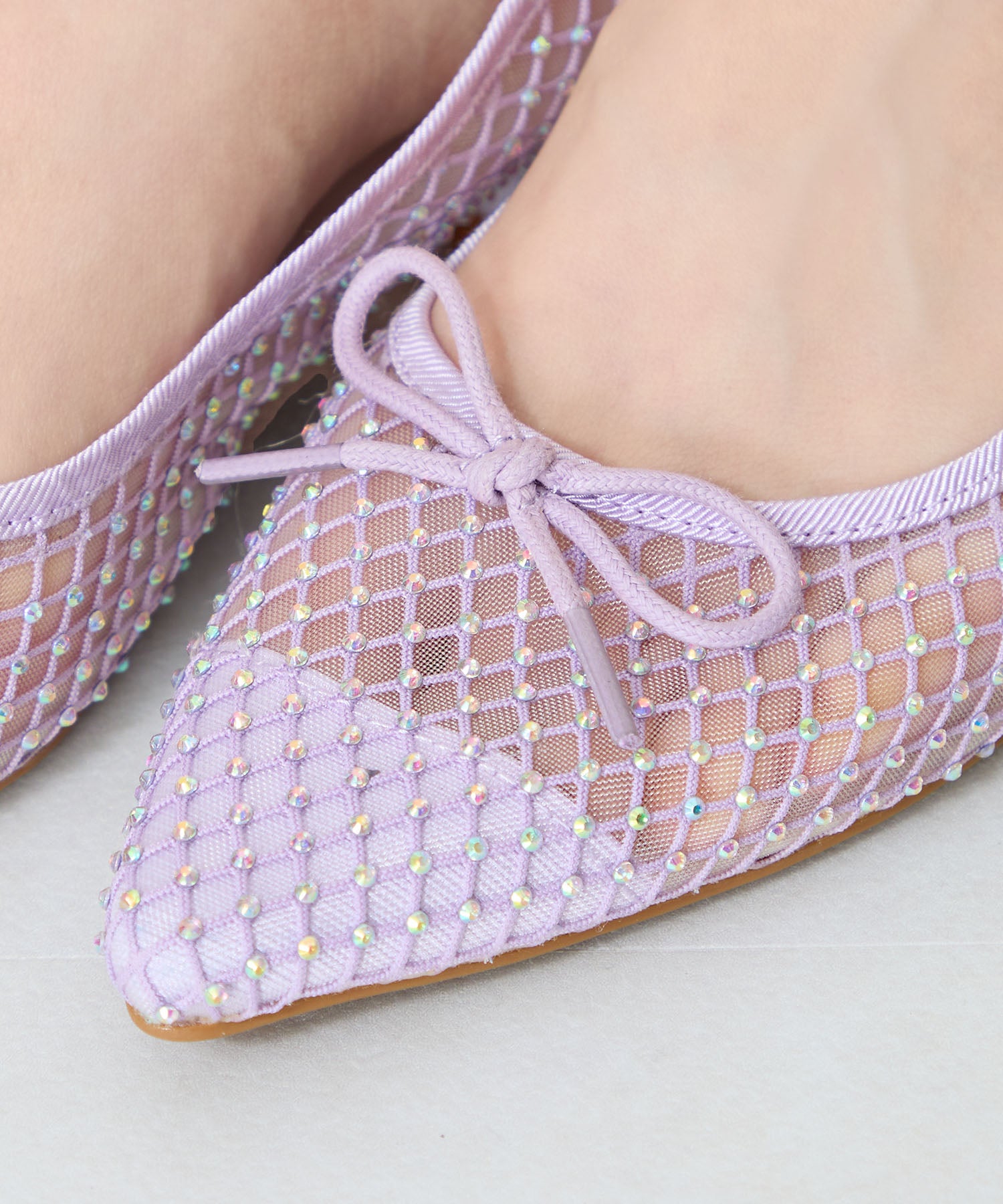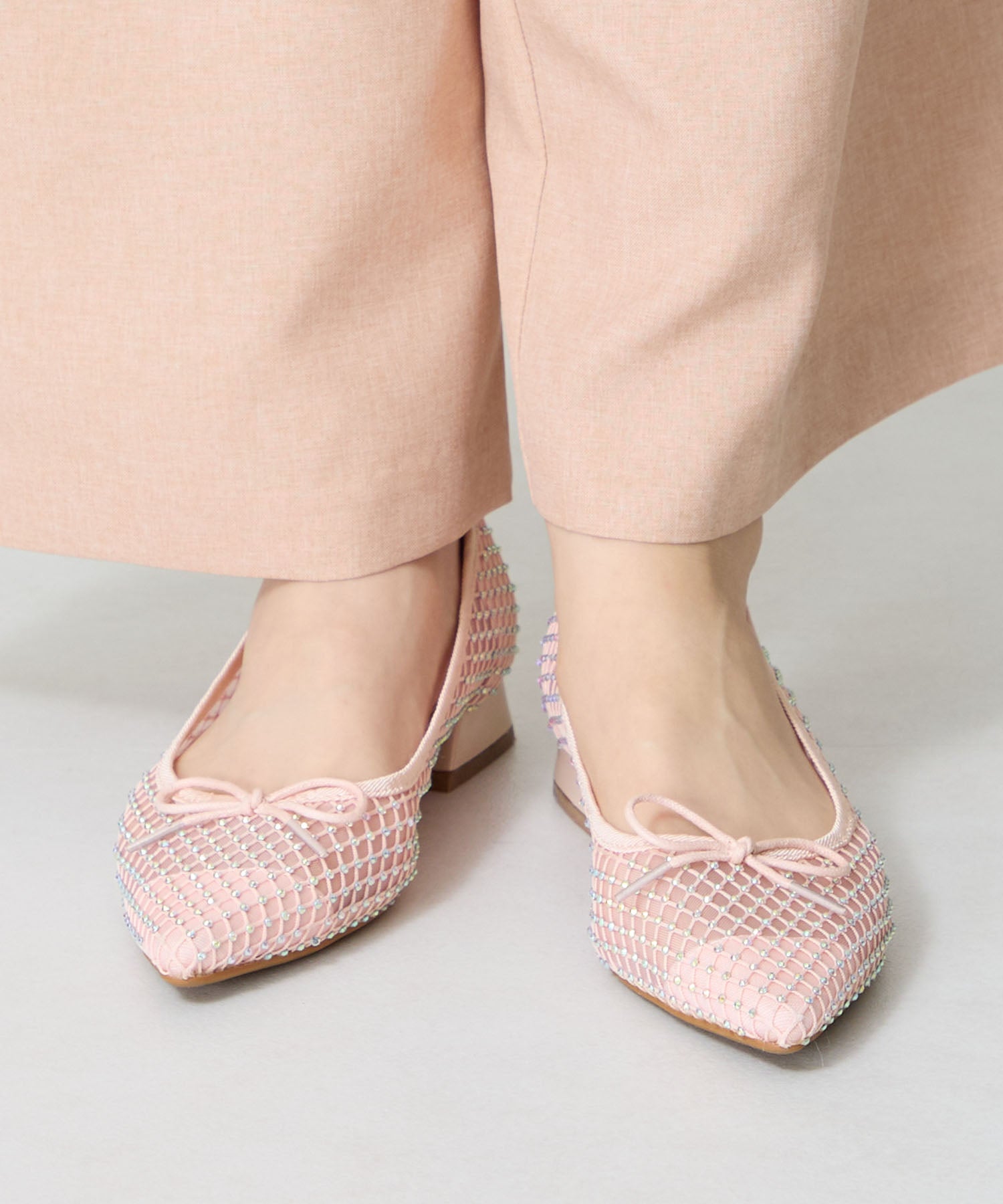 涼し気なチュール生地にメッシュを掛け合わせたデザインが今っぽいパンプスは、小粒のラインストーンを全体に配置して歩くたびにキラキラ輝く、履くだけで気分の上がる1足。華奢なリボンを付け全体的に柔らかく淡いカラーリングにすることでかわいらしい印象をプラスし、シアーの透け感がいつものコーデにも馴染みやすいアイテム。