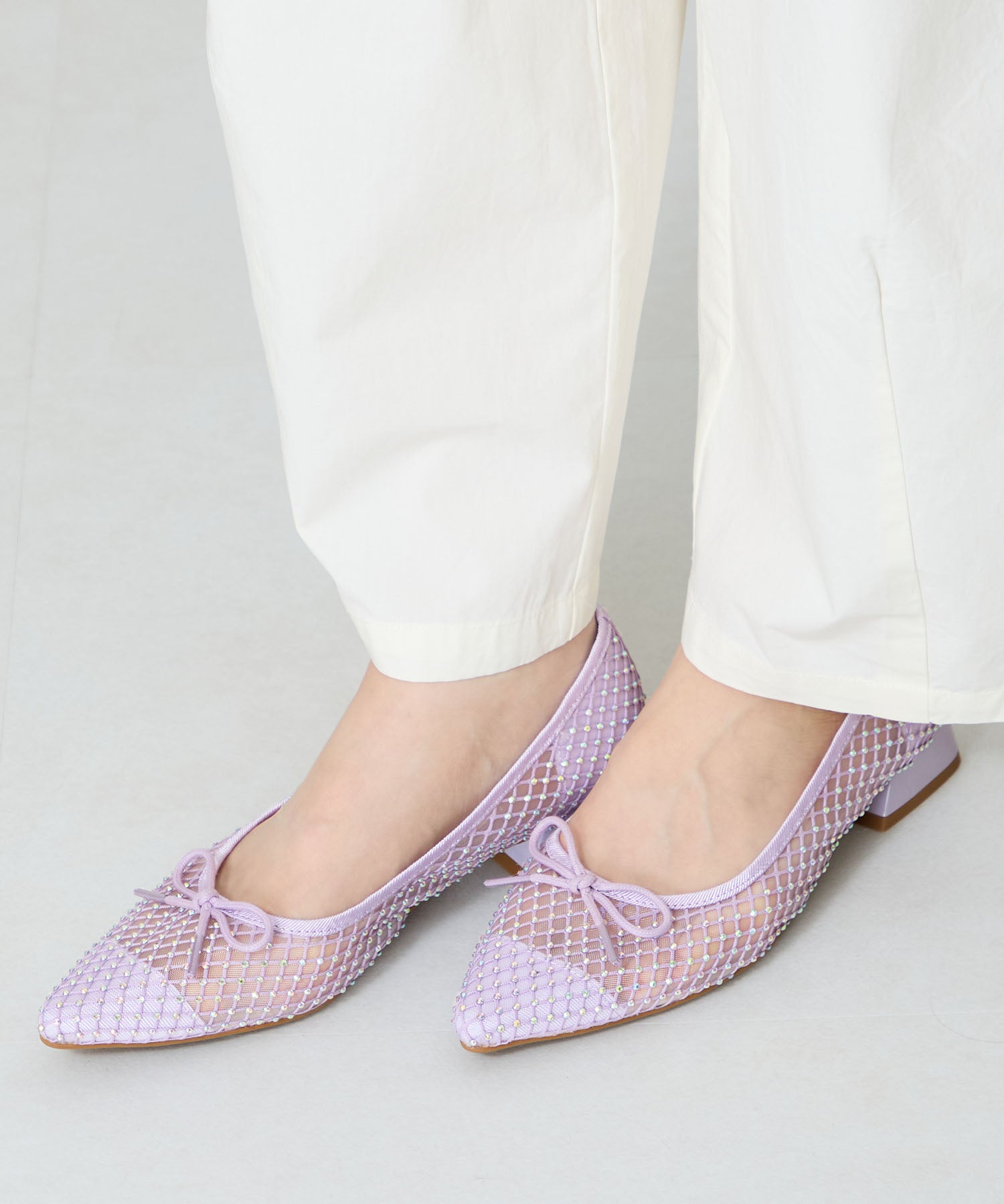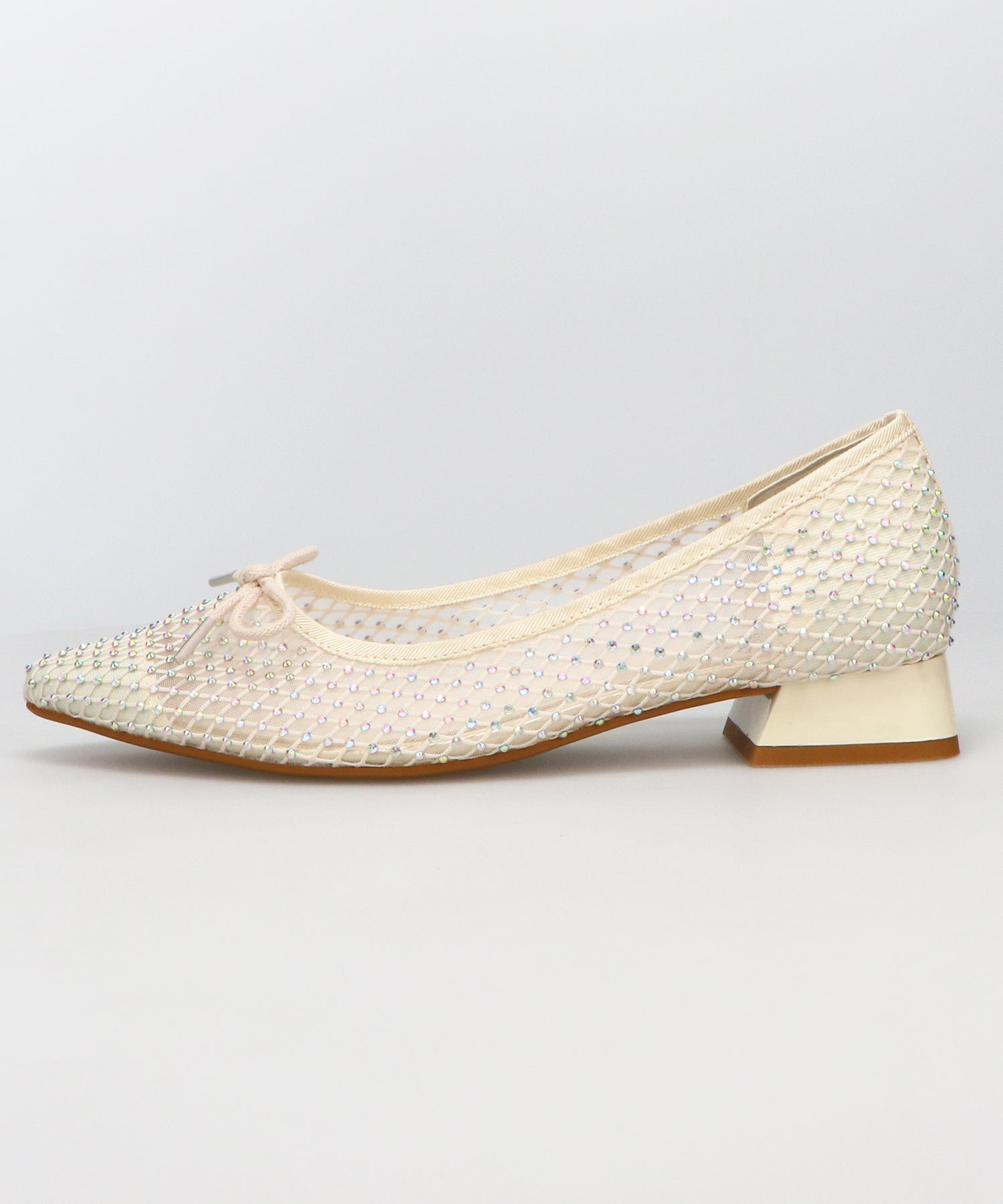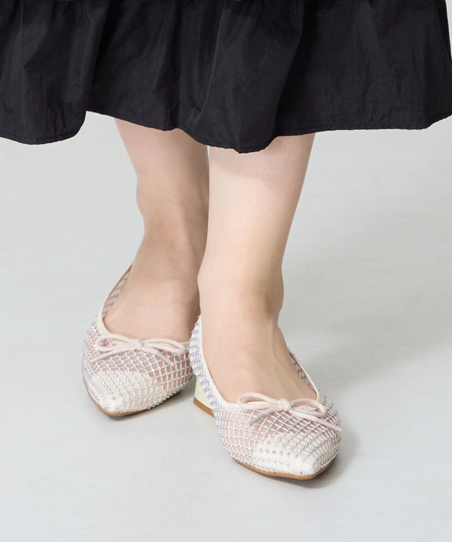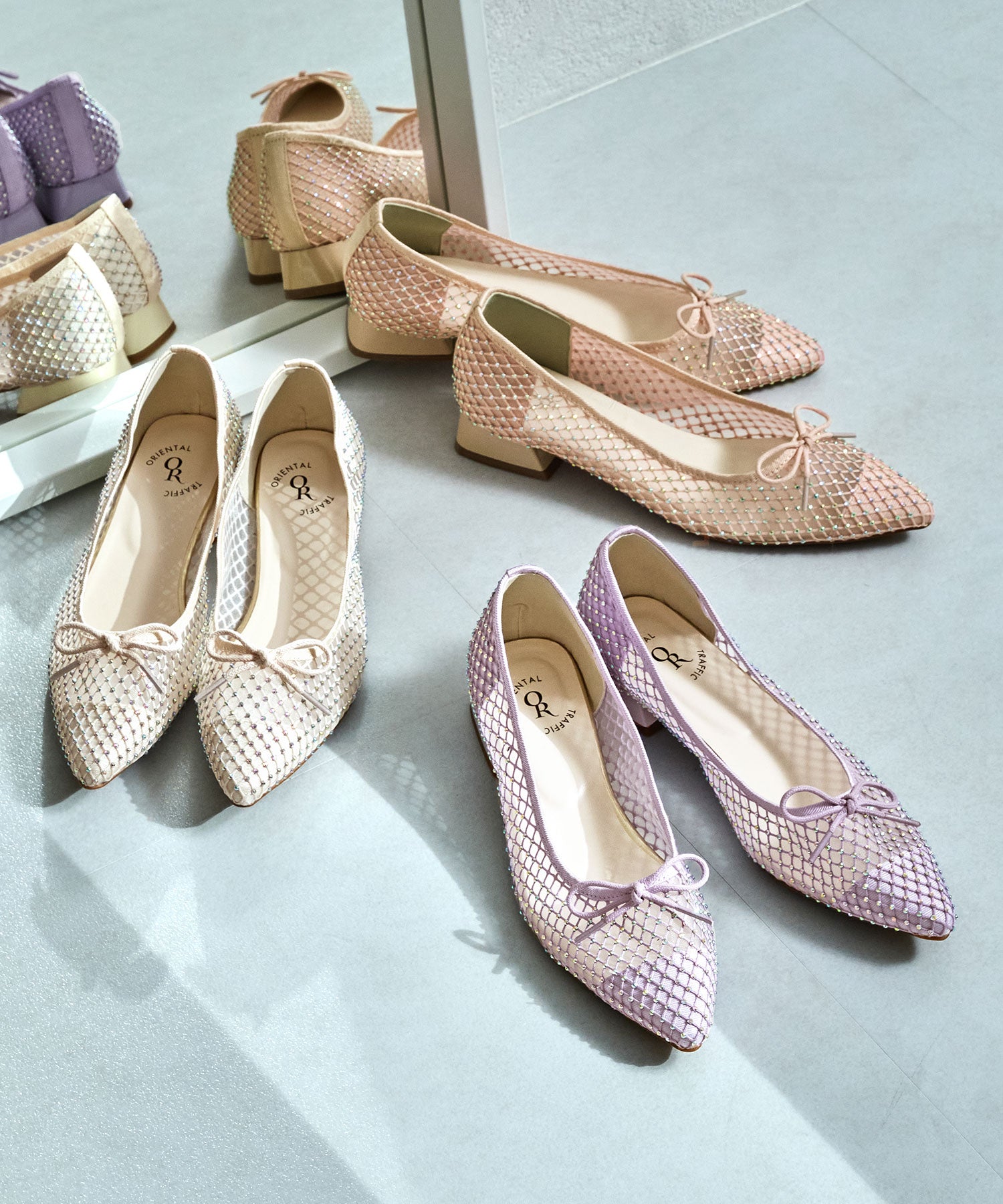 涼し気なチュール生地にメッシュを掛け合わせたデザインが今っぽいパンプスは、小粒のラインストーンを全体に配置して歩くたびにキラキラ輝く、履くだけで気分の上がる1足。華奢なリボンを付け全体的に柔らかく淡いカラーリングにすることでかわいらしい印象をプラスし、シアーの透け感がいつものコーデにも馴染みやすいアイテム。