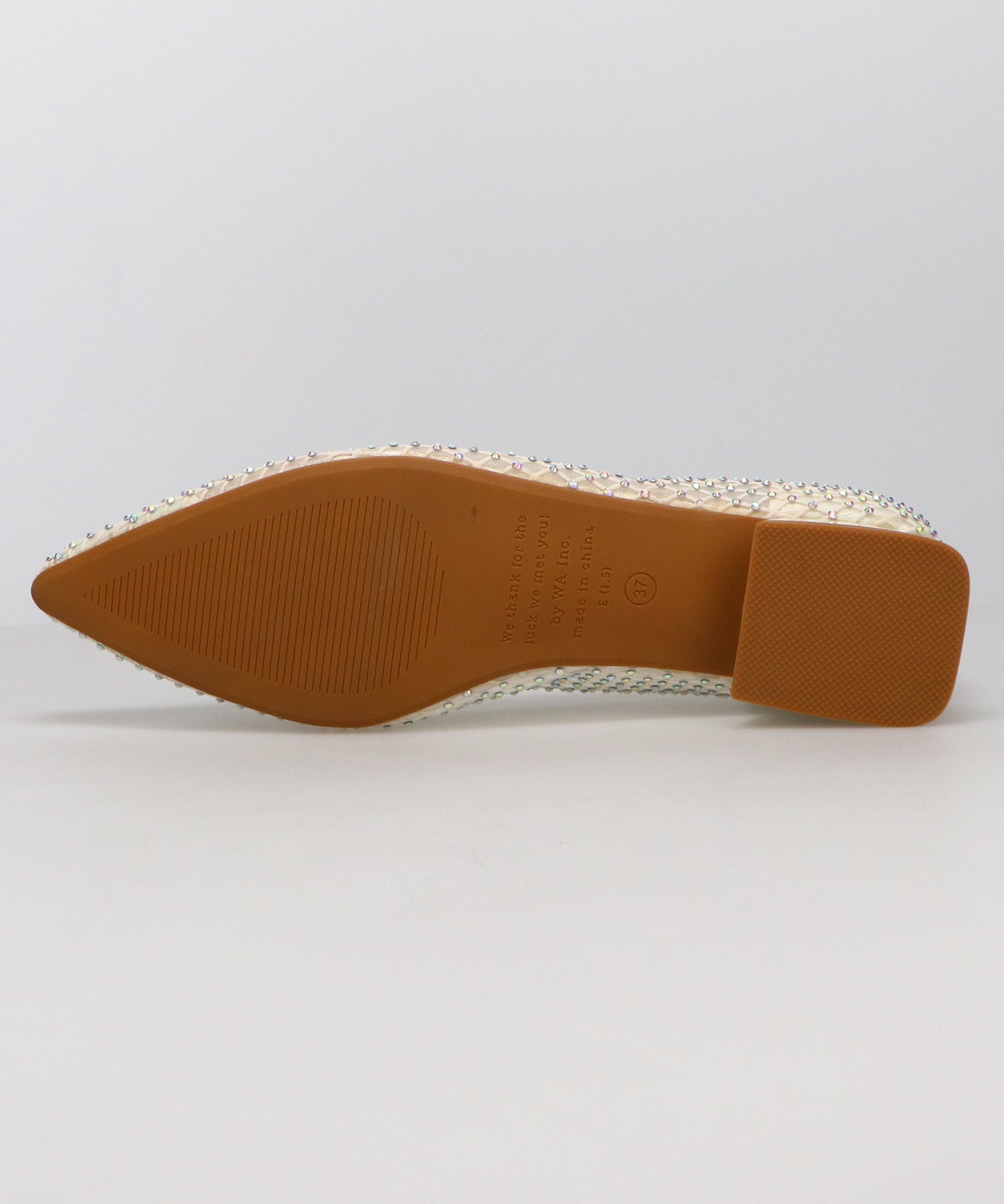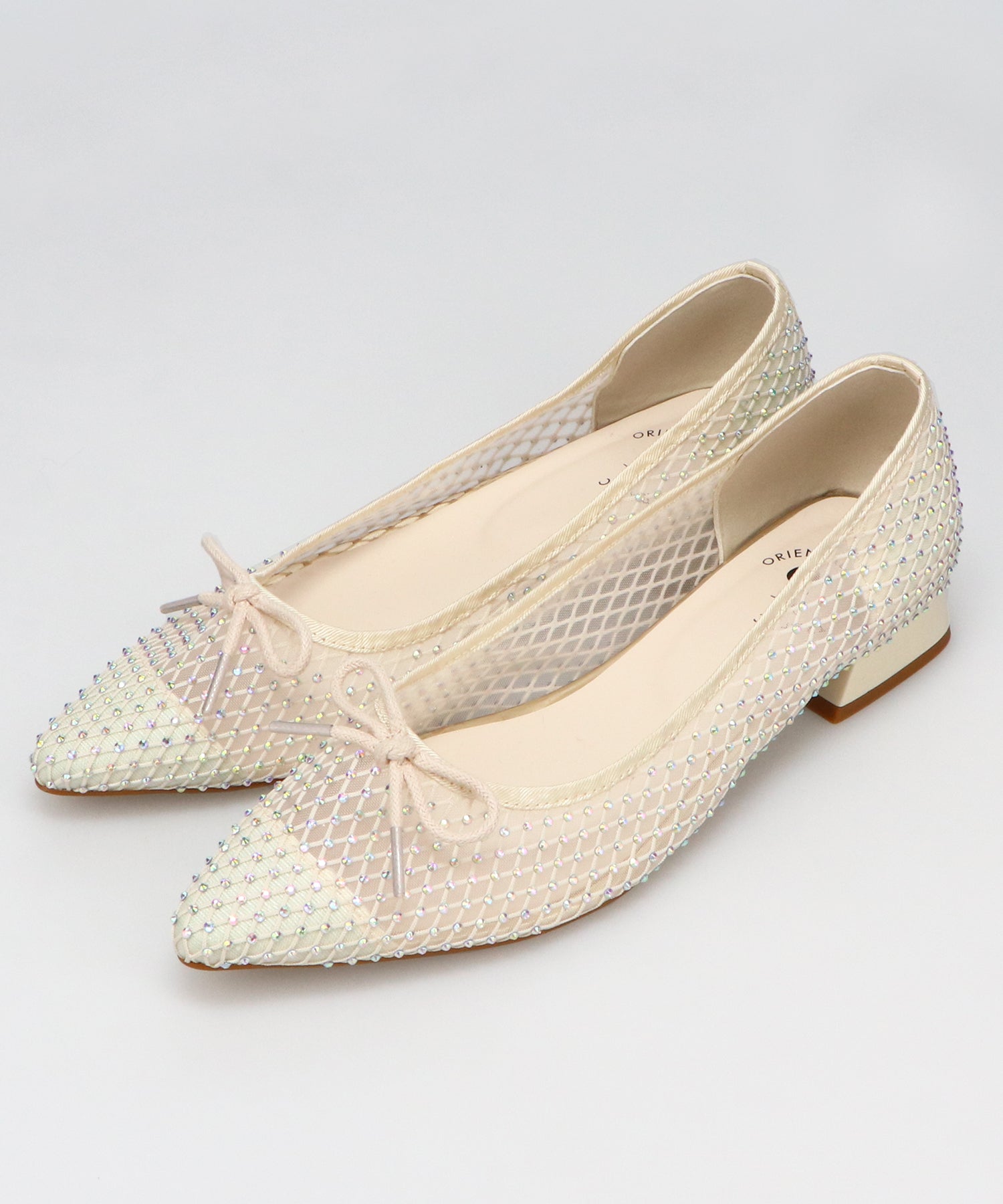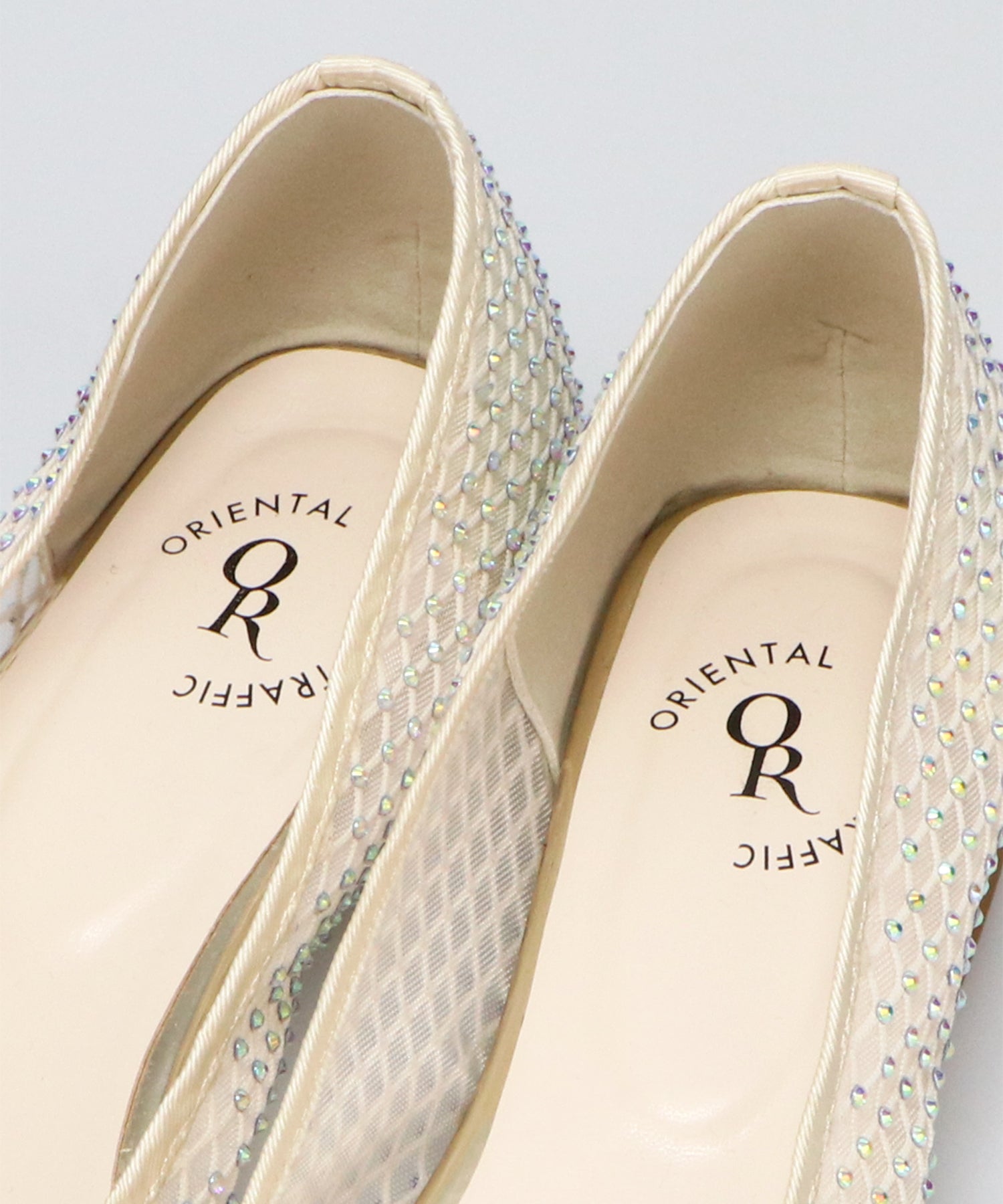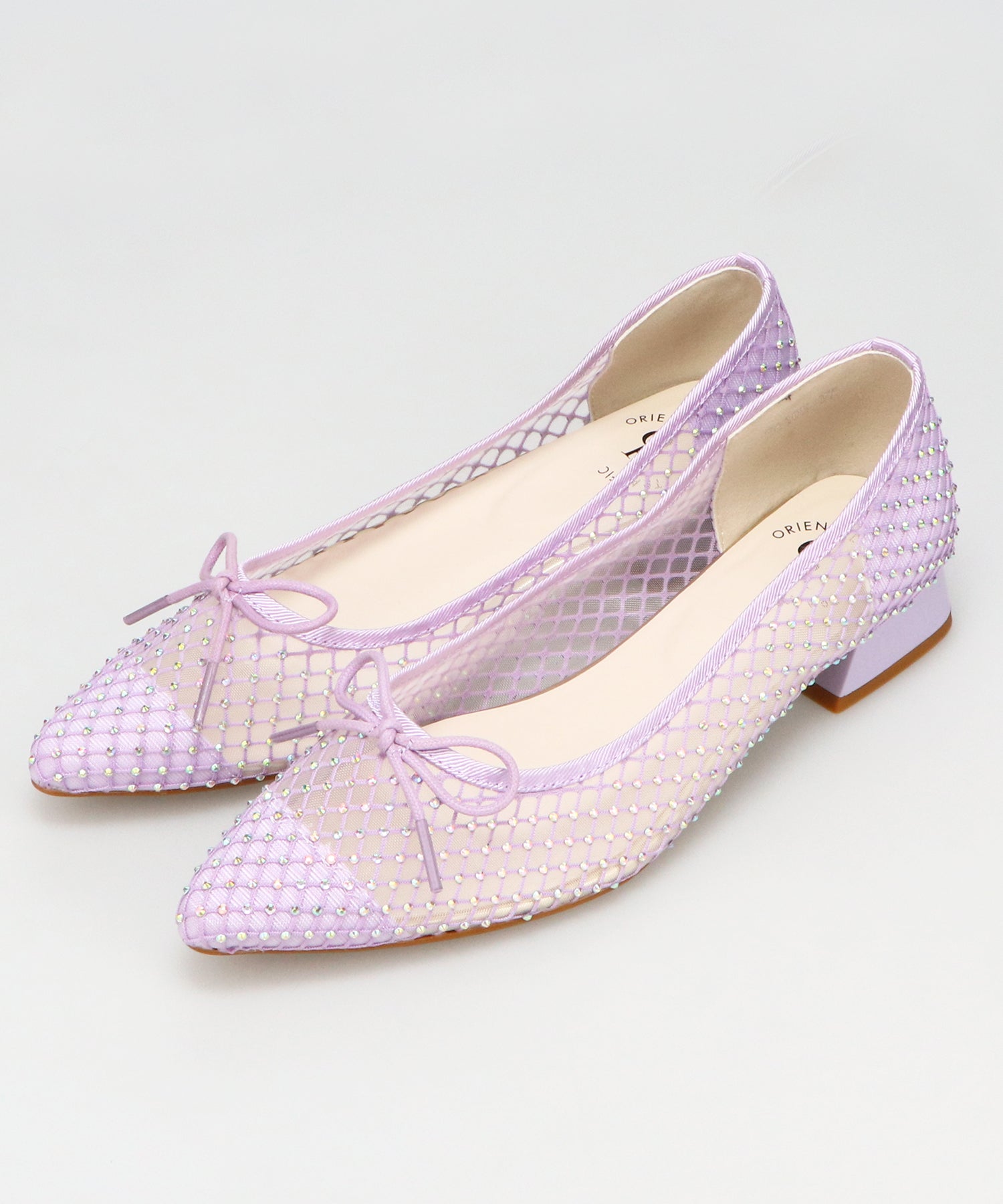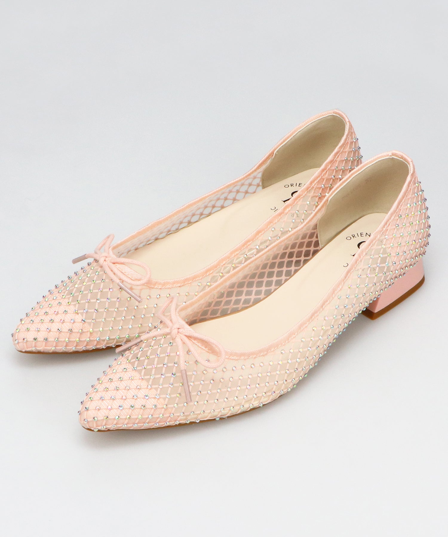 涼し気なチュール生地にメッシュを掛け合わせたデザインが今っぽいパンプスは、小粒のラインストーンを全体に配置して歩くたびにキラキラ輝く、履くだけで気分の上がる1足。華奢なリボンを付け全体的に柔らかく淡いカラーリングにすることでかわいらしい印象をプラスし、シアーの透け感がいつものコーデにも馴染みやすいアイテム。