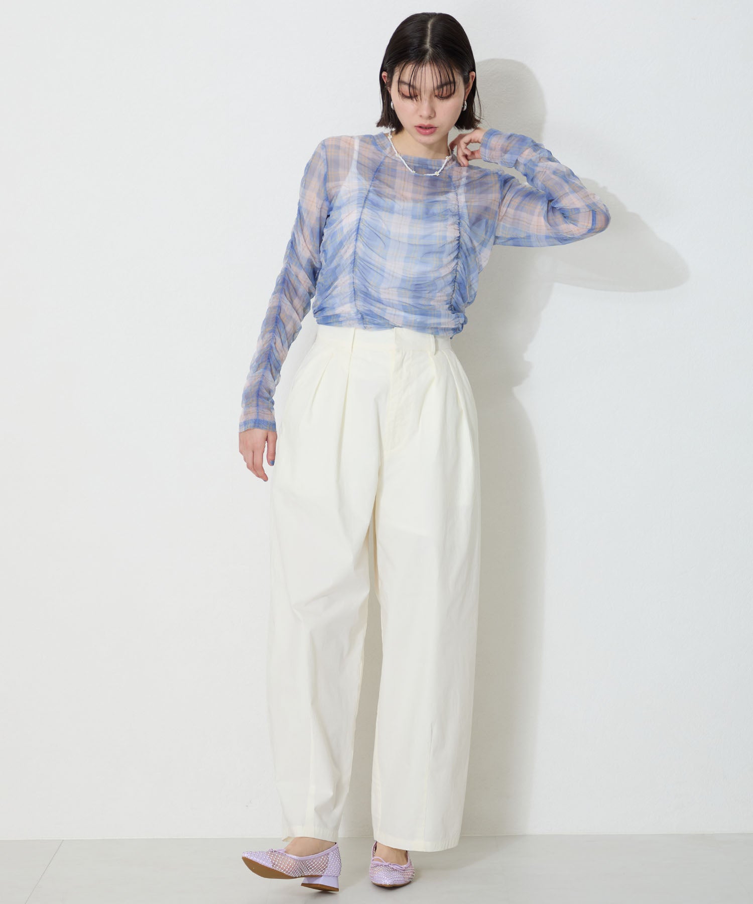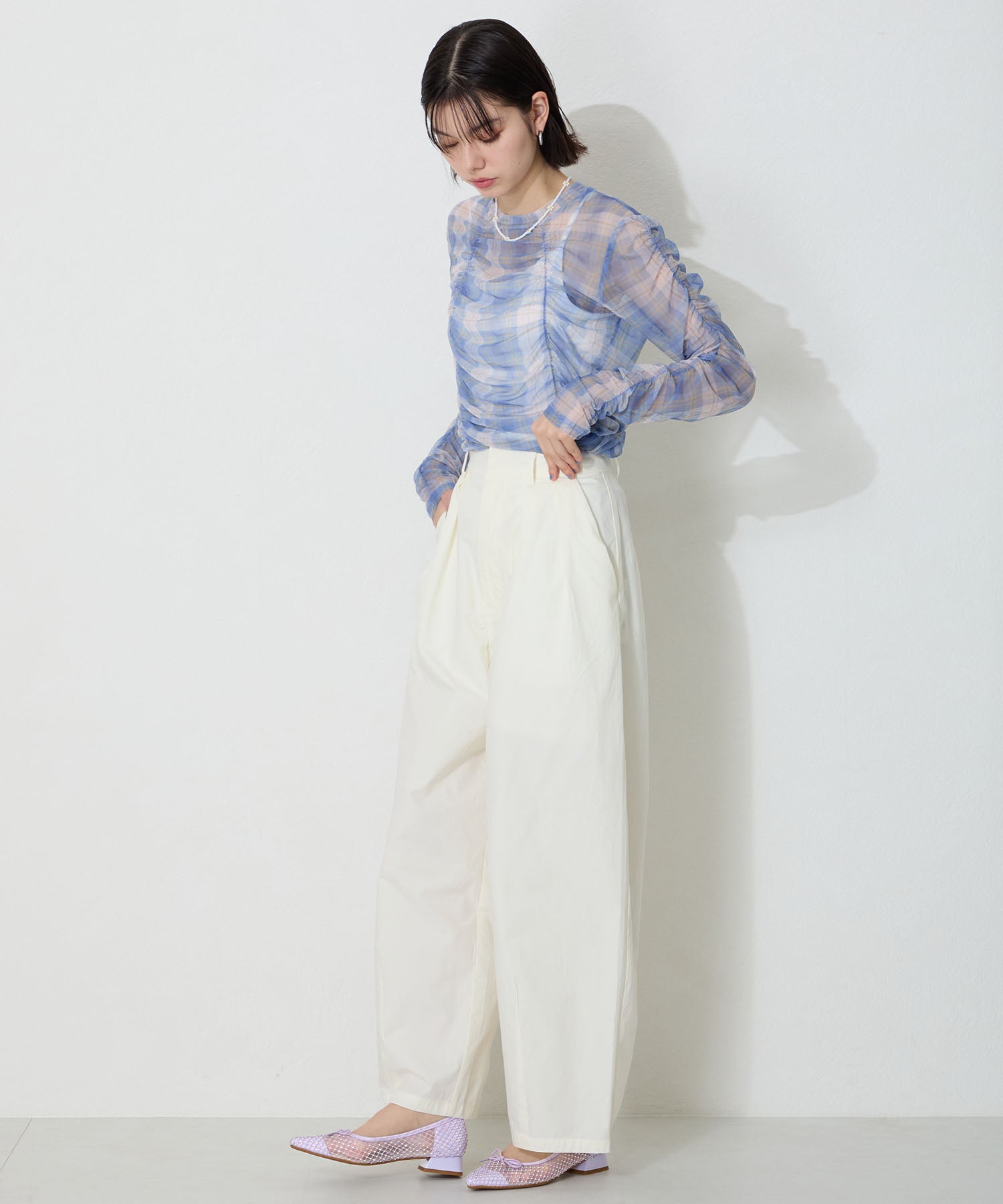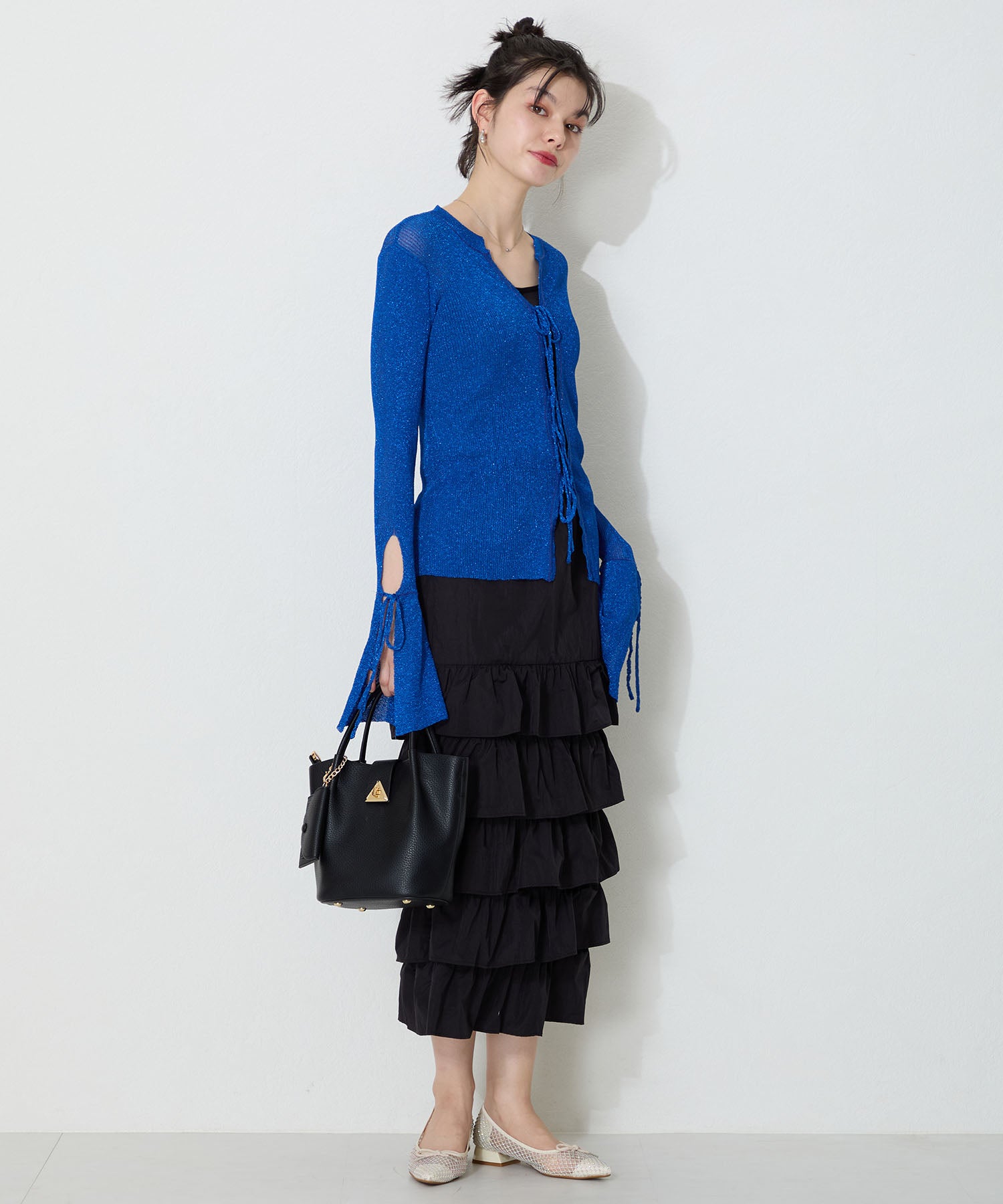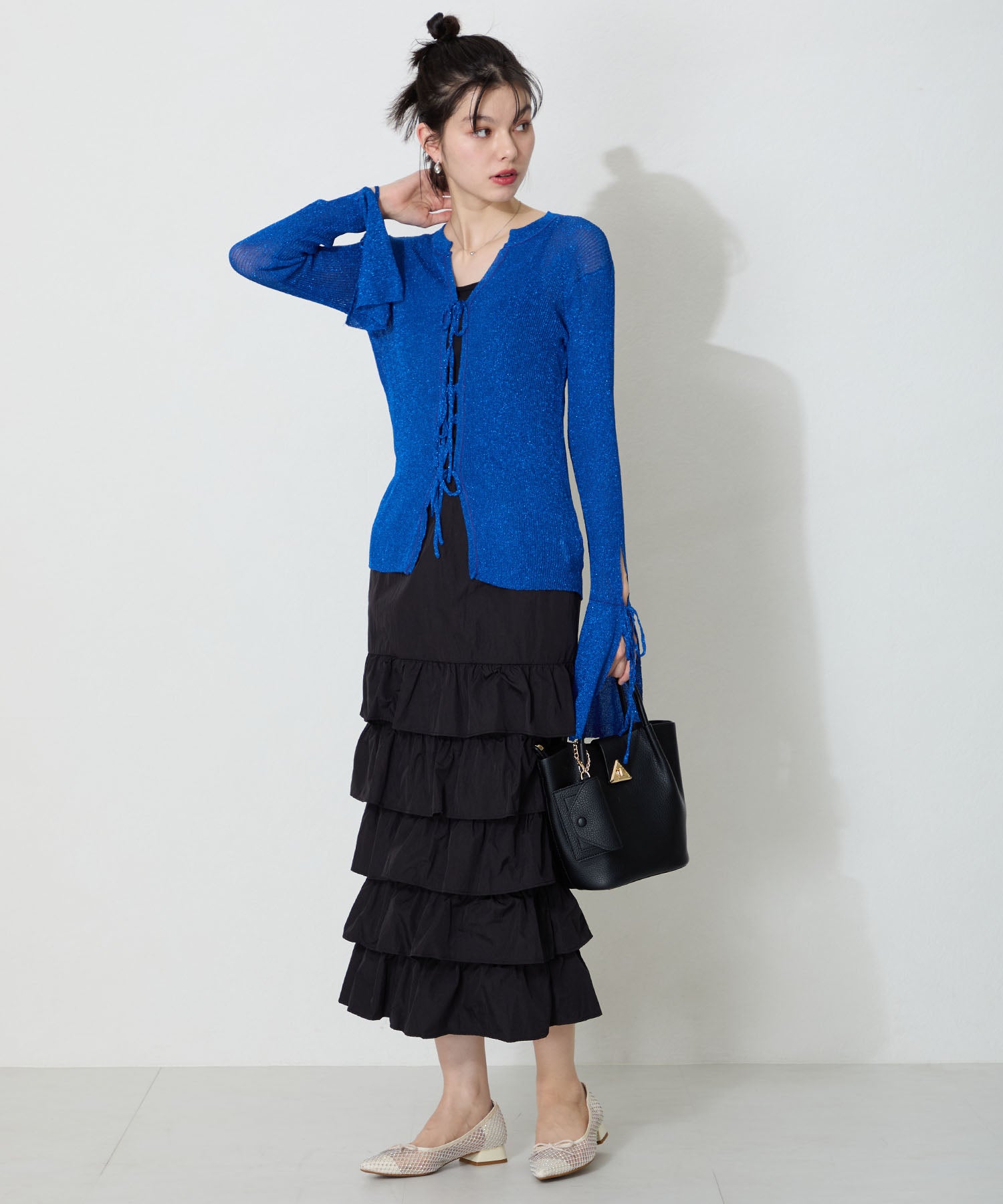 涼し気なチュール生地にメッシュを掛け合わせたデザインが今っぽいパンプスは、小粒のラインストーンを全体に配置して歩くたびにキラキラ輝く、履くだけで気分の上がる1足。華奢なリボンを付け全体的に柔らかく淡いカラーリングにすることでかわいらしい印象をプラスし、シアーの透け感がいつものコーデにも馴染みやすいアイテム。