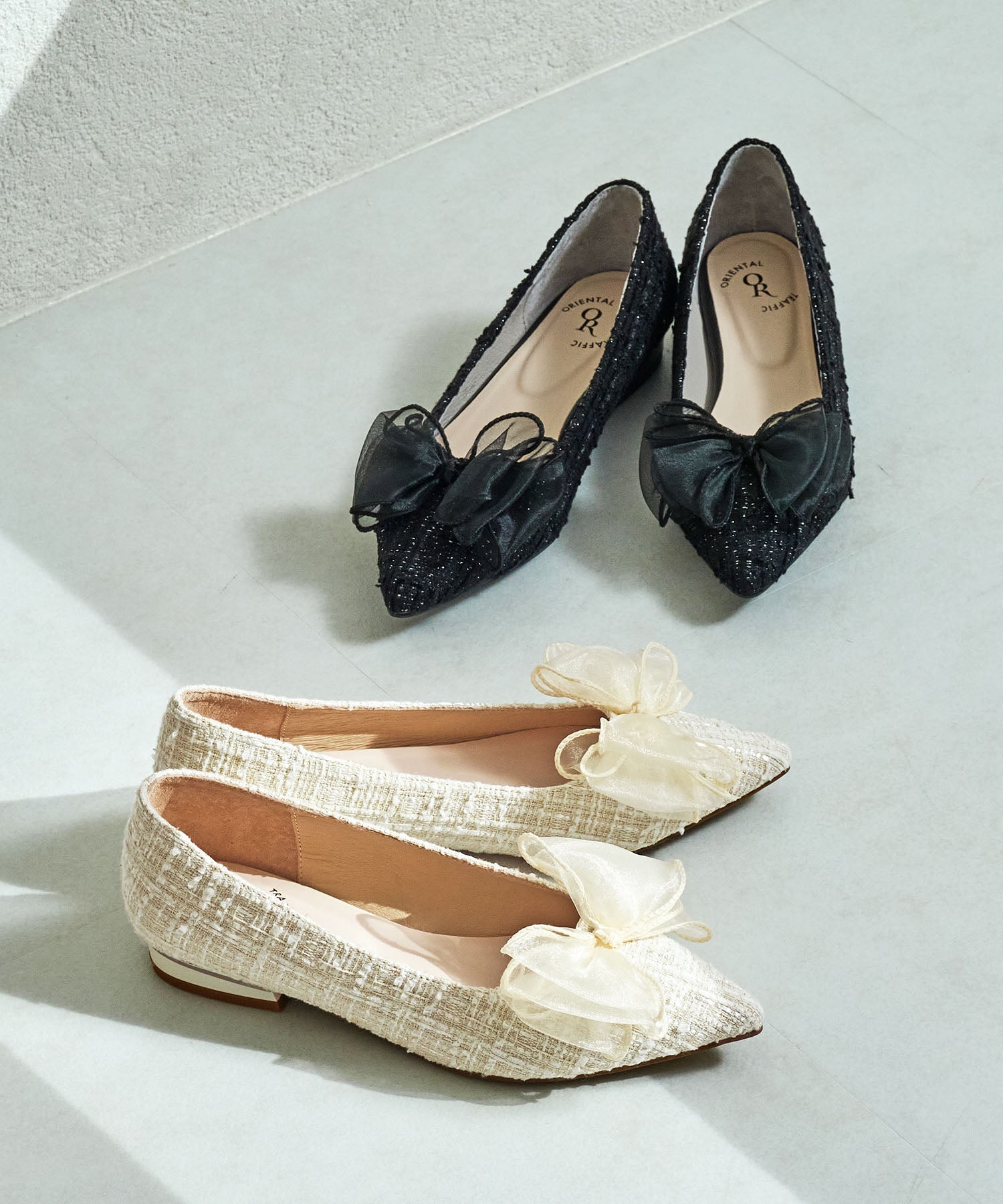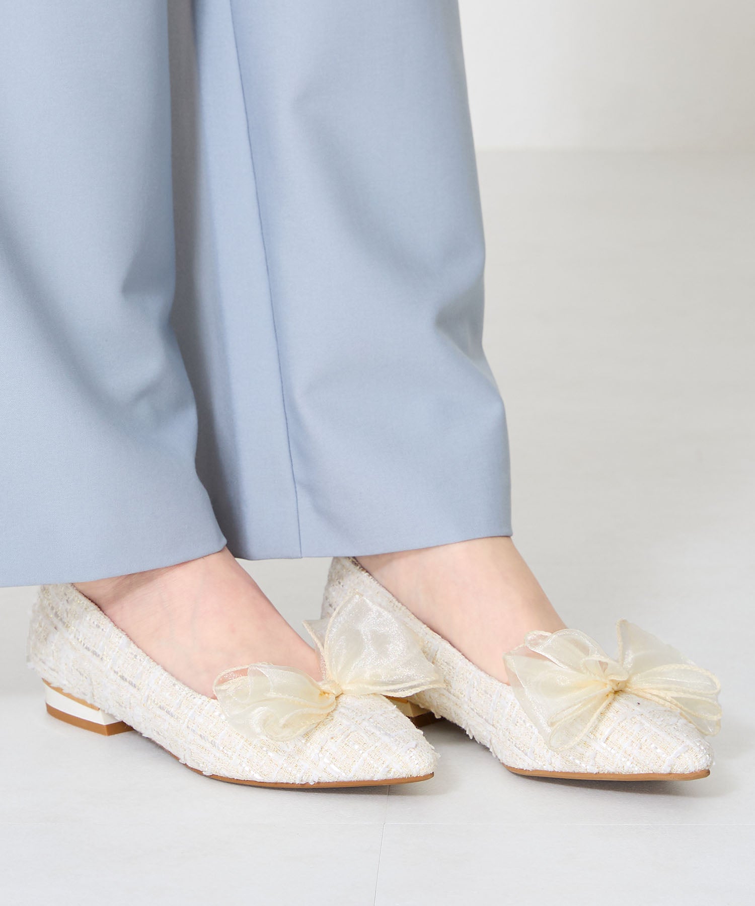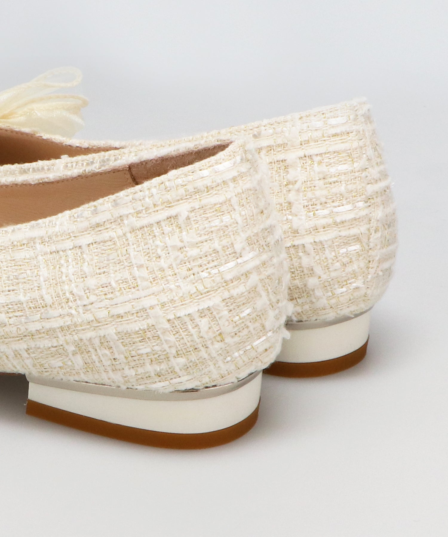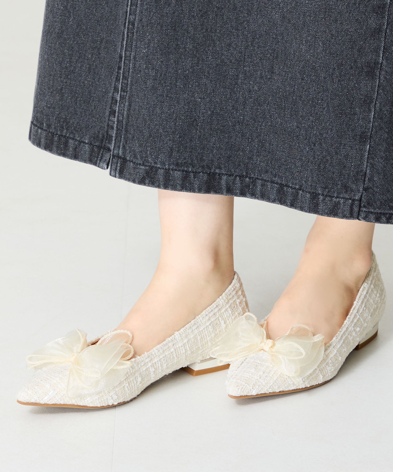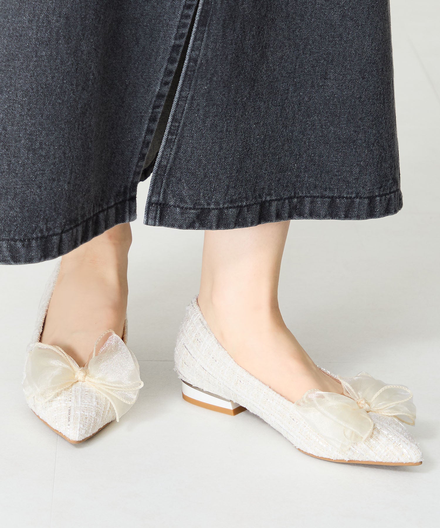 チュールのリボンと立体感のあるツイード素材がフェミニンなパンプスは、中敷にクッションが入っていて疲れにくく、フラットヒールで歩きやすいので足への負担も少なくお出かけにも大活躍なアイテム。ヒールのメタリックラインもポイントで女性らしさを楽しめるデザイン。スタイリングに取り入れやすい2色のカラー展開で日常使いはもちろん、パーティシーンにもおすすめ。