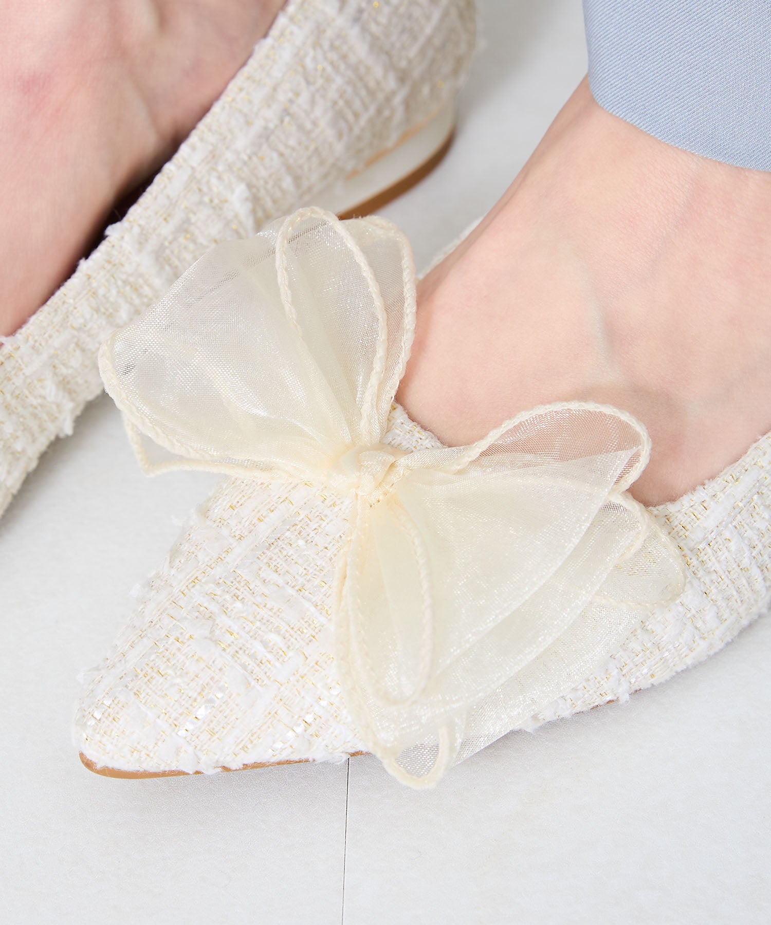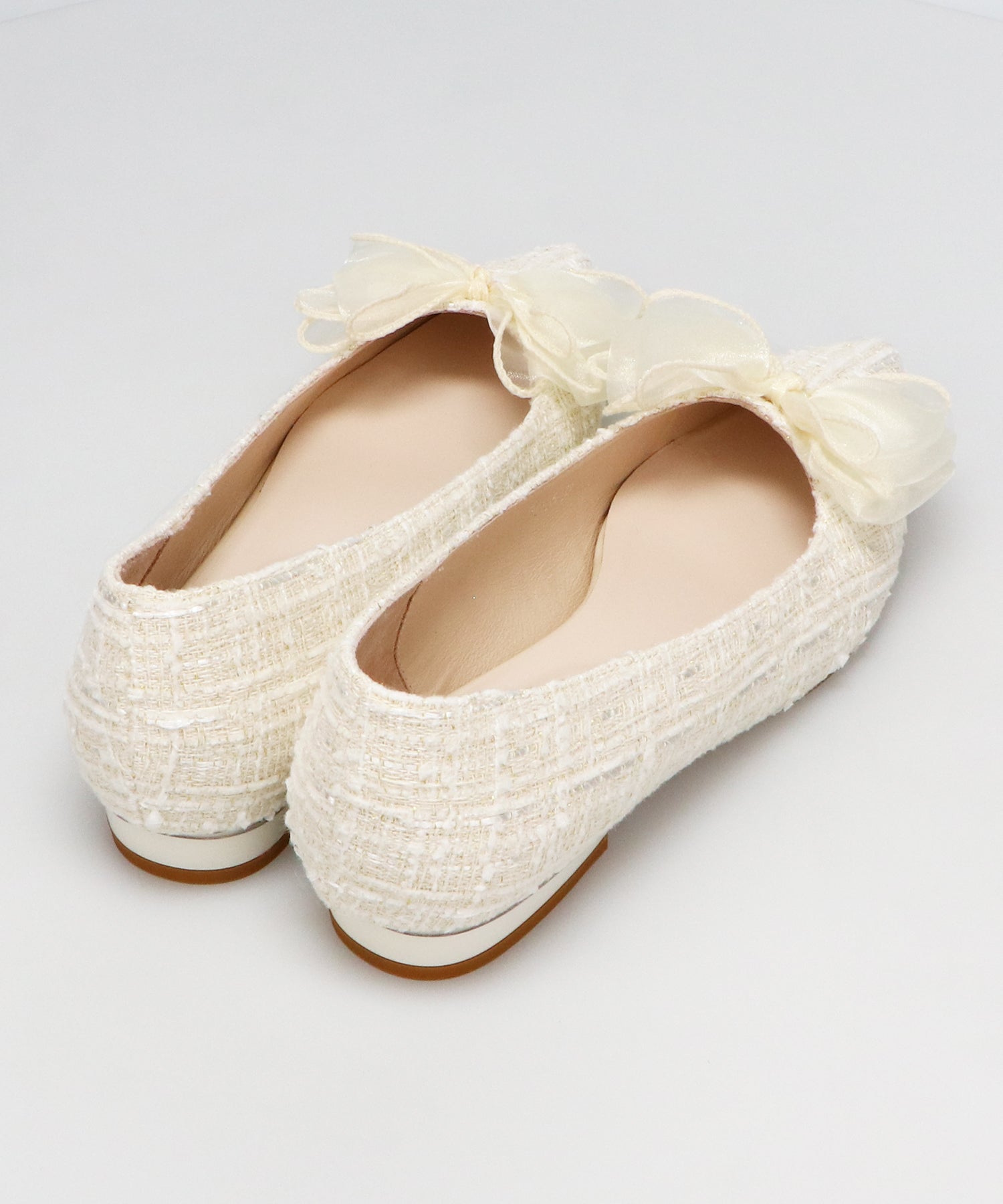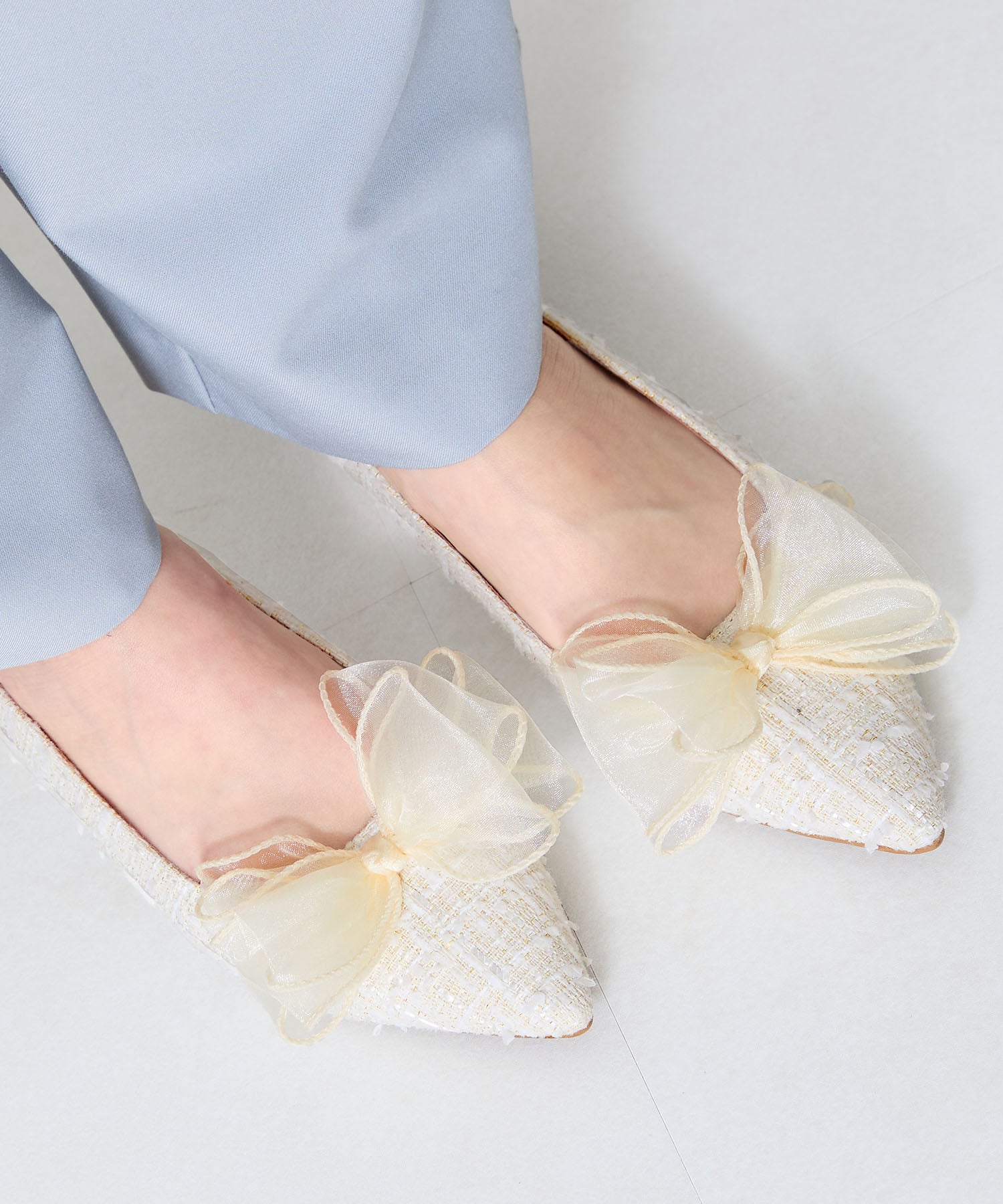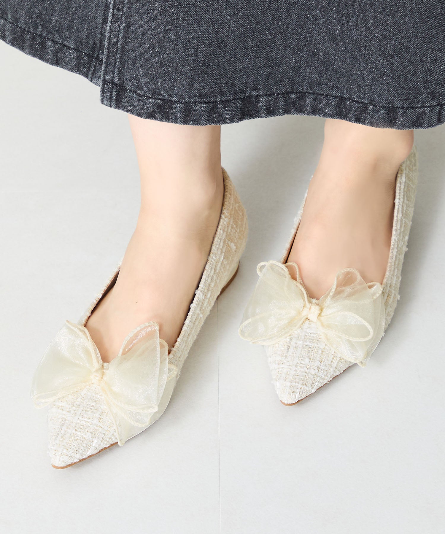 チュールのリボンと立体感のあるツイード素材がフェミニンなパンプスは、中敷にクッションが入っていて疲れにくく、フラットヒールで歩きやすいので足への負担も少なくお出かけにも大活躍なアイテム。ヒールのメタリックラインもポイントで女性らしさを楽しめるデザイン。スタイリングに取り入れやすい2色のカラー展開で日常使いはもちろん、パーティシーンにもおすすめ。