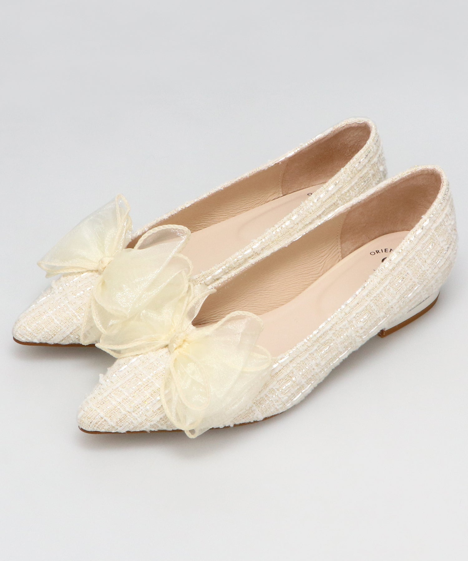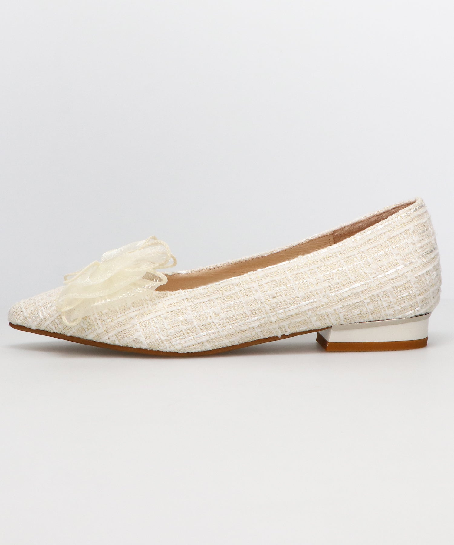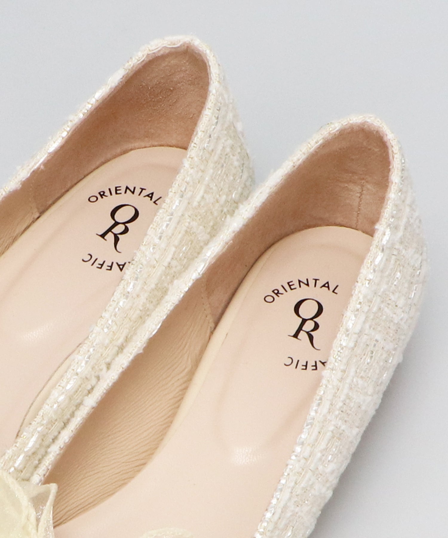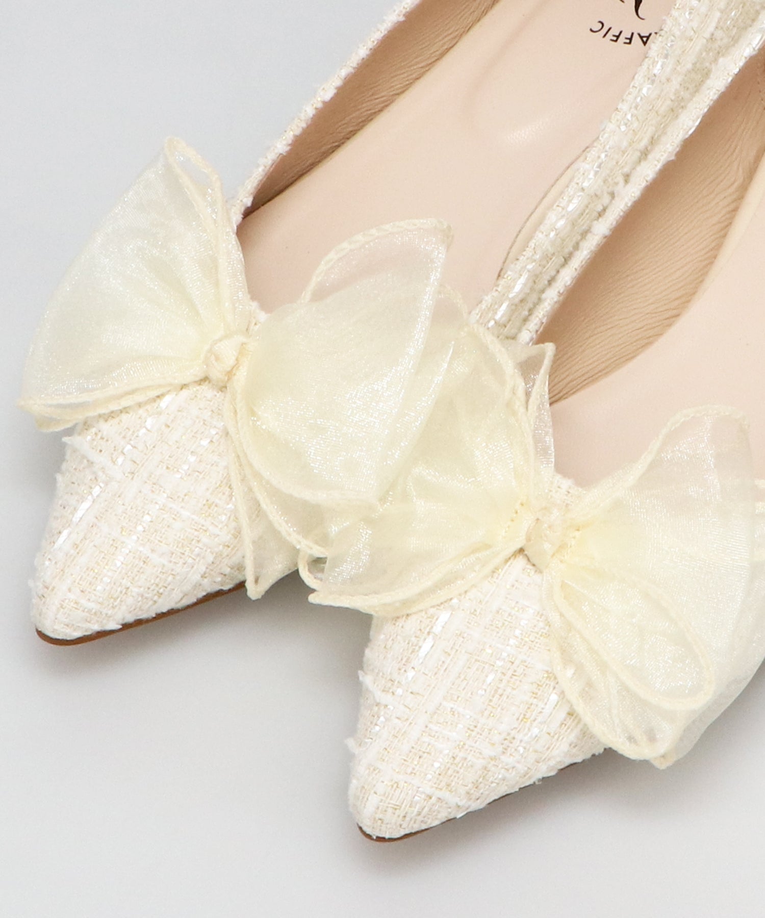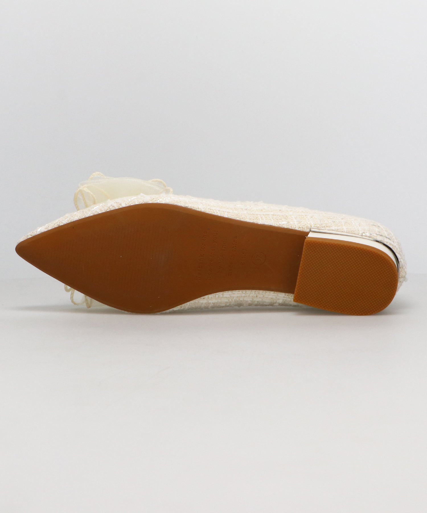 チュールのリボンと立体感のあるツイード素材がフェミニンなパンプスは、中敷にクッションが入っていて疲れにくく、フラットヒールで歩きやすいので足への負担も少なくお出かけにも大活躍なアイテム。ヒールのメタリックラインもポイントで女性らしさを楽しめるデザイン。スタイリングに取り入れやすい2色のカラー展開で日常使いはもちろん、パーティシーンにもおすすめ。