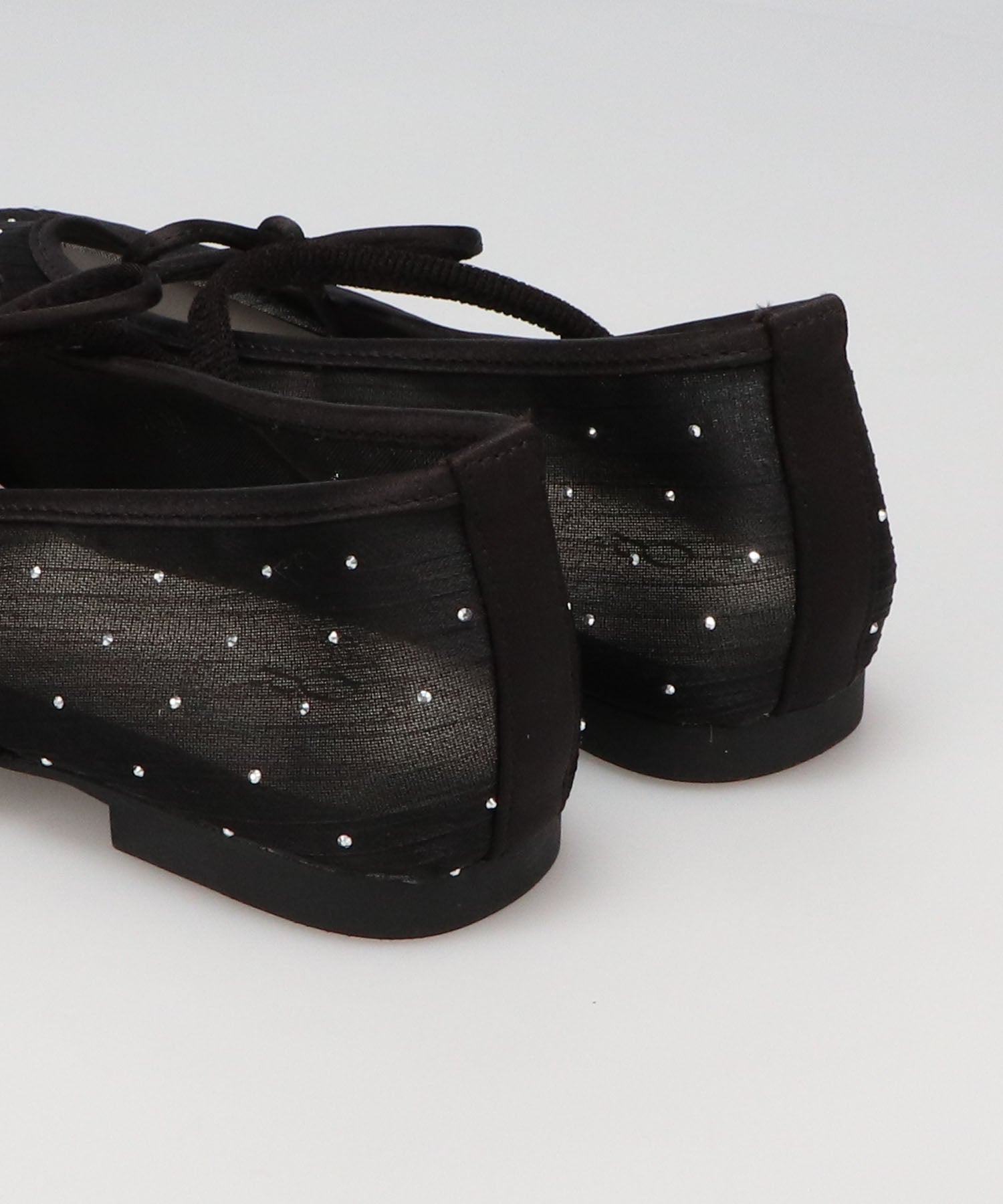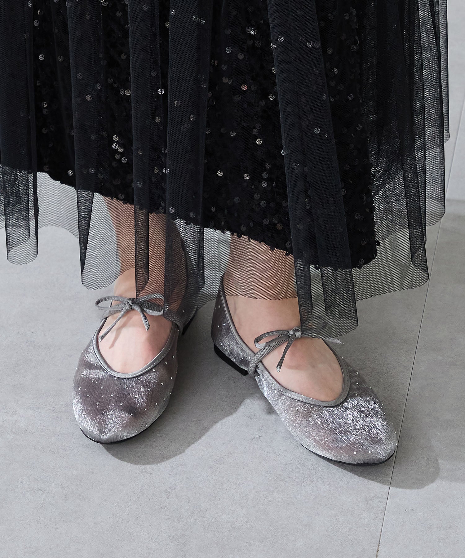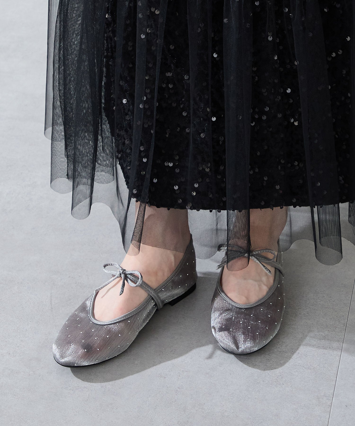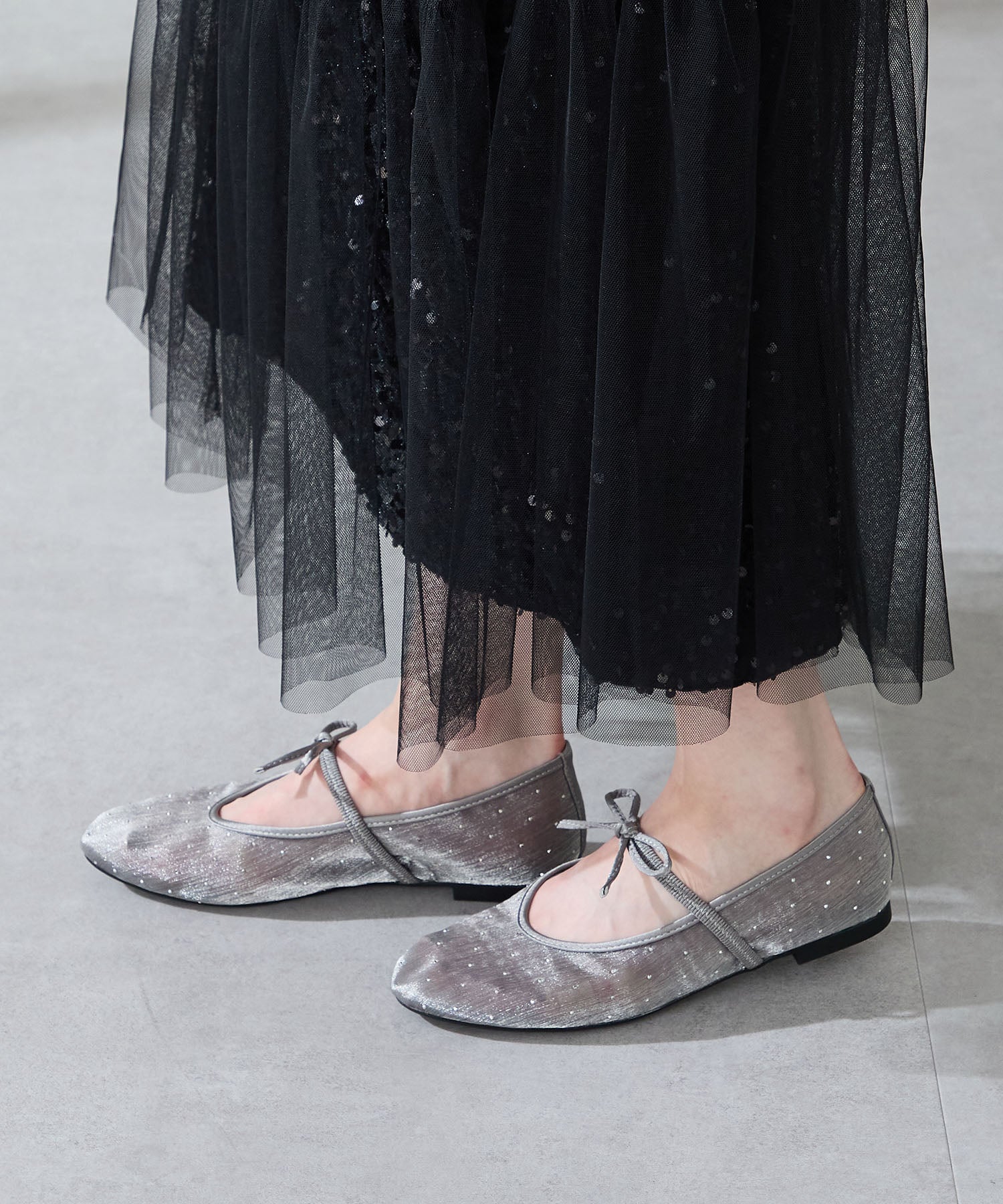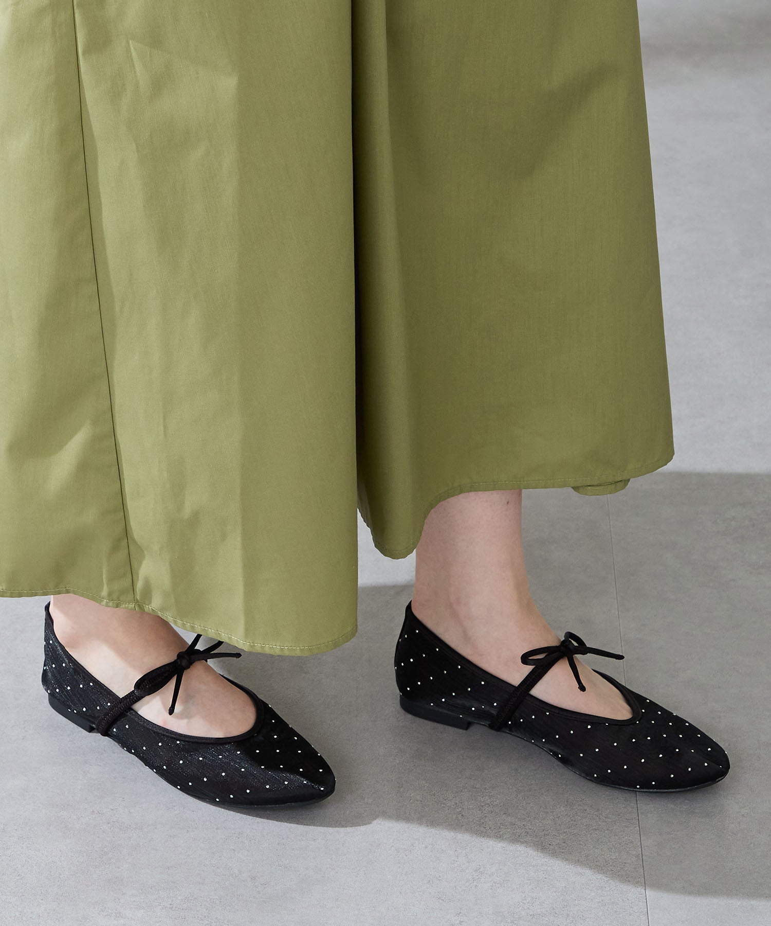 小粒のラインストーンを散りばめたチュール素材に組み合わせたリボンストラップが大人可愛いパンプス。甲のベルトは伸縮性のあるゴムになっているので足にぴったりフィットする仕様。つま先から踵までくたっとした柔らかな履き心地に、疲れにくいフラットタイプで気軽に合わせられるのが嬉しい。抜け感を楽しめる透け素材で早めの時期から履けるアイテム。