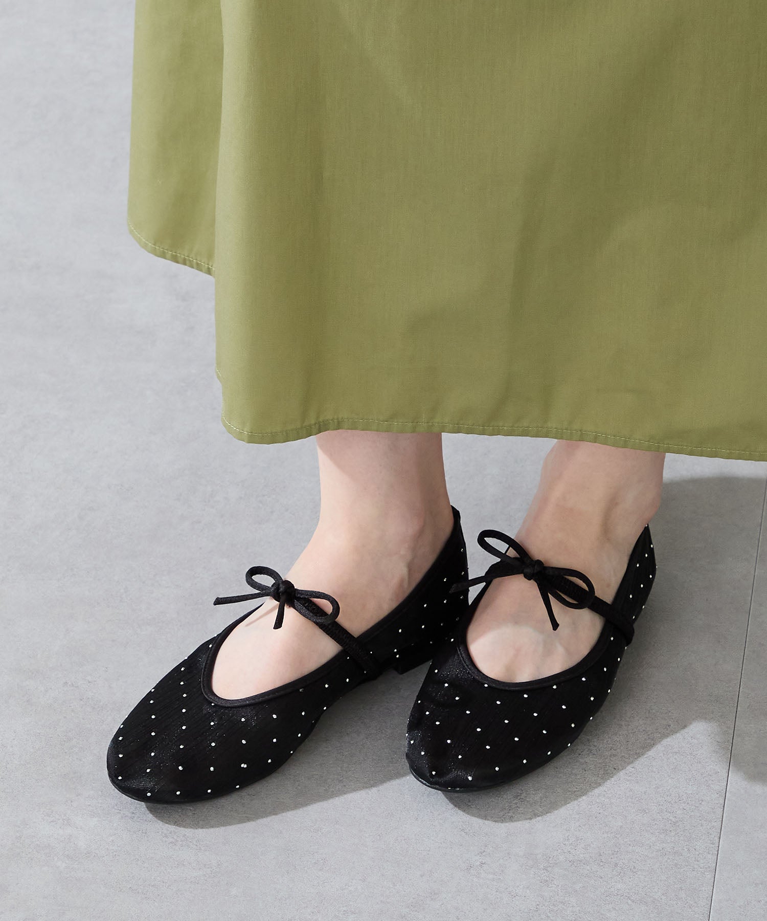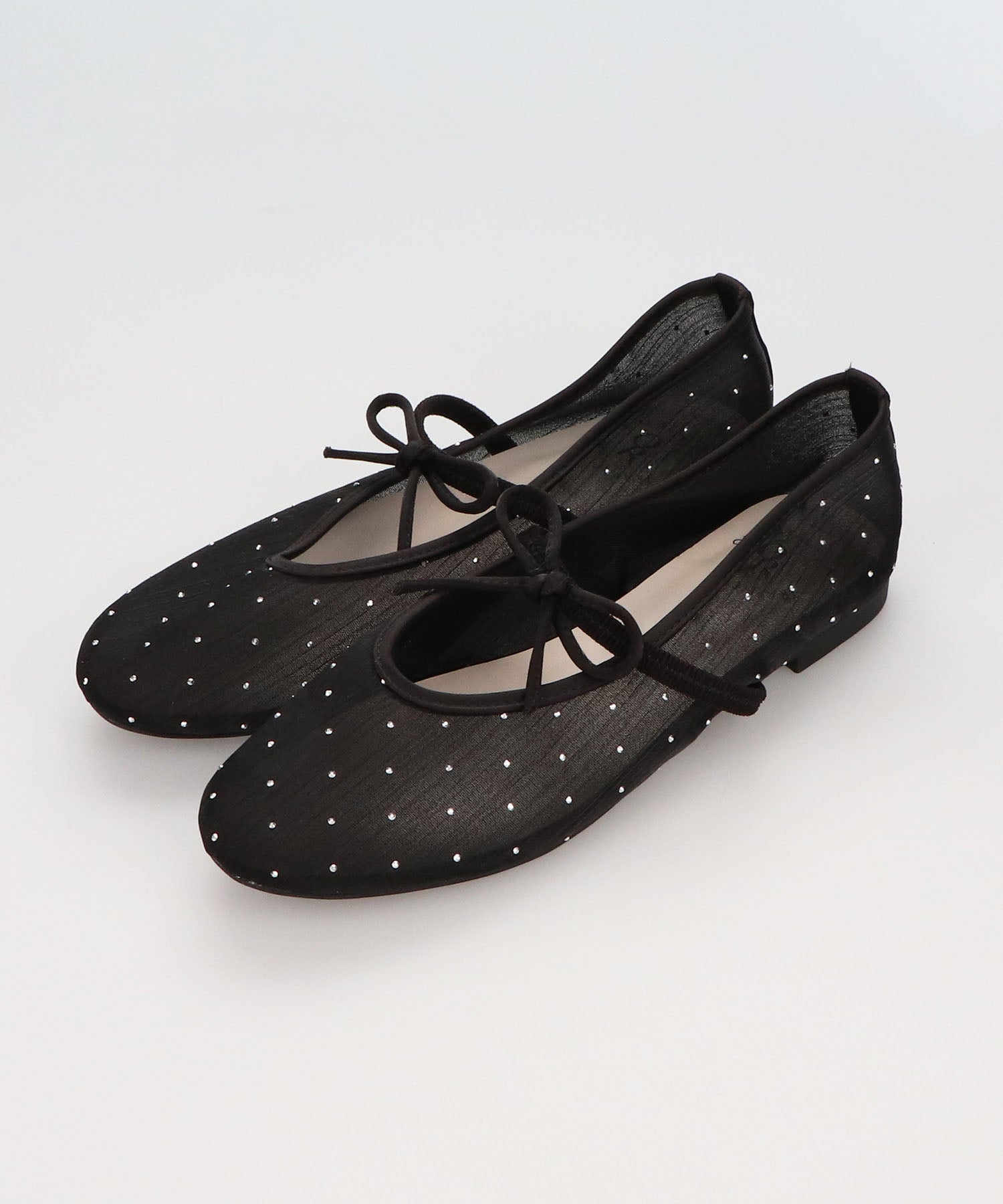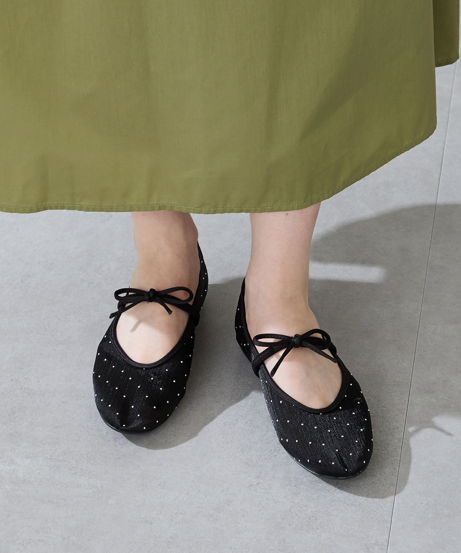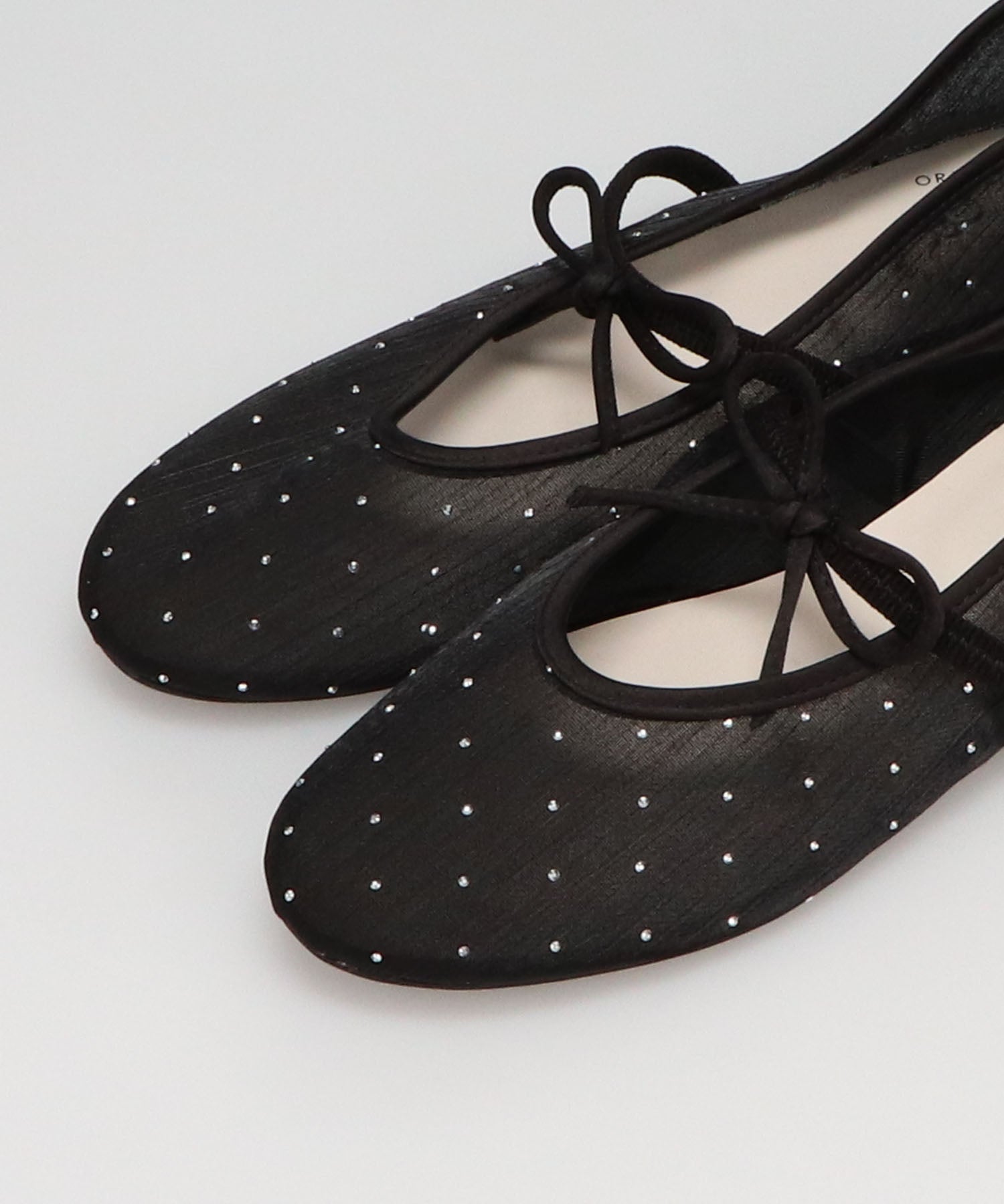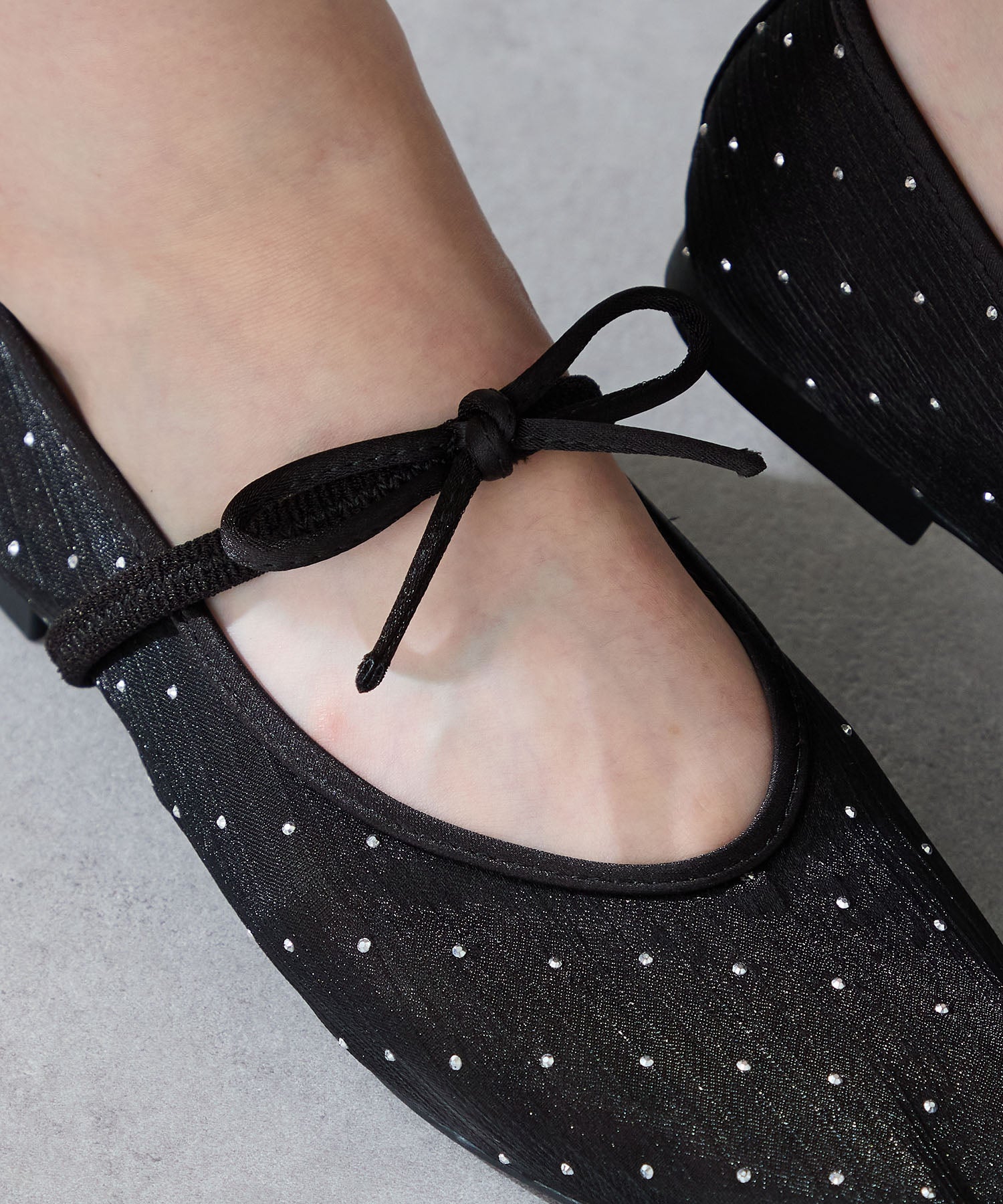 小粒のラインストーンを散りばめたチュール素材に組み合わせたリボンストラップが大人可愛いパンプス。甲のベルトは伸縮性のあるゴムになっているので足にぴったりフィットする仕様。つま先から踵までくたっとした柔らかな履き心地に、疲れにくいフラットタイプで気軽に合わせられるのが嬉しい。抜け感を楽しめる透け素材で早めの時期から履けるアイテム。