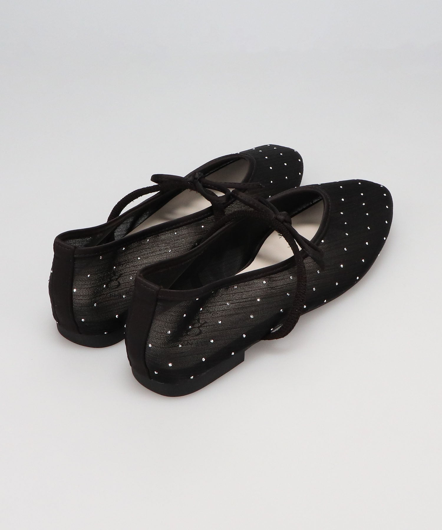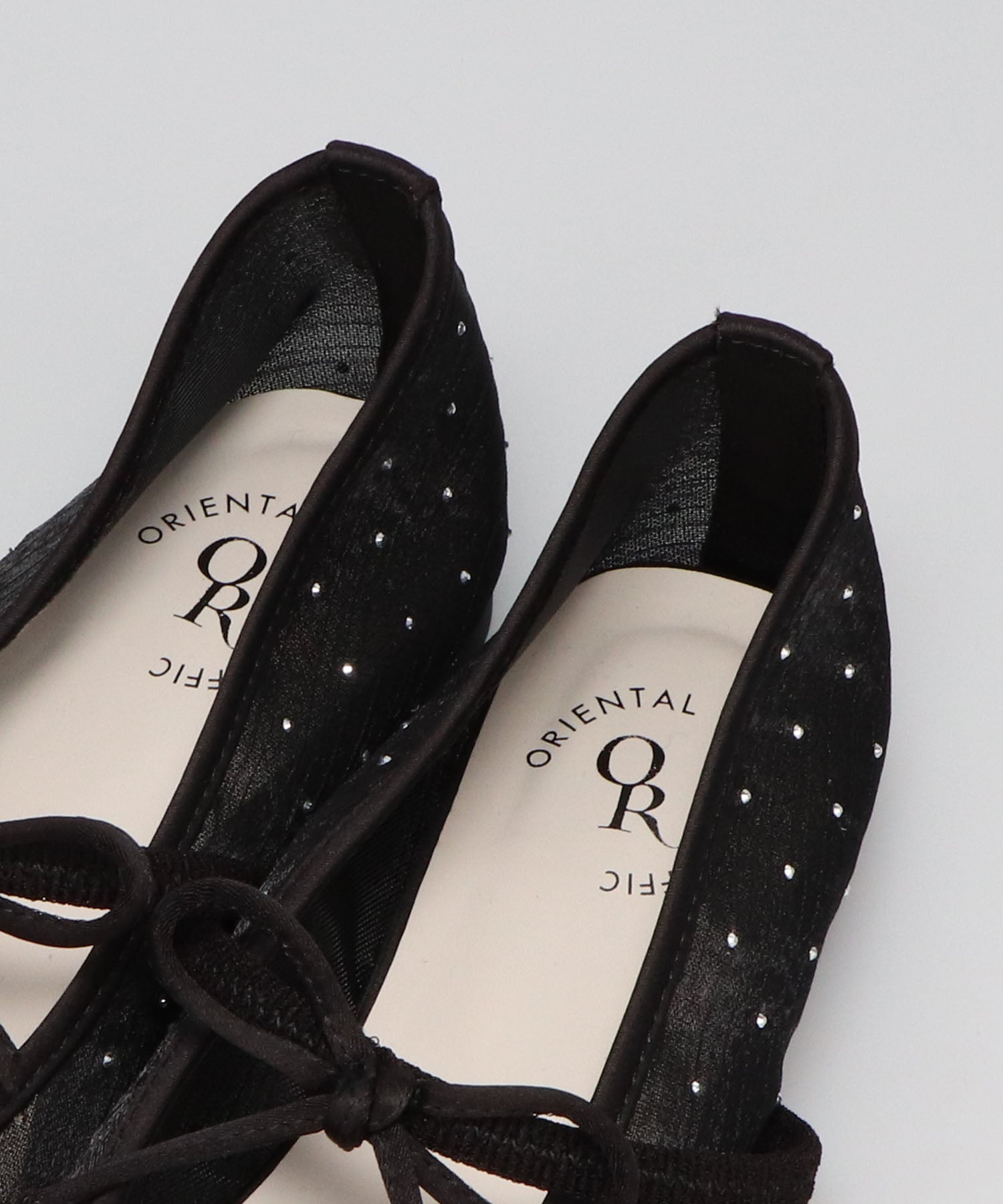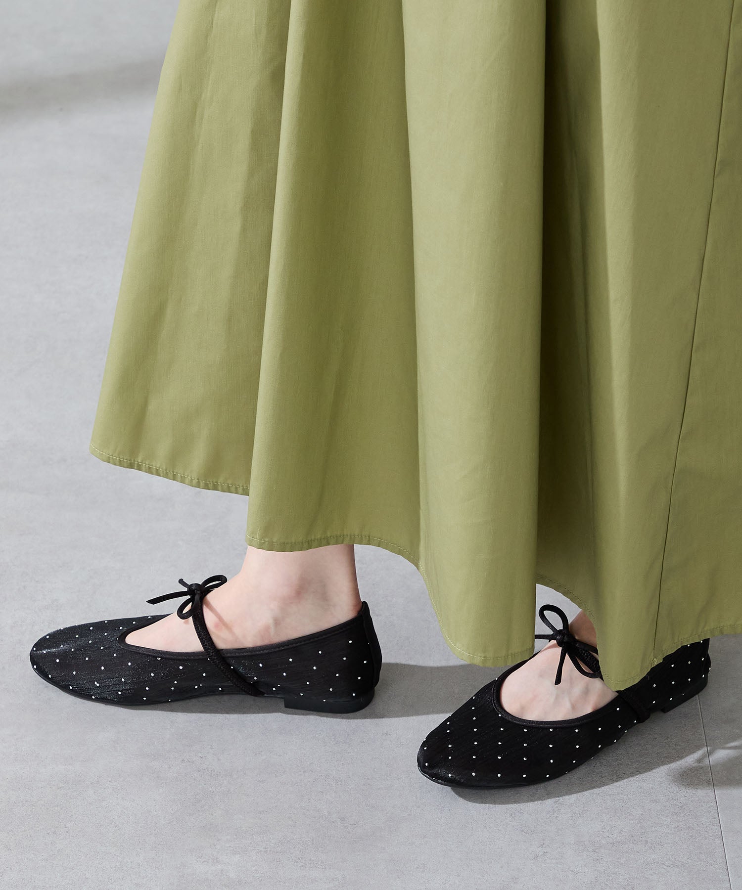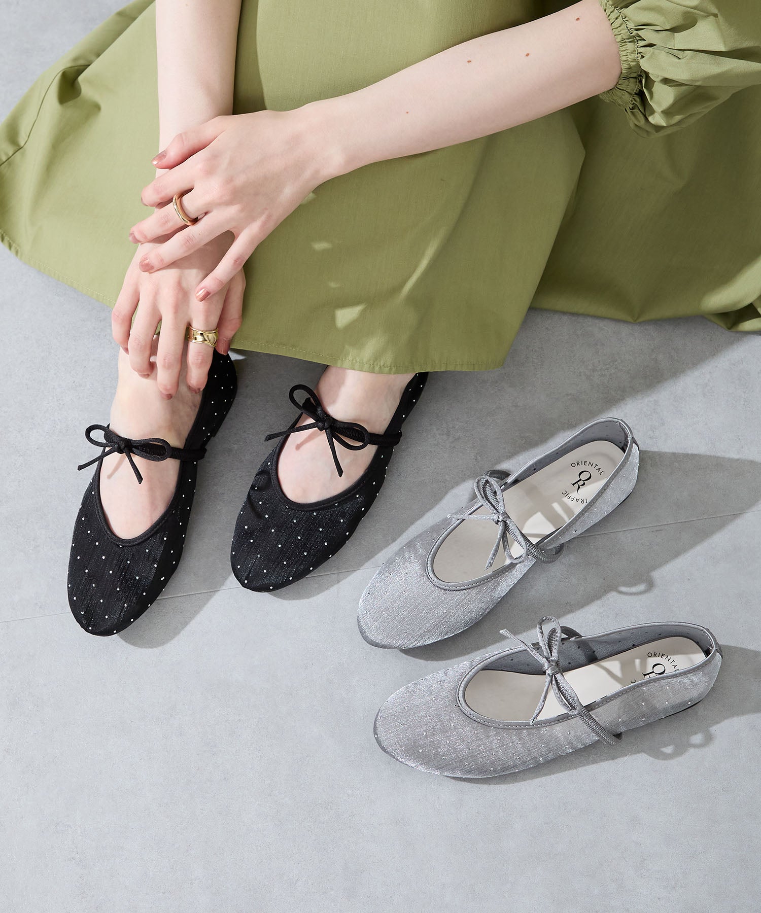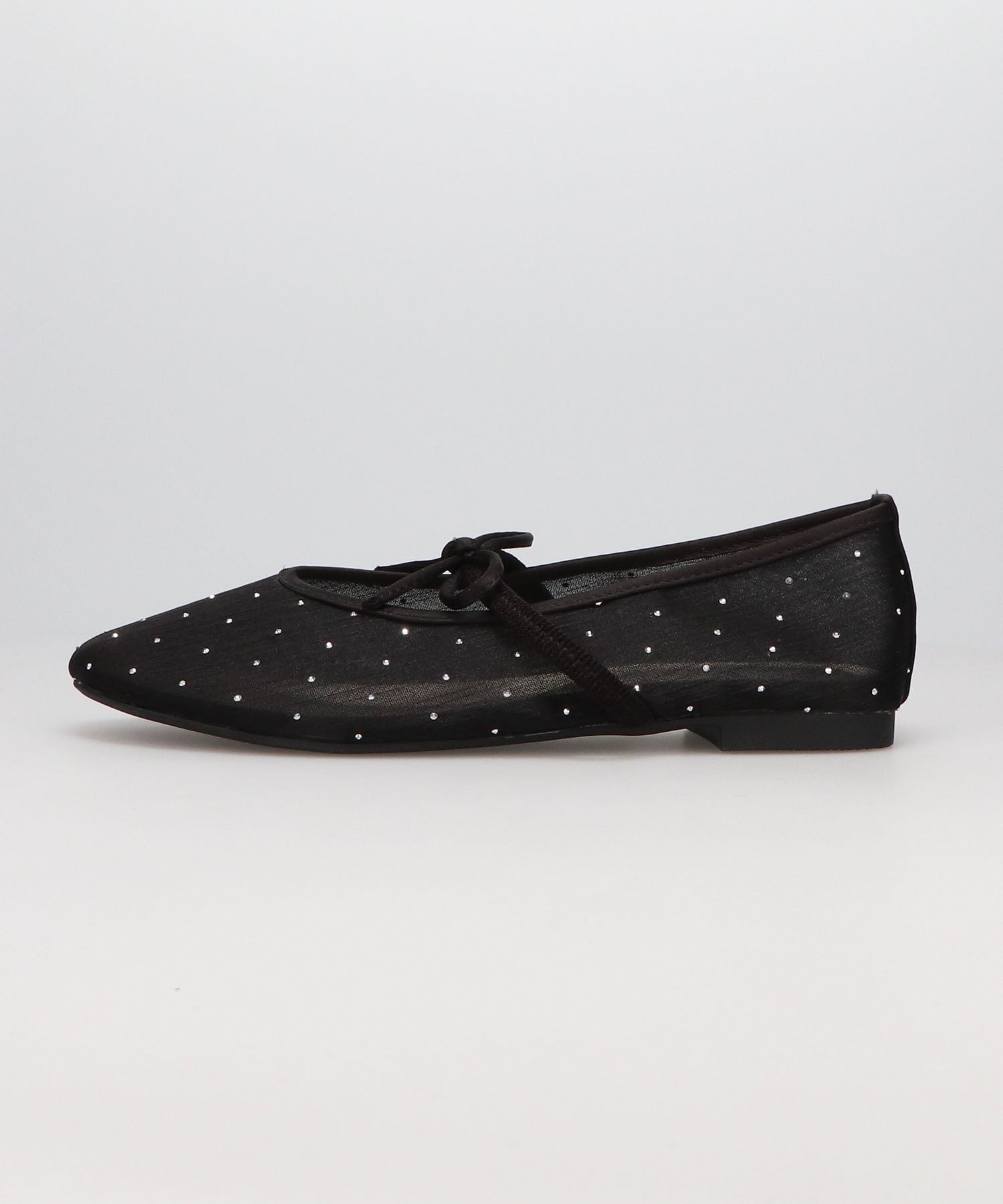 小粒のラインストーンを散りばめたチュール素材に組み合わせたリボンストラップが大人可愛いパンプス。甲のベルトは伸縮性のあるゴムになっているので足にぴったりフィットする仕様。つま先から踵までくたっとした柔らかな履き心地に、疲れにくいフラットタイプで気軽に合わせられるのが嬉しい。抜け感を楽しめる透け素材で早めの時期から履けるアイテム。
