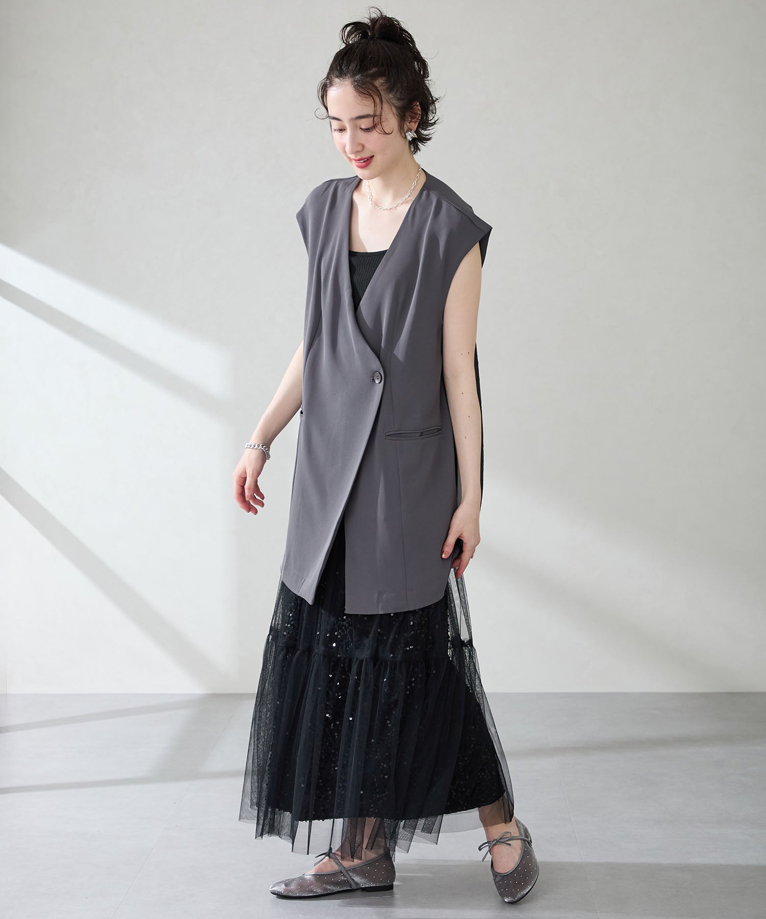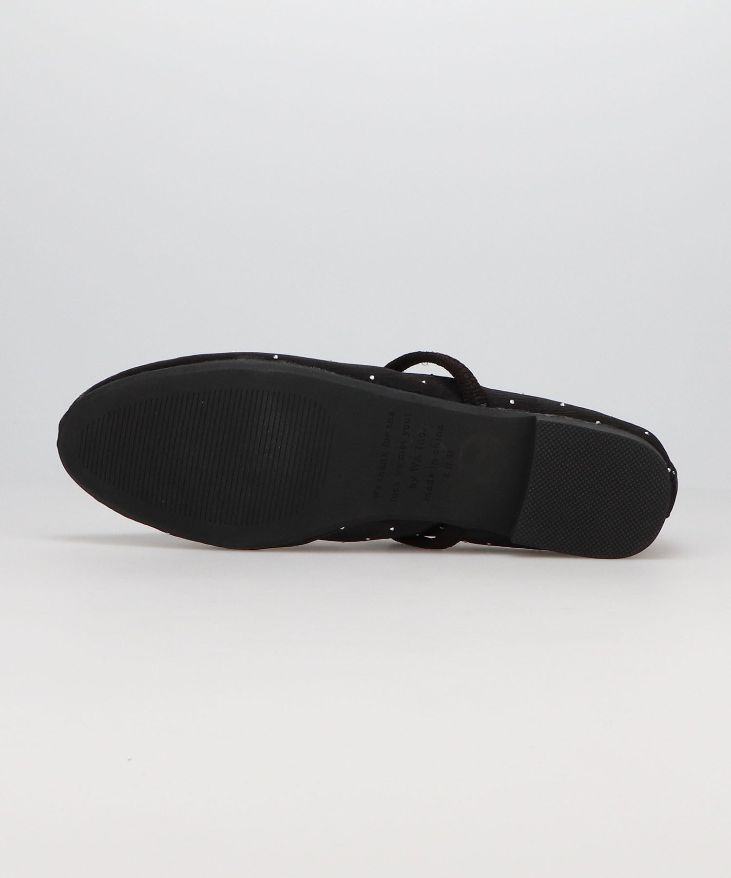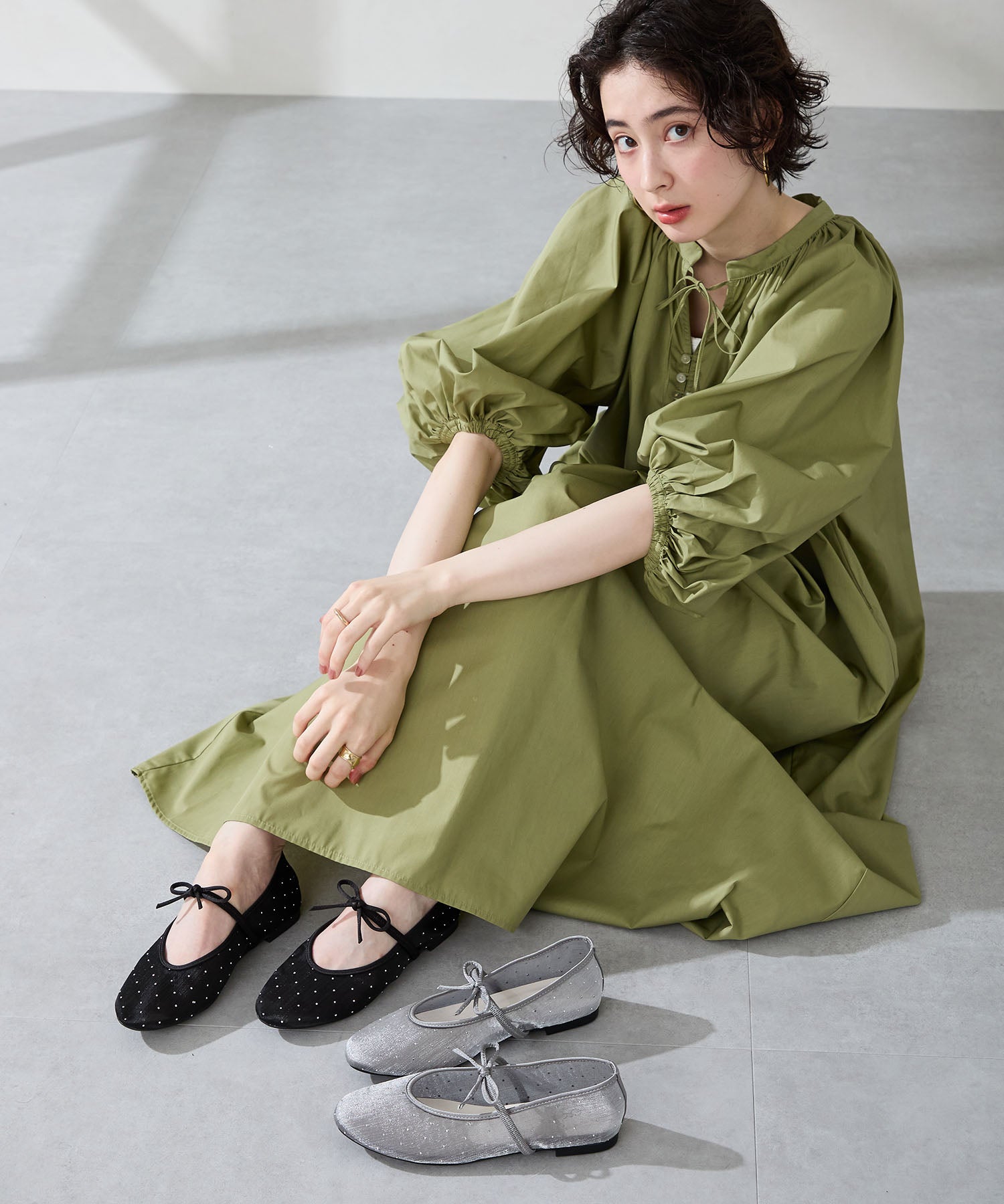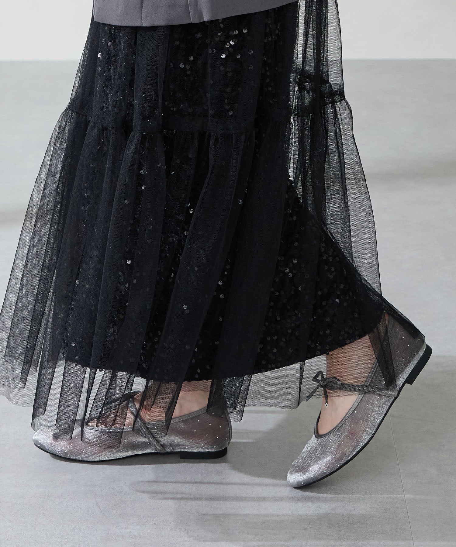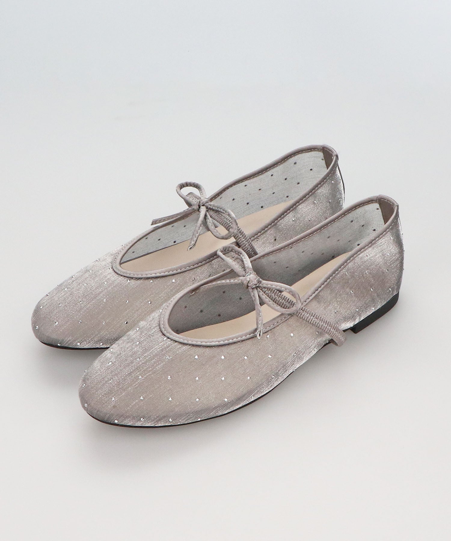 小粒のラインストーンを散りばめたチュール素材に組み合わせたリボンストラップが大人可愛いパンプス。甲のベルトは伸縮性のあるゴムになっているので足にぴったりフィットする仕様。つま先から踵までくたっとした柔らかな履き心地に、疲れにくいフラットタイプで気軽に合わせられるのが嬉しい。抜け感を楽しめる透け素材で早めの時期から履けるアイテム。