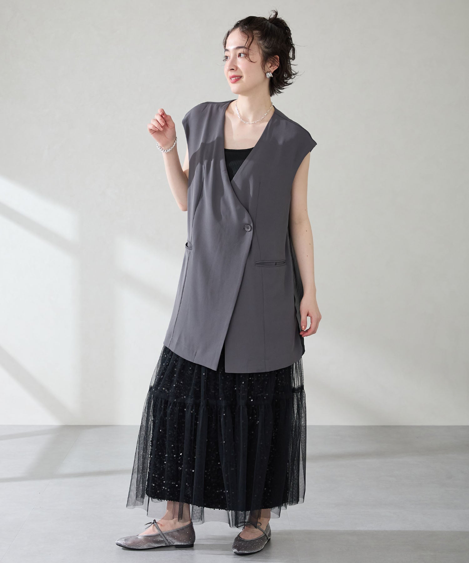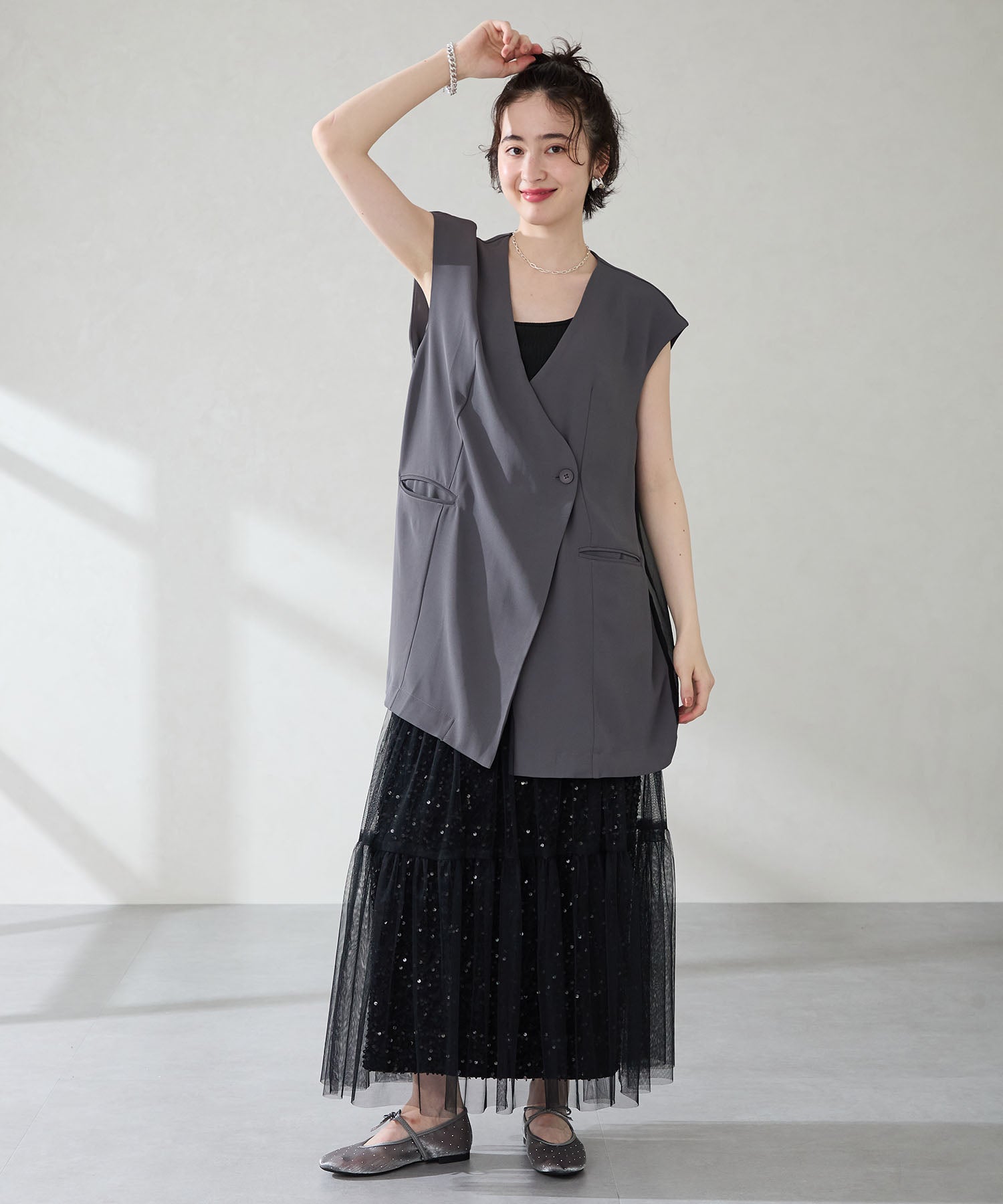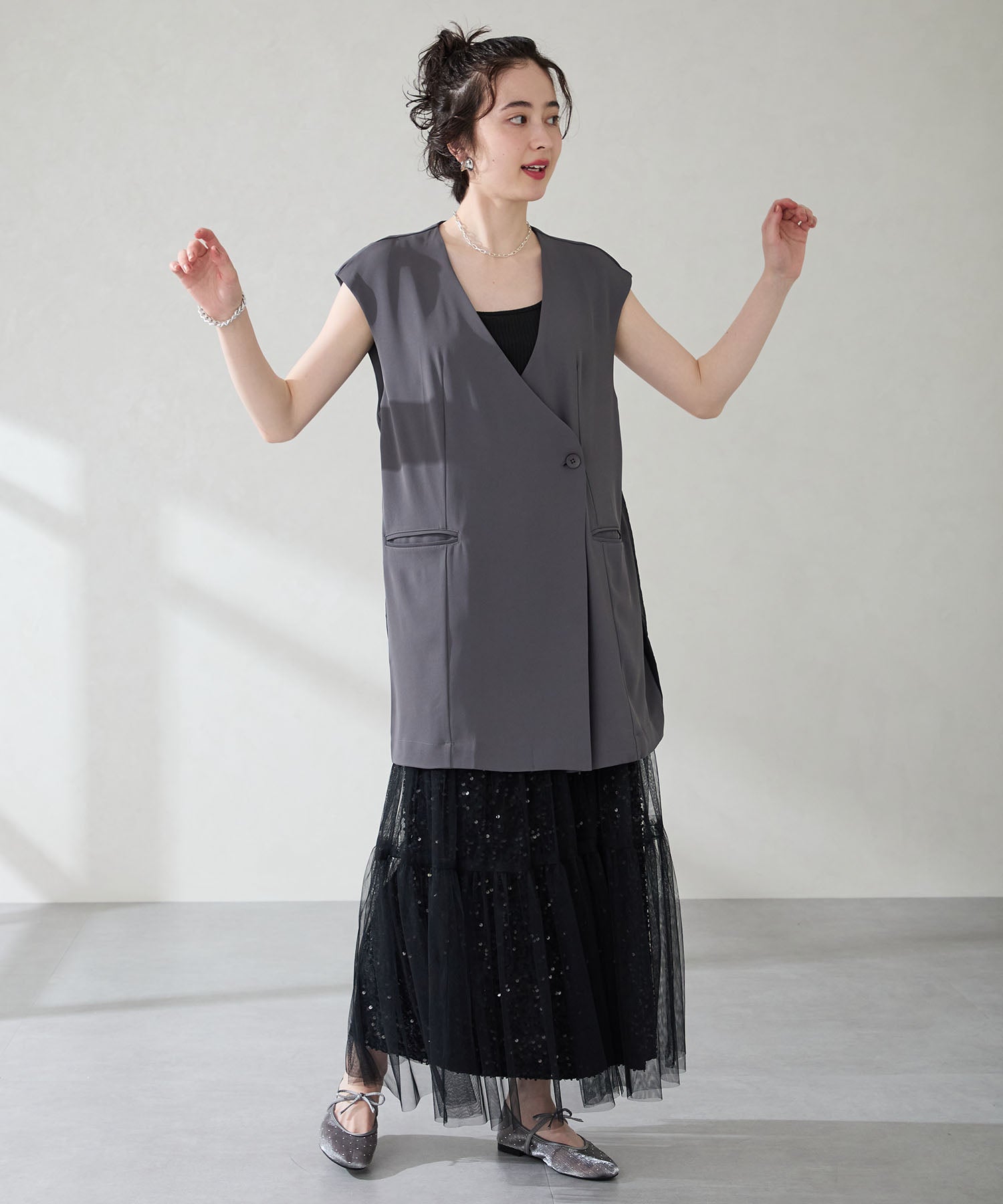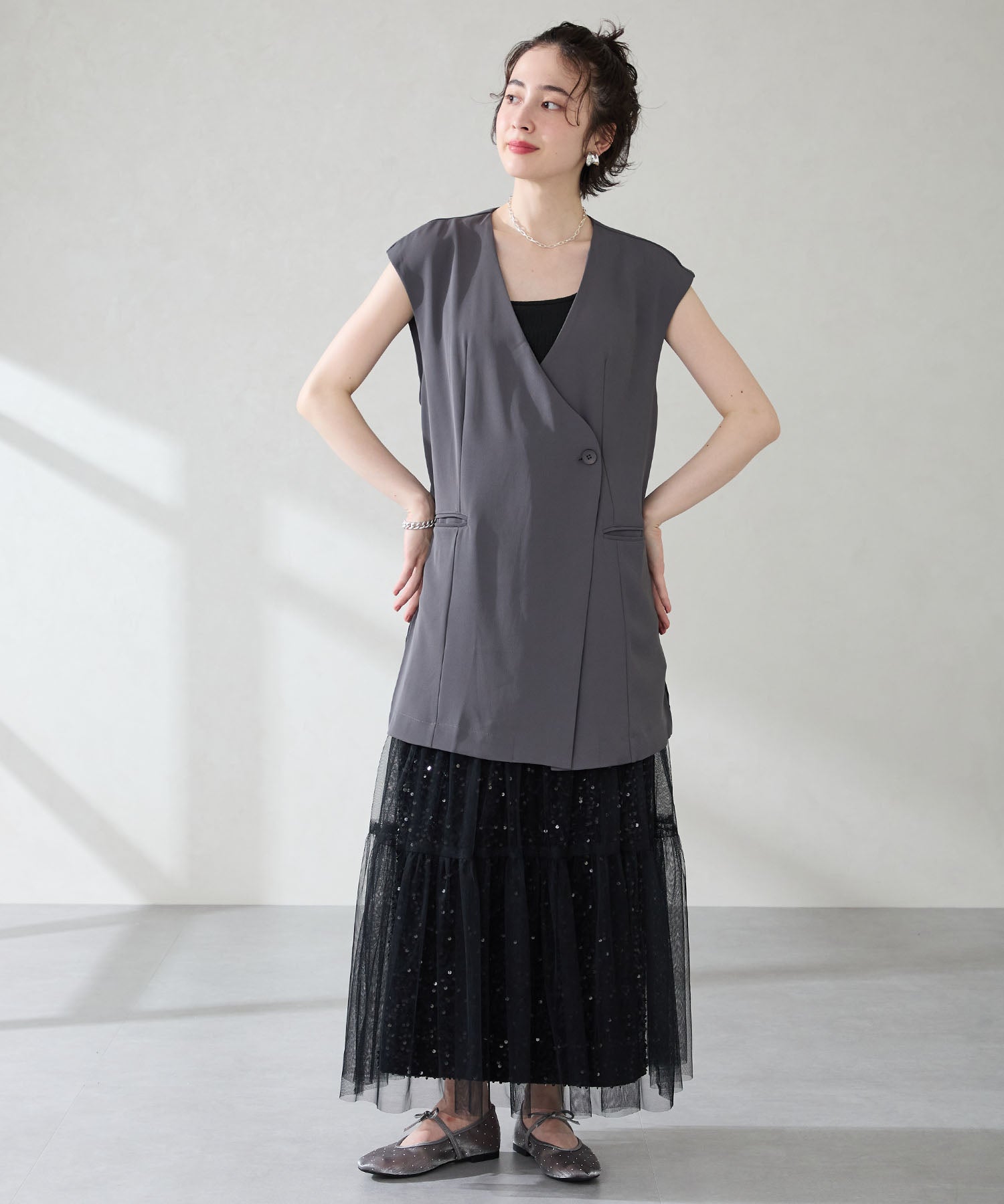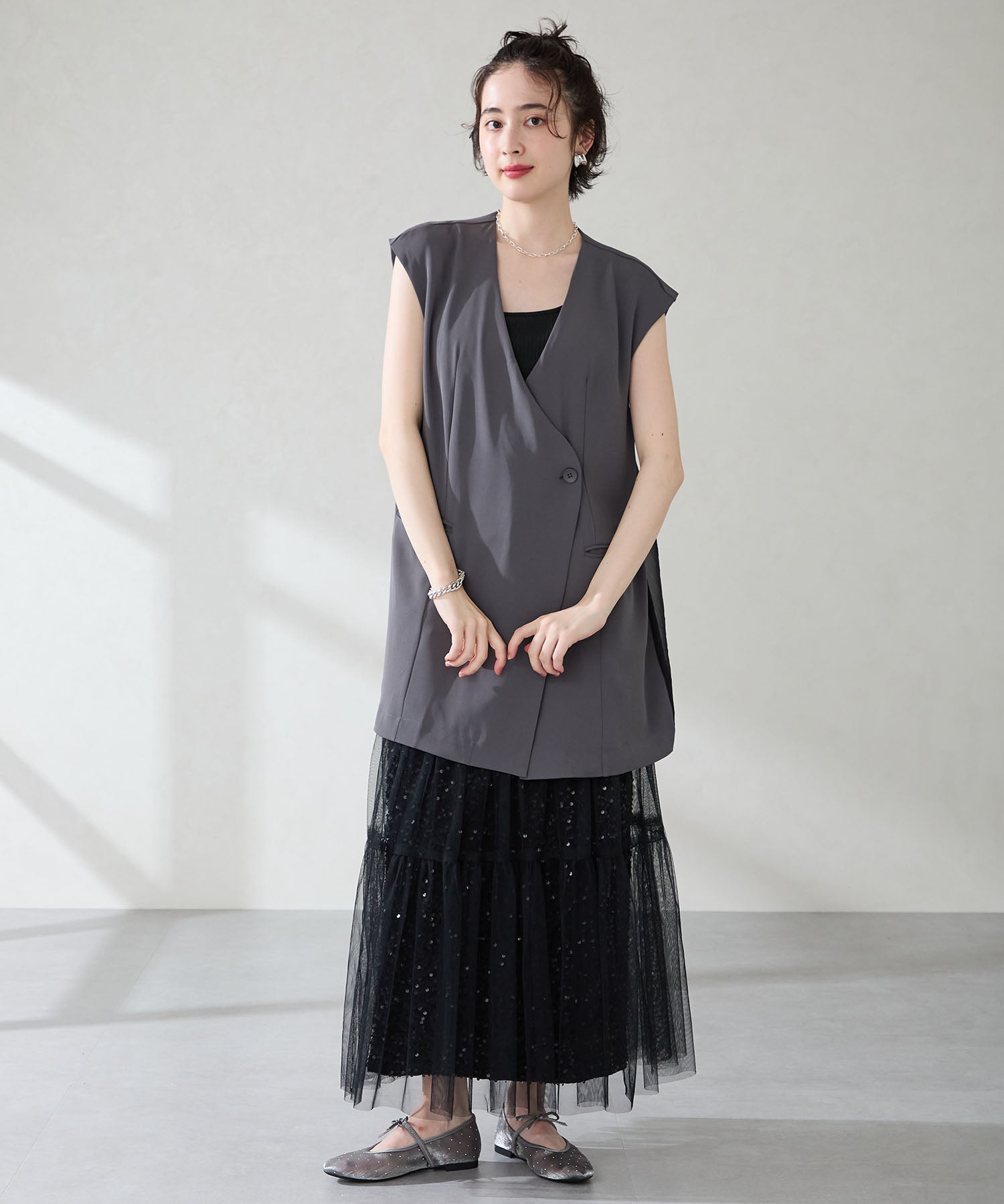 小粒のラインストーンを散りばめたチュール素材に組み合わせたリボンストラップが大人可愛いパンプス。甲のベルトは伸縮性のあるゴムになっているので足にぴったりフィットする仕様。つま先から踵までくたっとした柔らかな履き心地に、疲れにくいフラットタイプで気軽に合わせられるのが嬉しい。抜け感を楽しめる透け素材で早めの時期から履けるアイテム。