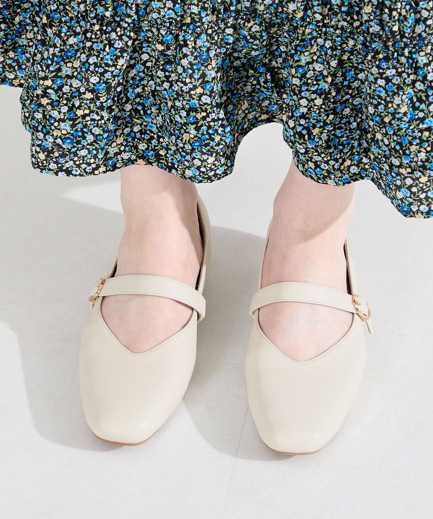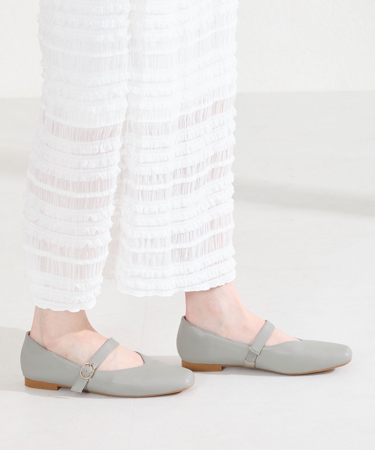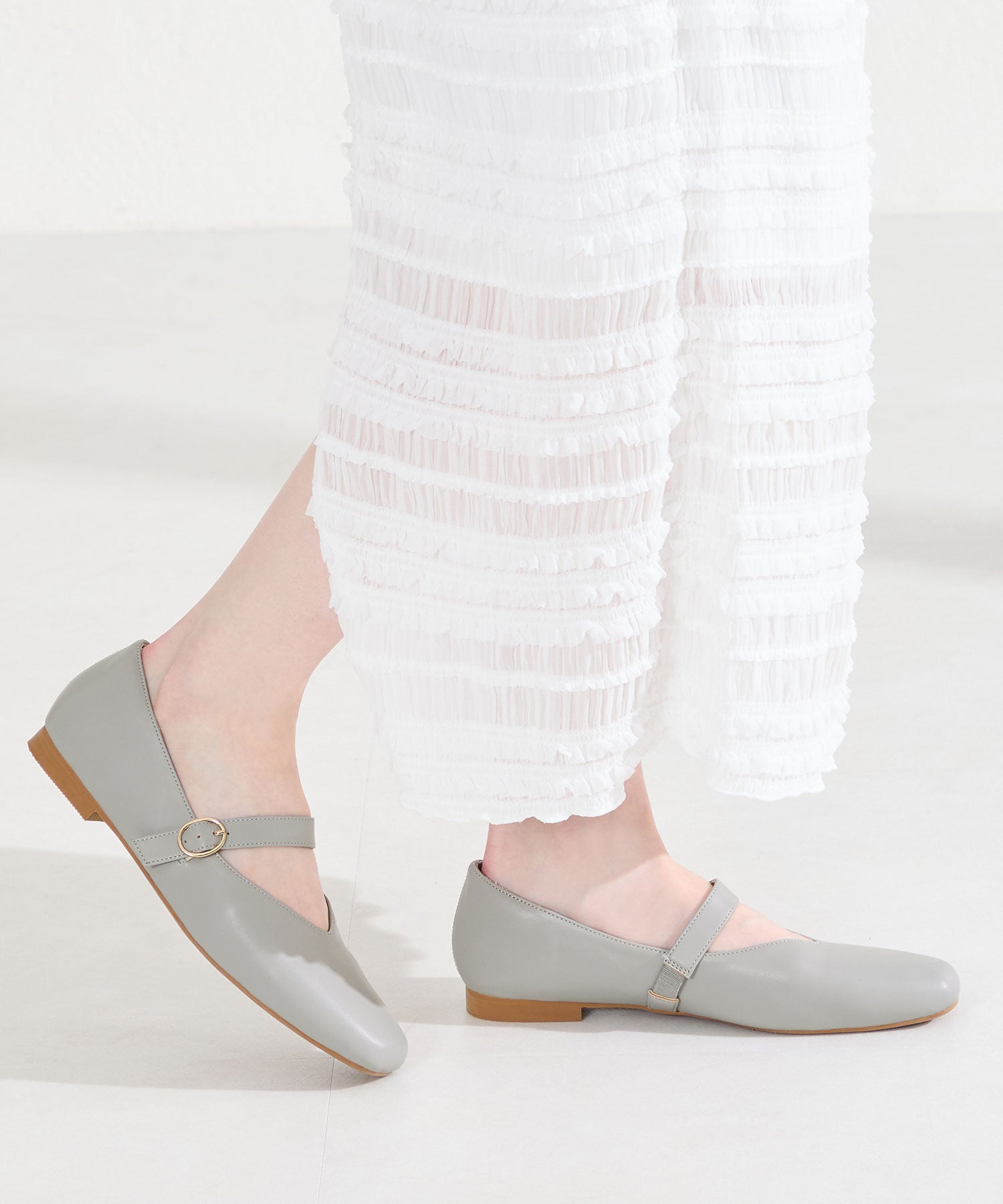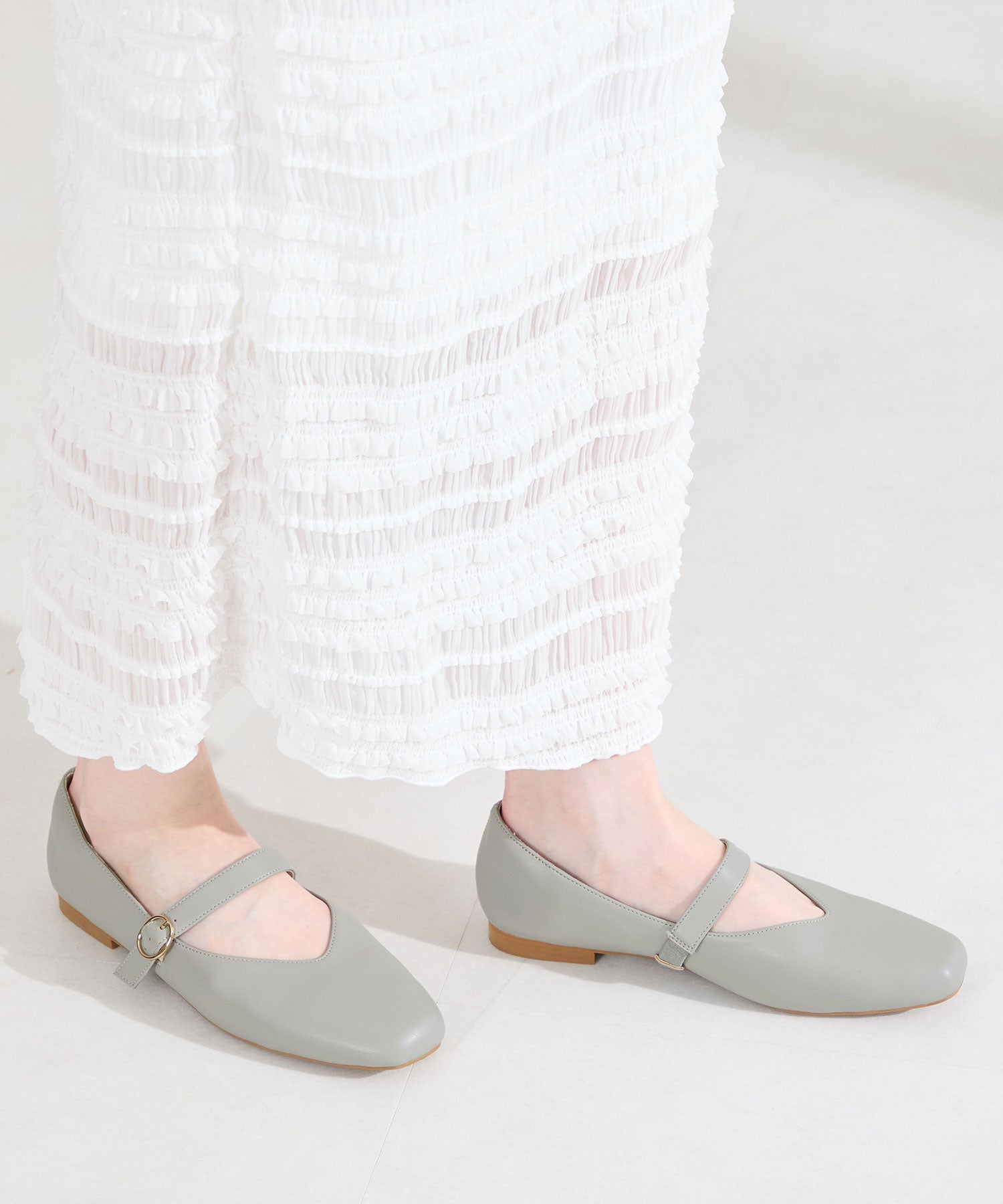 全体的に柔らかく履き心地にこだわった幅広さんにも安心の2E設計。シンプルなデザインながらVカットの履き口が甲を綺麗に見せてくれます。アッパー全体がやわらかく足へのフィット感も抜群で、ストラップ裏側は隠しゴム付きなのでワンタッチで着脱ができ、つま先や中敷、踵にもクッションを内蔵しているので、快適な履き心地をサポートしてくれるアイテム。