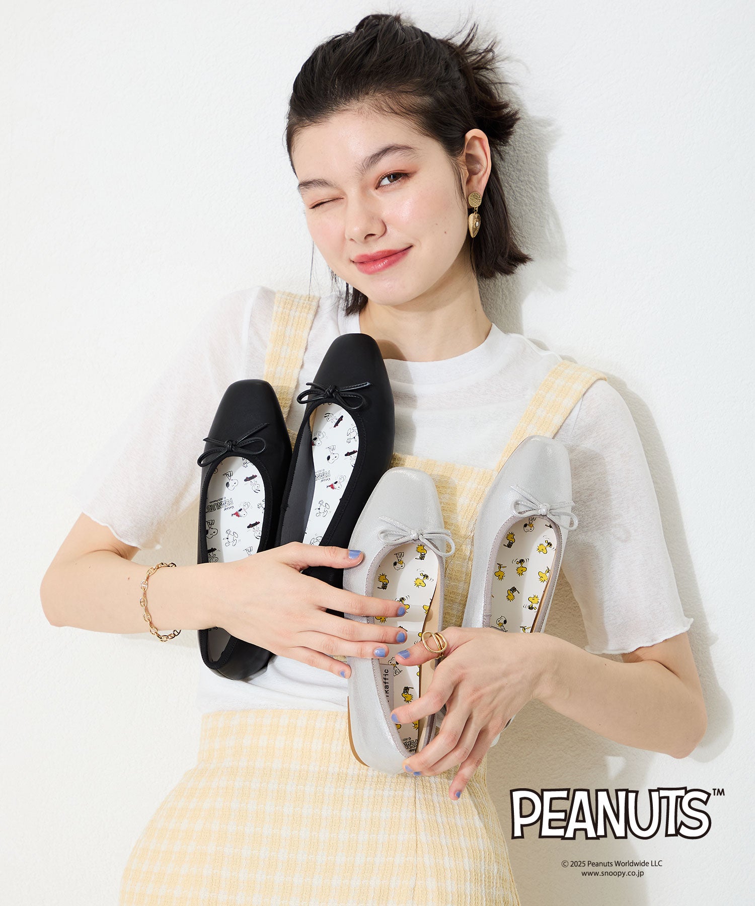 世界中で愛されるPEANUTSの仲間達とのコラボレーションアイテムが登場!スヌーピーとウッドストックを散りばめた総柄の中敷のバレエシューズは手に取るたびにワクワクするアイテム。ブラックの中敷はスケートボードをしたり、座ったりと様々な表情のスヌーピーが可愛らしく、シルバーの中敷は鮮やかなイエローカラーのウッドストックが目を引き、ところどころに配置したスヌーピーとウッドストックの仲良しなアートがさりげないこだわりポイント。フラットでも足裏が痛くなりにくい厚手クッションを搭載し、返りの良いソールにすることで機能性も抜群。
