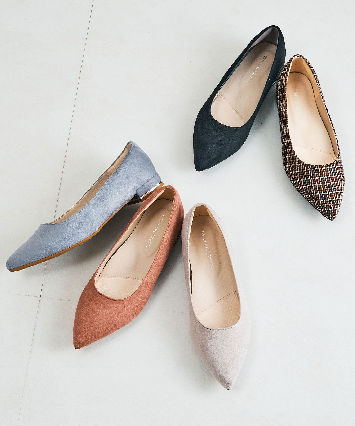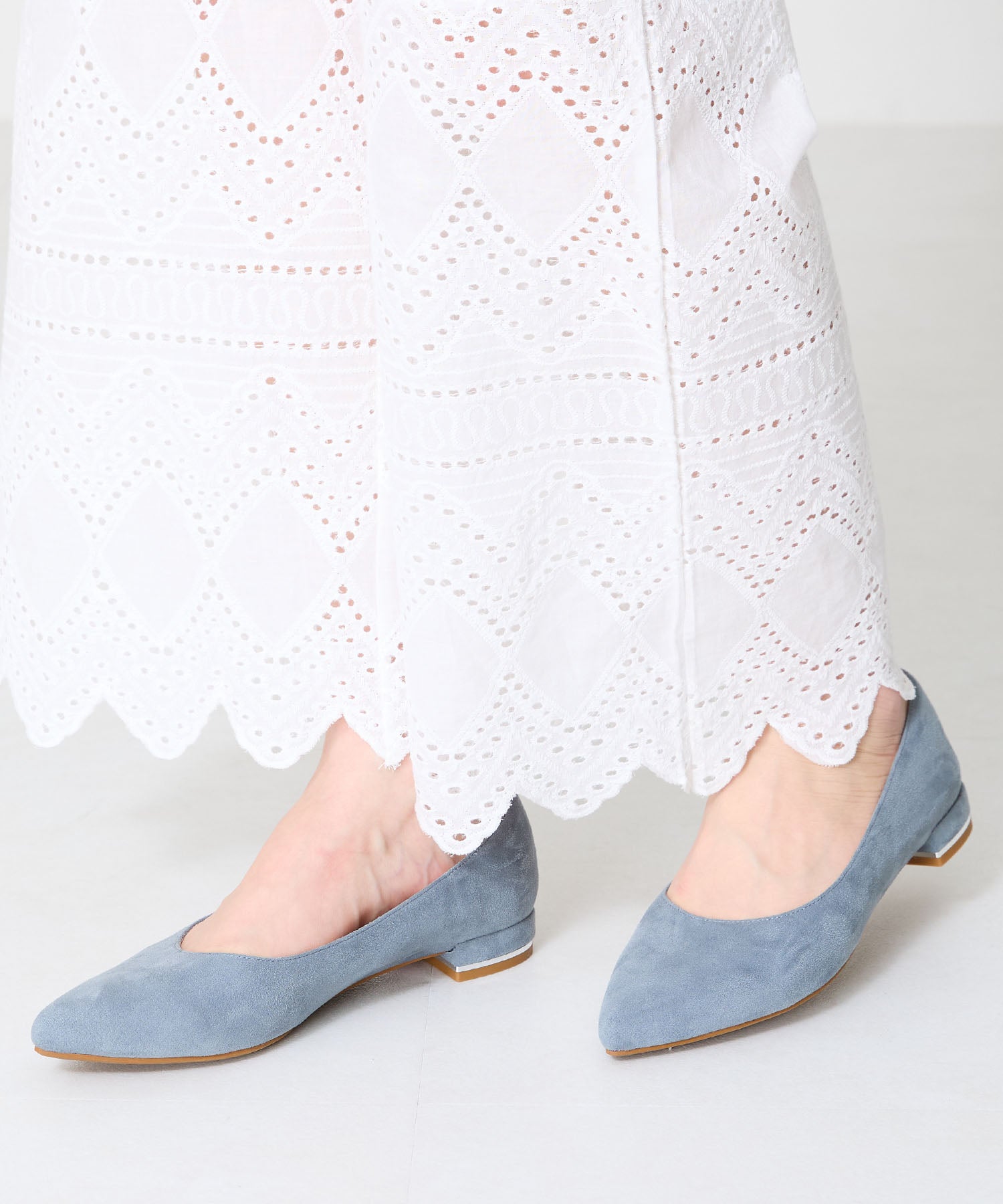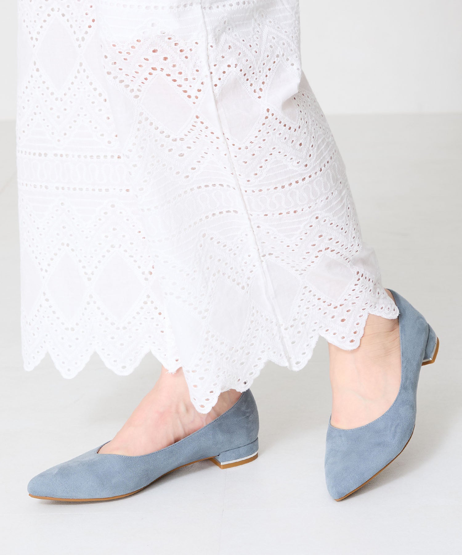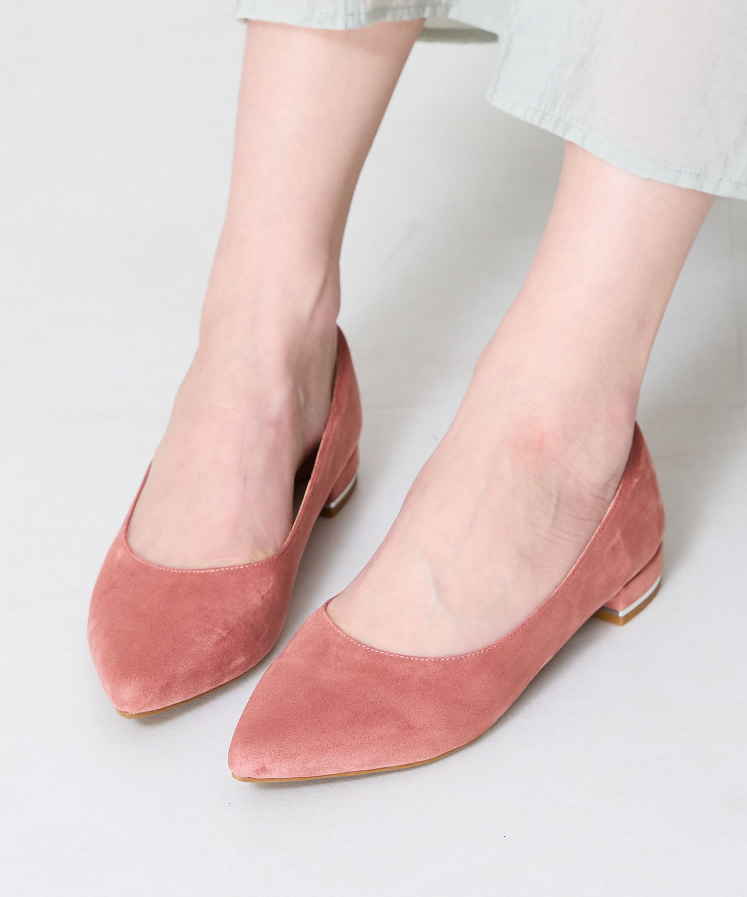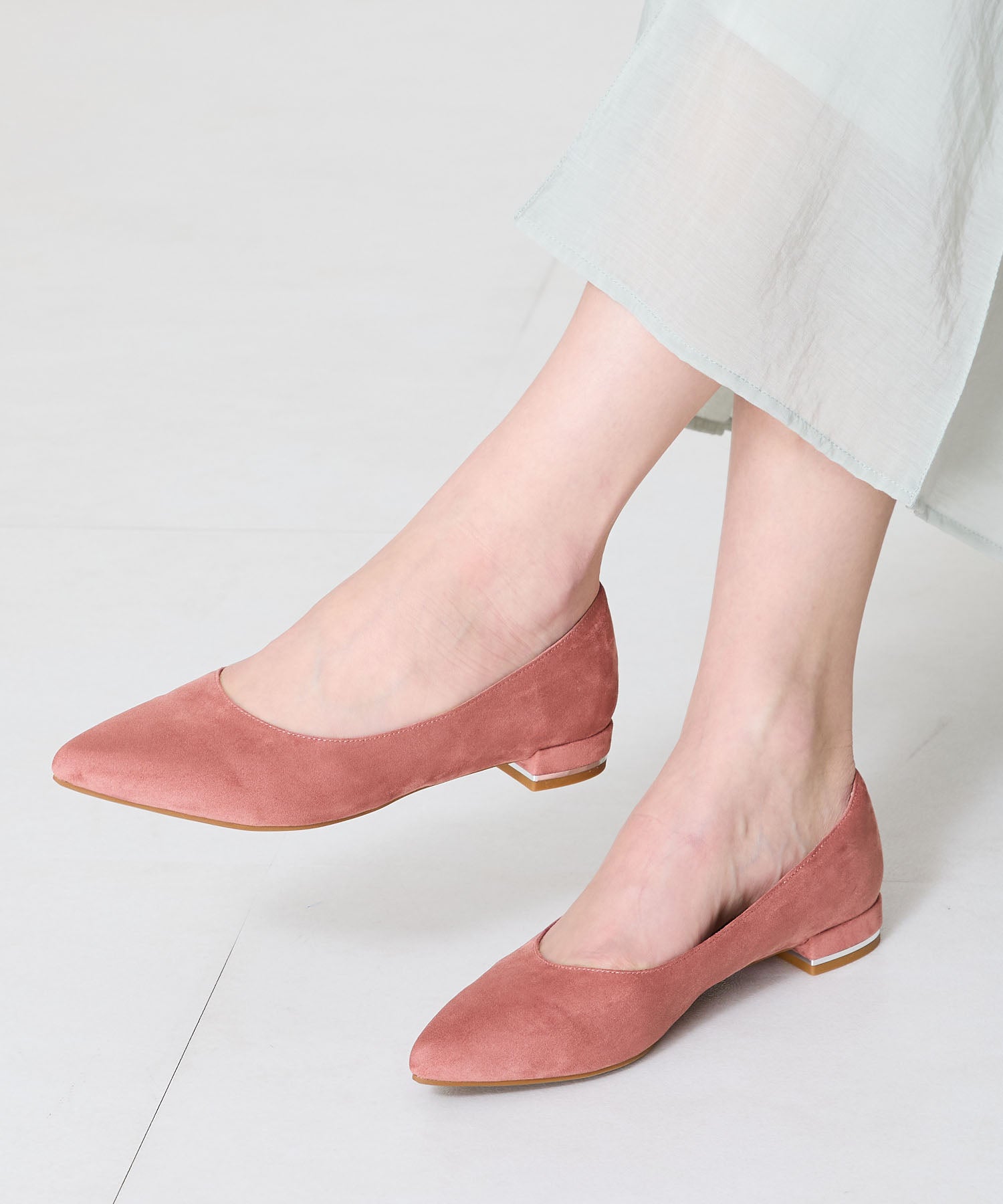 シンプルでデイリー使いしやすいフラットパンプスはシャープなトゥで足元を綺麗に見せてくれる。フラットでも足裏が痛くなりにくい厚手クッションや返りの良いソールなど機能性も抜群。無駄のないデザインながらヒールにはメタリックラインを付けてさりげないワンポイントをプラス。オンオフ使える豊富なカラー展開で色違いで揃えるのもおすすめ。