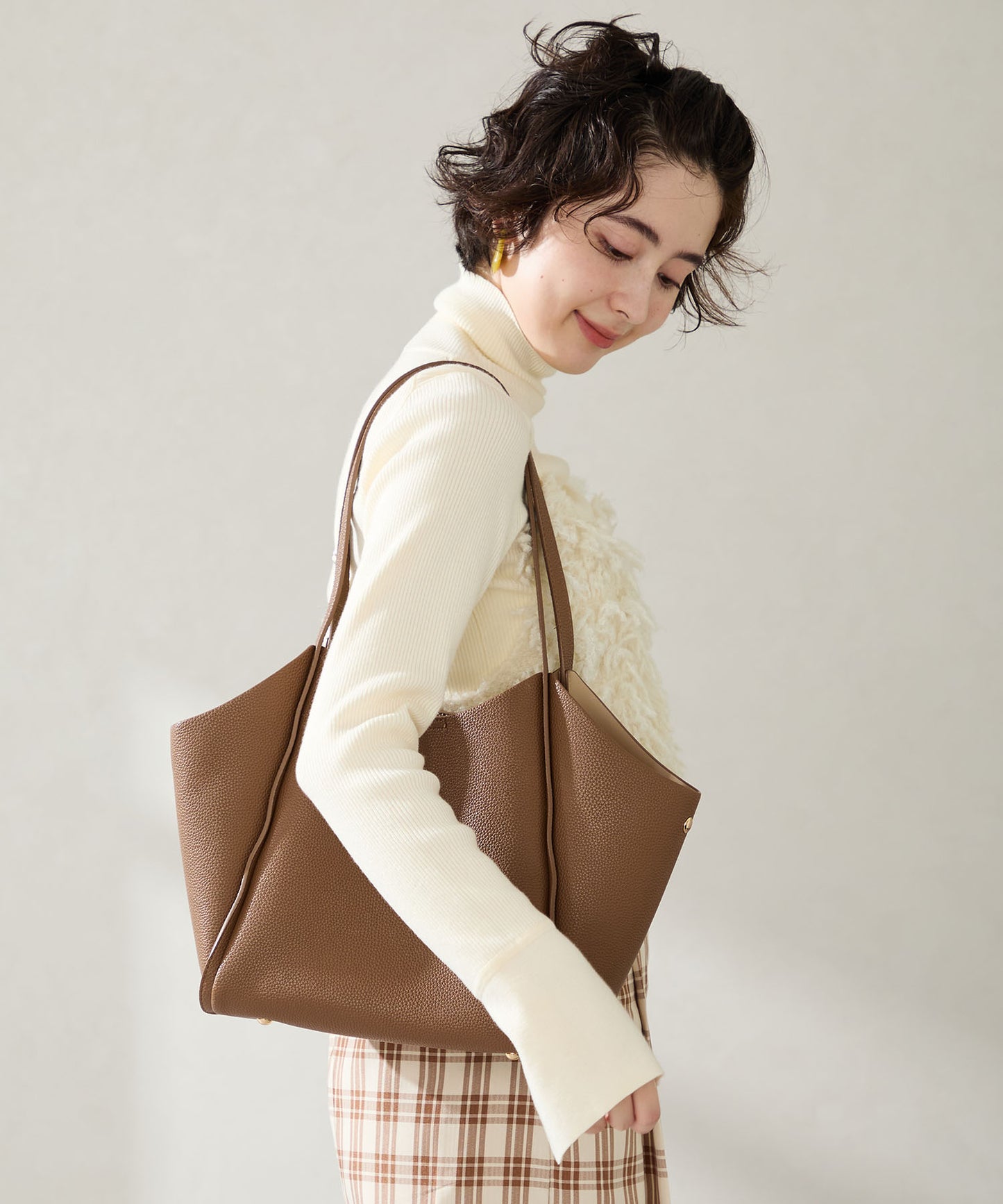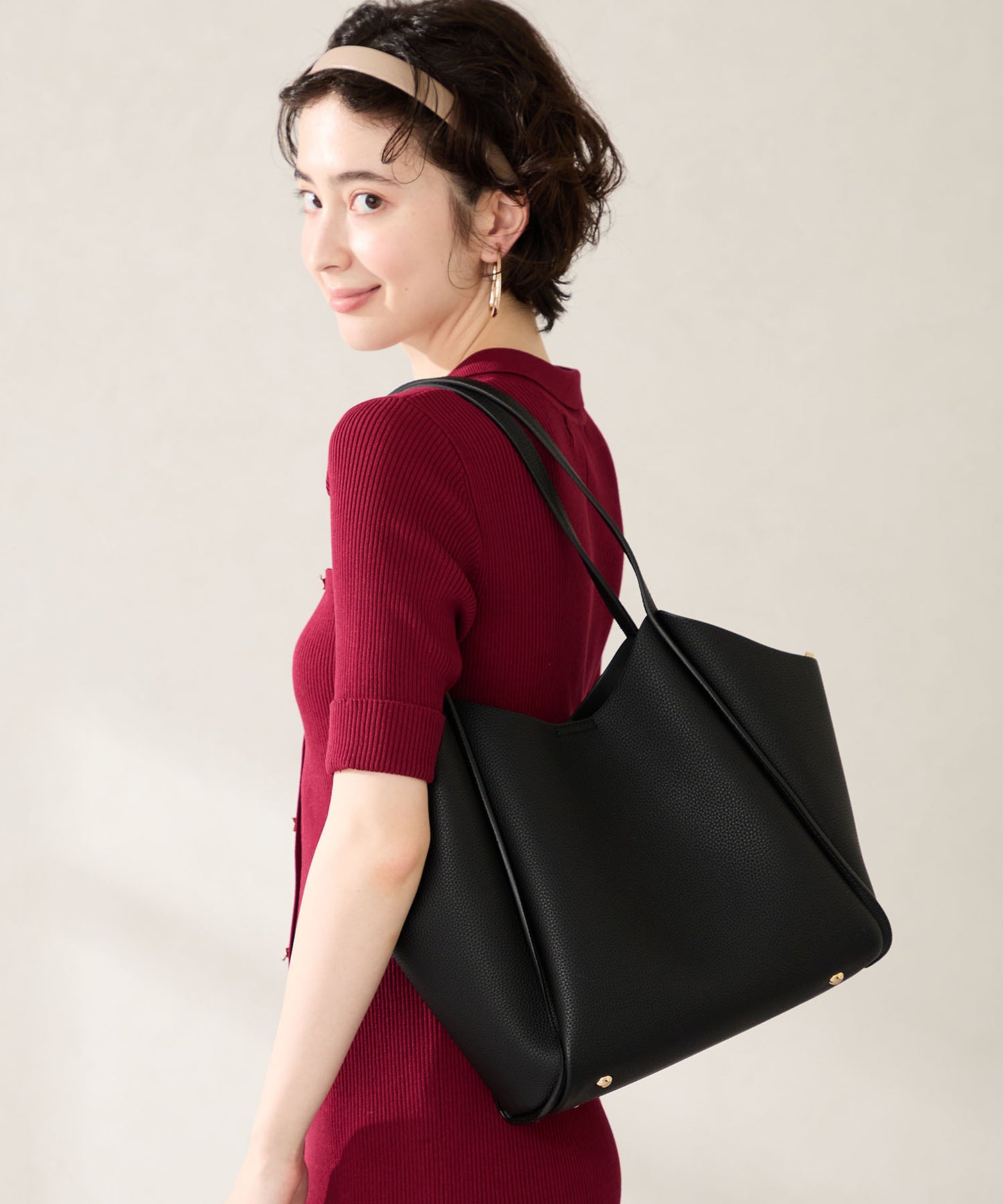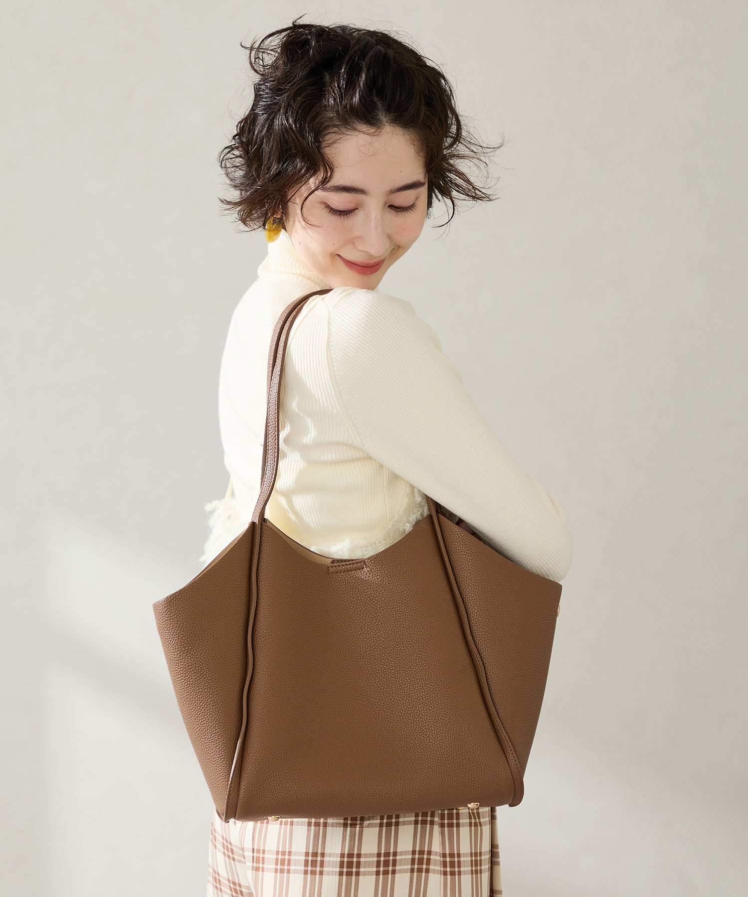 シュリンク加工を施した合皮素材が高級感漂うトートバッグは、間口を曲線を描くようにカットし体にぴったりフィットする形状に仕上げるなど使いやすさを追求。中のインバックは仕切りにもなる優れもので整理整頓しながら荷物をしまうことが出来る。普段使いはもちろんお仕事用としても使いやすいサイズ感でマルチに活躍しそう。