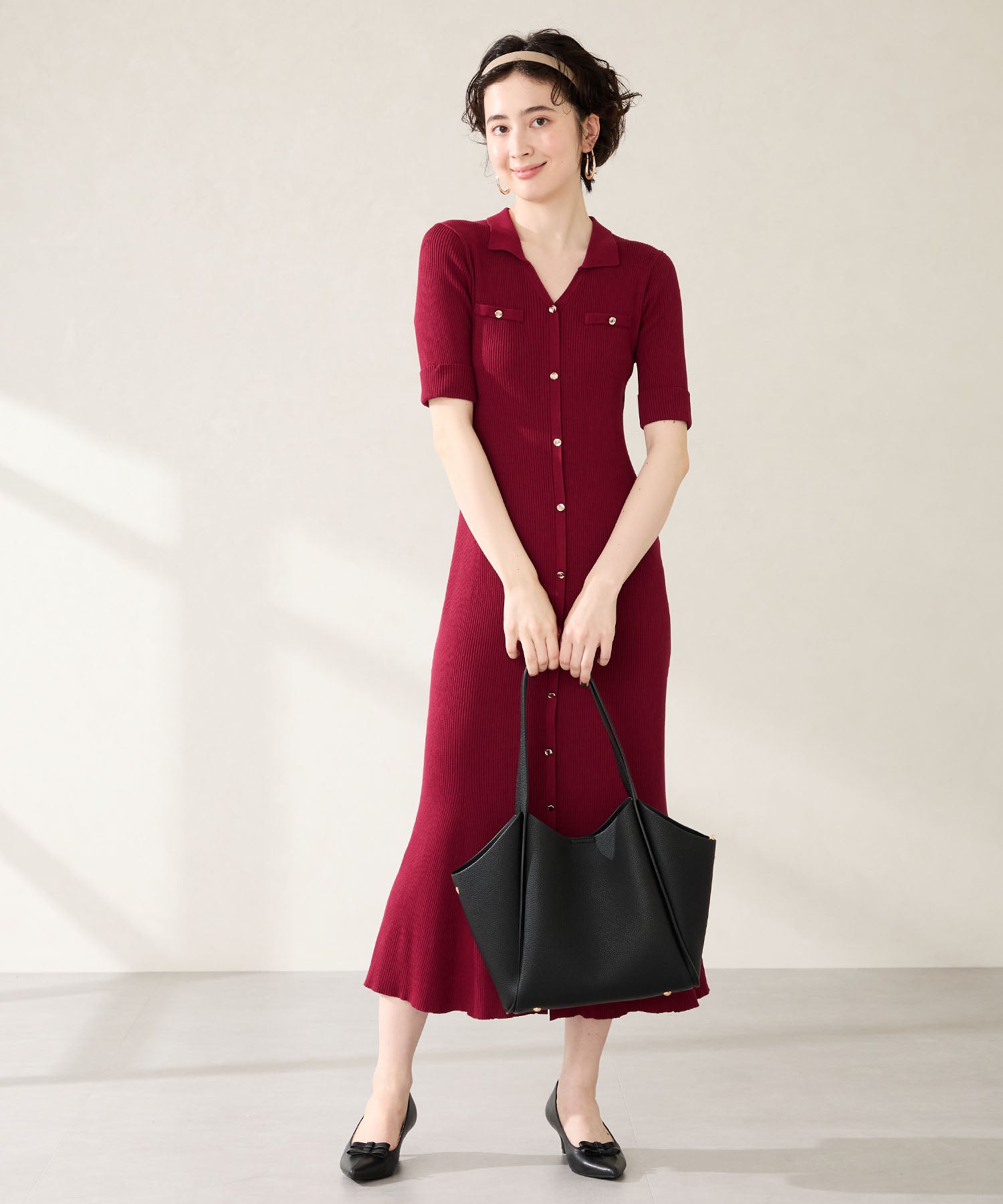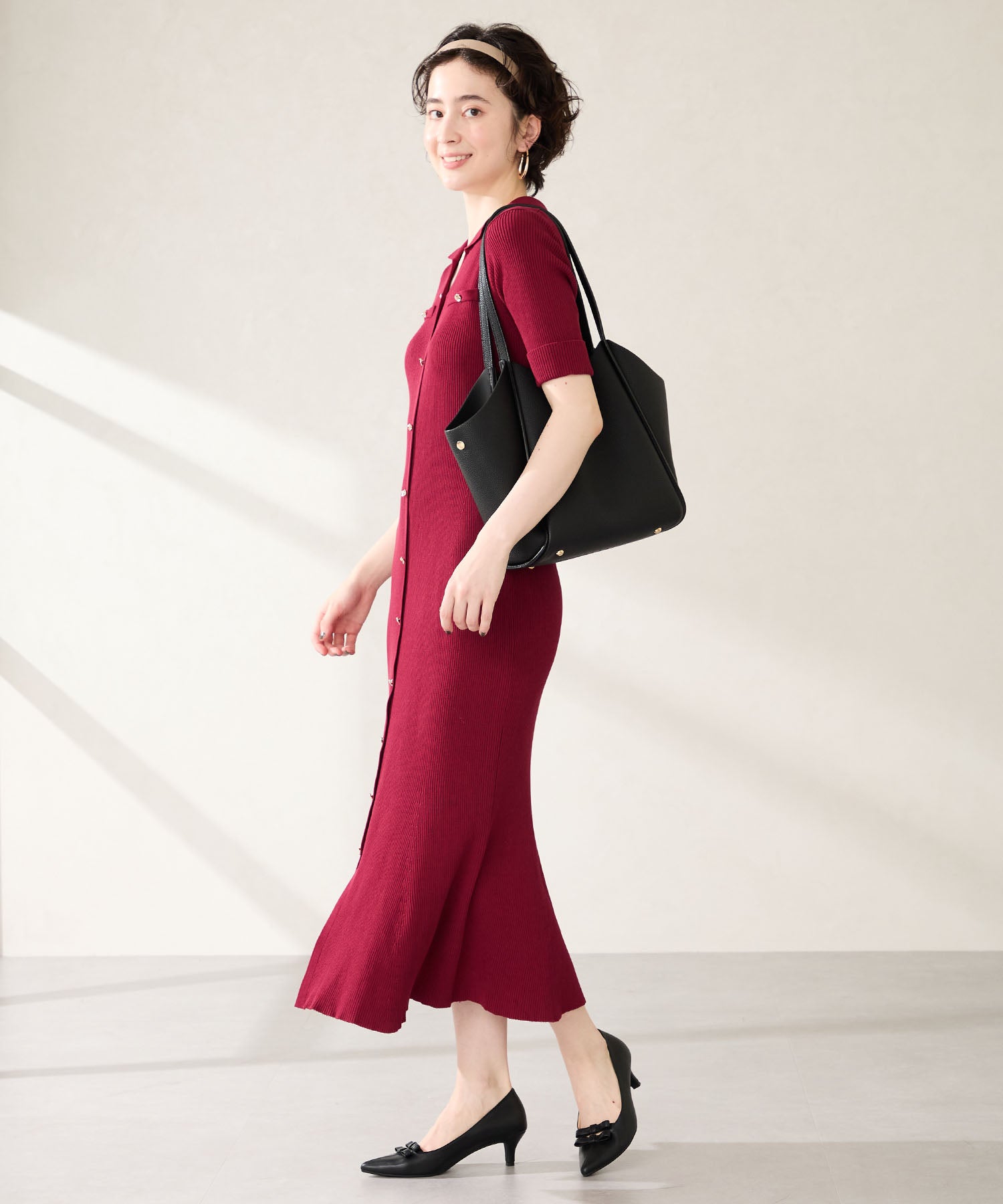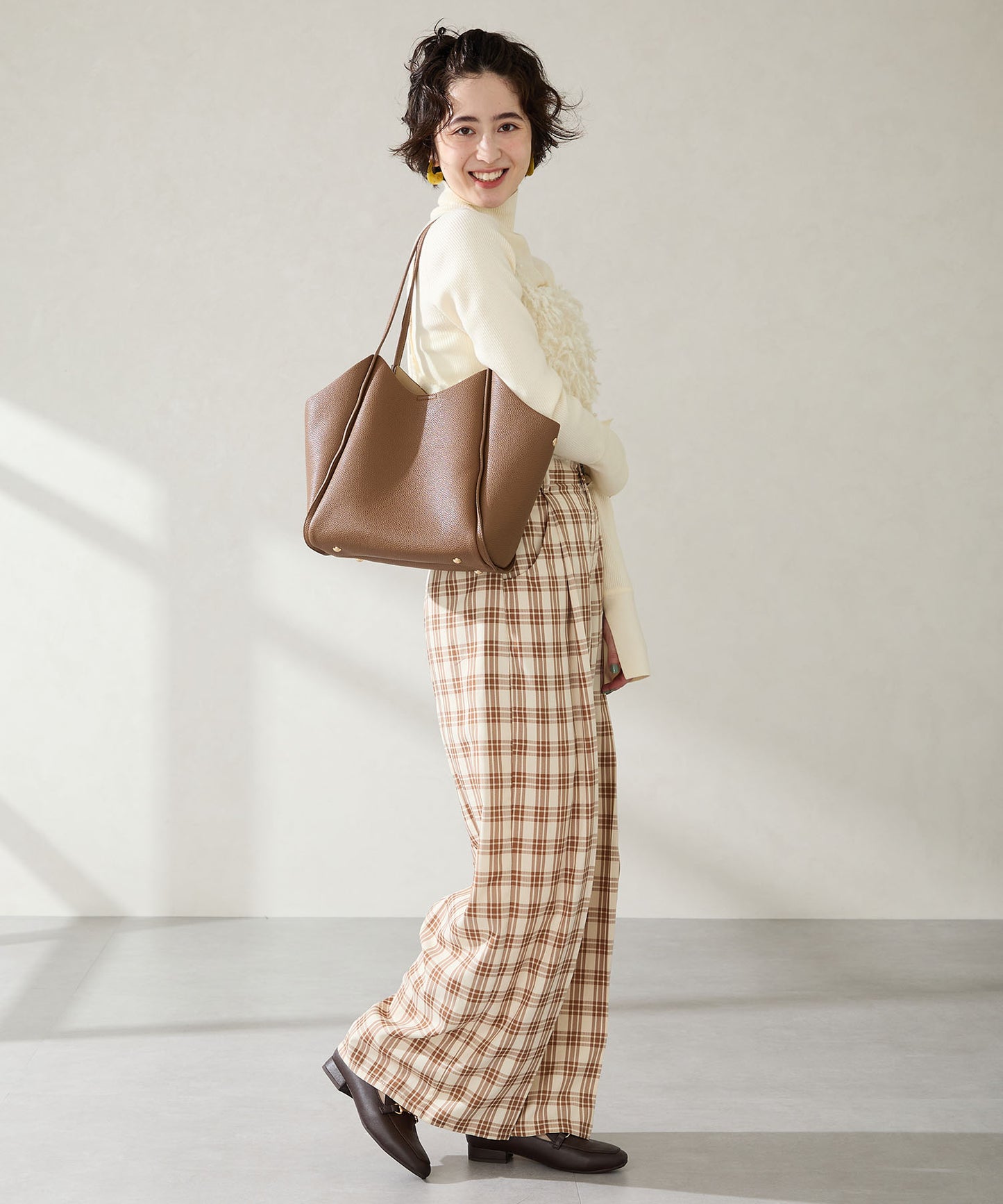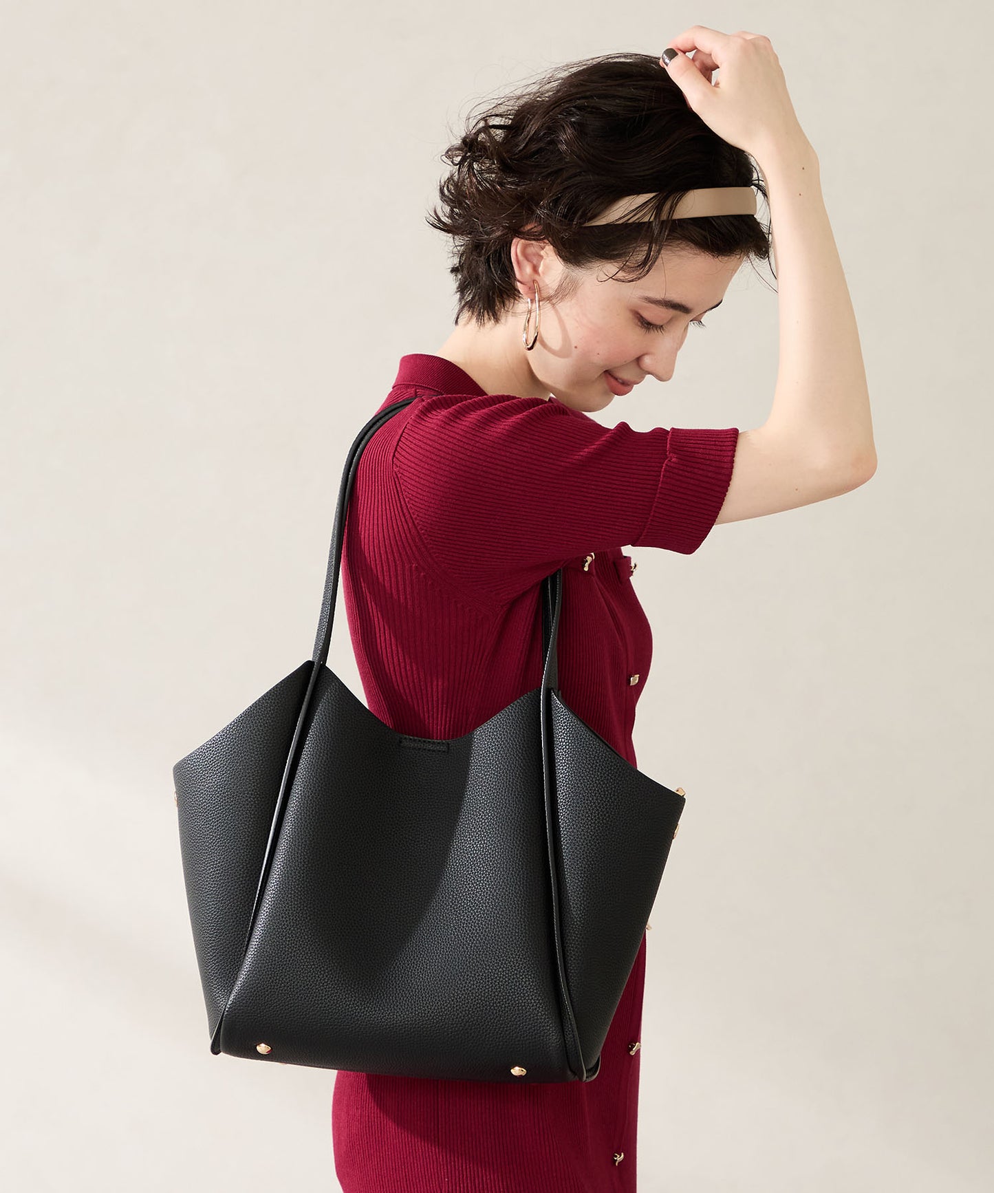 シュリンク加工を施した合皮素材が高級感漂うトートバッグは、間口を曲線を描くようにカットし体にぴったりフィットする形状に仕上げるなど使いやすさを追求。中のインバックは仕切りにもなる優れもので整理整頓しながら荷物をしまうことが出来る。普段使いはもちろんお仕事用としても使いやすいサイズ感でマルチに活躍しそう。